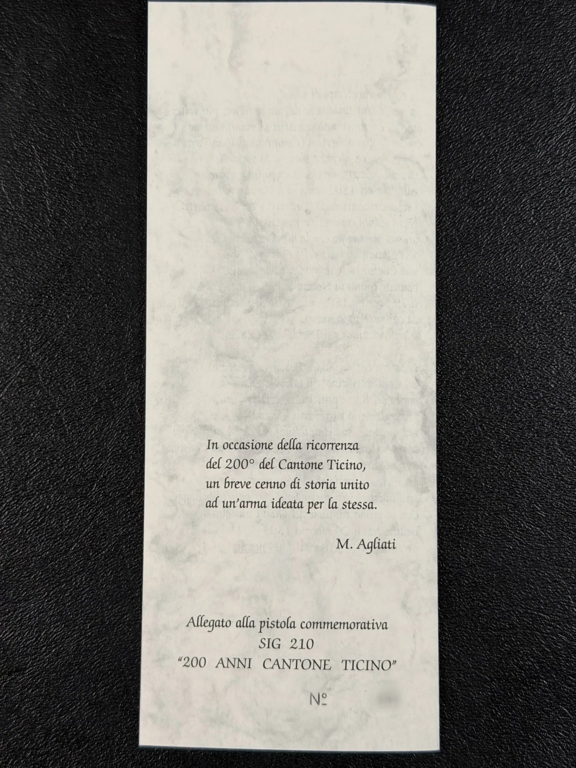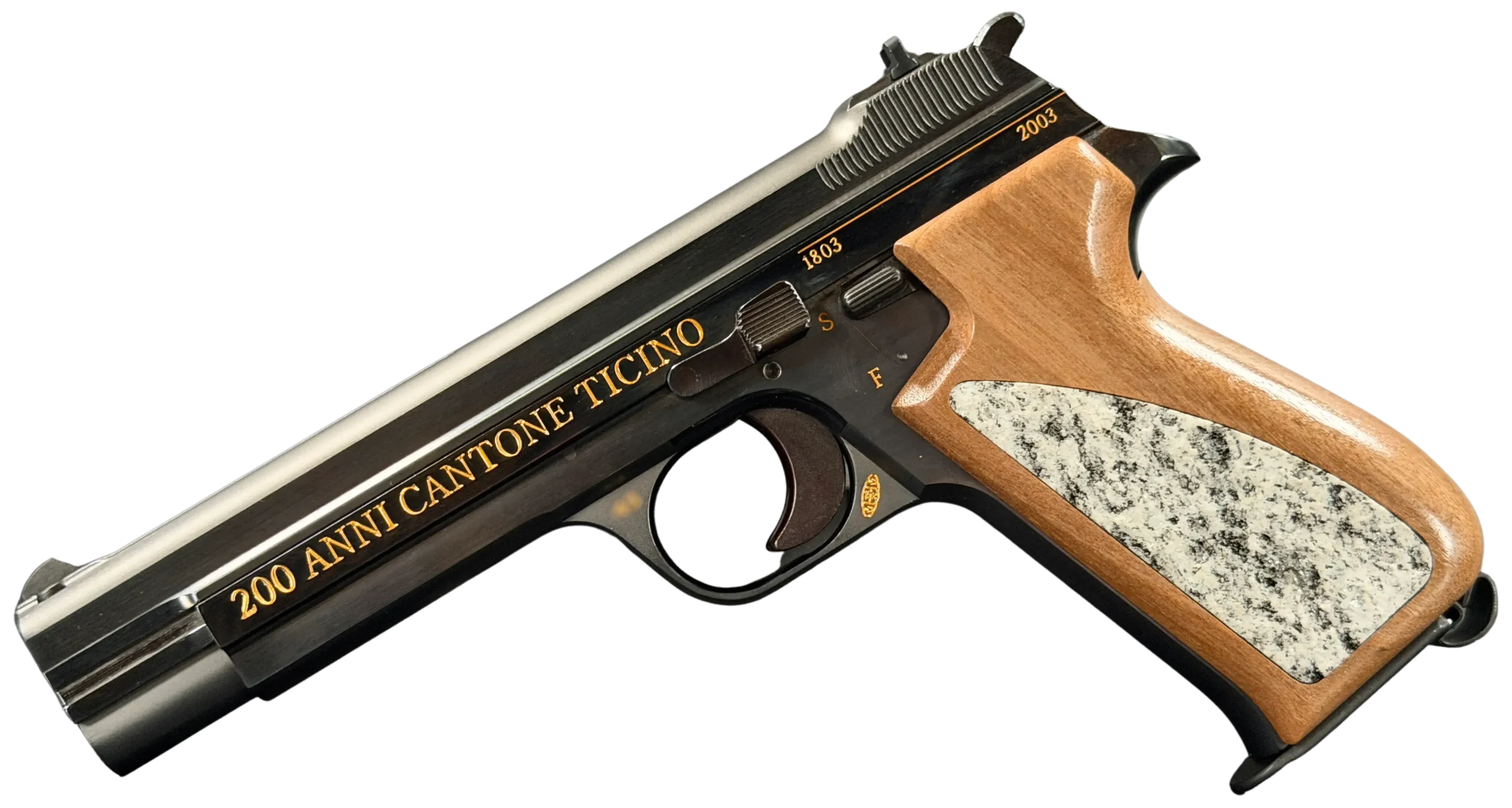 The SIG Sauer P210 “200 Anni Cantone Ticino” is a commemorative presentation built on the renowned P210 platform and created to mark the bicentennial of the Canton of Ticino, 1803–2003.