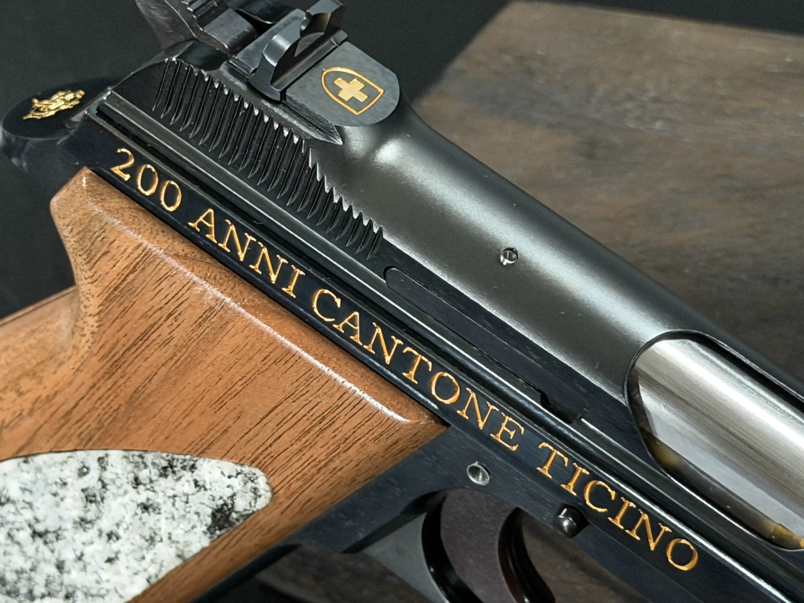 Chambered in 9mm, this example pairs the familiar P210 profile with a distinctive Mueller Murgenthal execution. The slide features gold-inlaid lettering reading “200 ANNI CANTONE TICINO,” along with the dates 1803–2003, giving the piece a clear commemorative identity with a refined, restrained presentation.