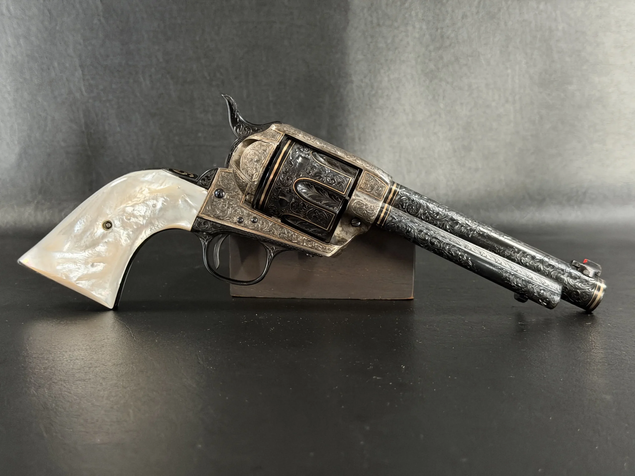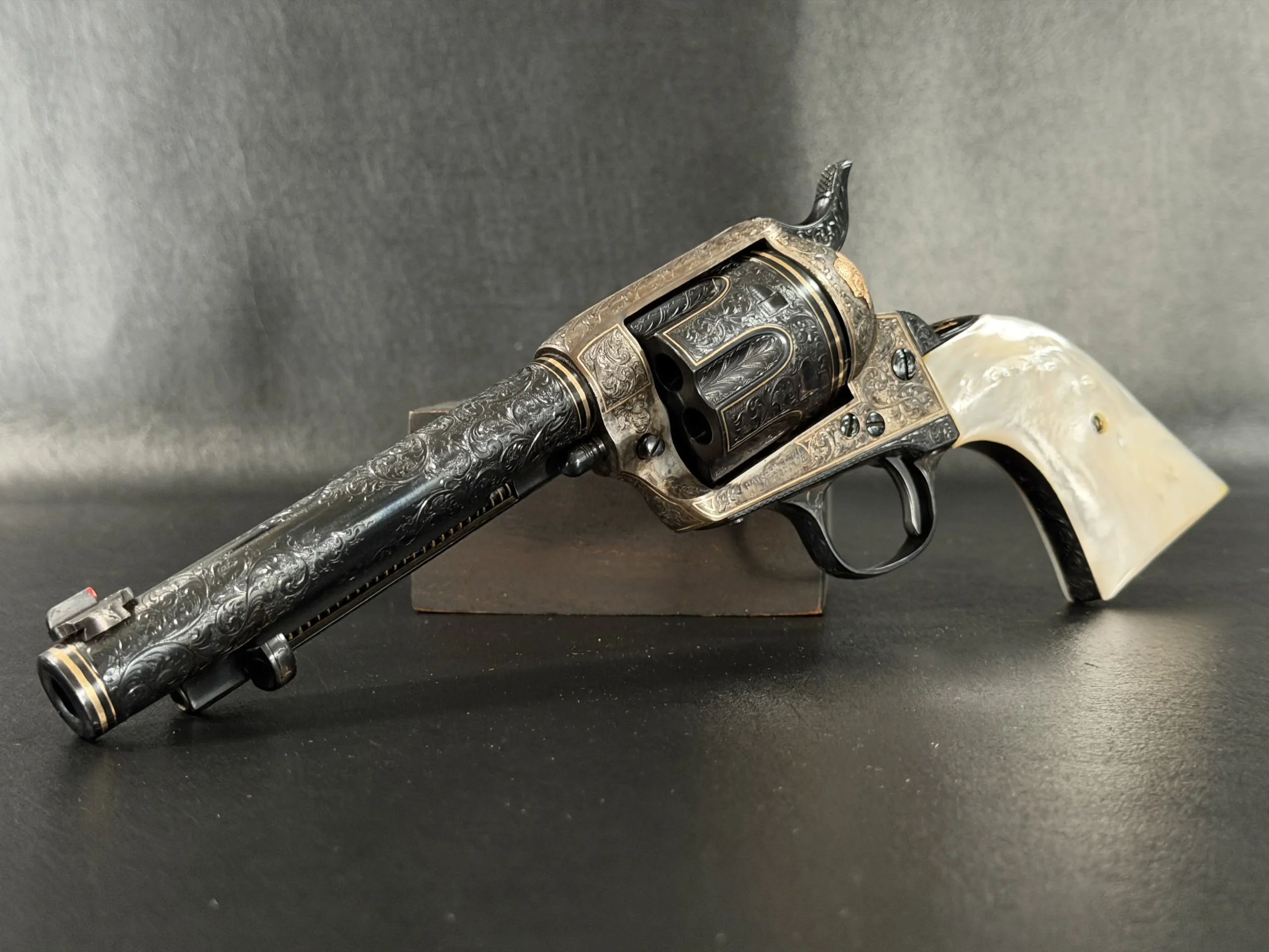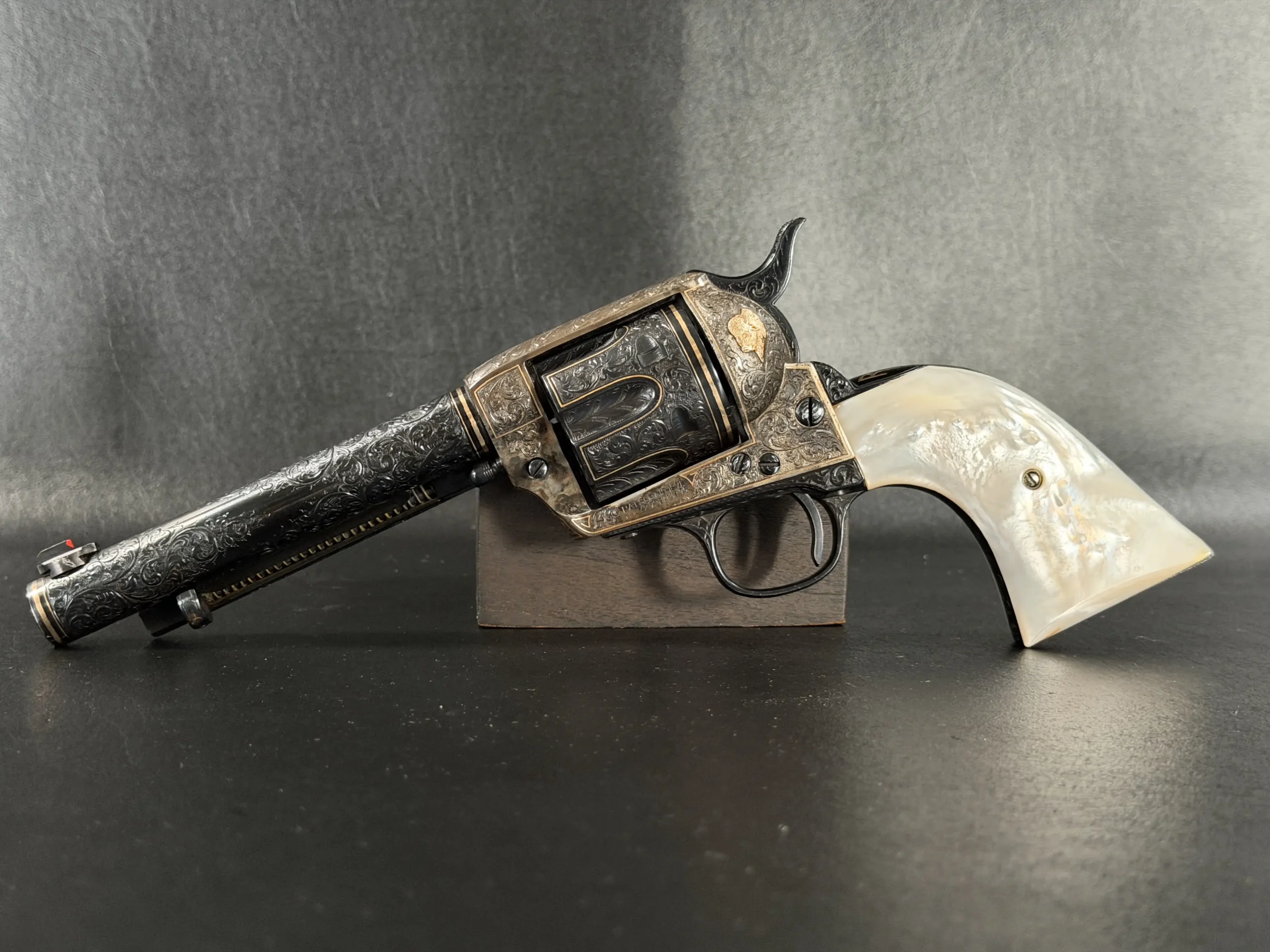 An Alvin White-engraved and inlaid Colt Single Action Army built on the iconic revolver platform and chambered in .38 Special. This exhibition-style presentation brings together classic Colt lines with extensive scroll engraving, gold inlay accents, and natural pearl grips for a bold, highly refined overall look.