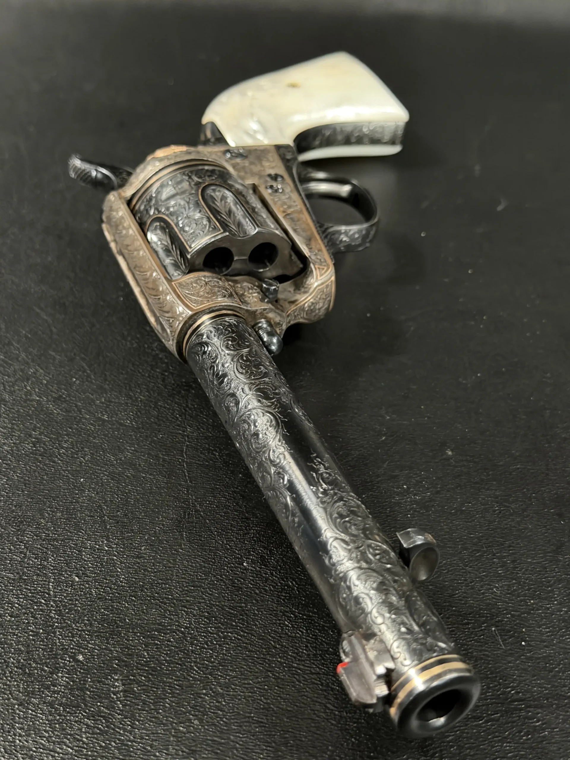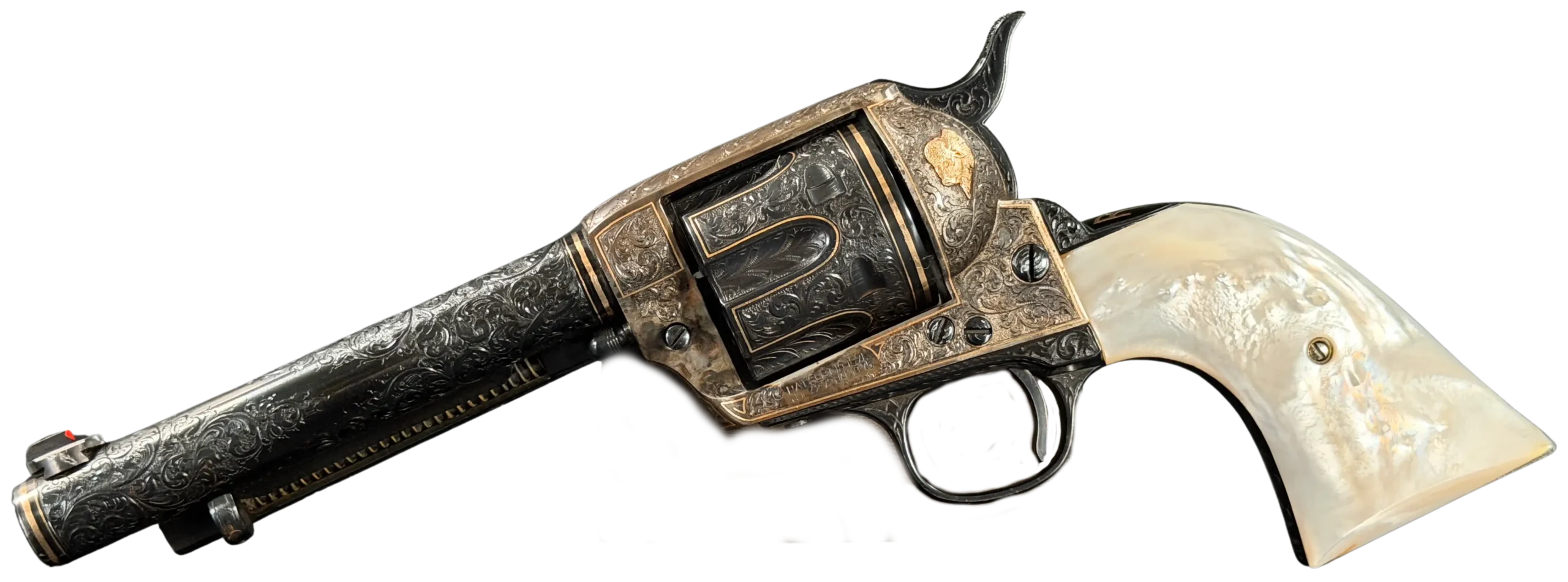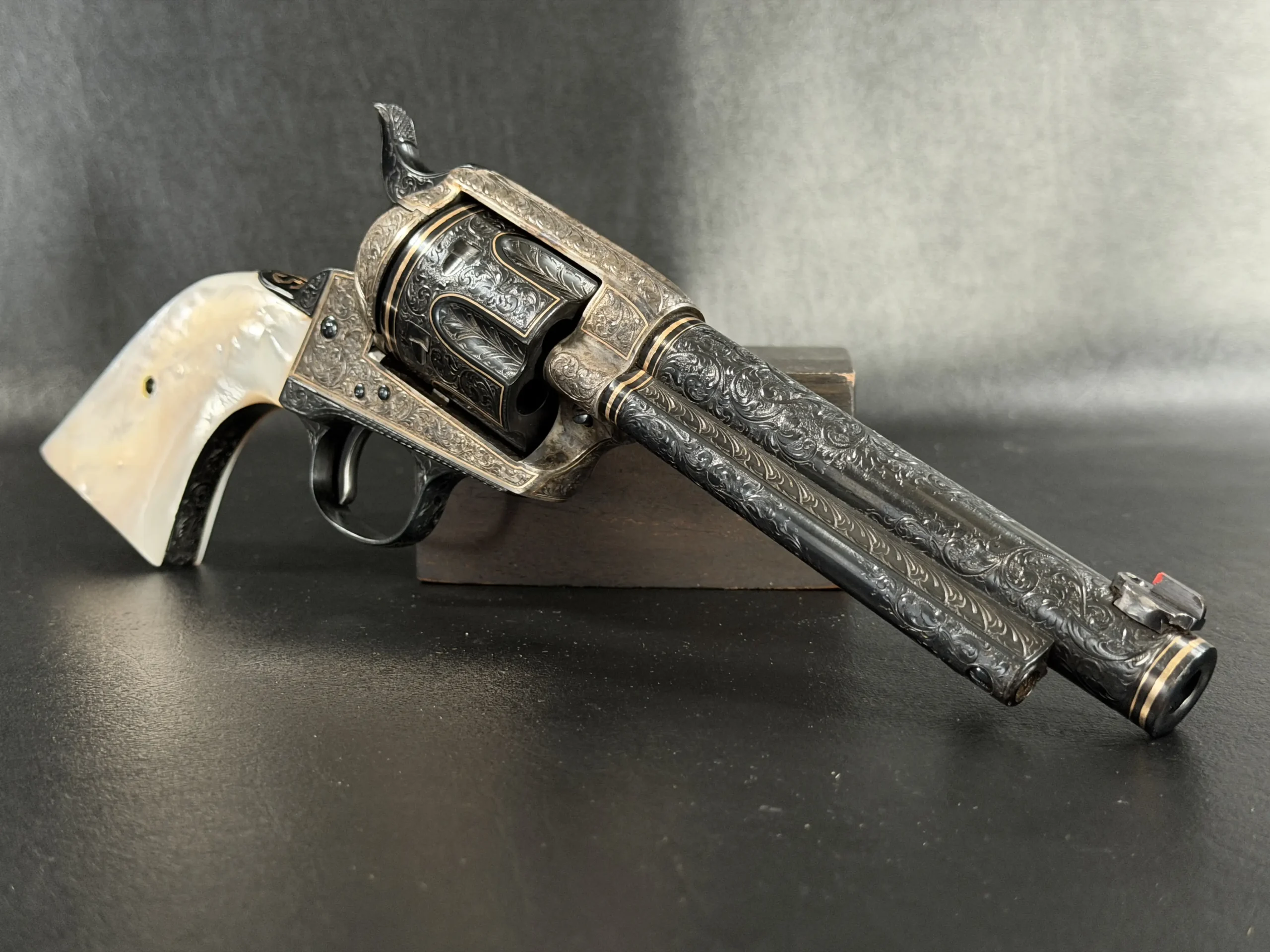 An Alvin White-engraved and inlaid Colt Single Action Army built on the iconic revolver platform and chambered in .38 Special. This exhibition-style presentation brings together classic Colt lines with extensive scroll engraving, gold inlay accents, and natural pearl grips for a bold, highly refined overall look.