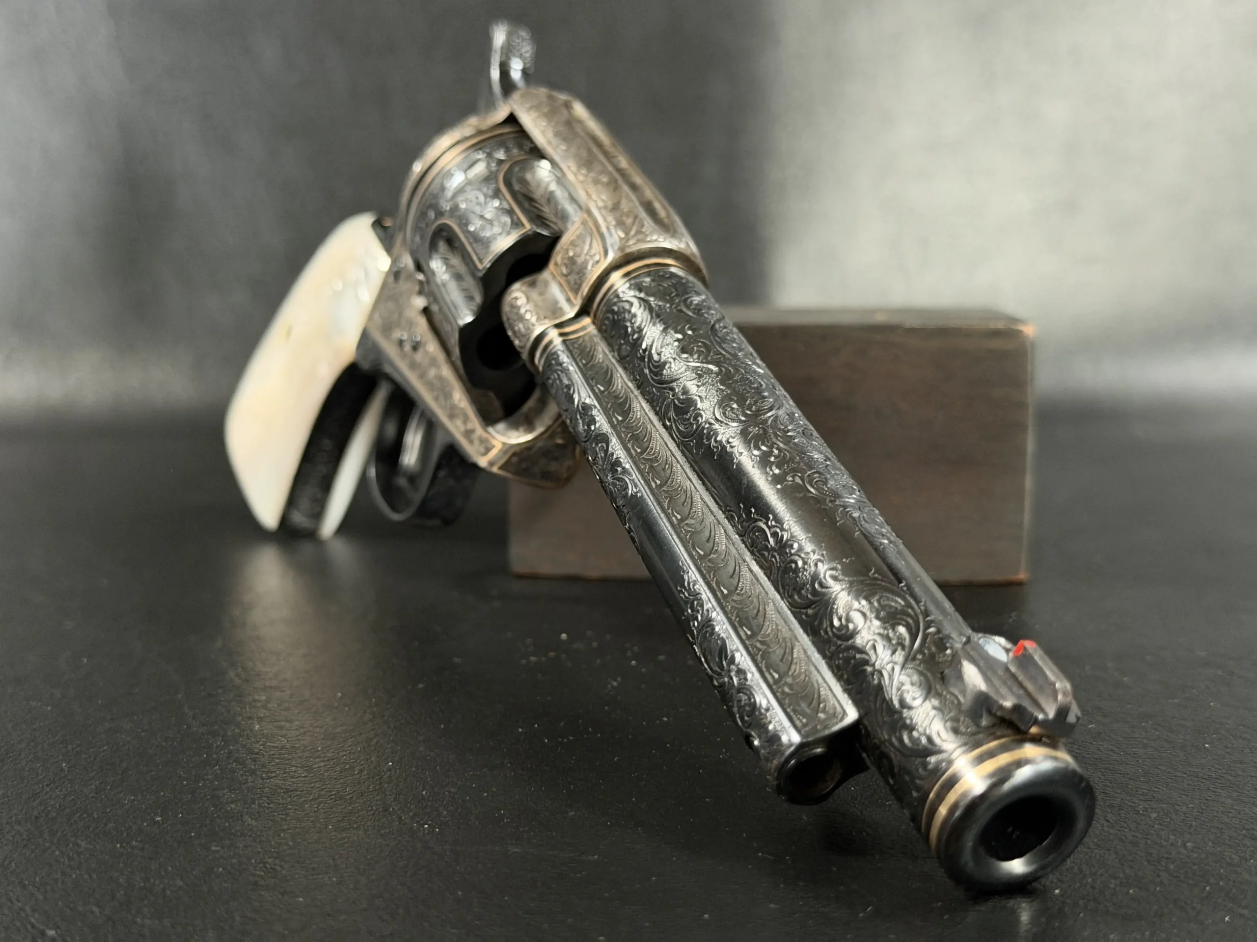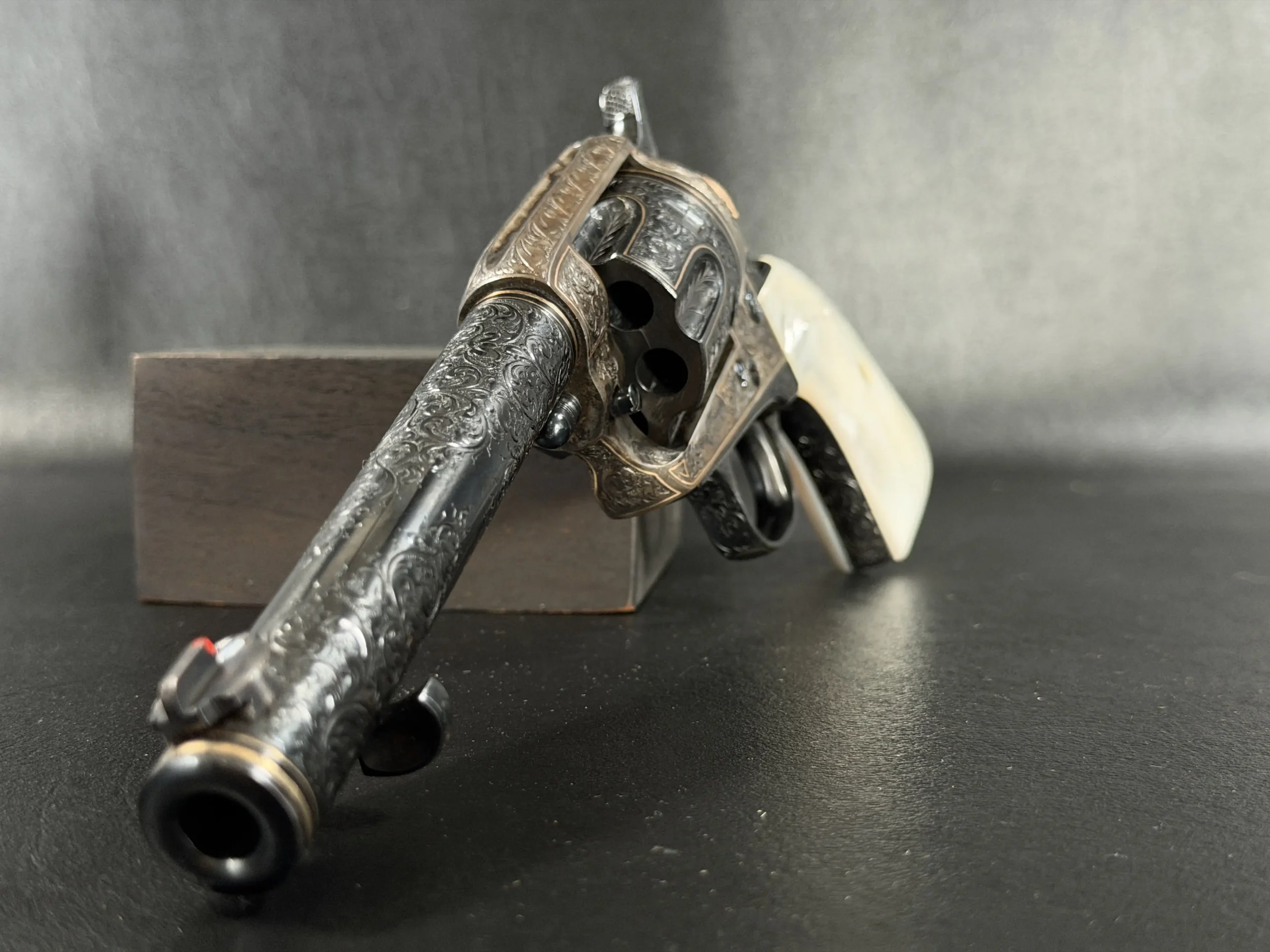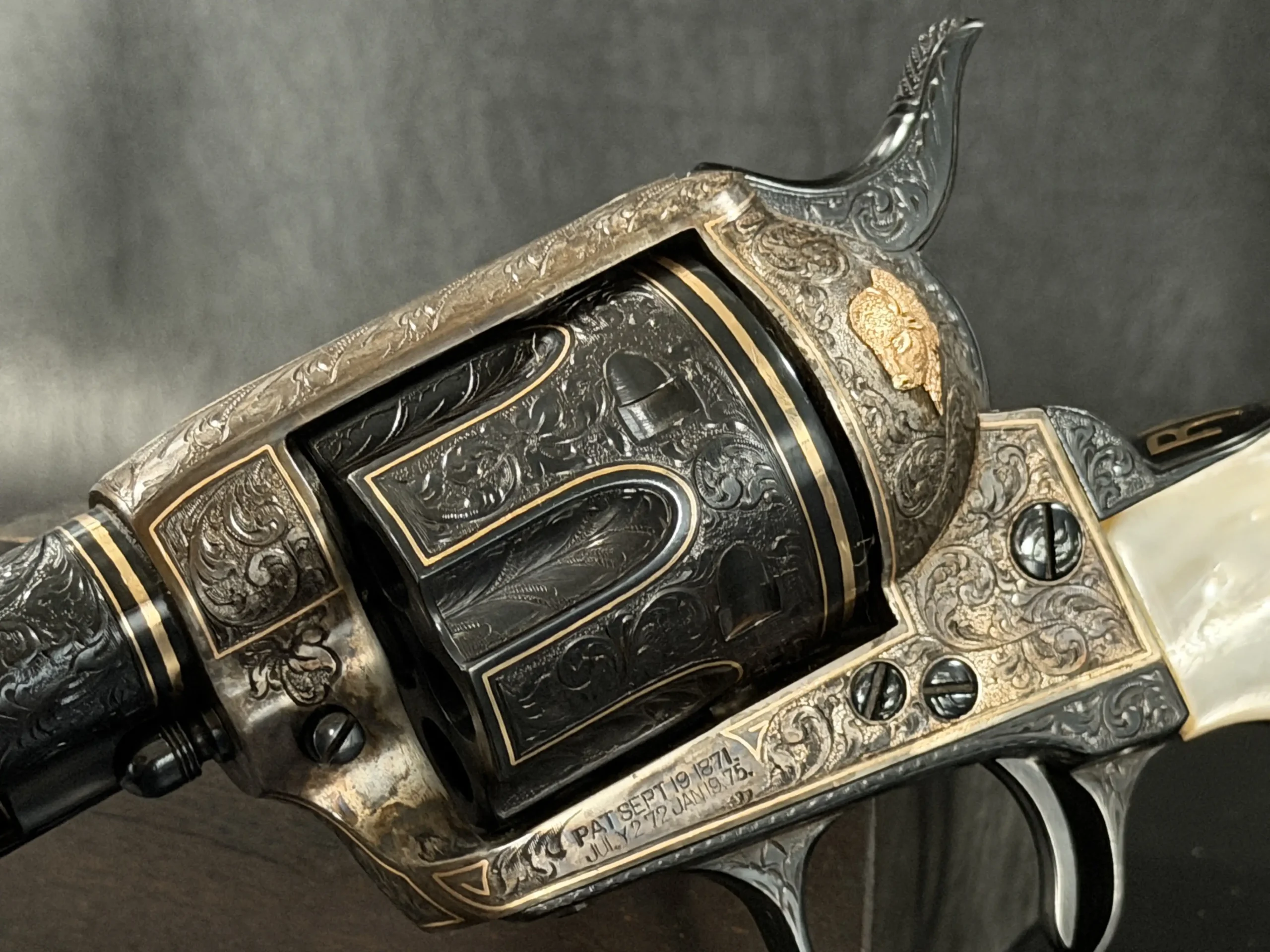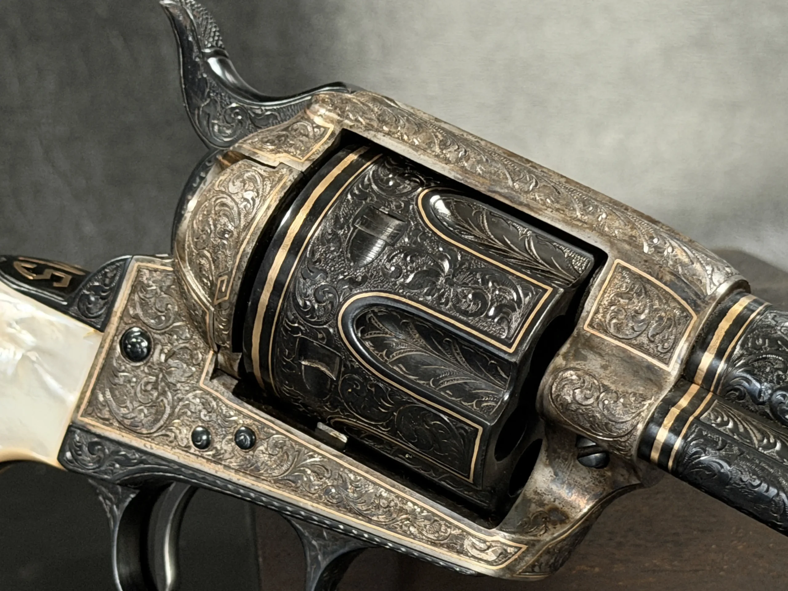 Additional attention to detail can be seen in the treatment of the hammer, trigger guard, and frame edges, all incorporated into the overall engraving scheme. The result is a Colt Single Action Army that pairs traditional form with master-level decorative workmanship in a polished exhibition format.