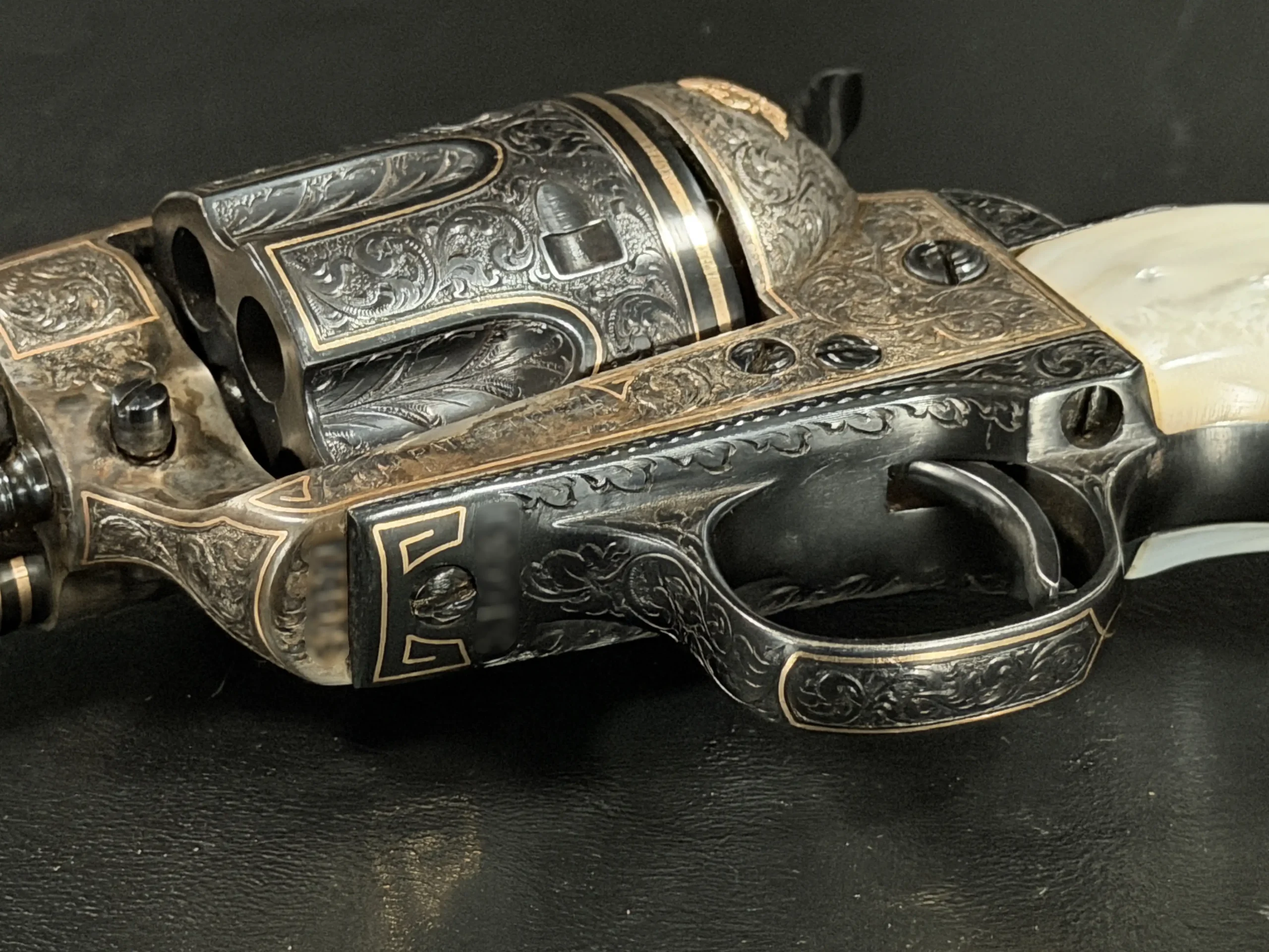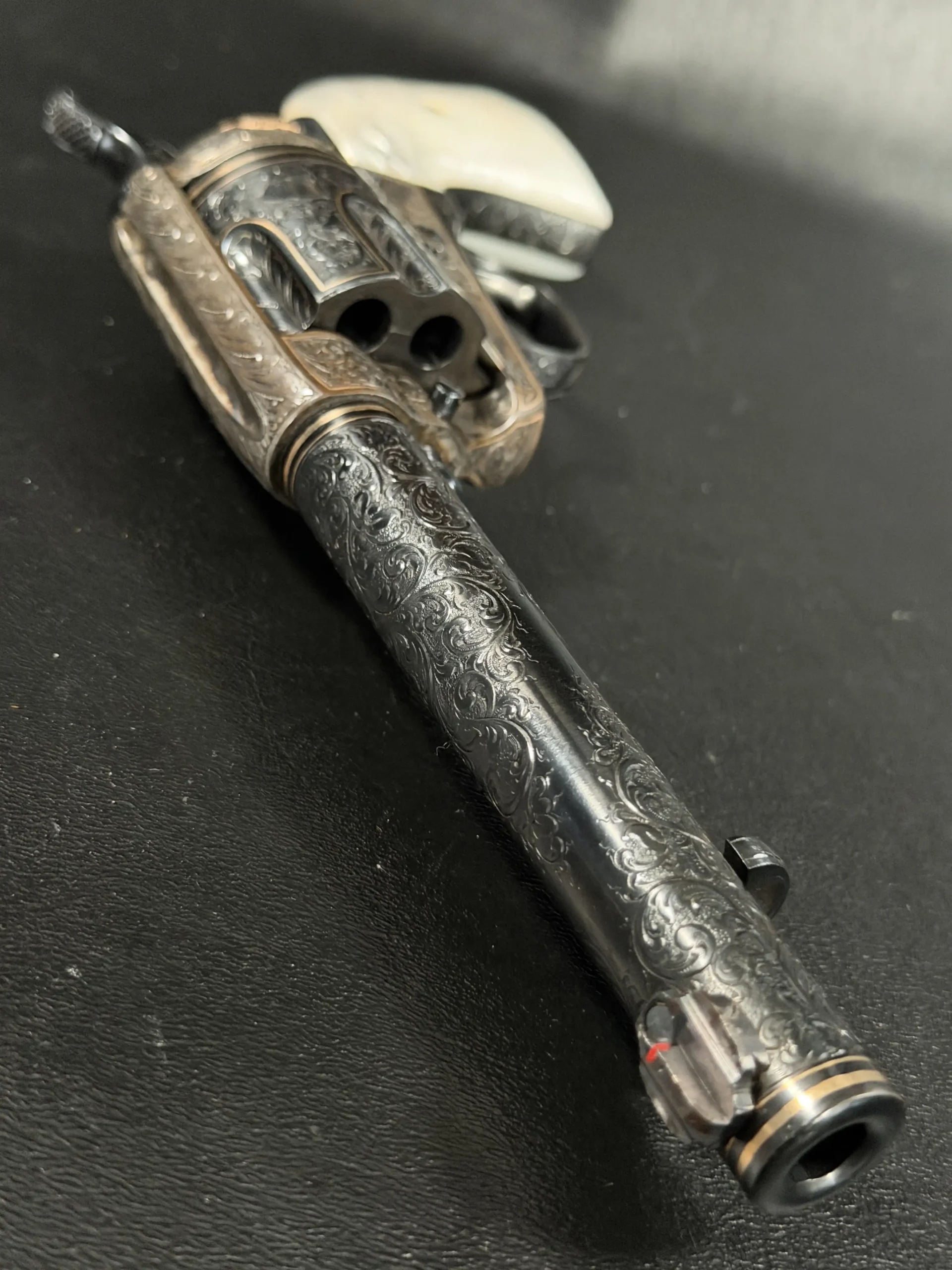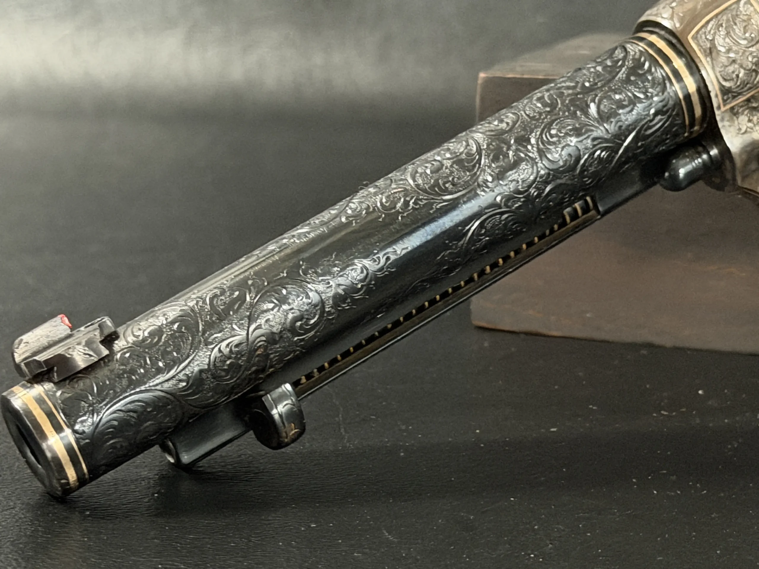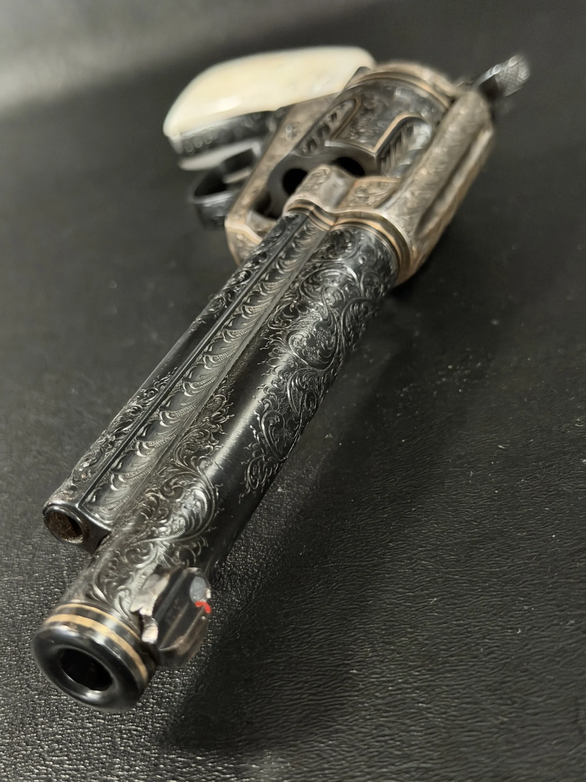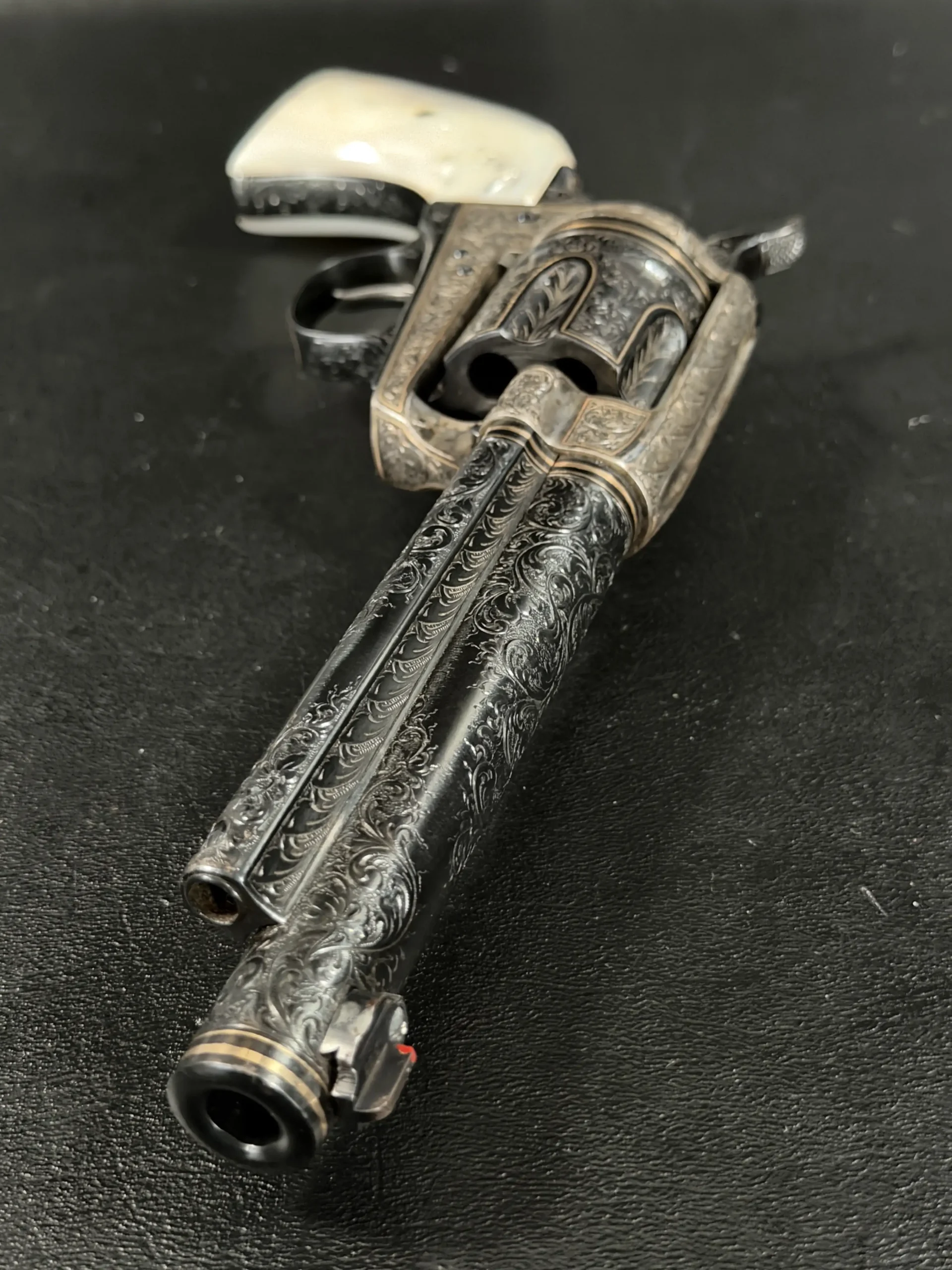 Additional attention to detail can be seen in the treatment of the hammer, trigger guard, and frame edges, all incorporated into the overall engraving scheme. The result is a Colt Single Action Army that pairs traditional form with master-level decorative workmanship in a polished exhibition format.