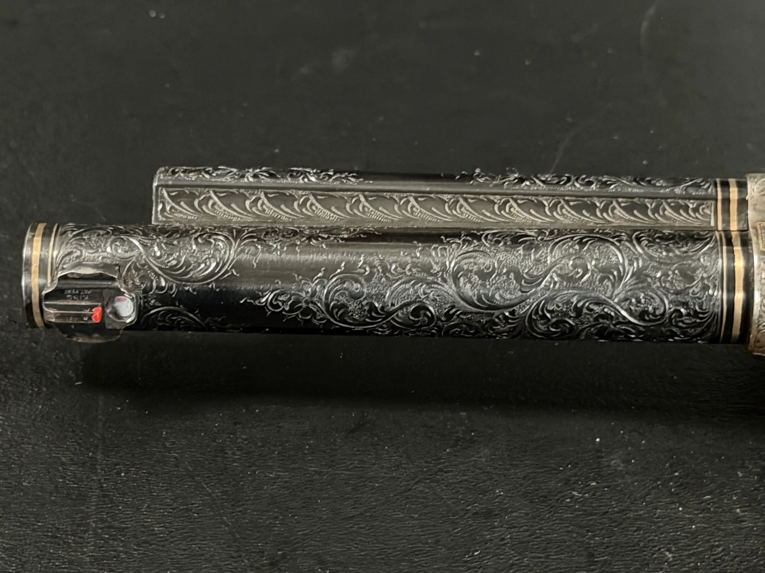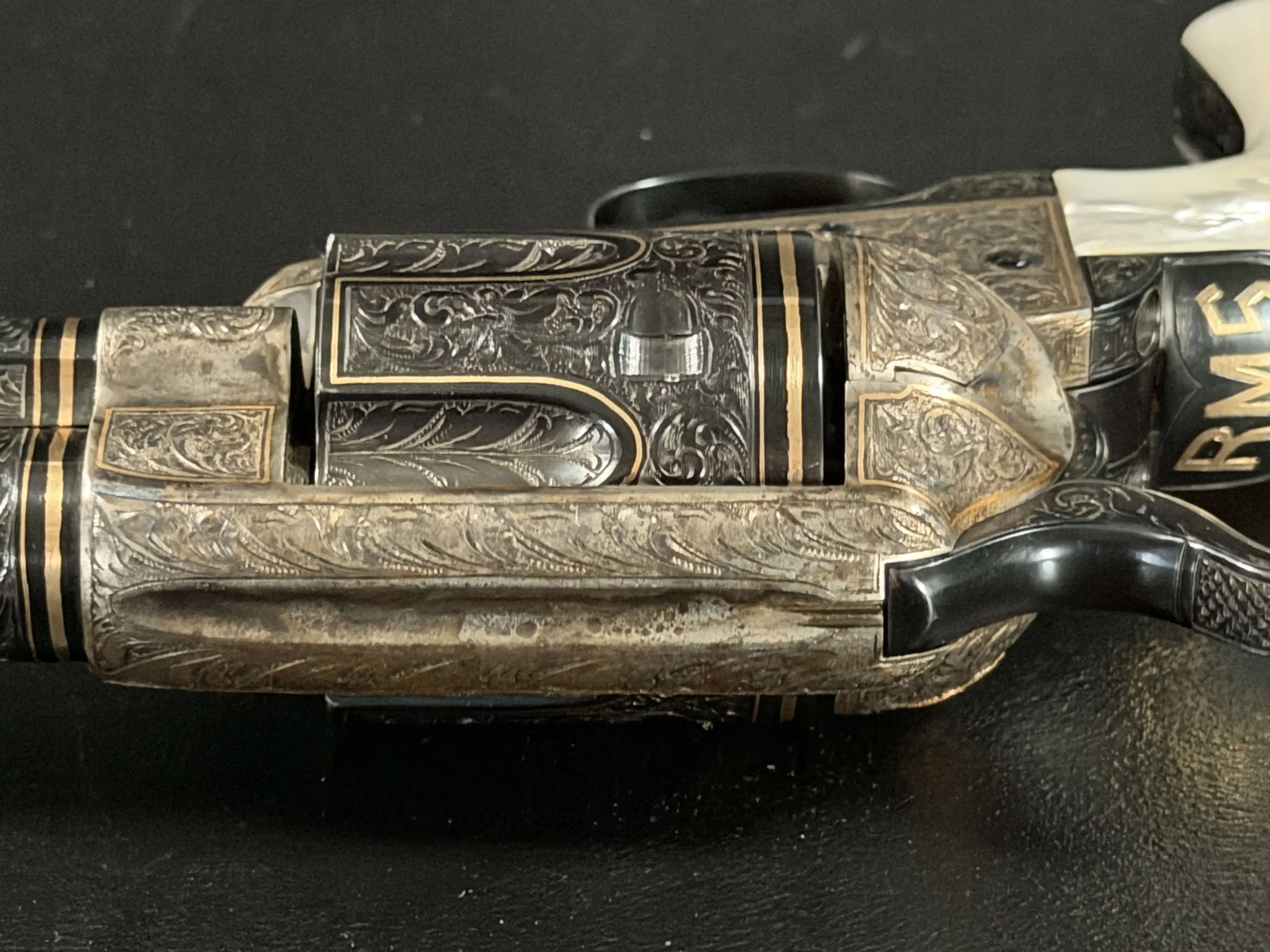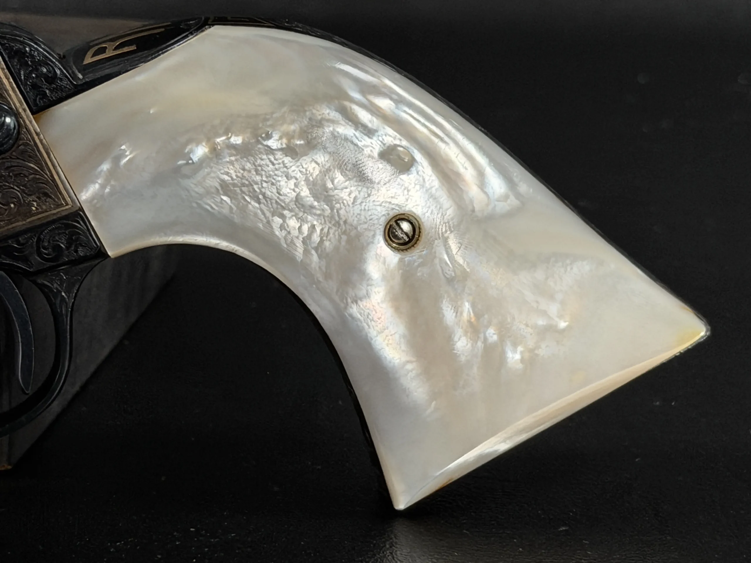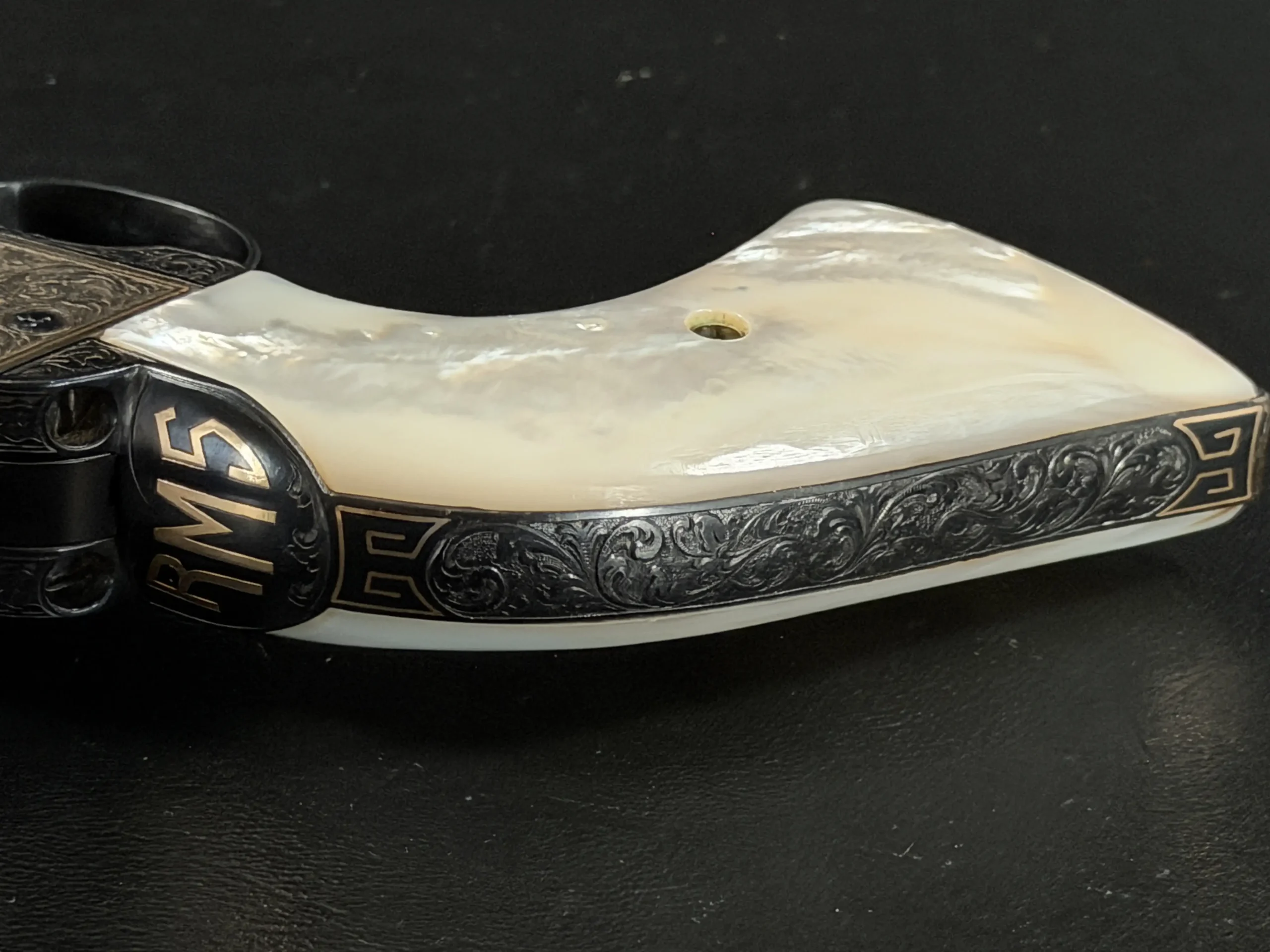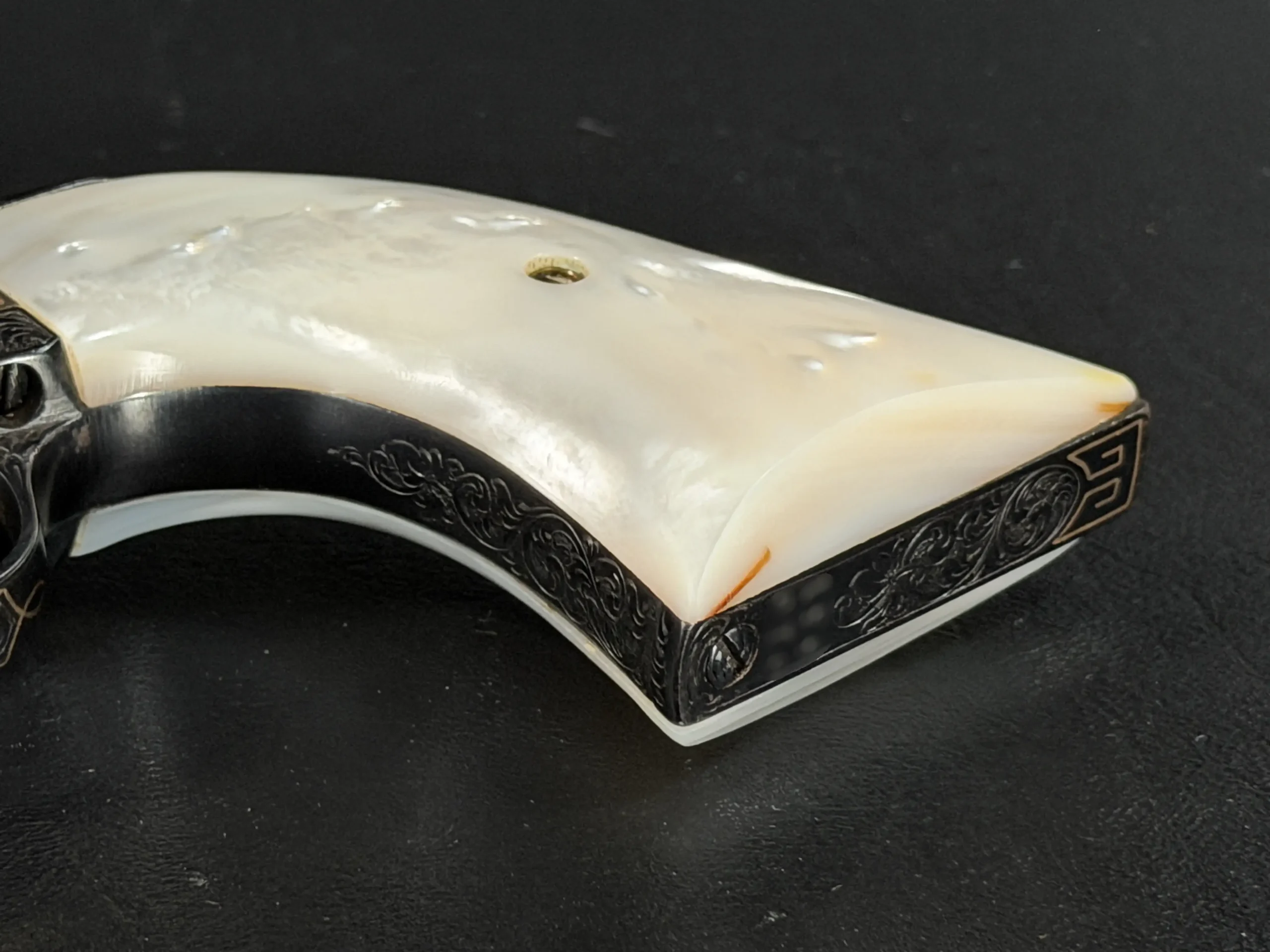 The cylinder stands out as a focal point, with engraved borders and ornamental detailing that continue the revolver’s visual rhythm. Natural pearl grips provide a luminous counterpoint to the metalwork, balancing the darker finish with soft iridescence and elegant texture.