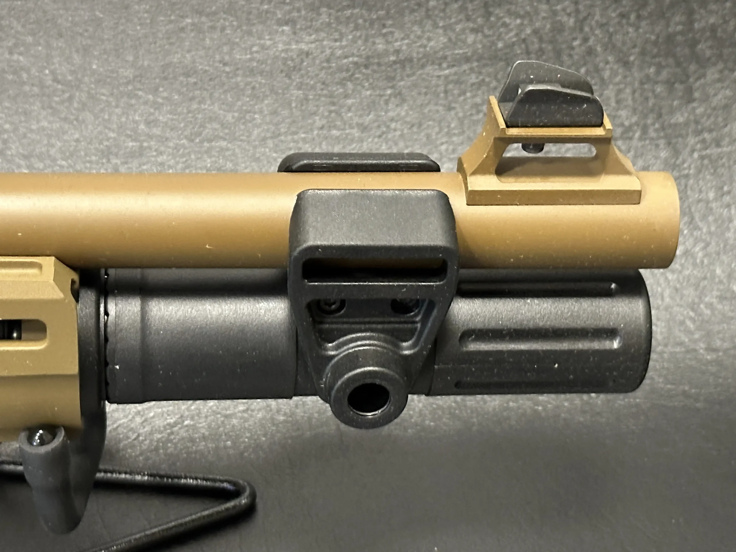 The streamlined forend features aggressive texturing and M-LOK compatibility for accessory mounting, while the barrel is paired with a magazine extension and protective clamp system. Up top, the receiver is optics-ready with a tactical rail and ghost ring sights for flexible sighting options. Enlarged controls, including the charging handle and bolt release, further enhance ease of manipulation.