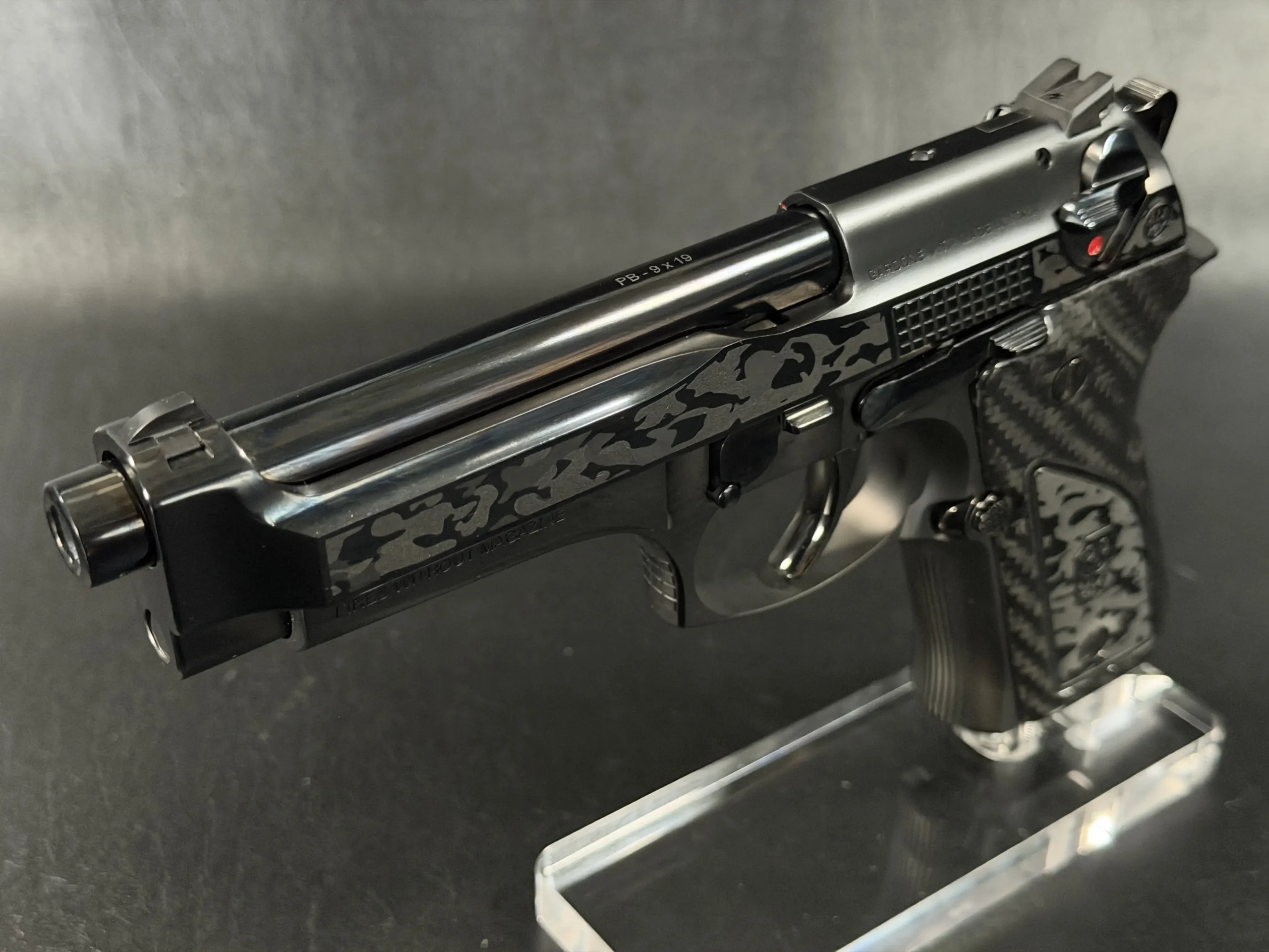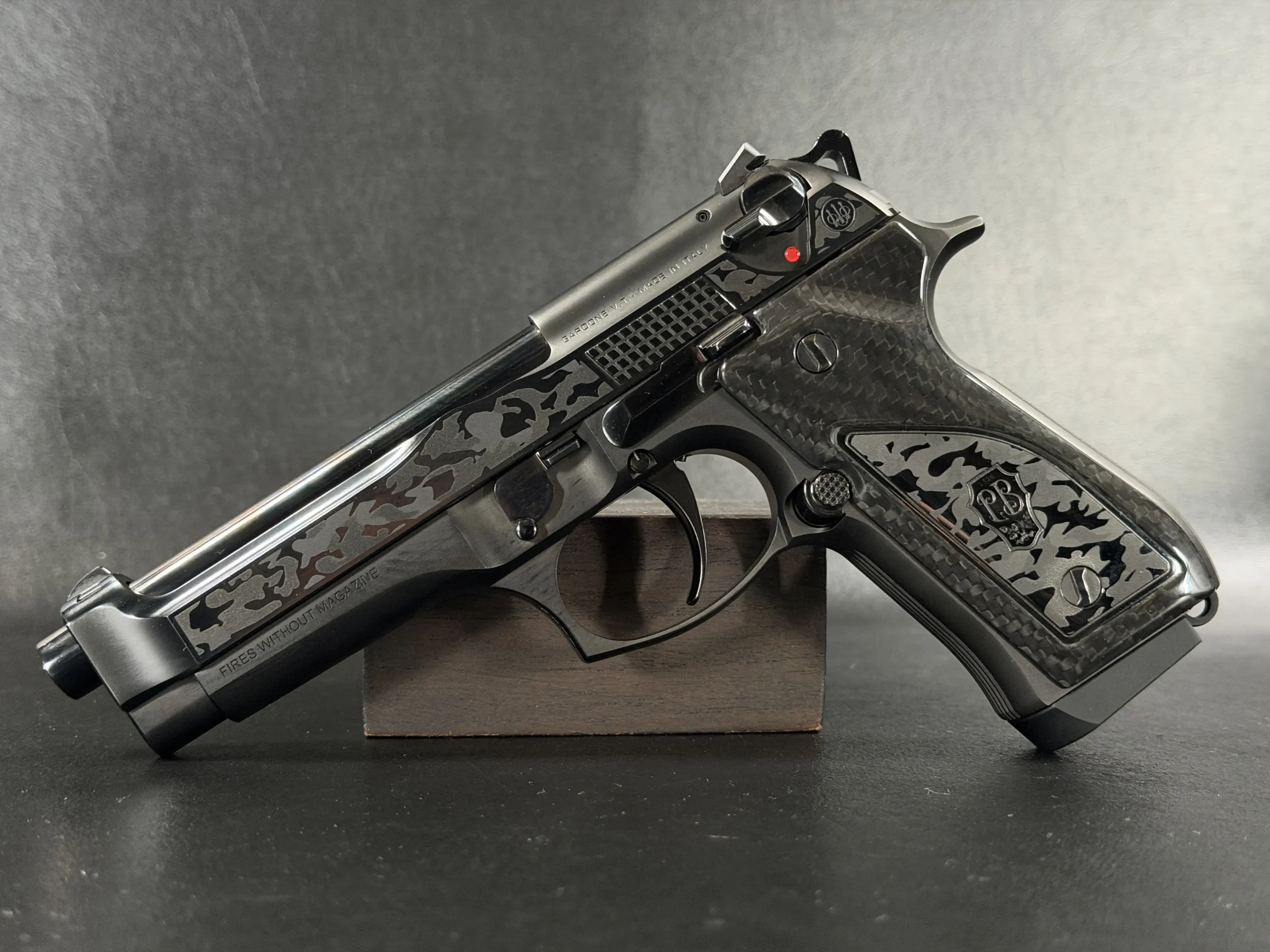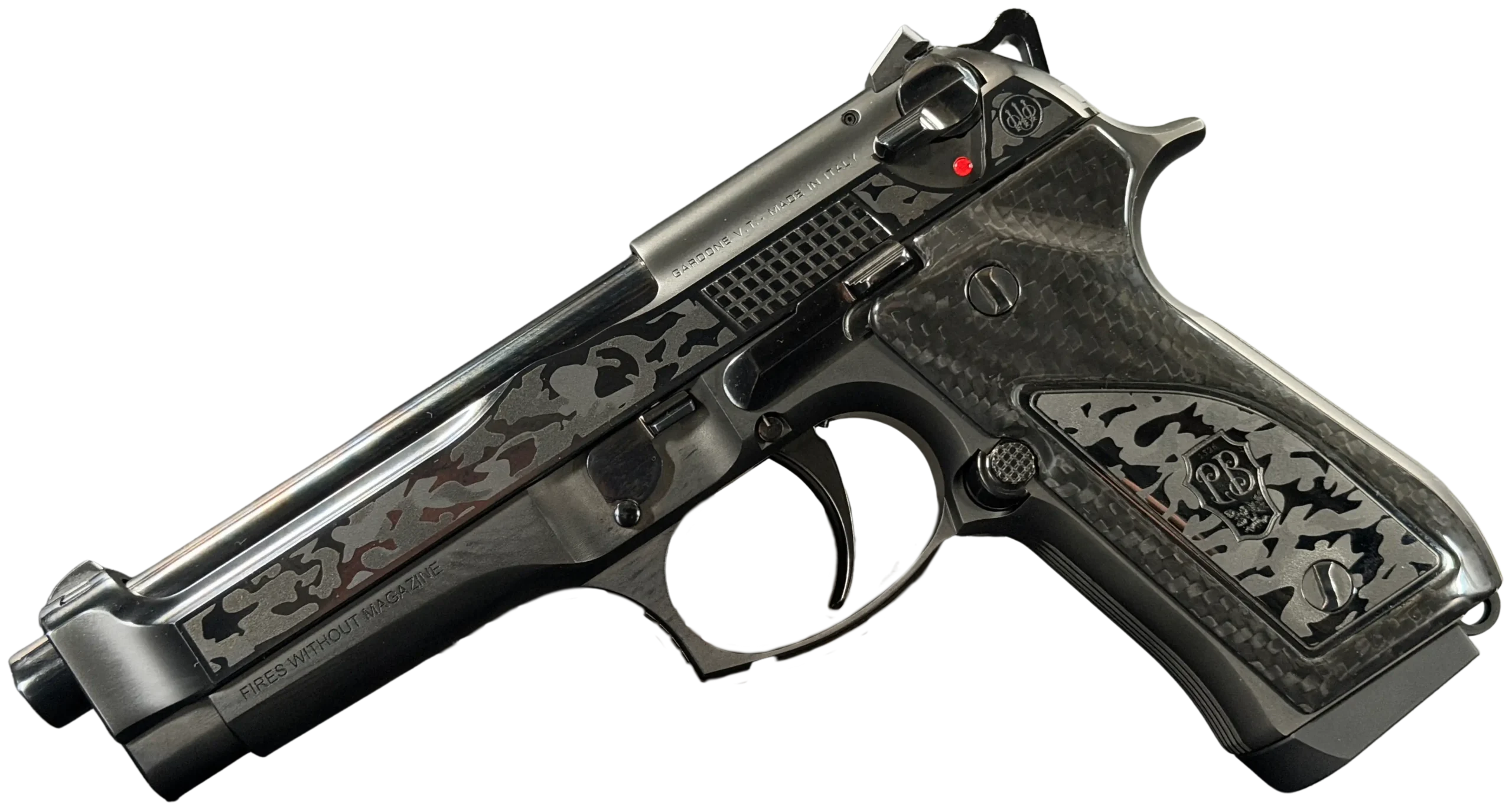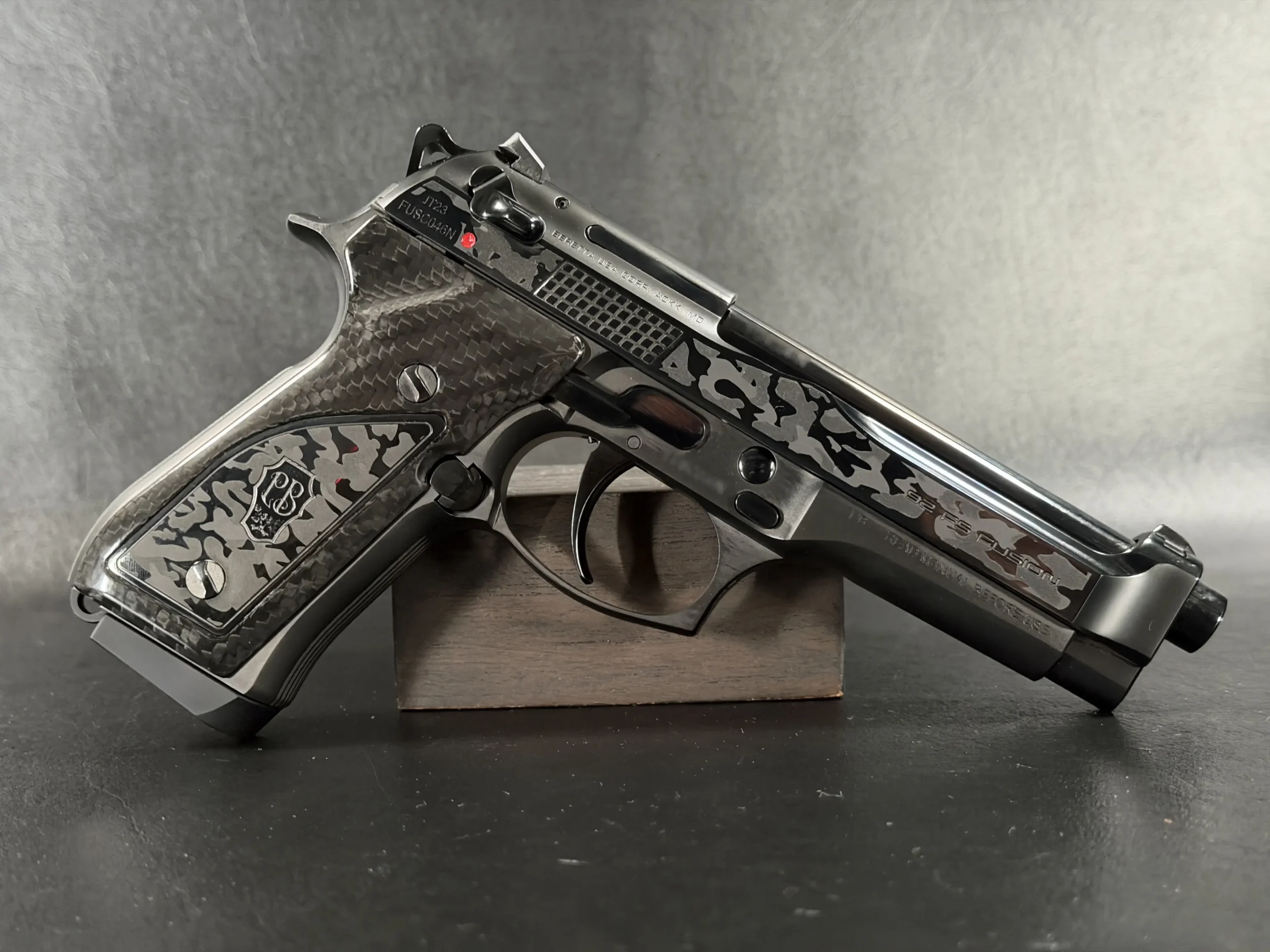 This model is hand-fitted by Beretta’s PB Selection gunsmiths. It is further distinguished by carbon fiber grip panels with inlaid OCP-style accents and the PB crest, combining a contemporary visual treatment with the established 92FS format.