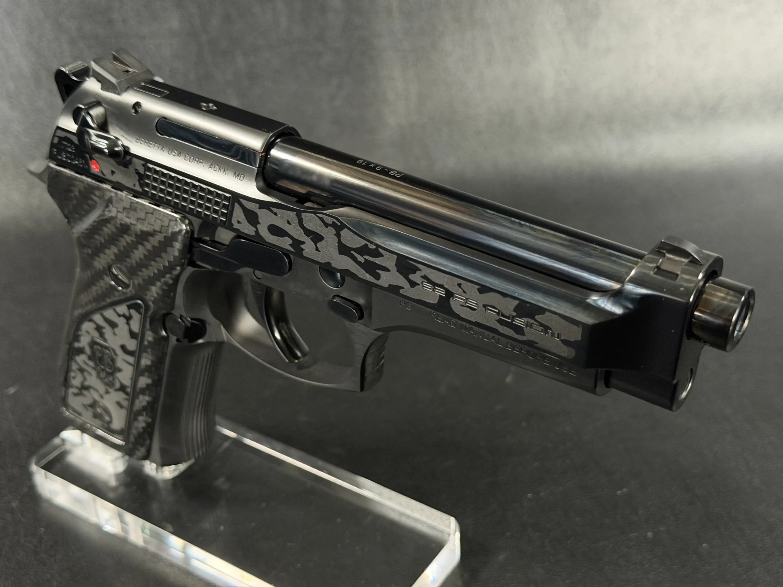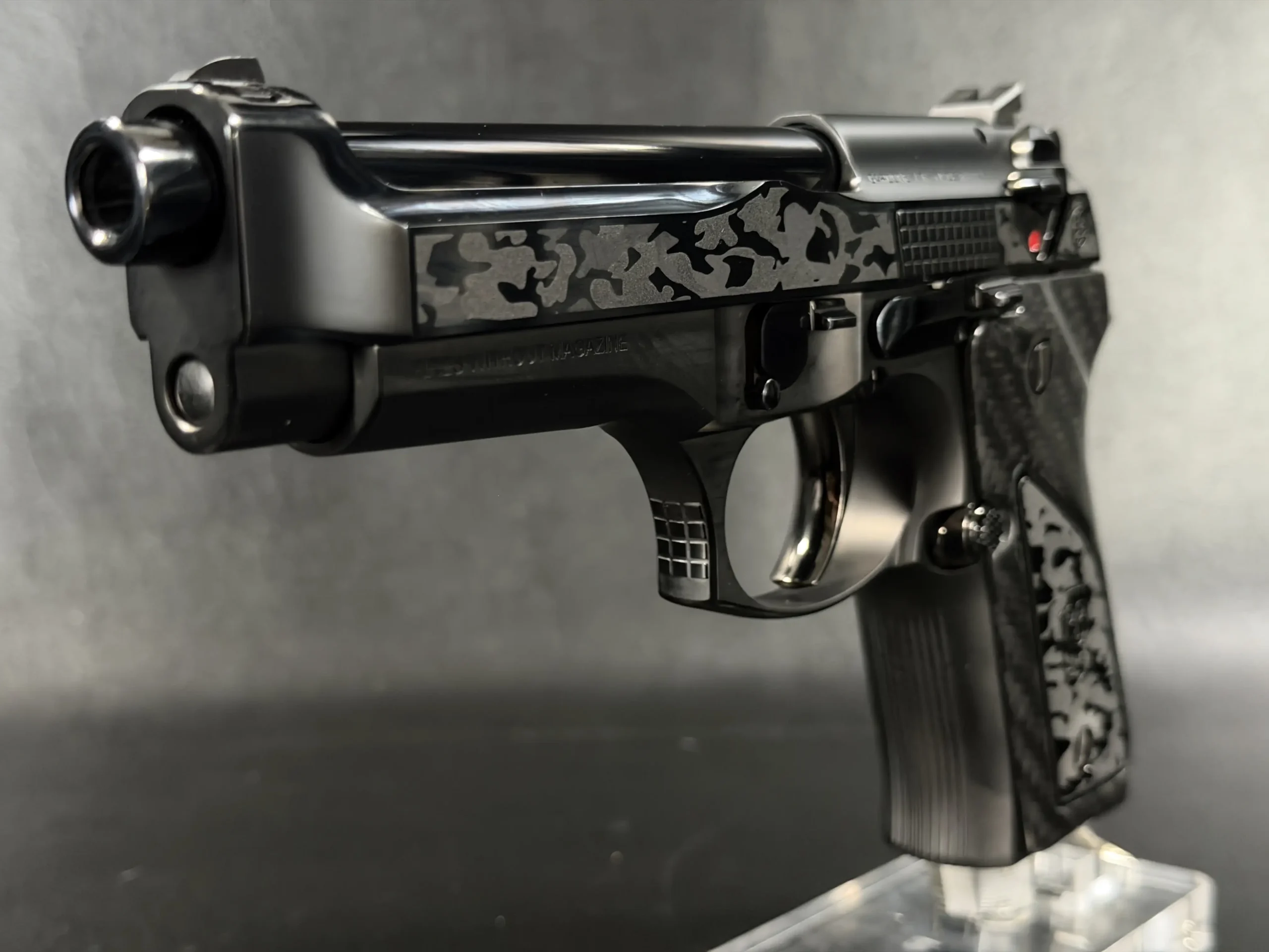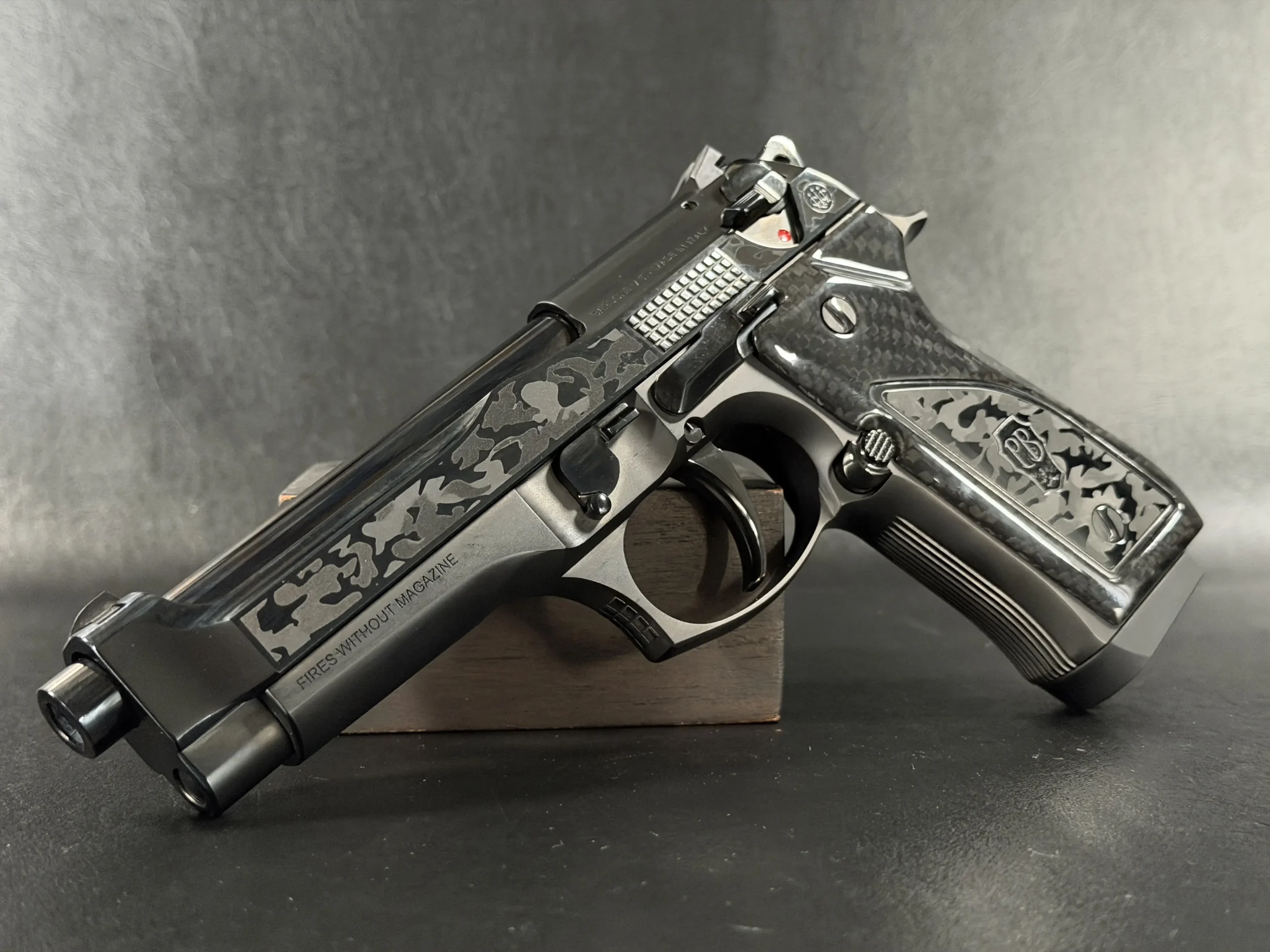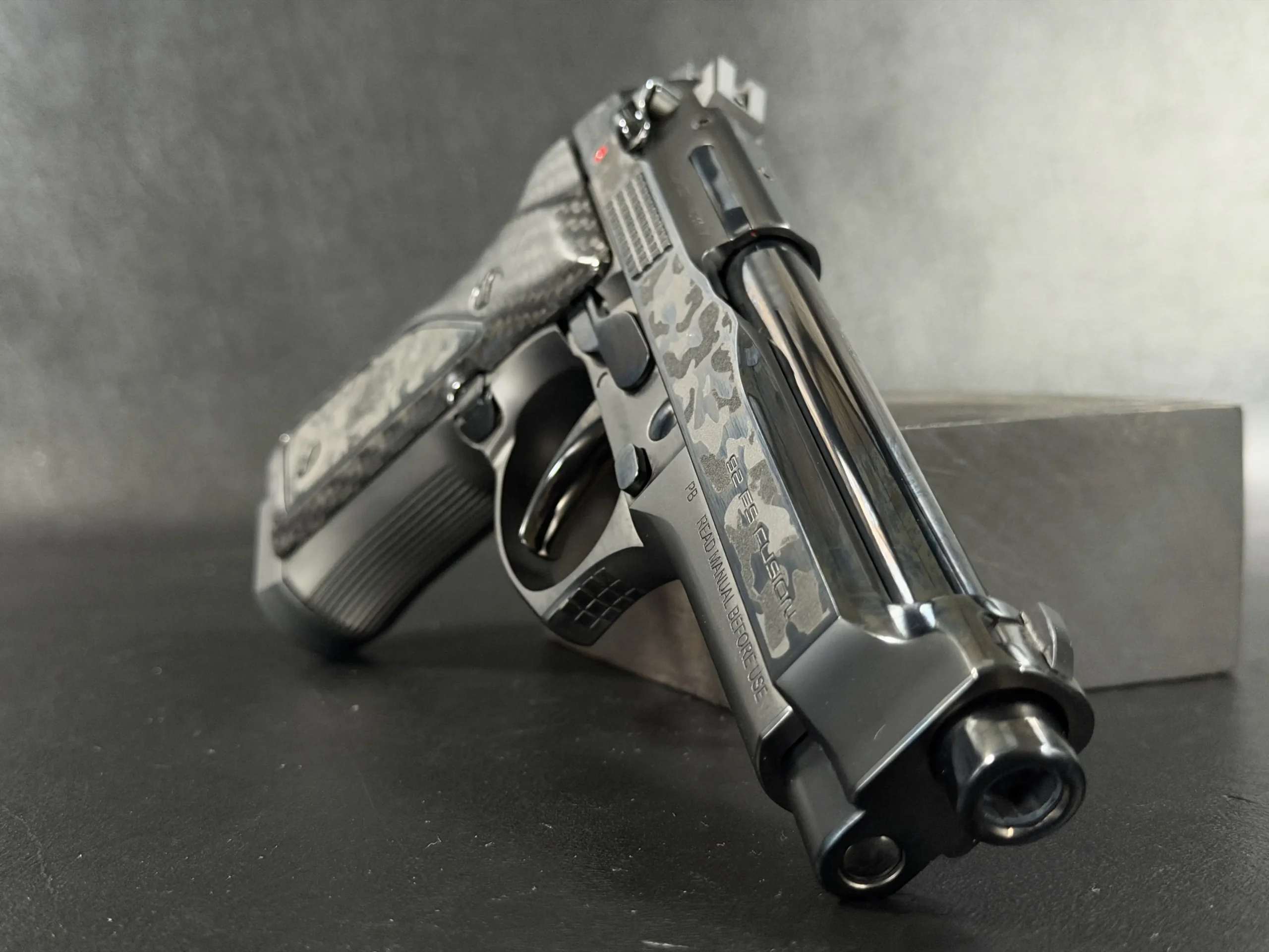This model is hand-fitted by Beretta’s PB Selection gunsmiths. It is further distinguished by carbon fiber grip panels with inlaid OCP-style accents and the PB crest, combining a contemporary visual treatment with the established 92FS format.