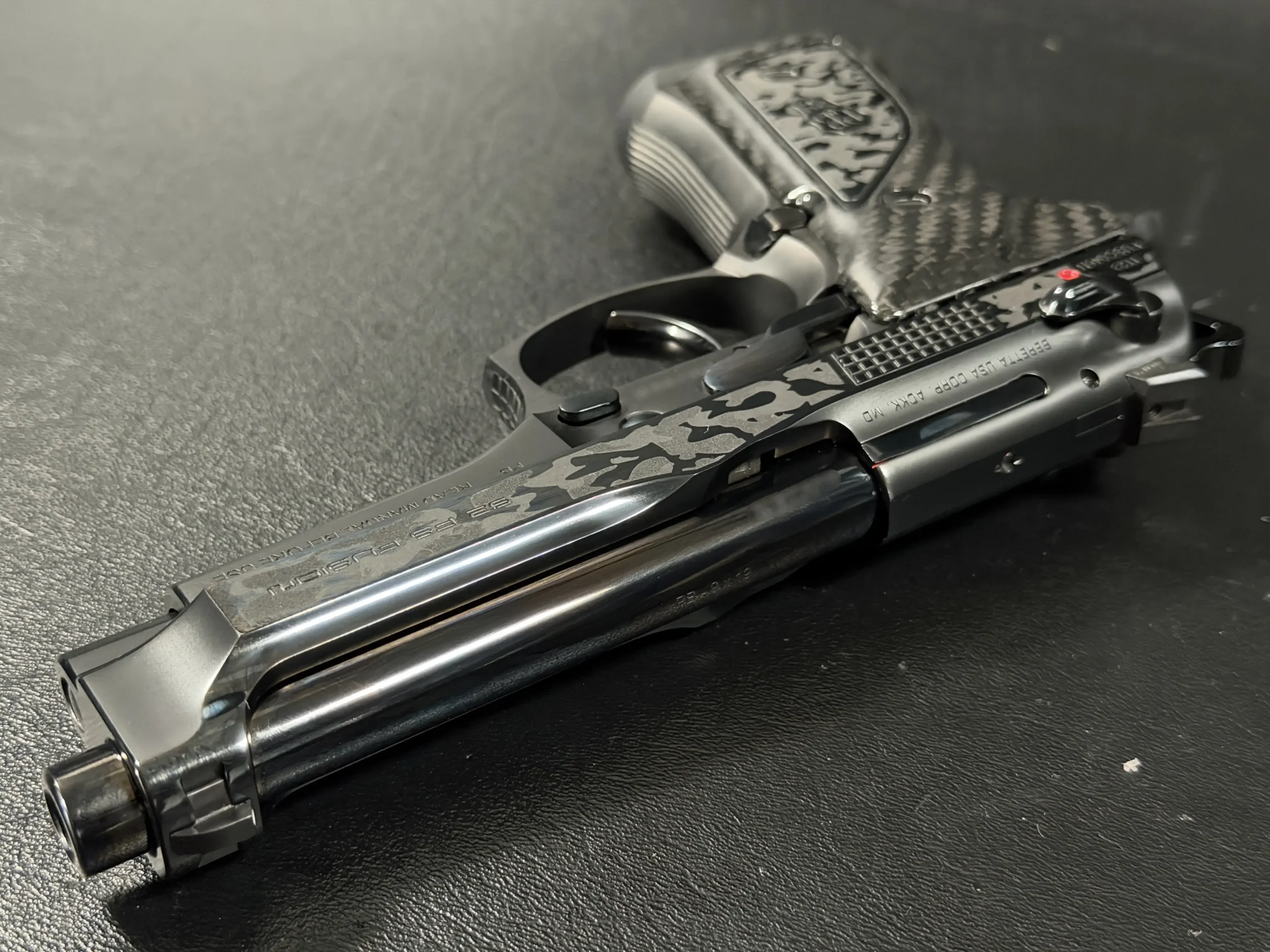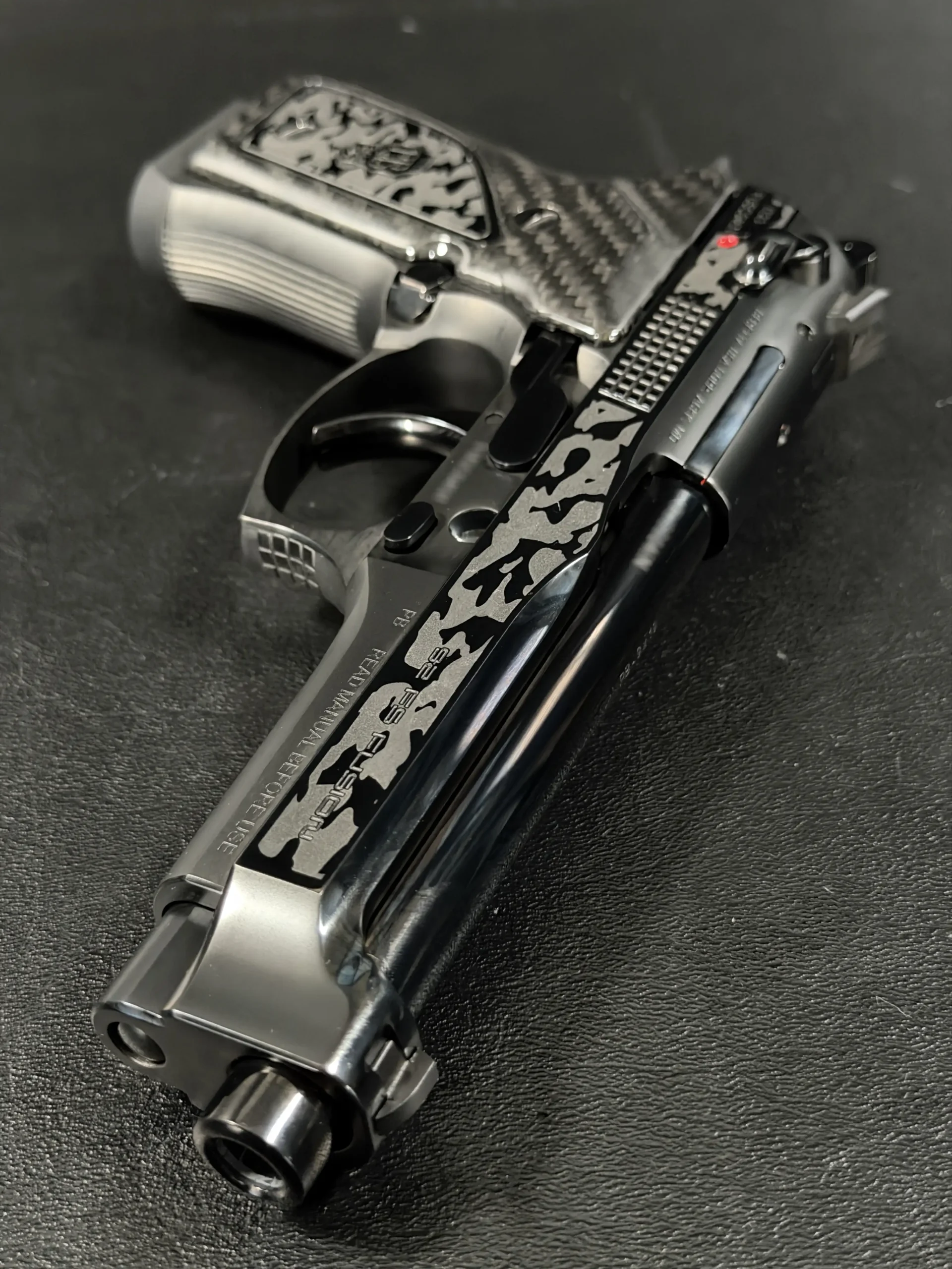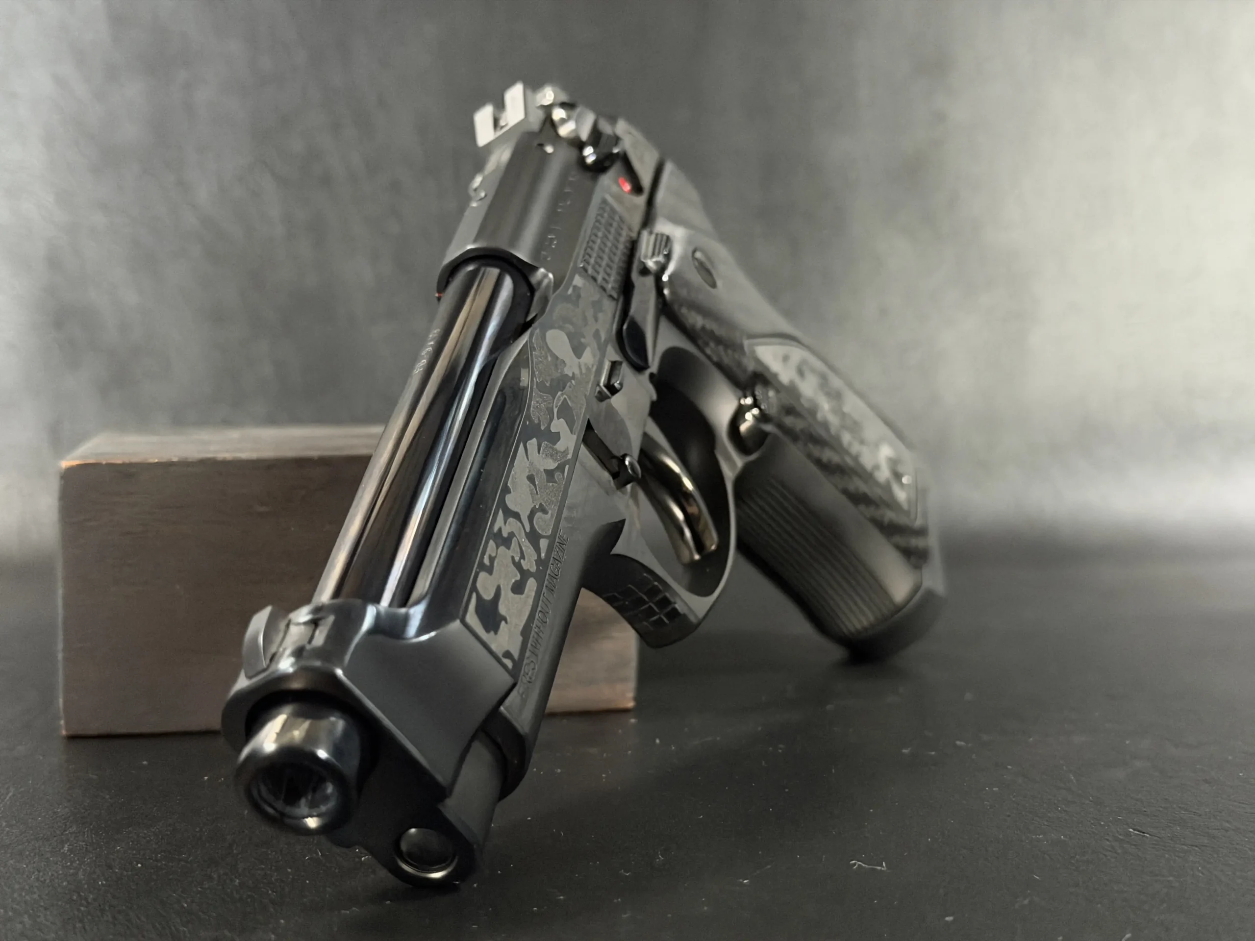 The slide and frame feature OCP-inspired laser engraving that gives the pistol a distinctive, understated look. Major components including the frame, slide, barrel, and internal elements are finished with a DLC (Diamond-Like Carbon) coating, creating a deep black surface and adding a modern technical touch to the platform.