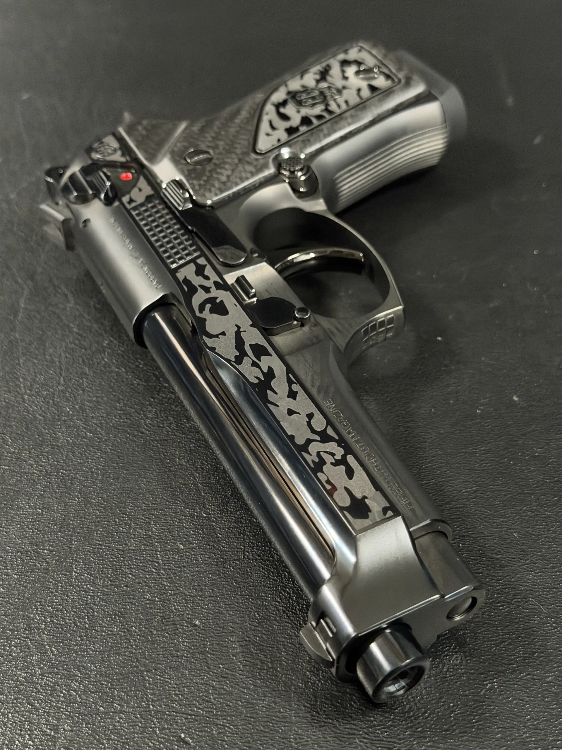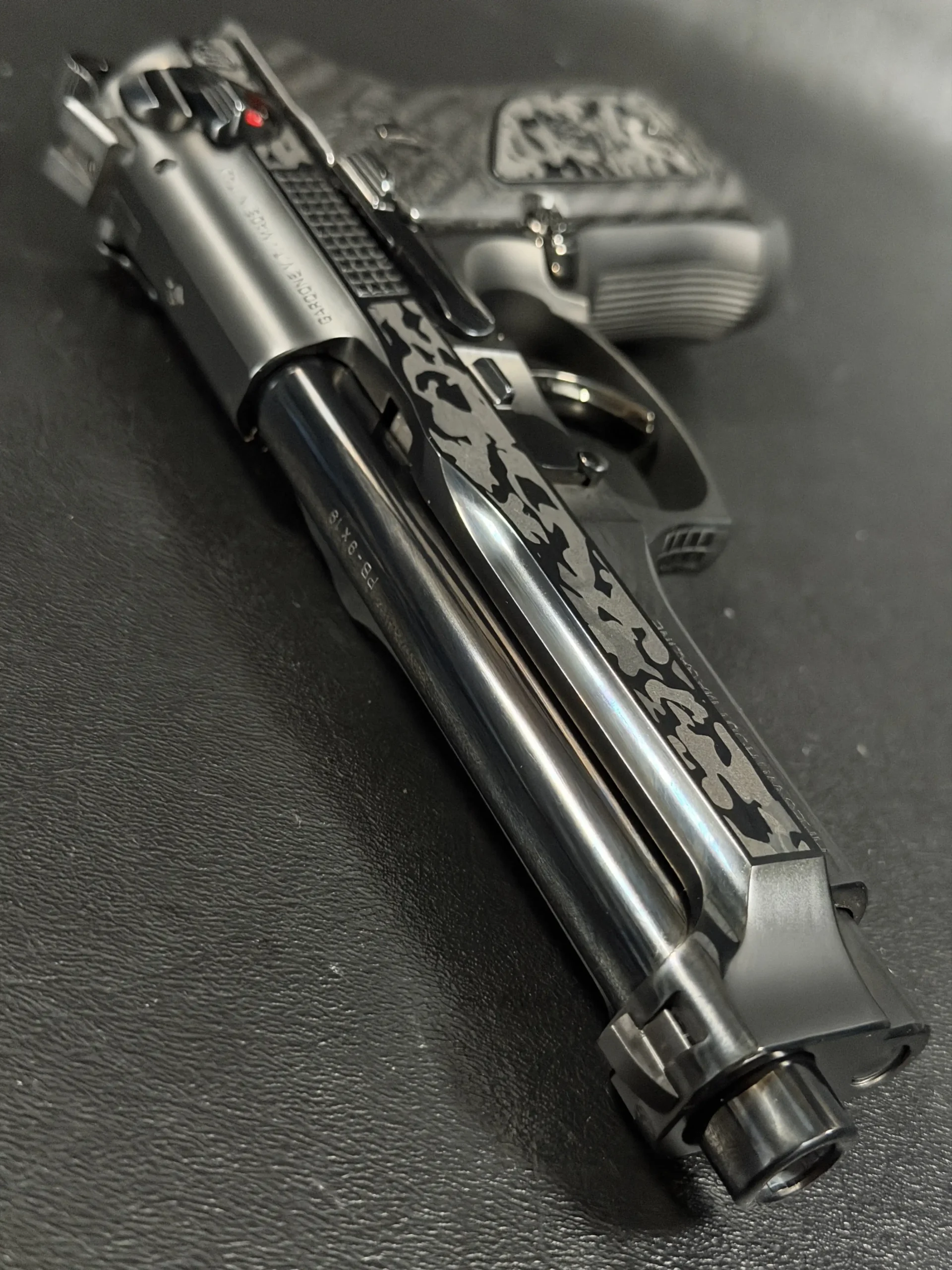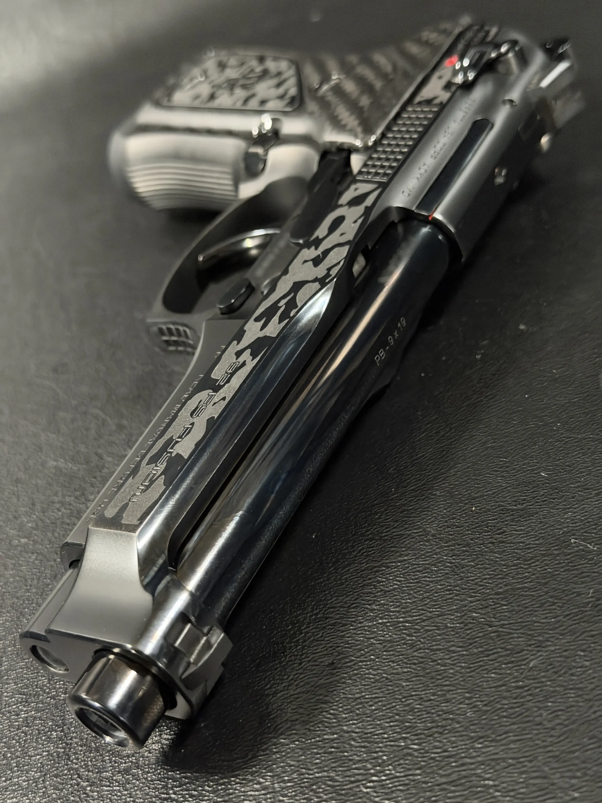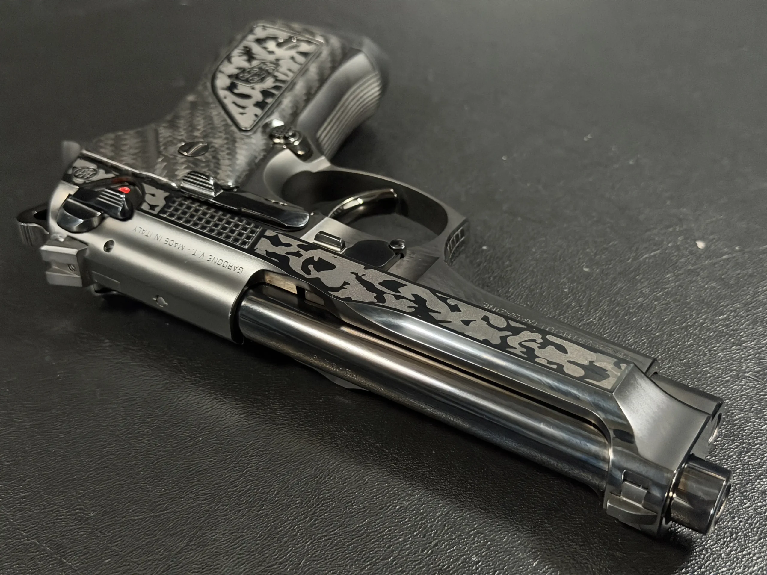 The slide and frame feature OCP-inspired laser engraving that gives the pistol a distinctive, understated look. Major components including the frame, slide, barrel, and internal elements are finished with a DLC (Diamond-Like Carbon) coating, creating a deep black surface and adding a modern technical touch to the platform.