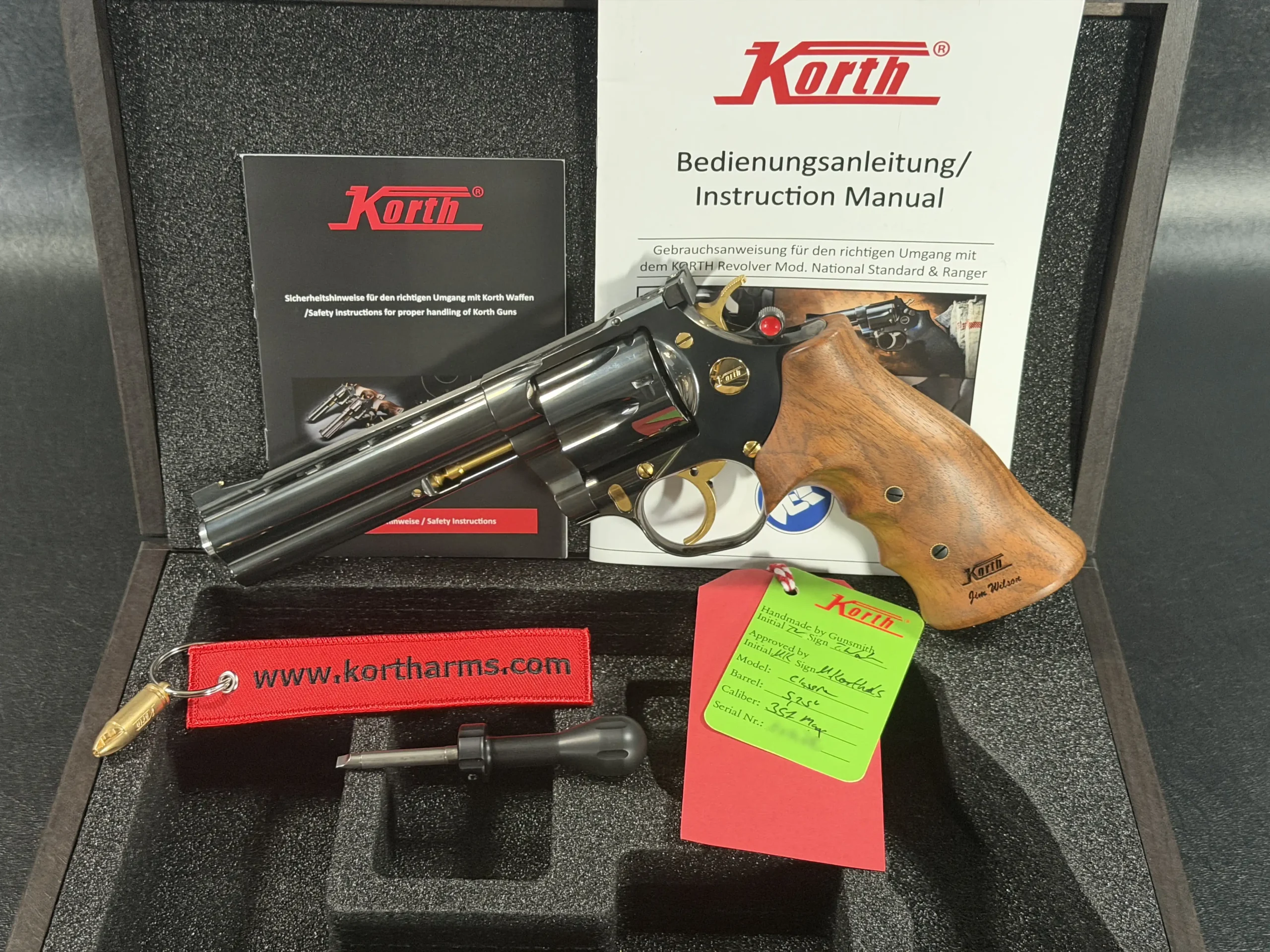 Chambered in .357 Magnum, this Black Korth Classic features a 6-inch barrel, deep black finish, gold-tone accents, and contoured walnut grips. It is presented in its factory case with accompanying accessories and documentation.