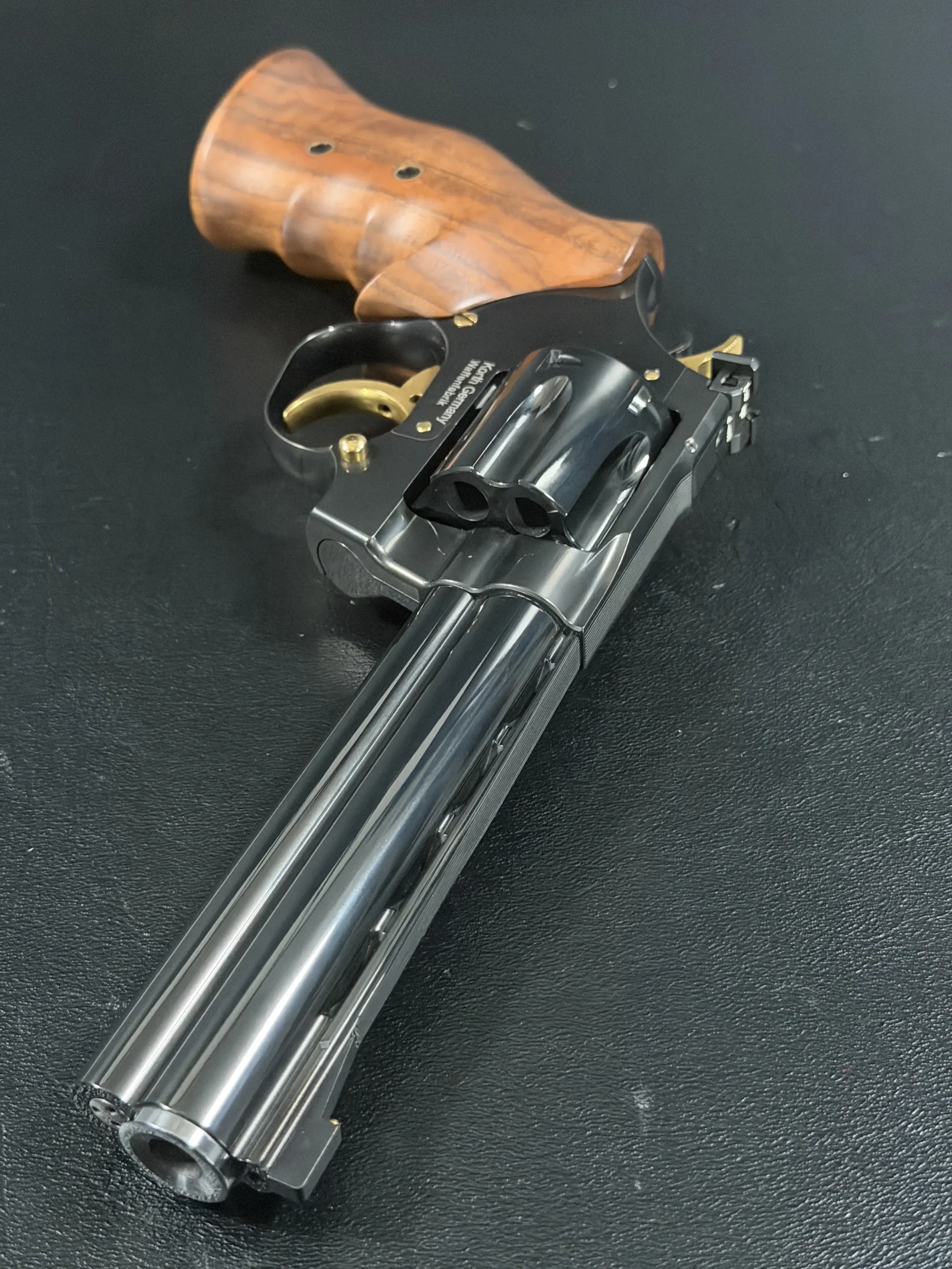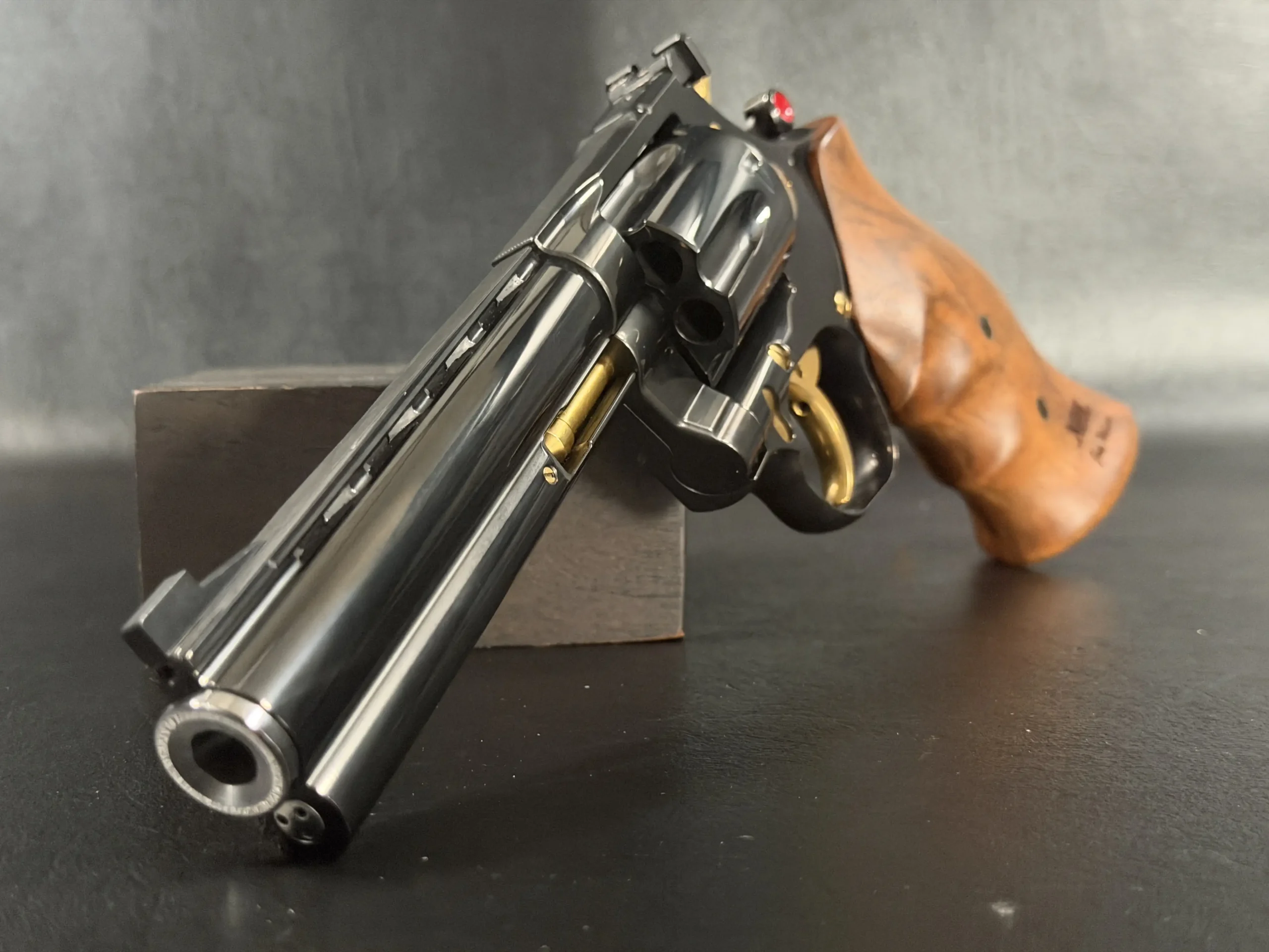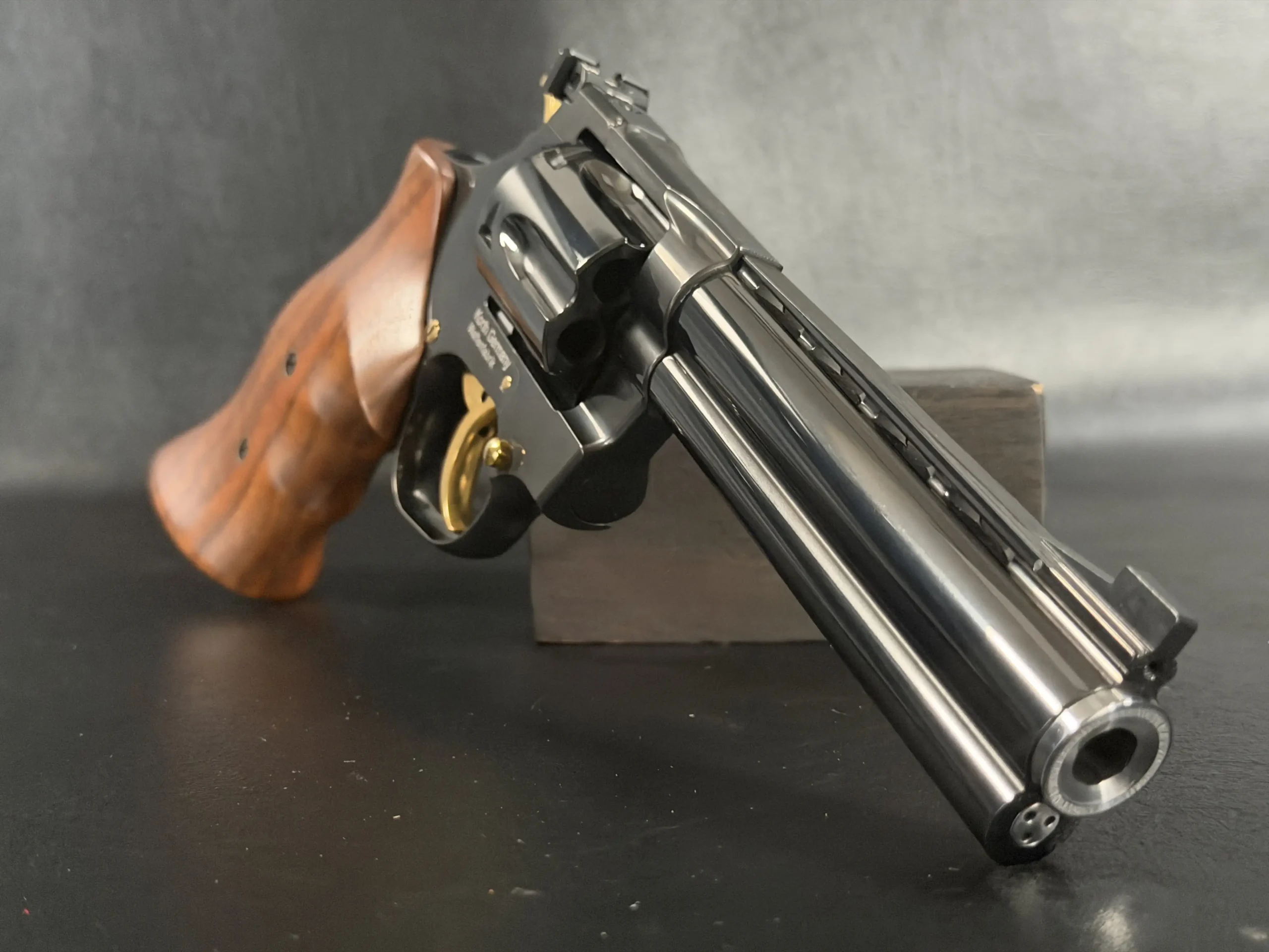 The deep black finish gives the revolver a bold, polished look, highlighting the contours of the frame, cylinder, and ventilated rib barrel. Gold-tone accents on the trigger, hammer, and small controls add visual contrast while preserving the model’s clean, traditional lines.