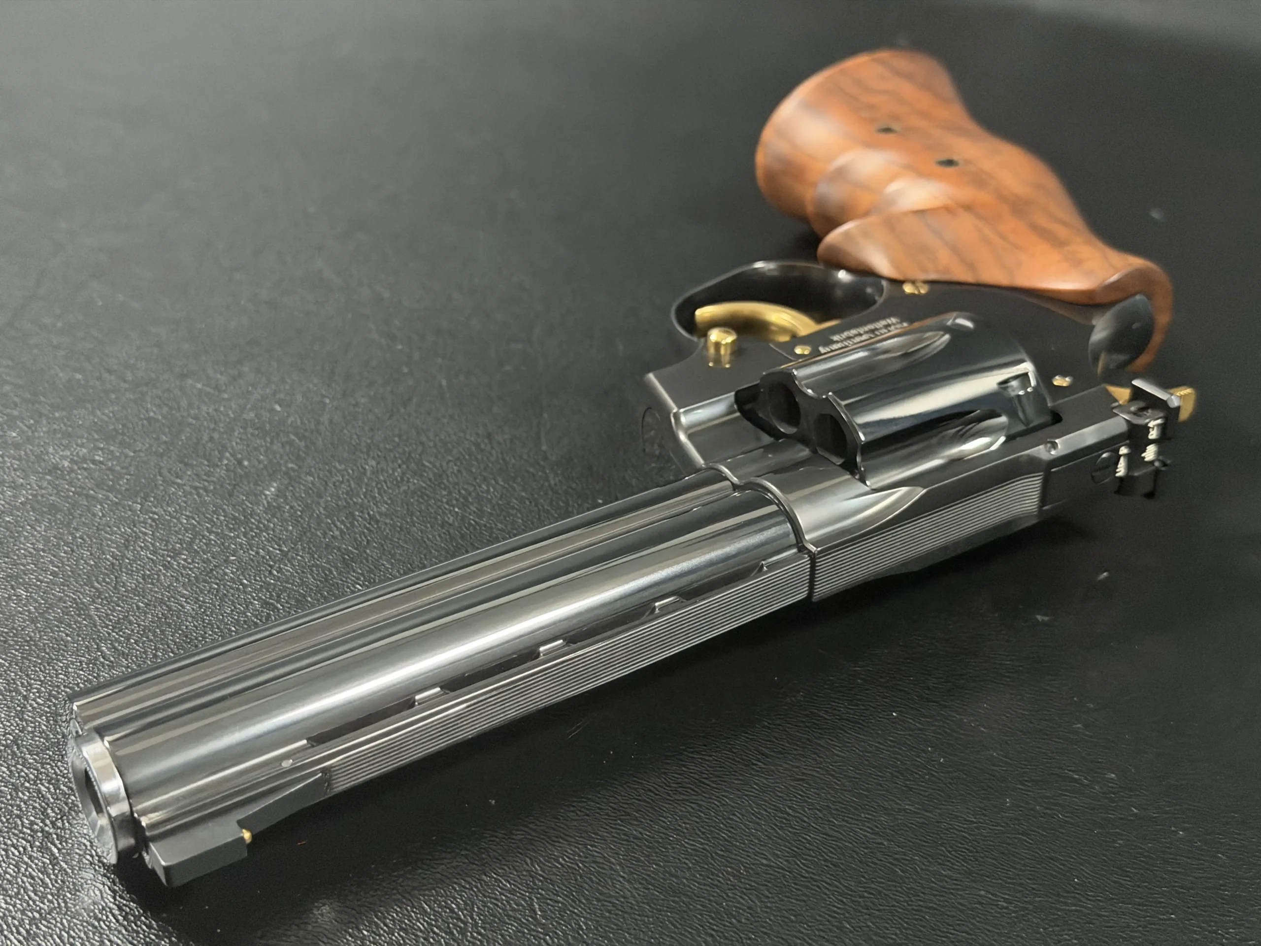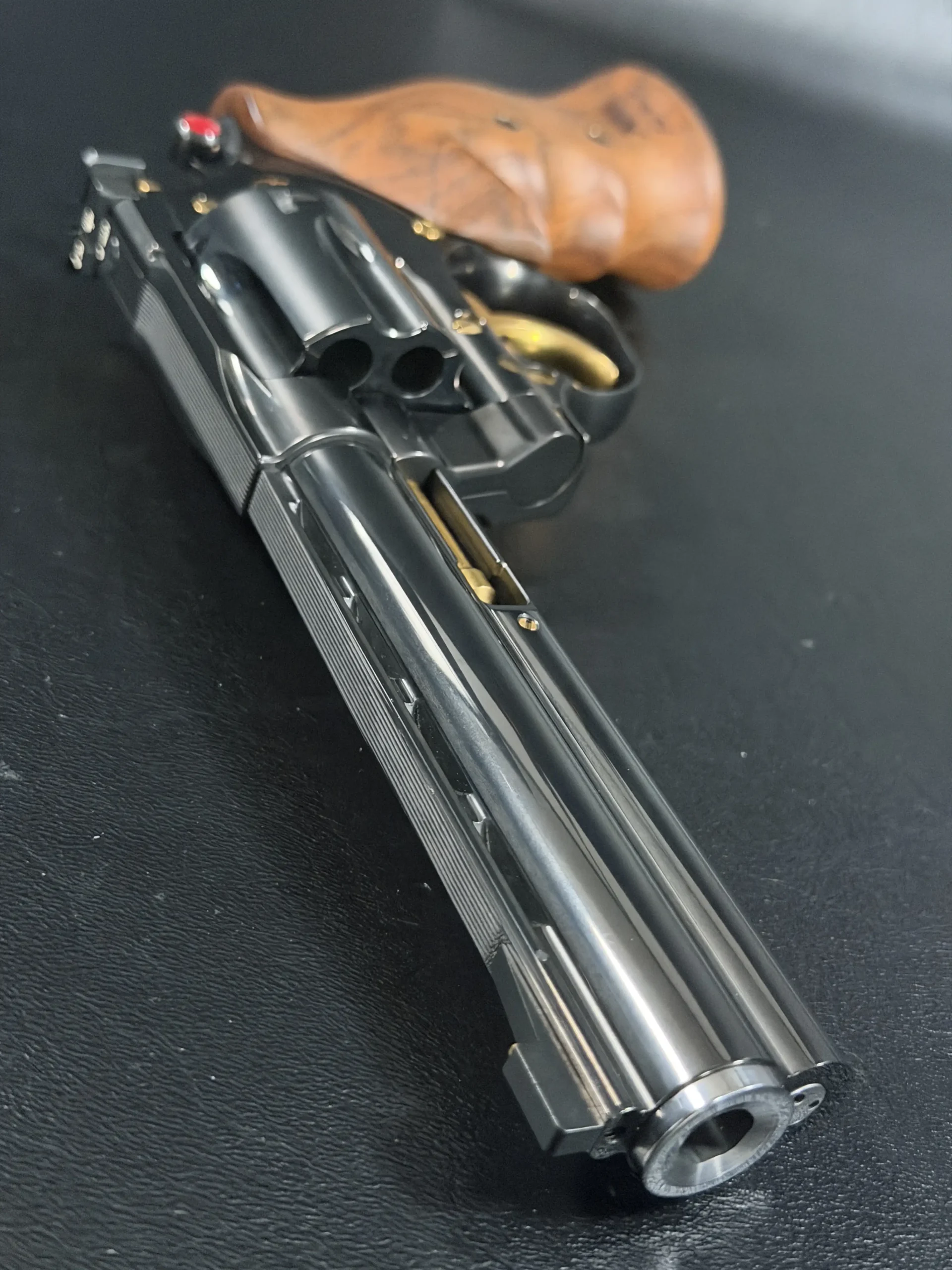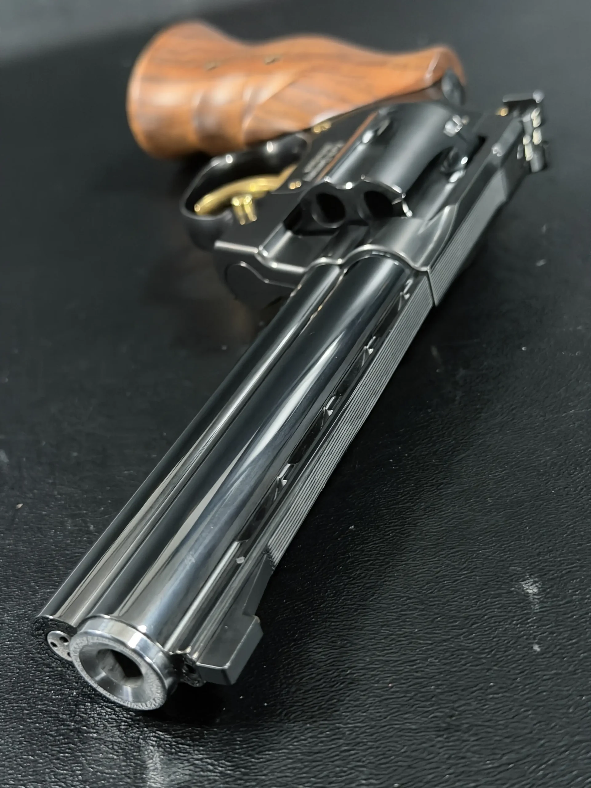 The deep black finish gives the revolver a bold, polished look, highlighting the contours of the frame, cylinder, and ventilated rib barrel. Gold-tone accents on the trigger, hammer, and small controls add visual contrast while preserving the model’s clean, traditional lines.