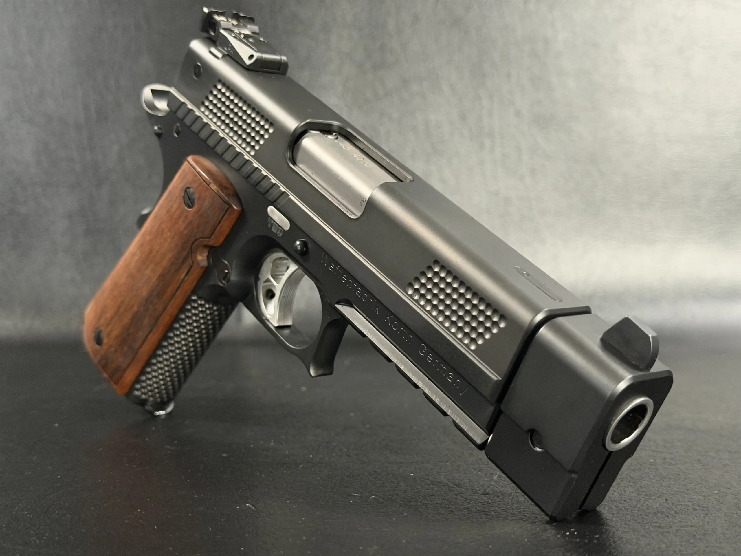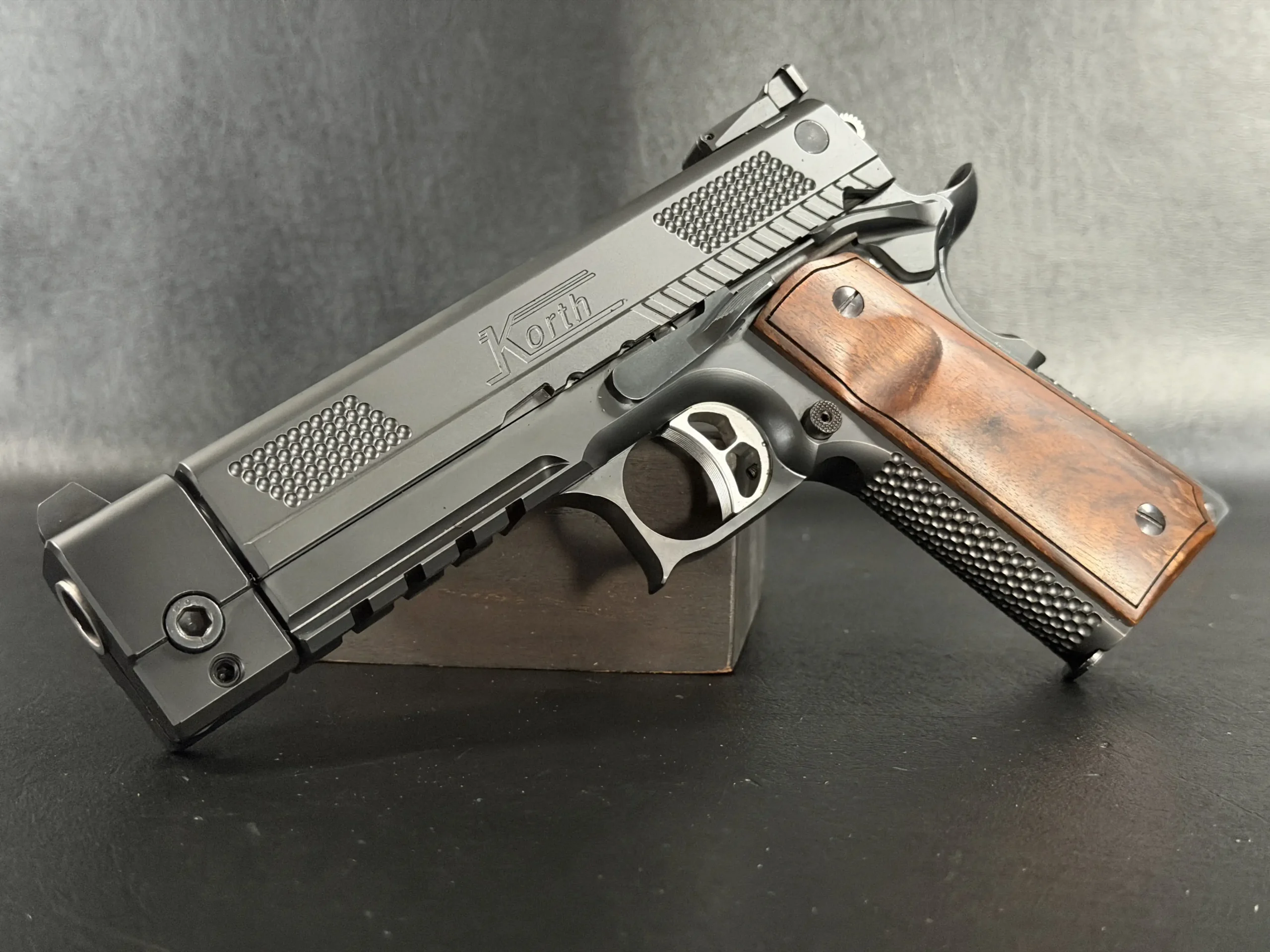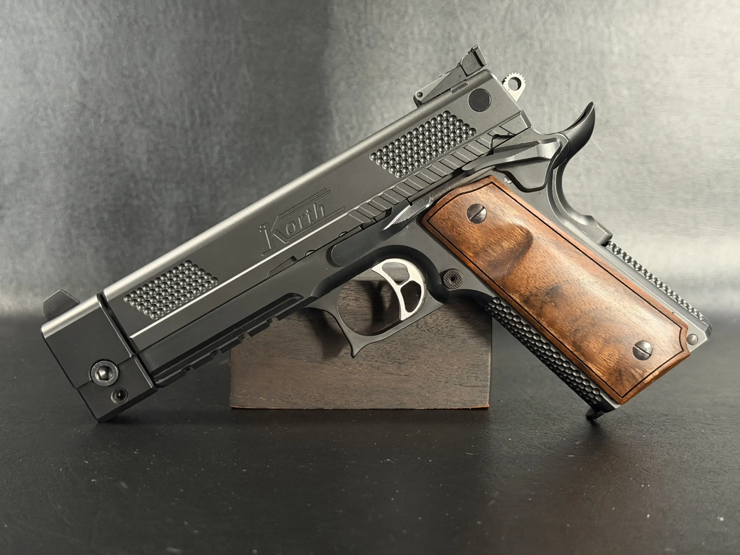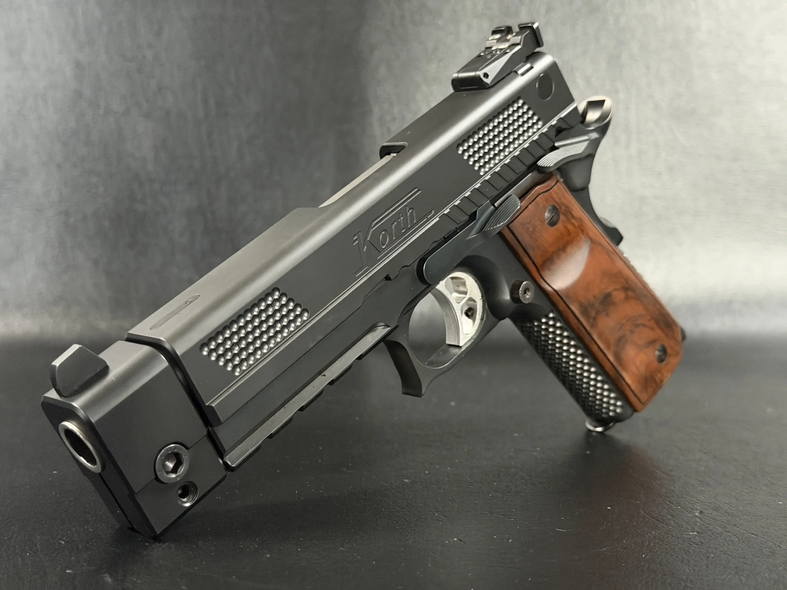 The Korth PRS 5" in .45 ACP reflects the brand’s distinctive approach to semi-automatic pistol design, combining hand-built German manufacture with a refined, modern presentation. This example features a matte black finish paired with figured walnut grip panels for a look that is both understated and striking.