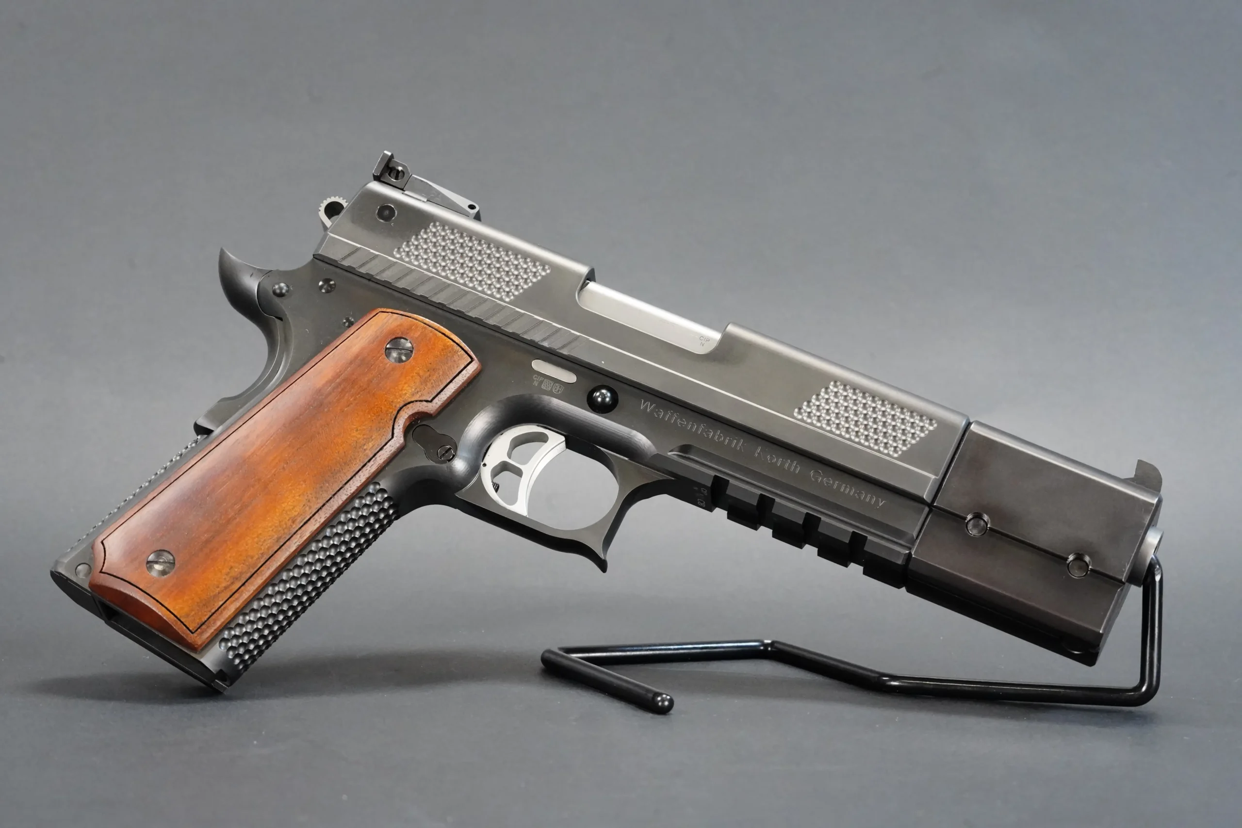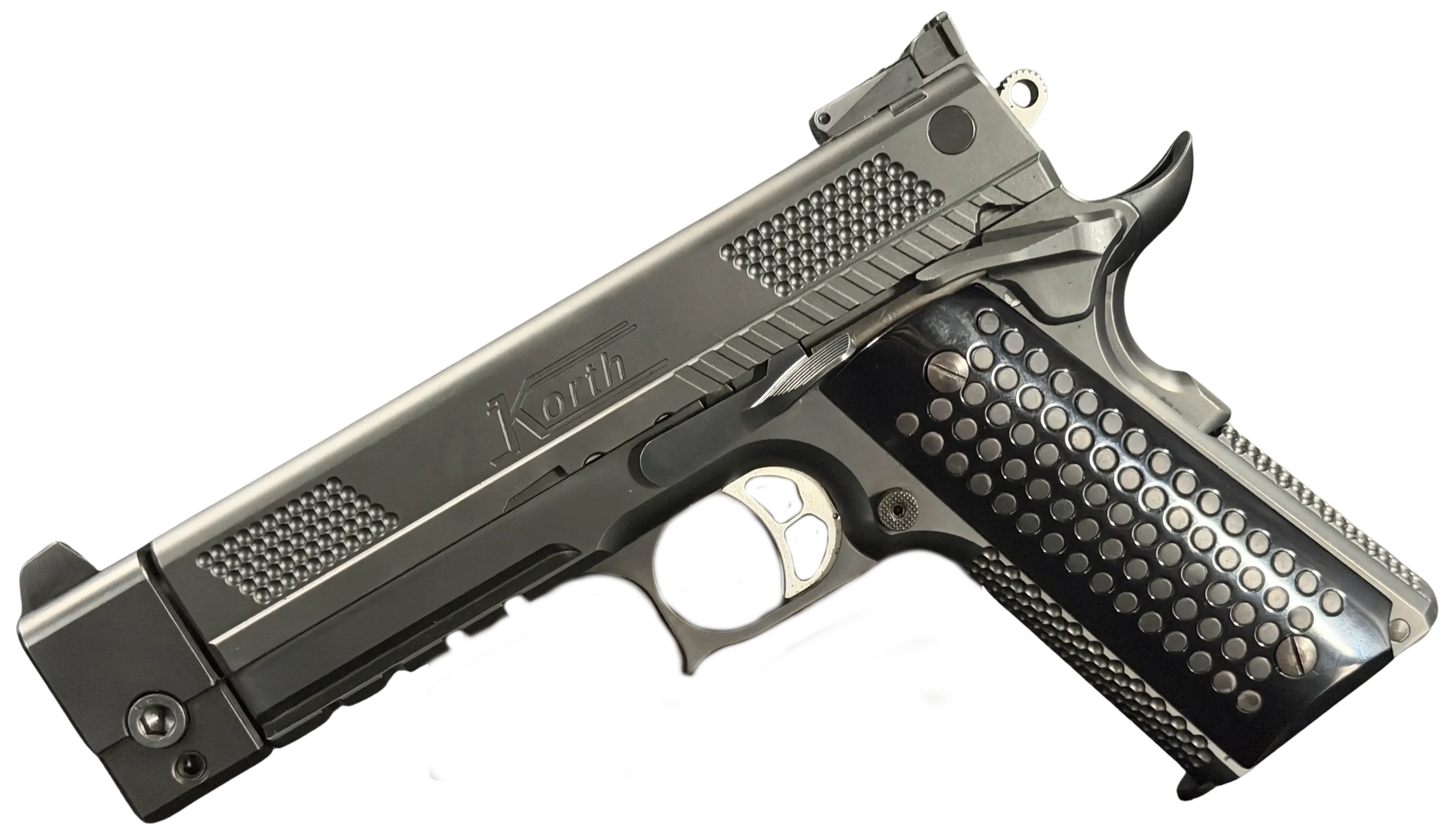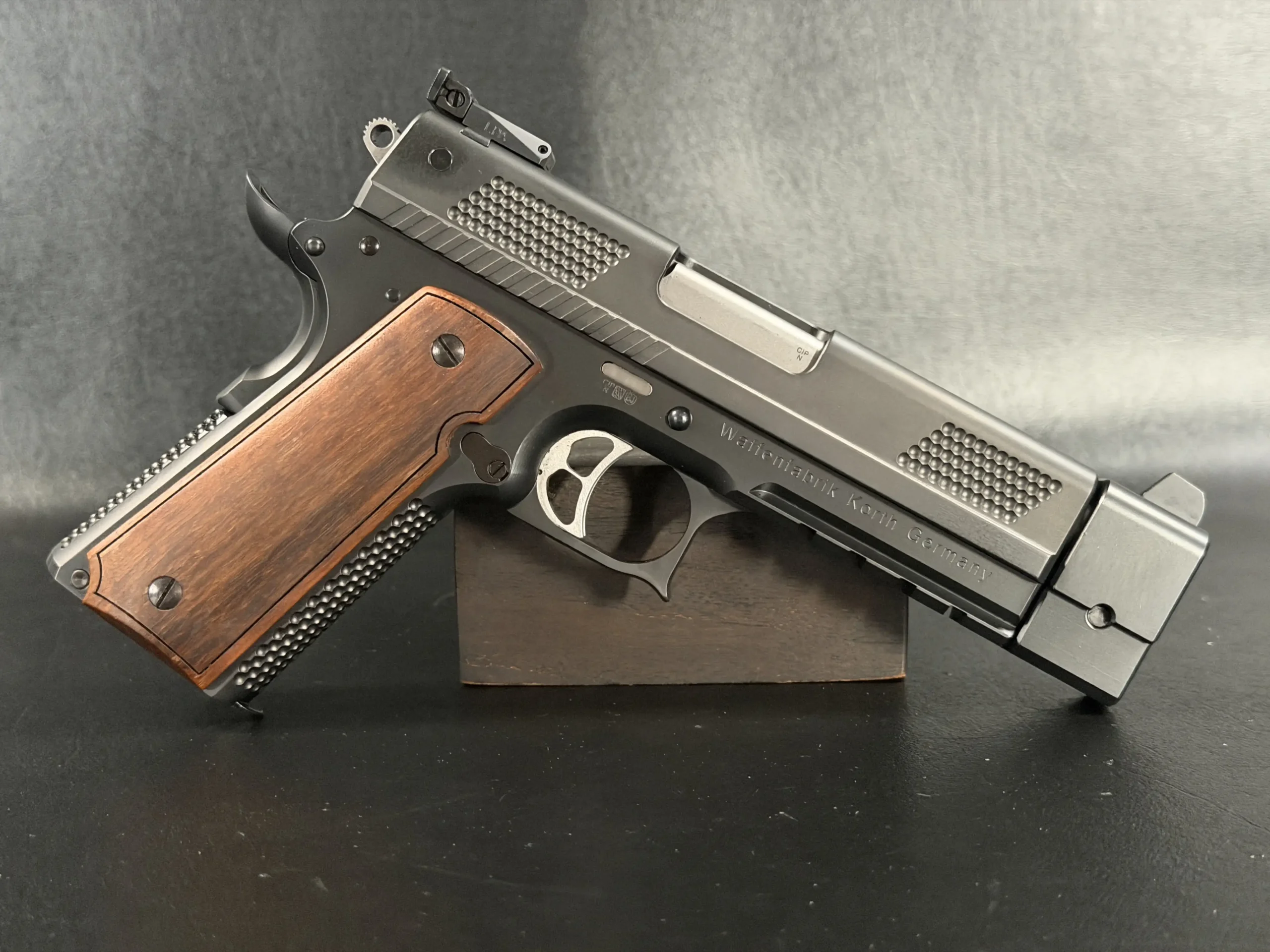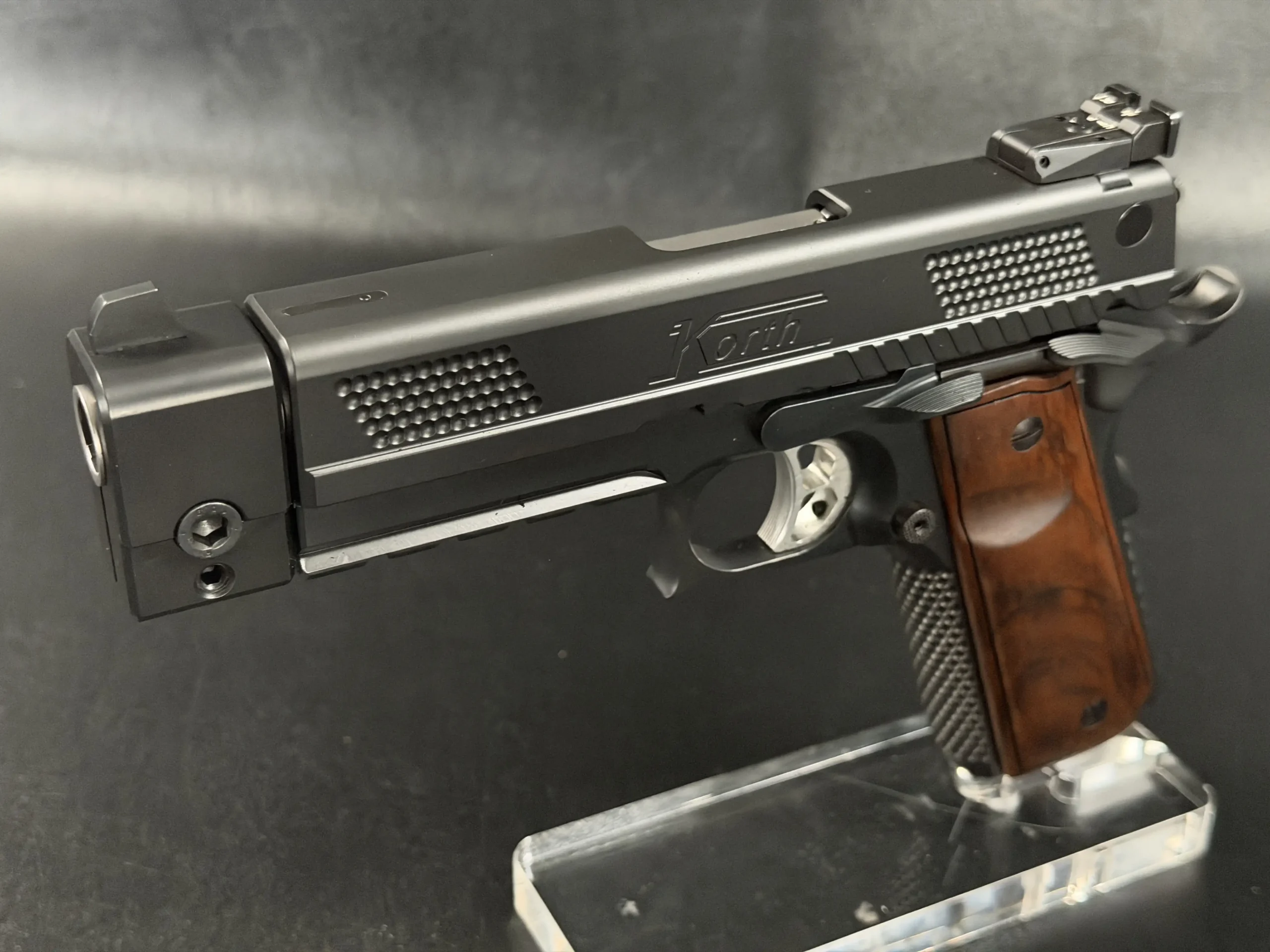 The Korth PRS 5" in .45 ACP reflects the brand’s distinctive approach to semi-automatic pistol design, combining hand-built German manufacture with a refined, modern presentation. This example features a matte black finish paired with figured walnut grip panels for a look that is both understated and striking.