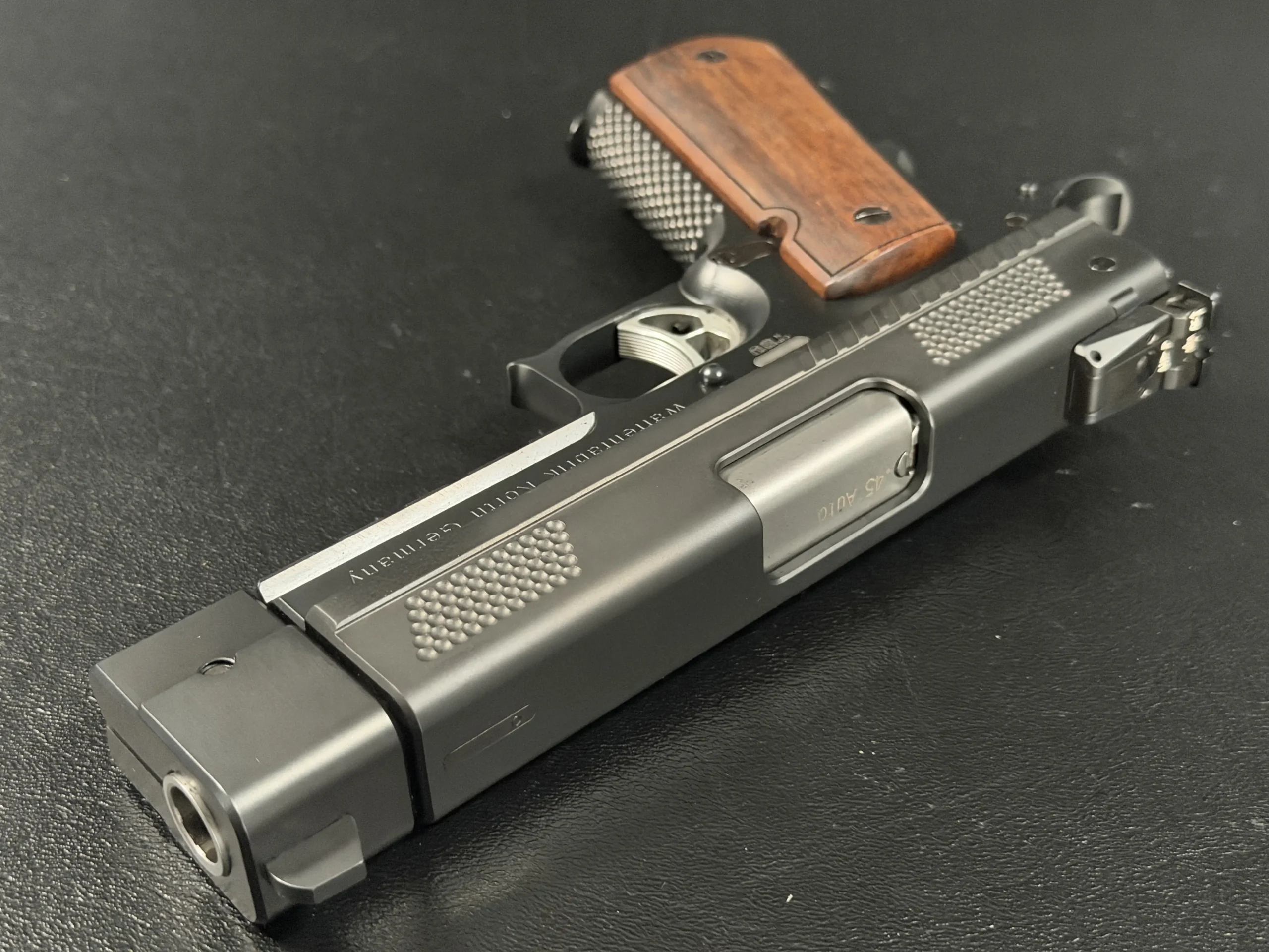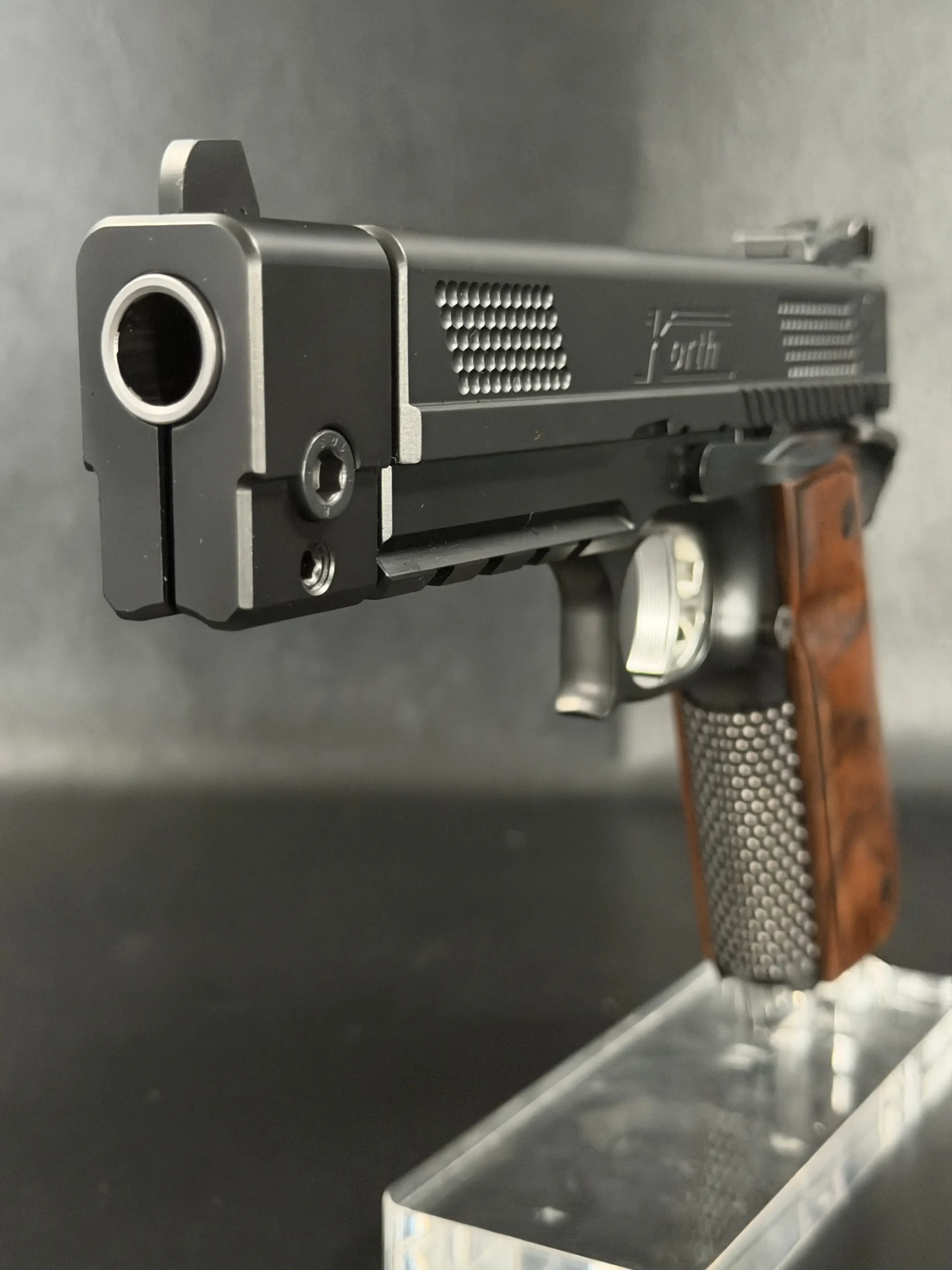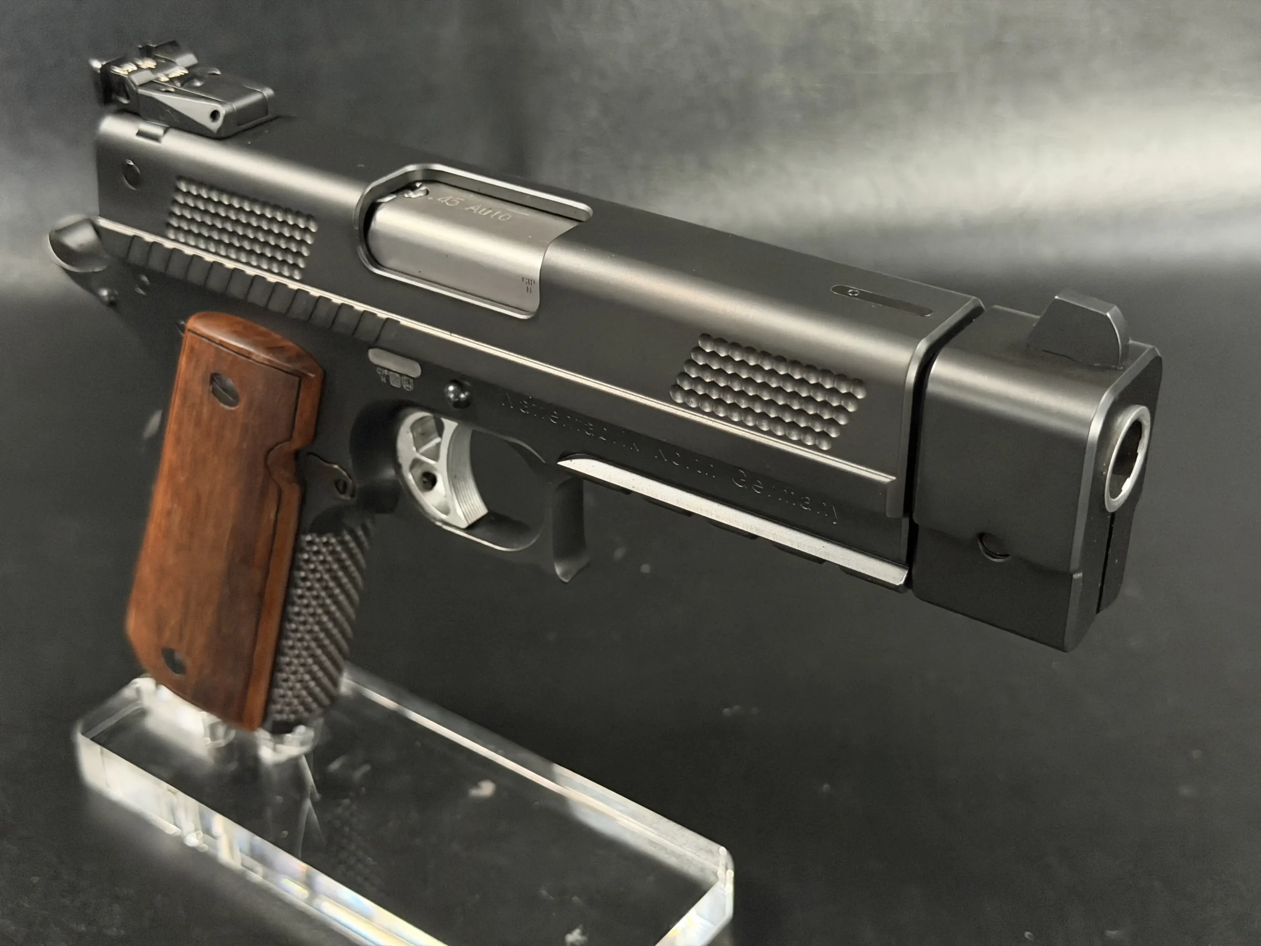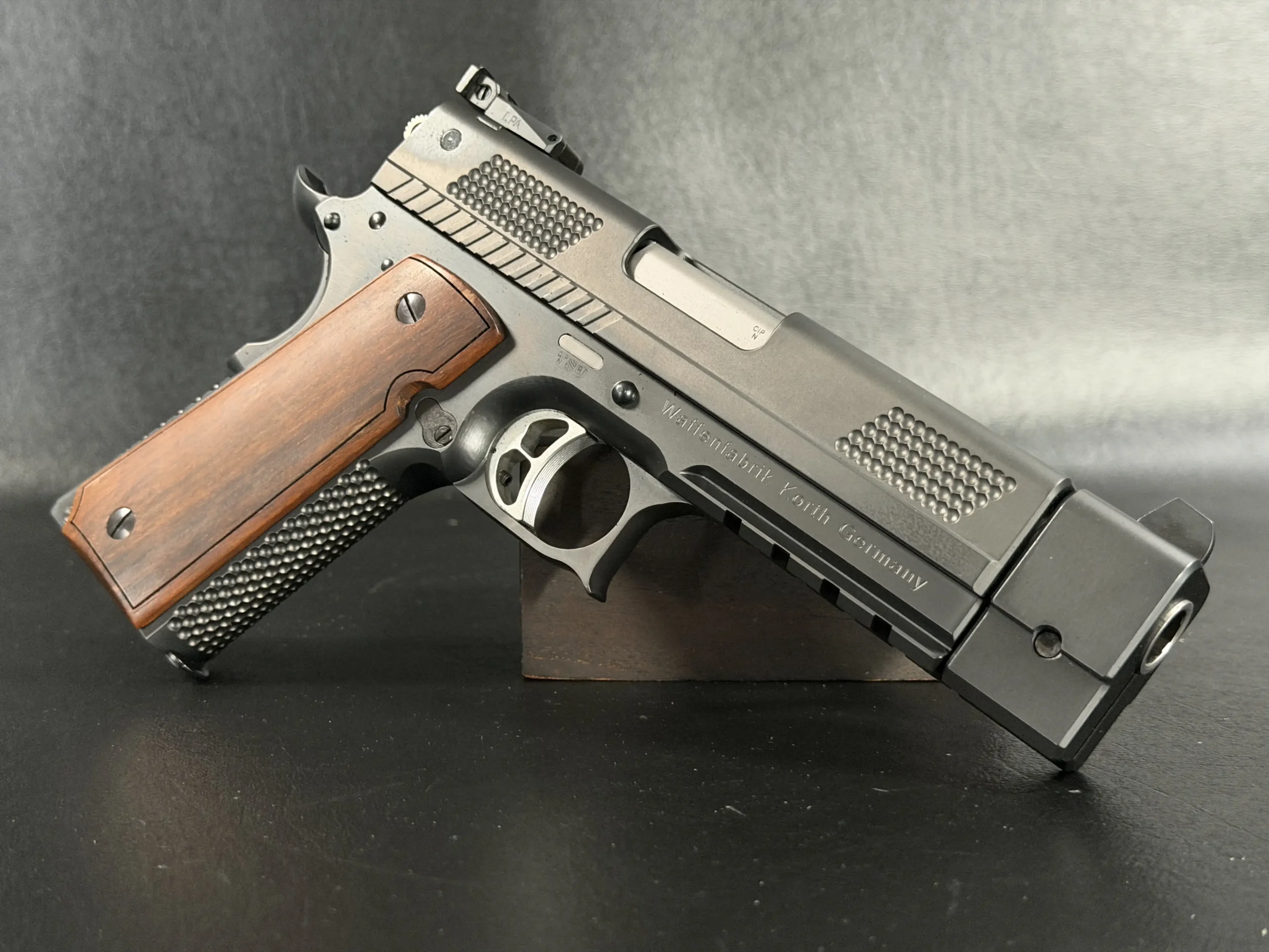 The Korth PRS 5" in .45 ACP reflects the brand’s distinctive approach to semi-automatic pistol design, combining hand-built German manufacture with a refined, modern presentation. This example features a matte black finish paired with figured walnut grip panels for a look that is both understated and striking.