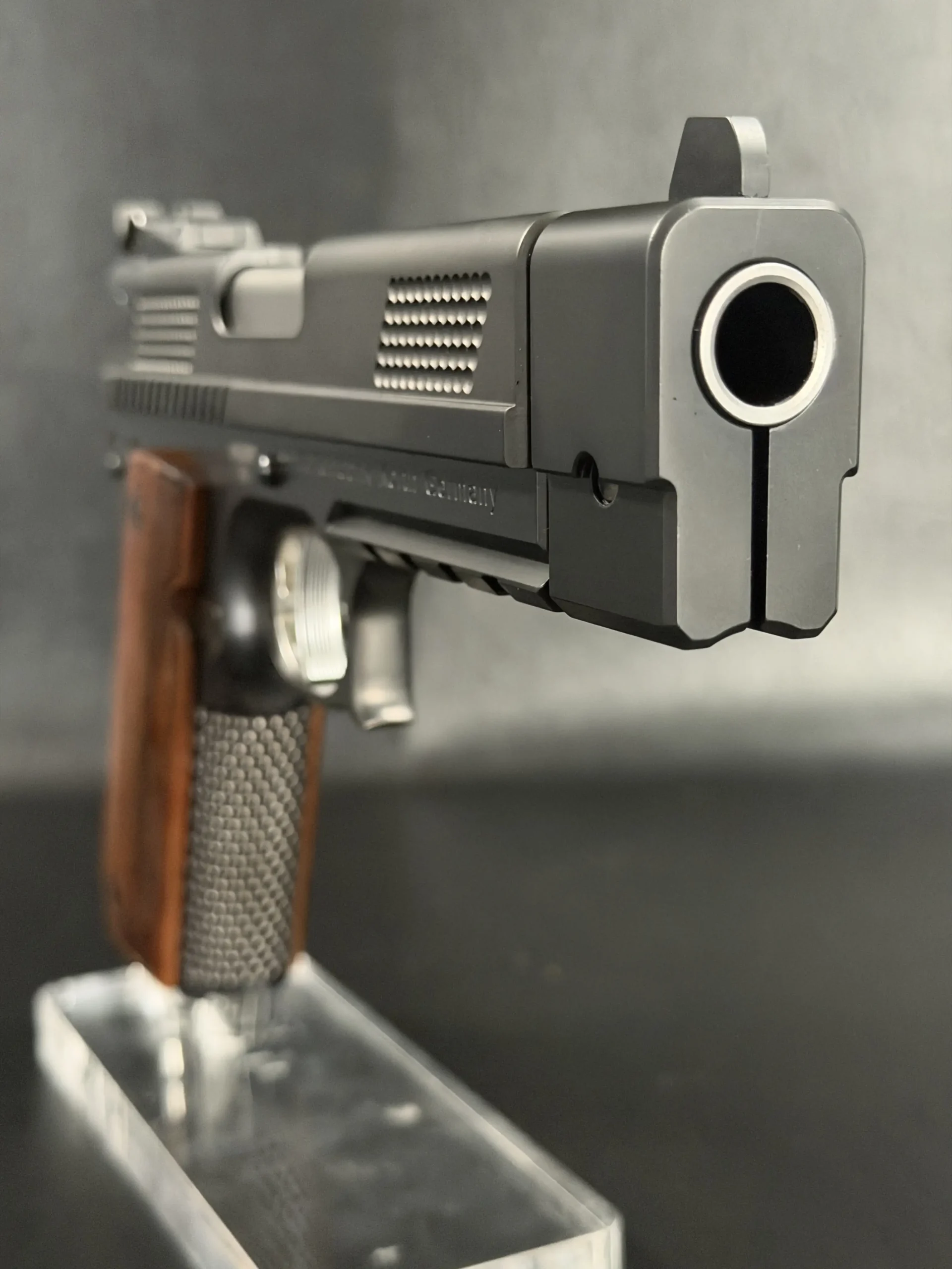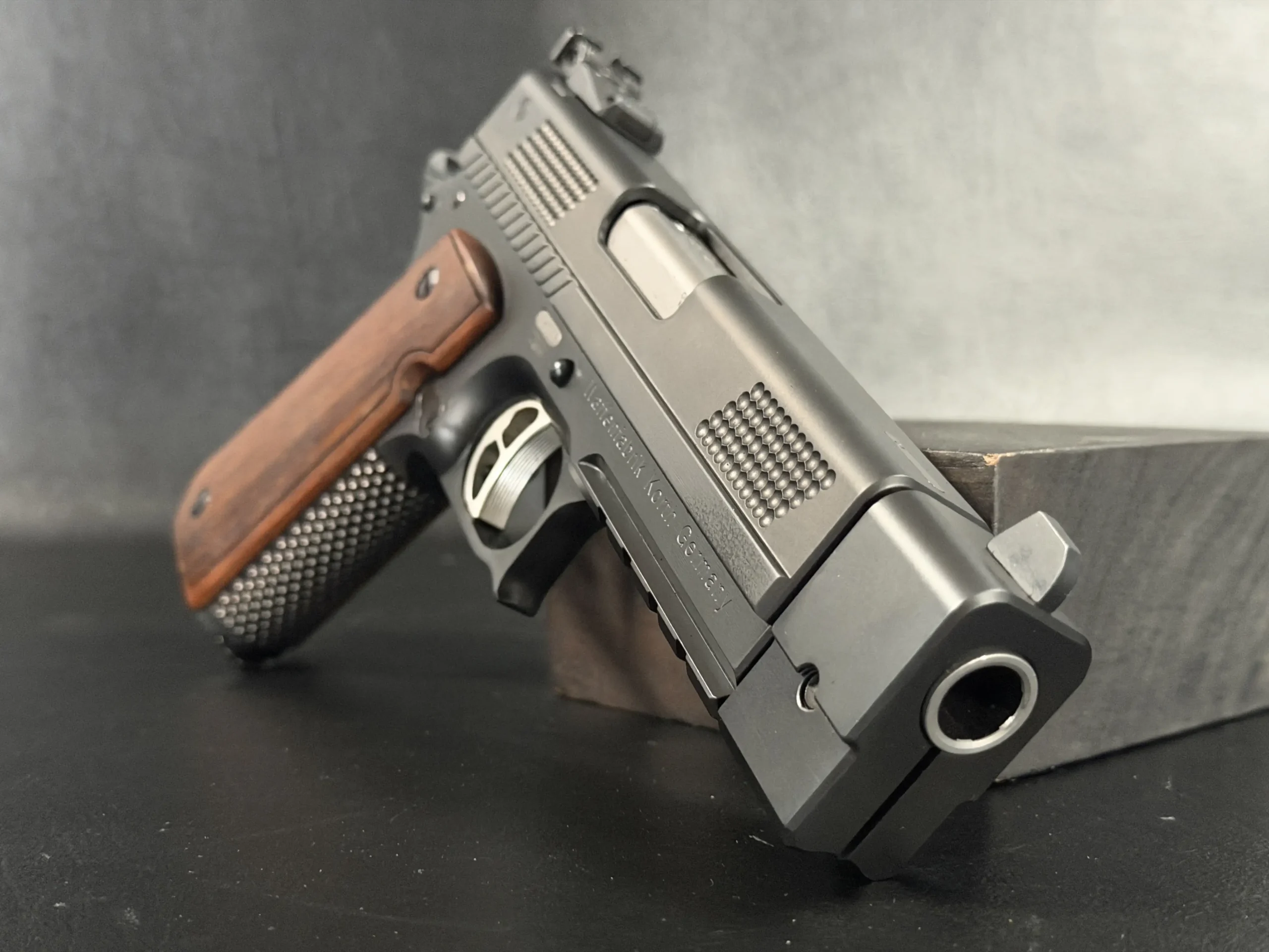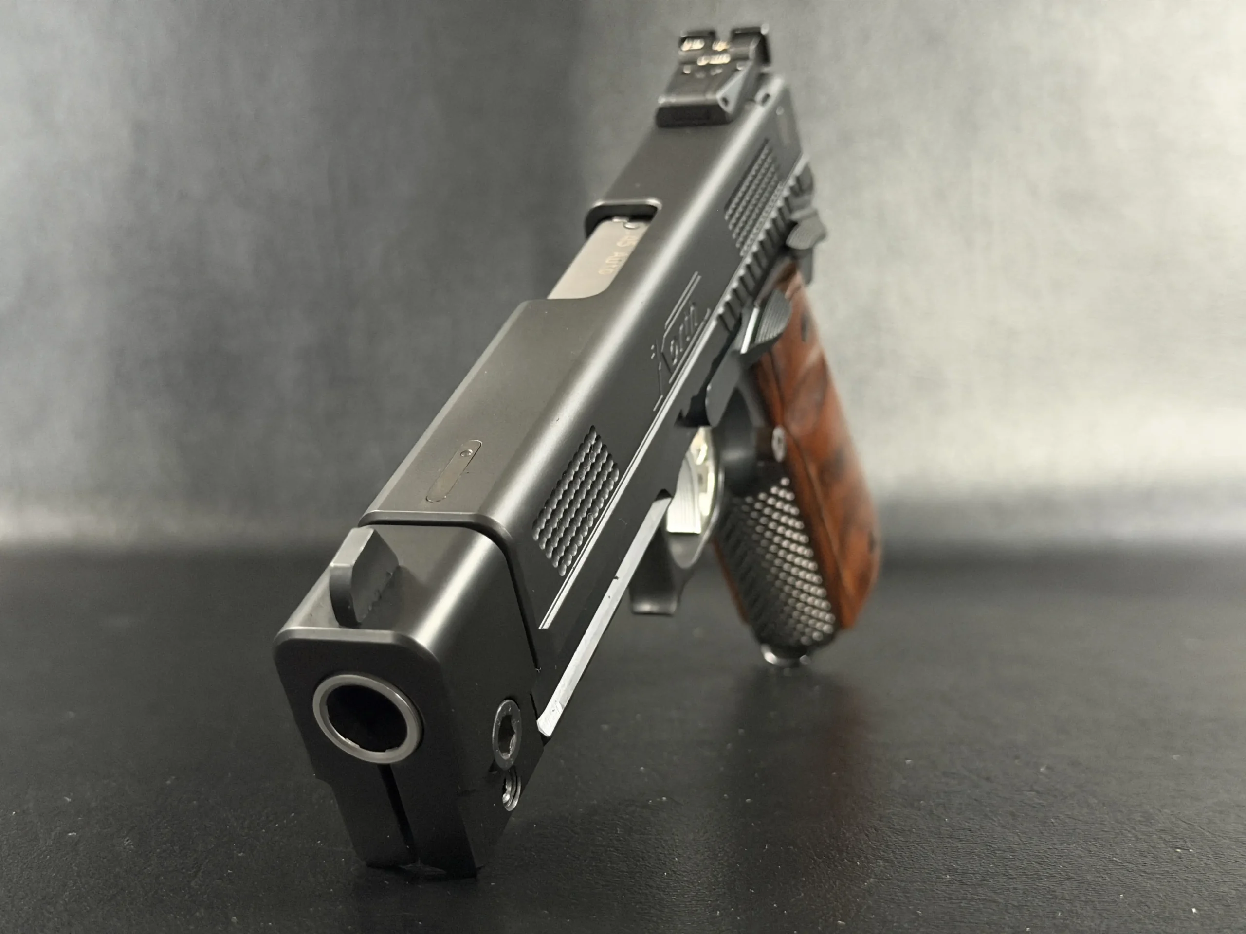 Its 5-inch barrel configuration offers a balanced profile, while the PRS design includes sculpted slide serrations, textured press-check panels, and an integrated forward rail. Details such as the skeletonized trigger, extended beavertail, checkered front strap, and carefully shaped grip geometry contribute to the pistol’s highly considered layout.