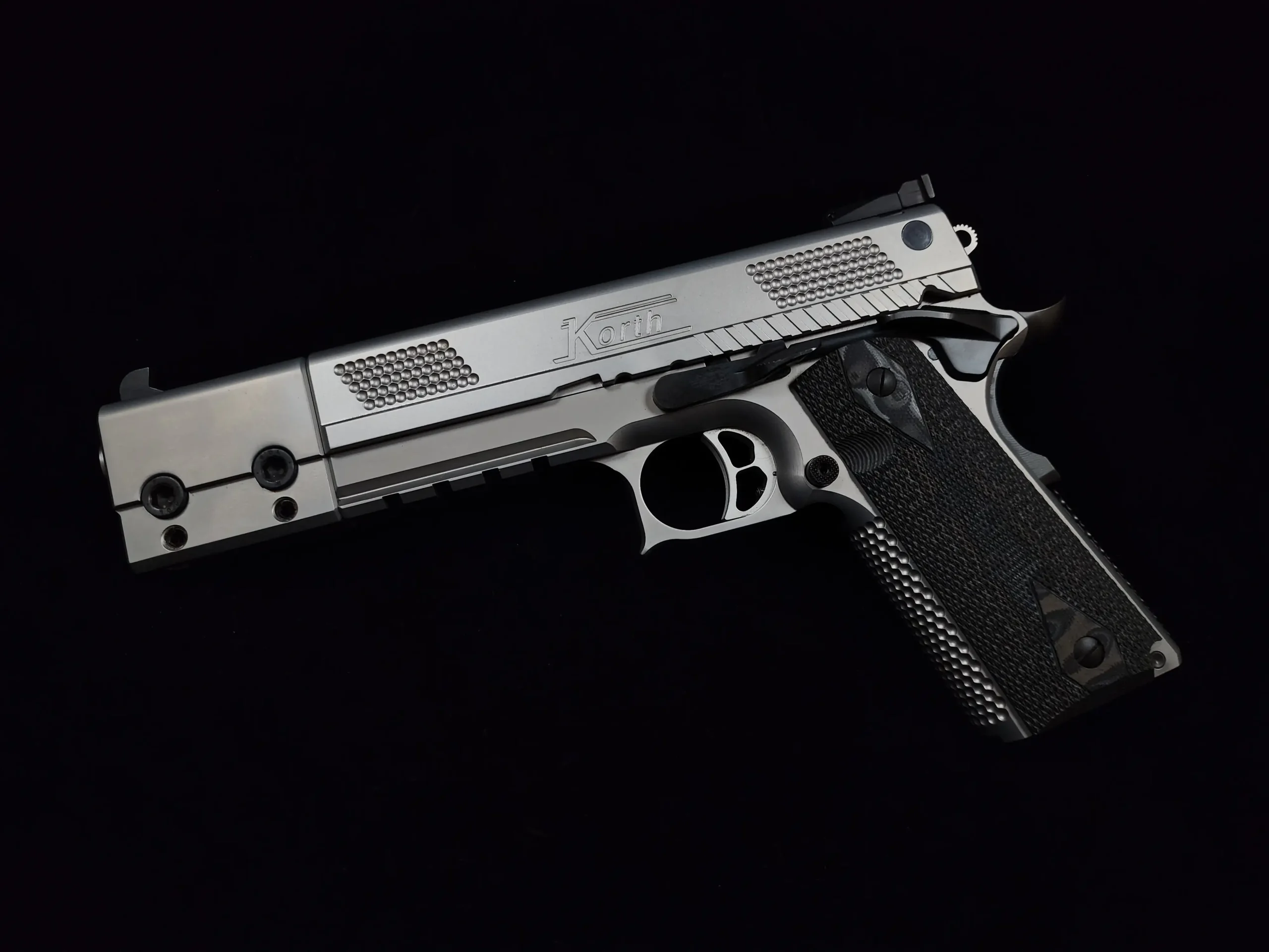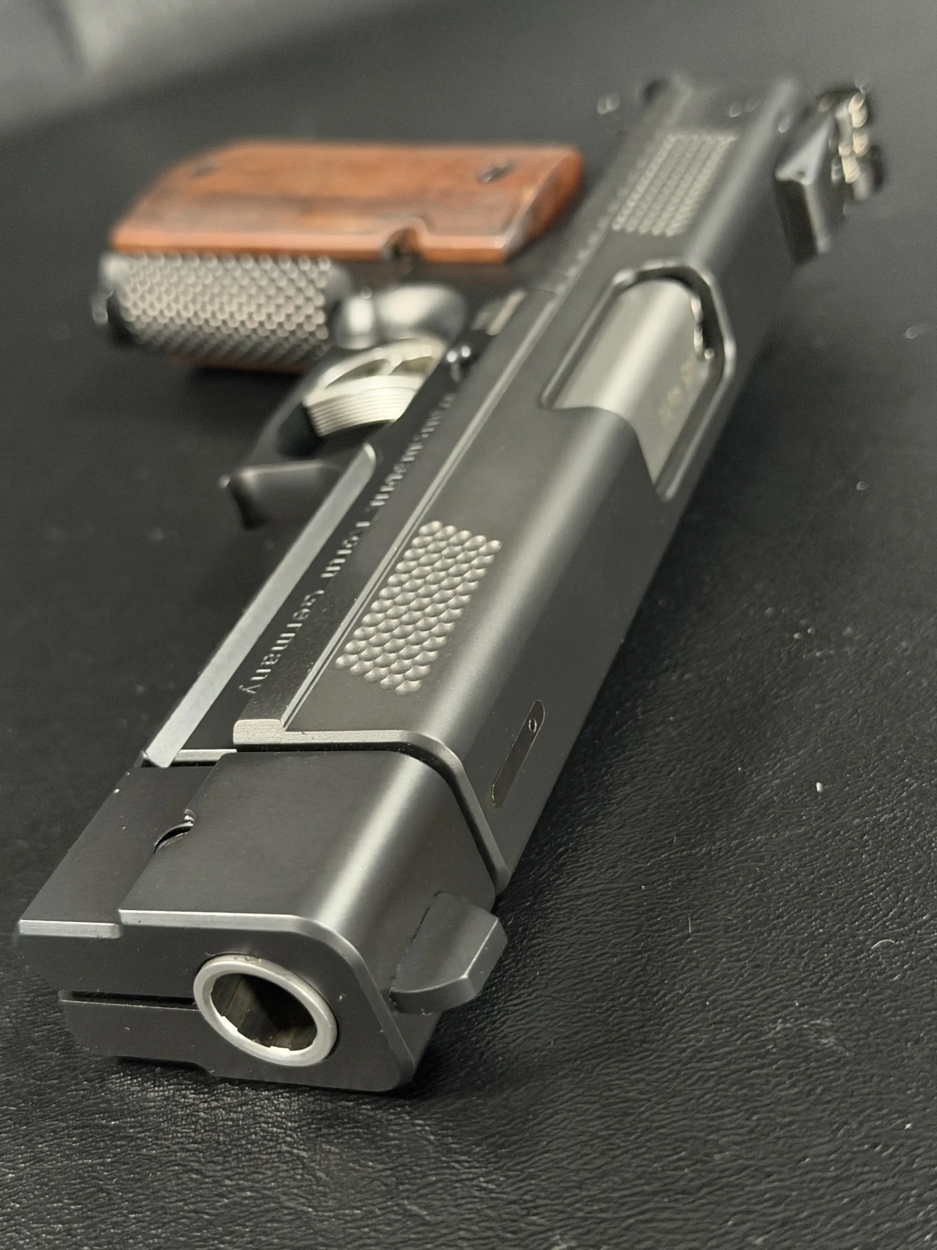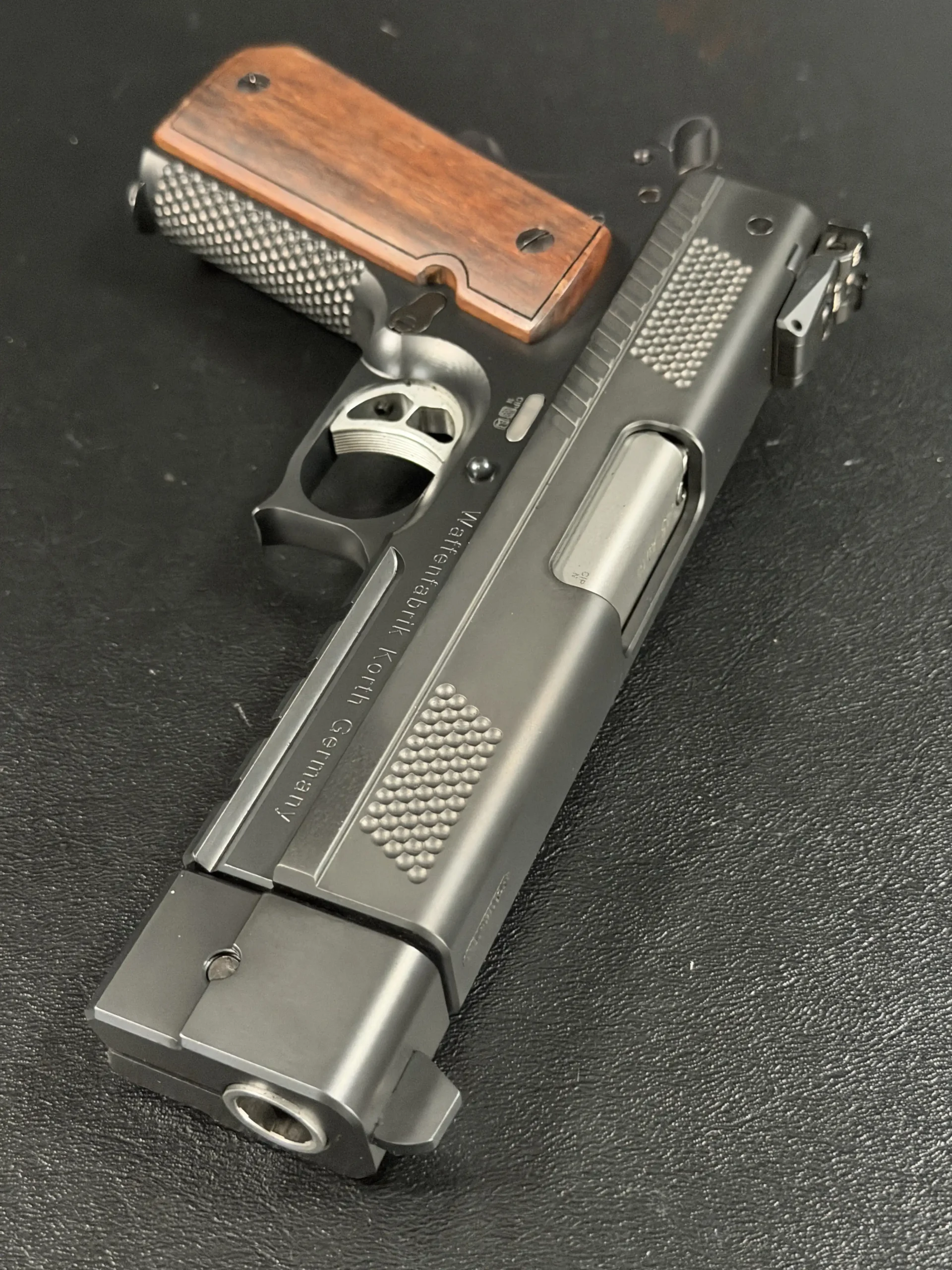 Its 5-inch barrel configuration offers a balanced profile, while the PRS design includes sculpted slide serrations, textured press-check panels, and an integrated forward rail. Details such as the skeletonized trigger, extended beavertail, checkered front strap, and carefully shaped grip geometry contribute to the pistol’s highly considered layout.