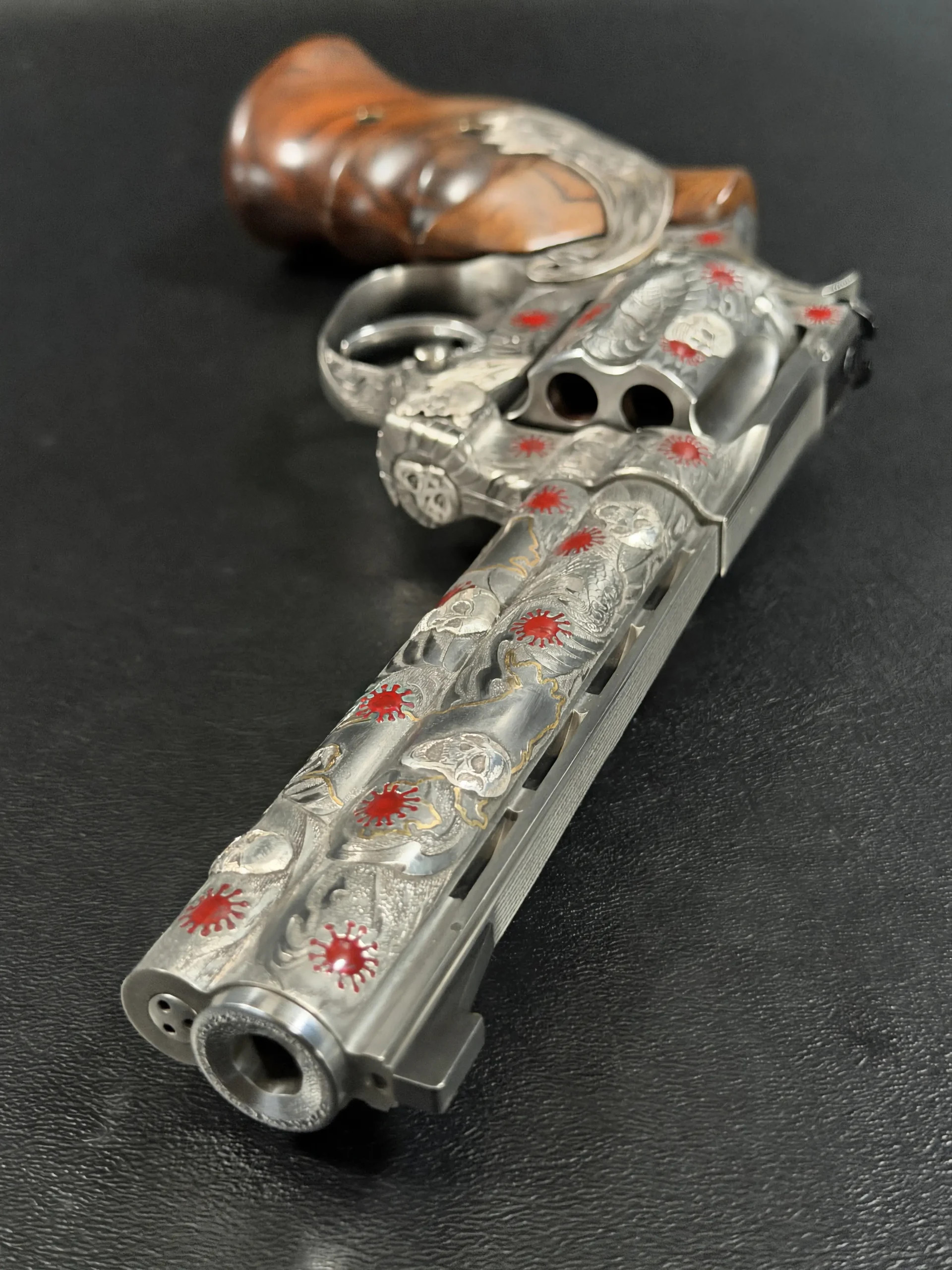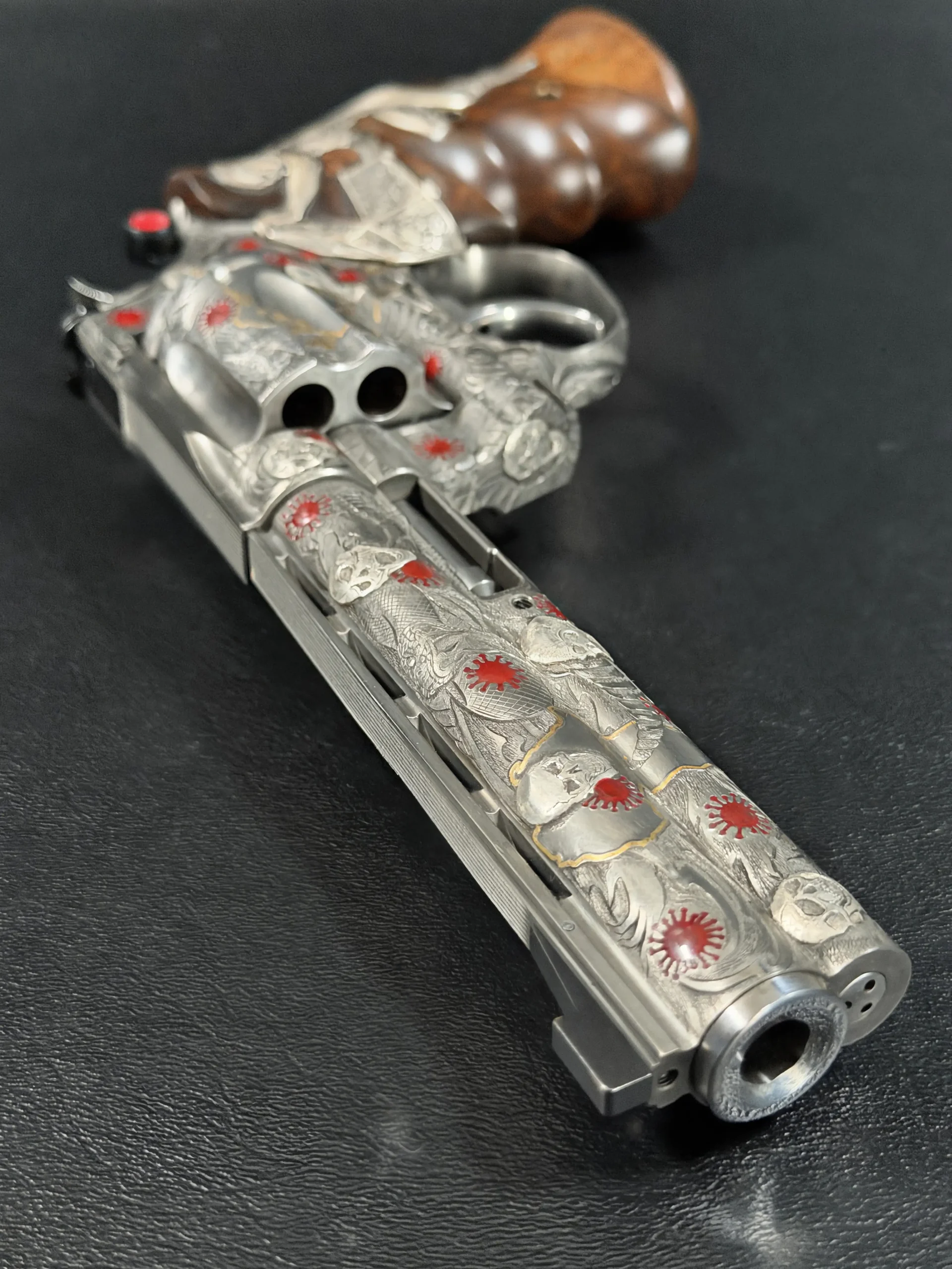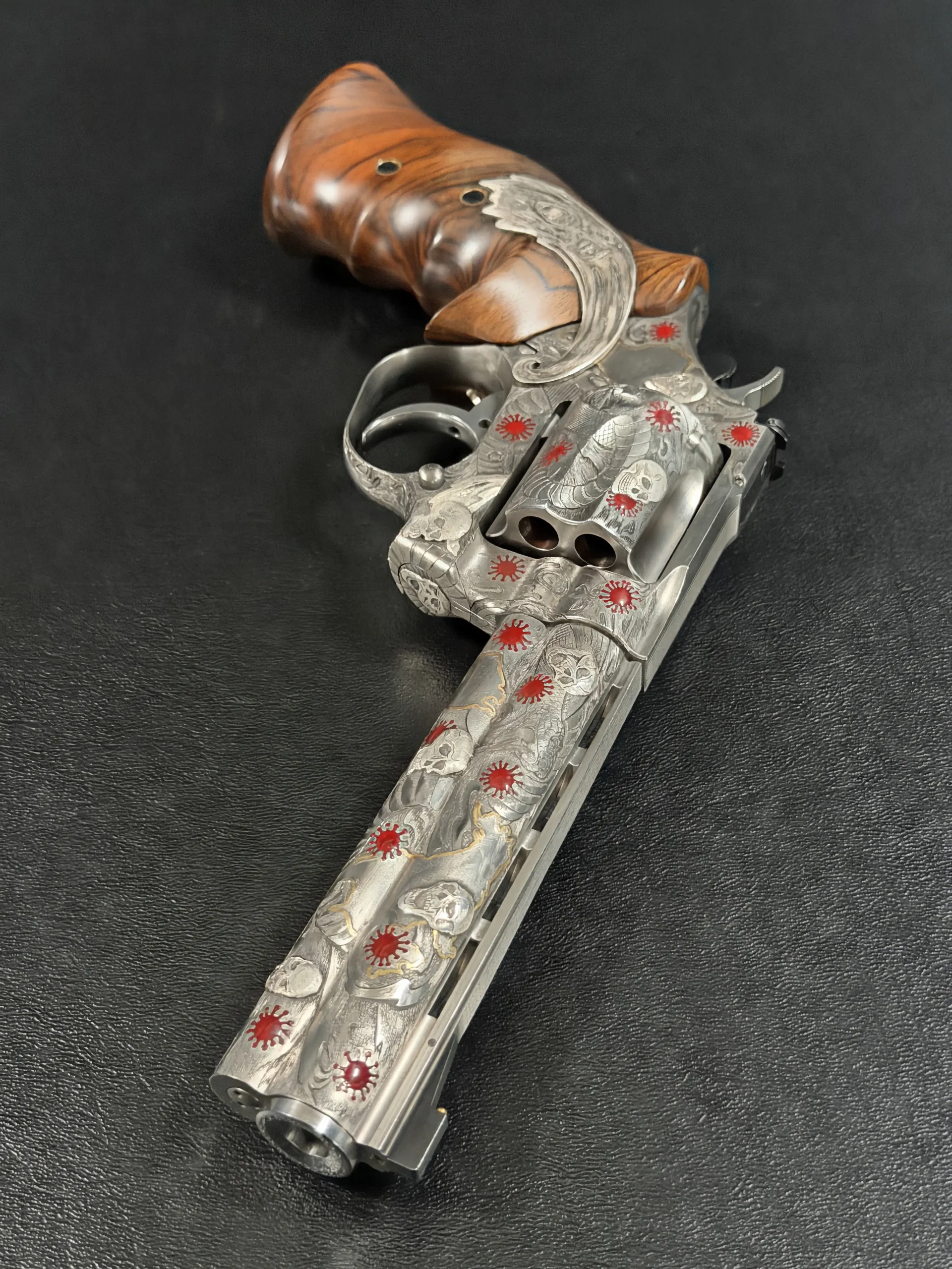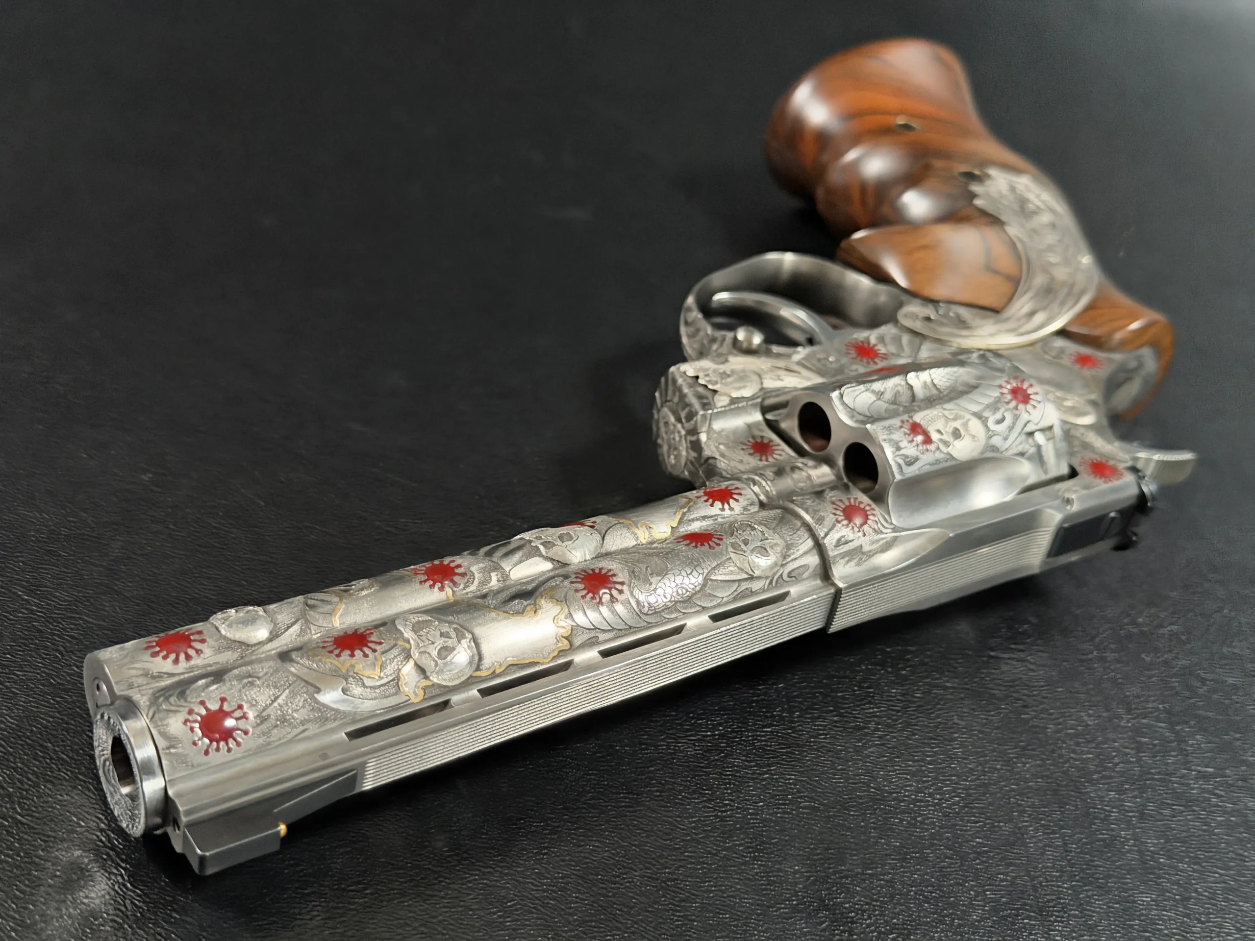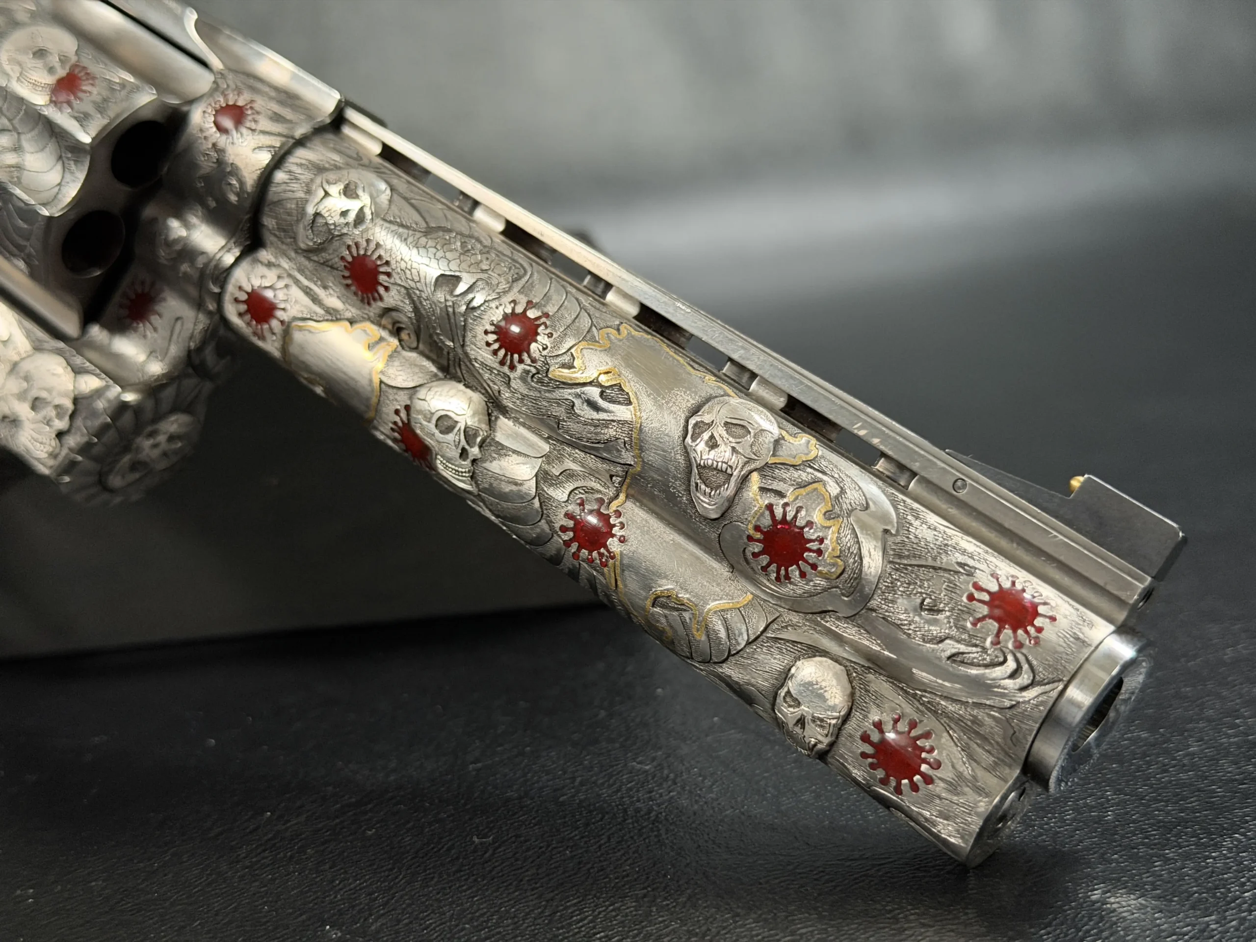 Across the frame, cylinder, and barrel, the engraving builds a layered composition of skulls, serpents, flowing lines, and red accents. Subtle gold-toned details move through the design, adding contrast and depth while reinforcing the dramatic theme. The result is a cohesive treatment that invites close viewing from every angle.
