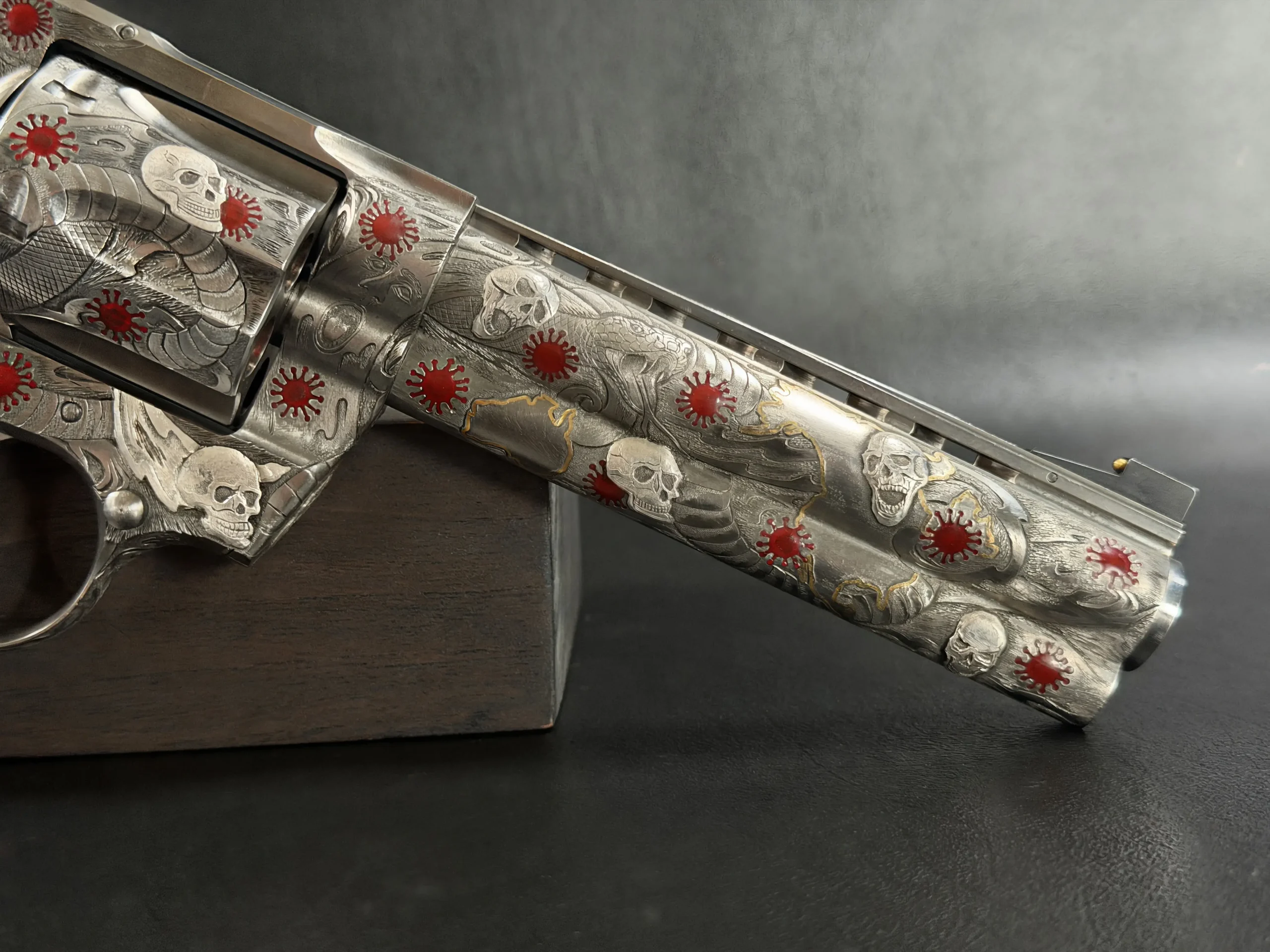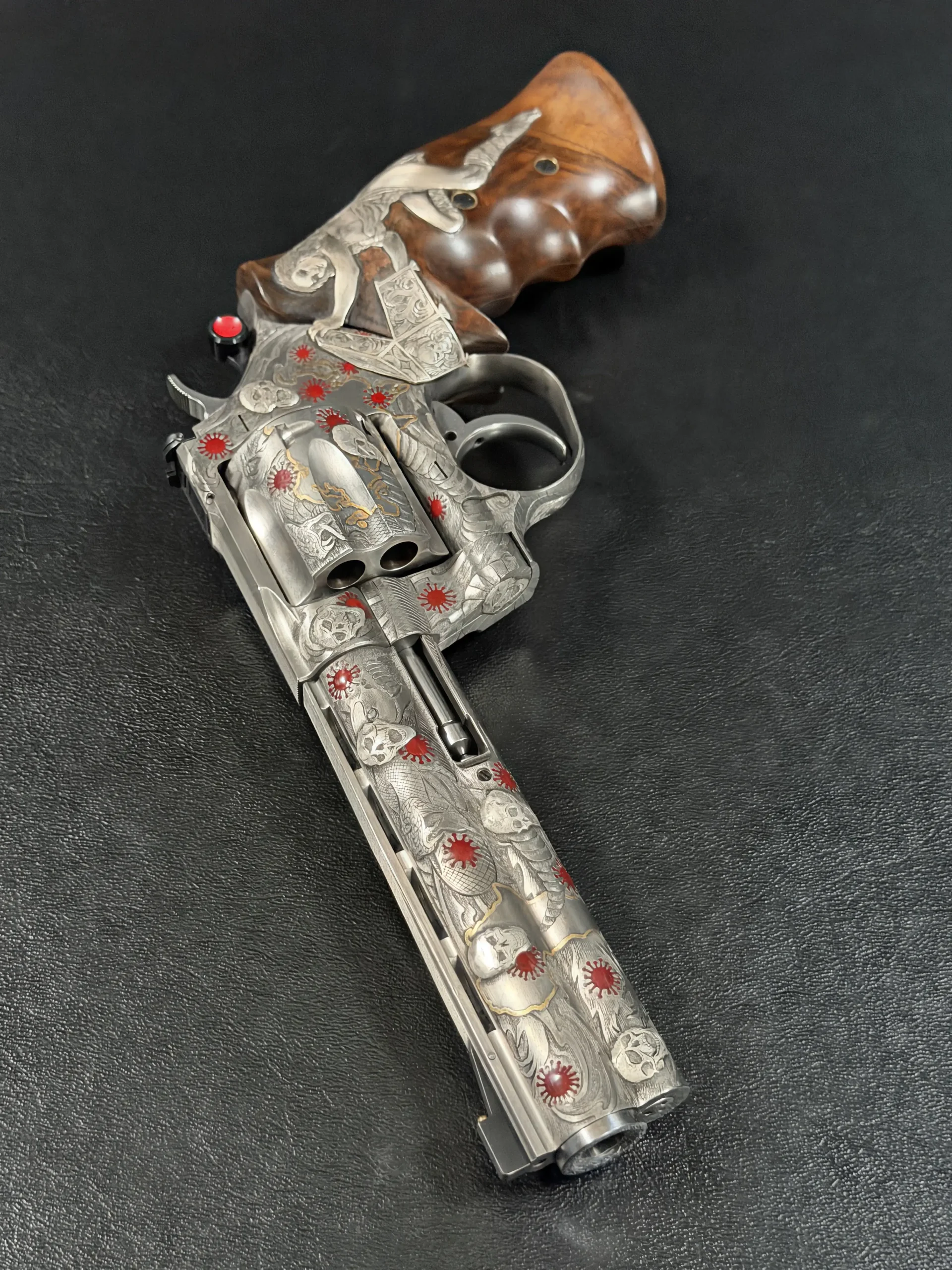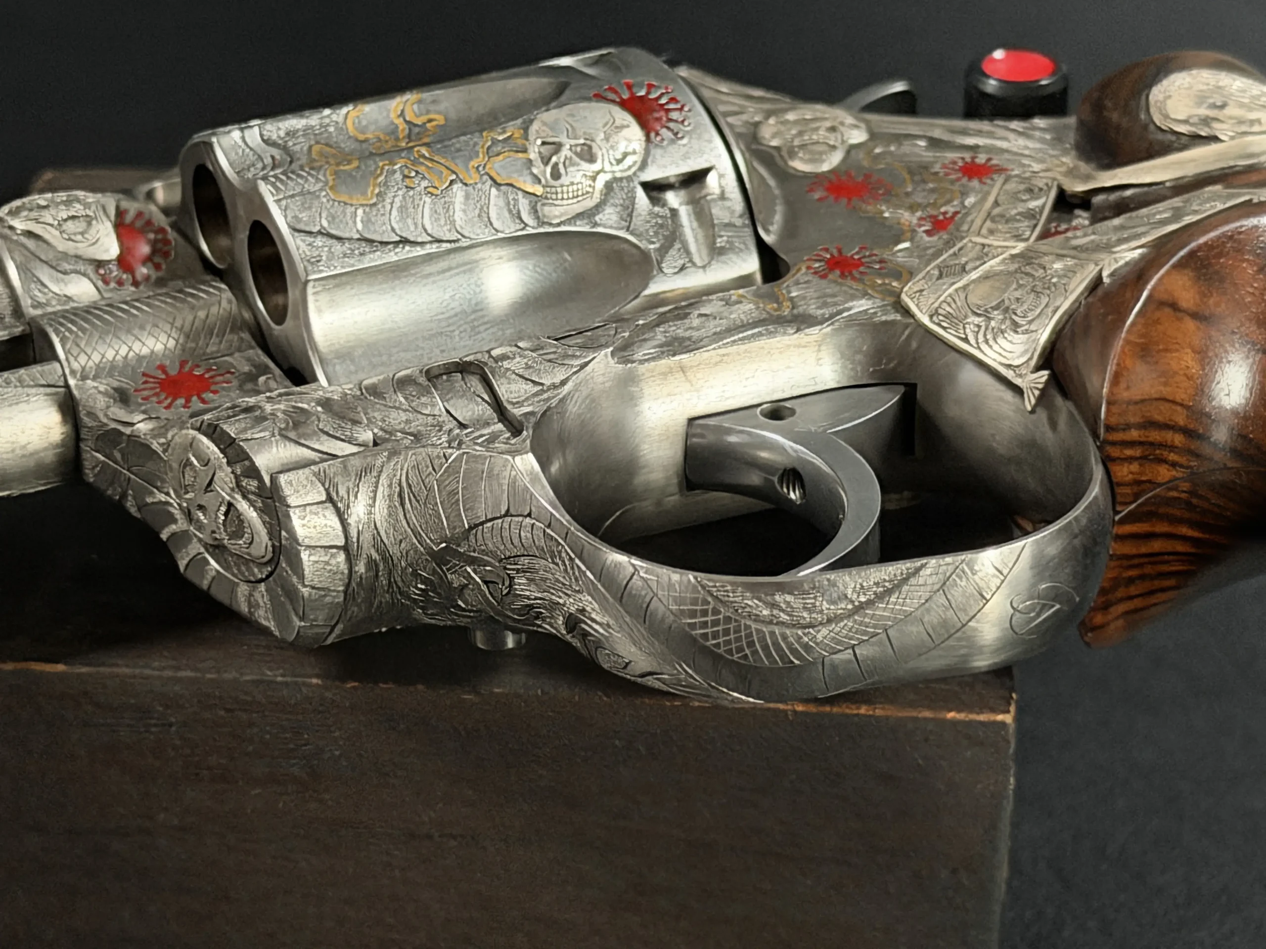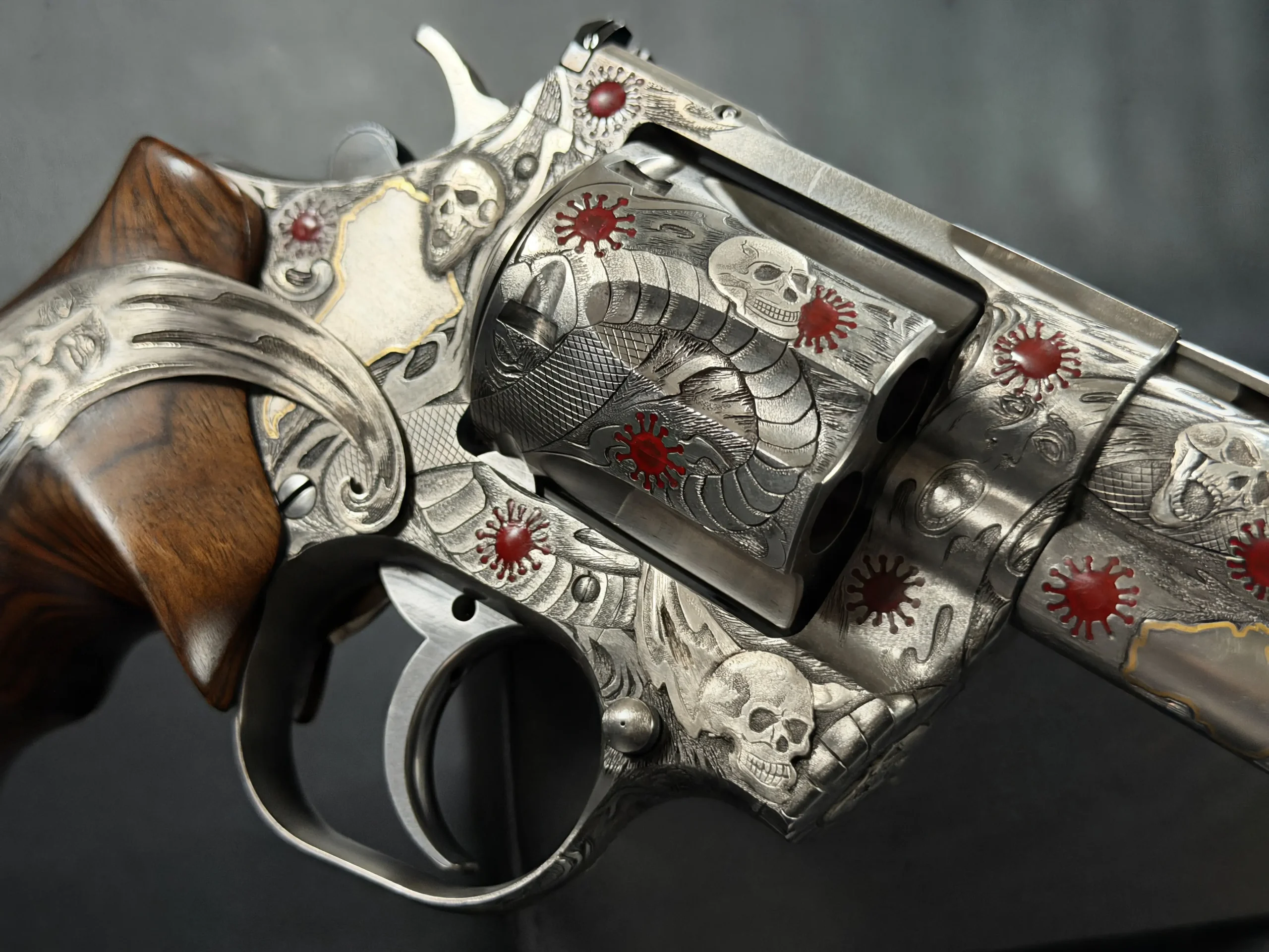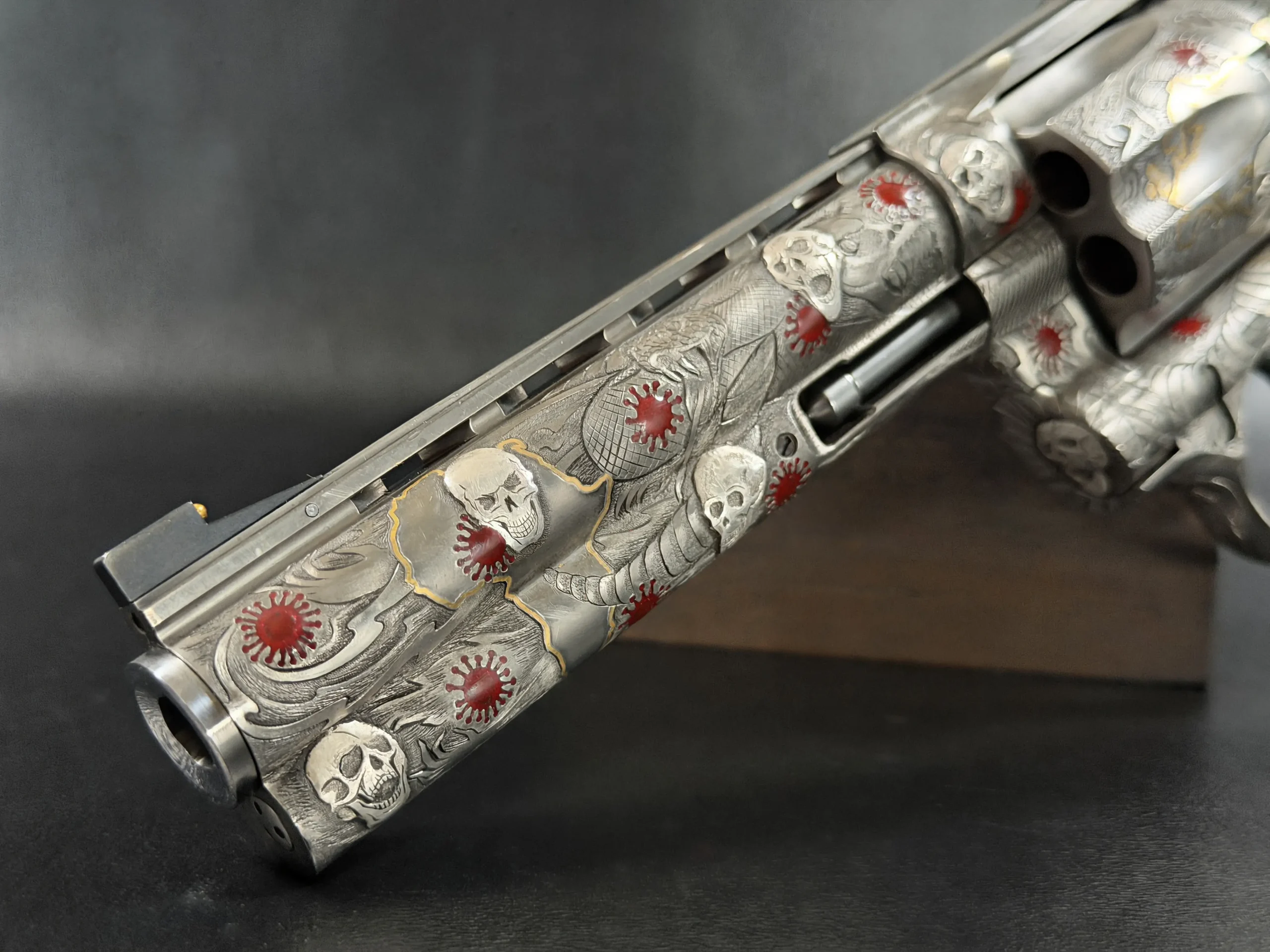 Across the frame, cylinder, and barrel, the engraving builds a layered composition of skulls, serpents, flowing lines, and red accents. Subtle gold-toned details move through the design, adding contrast and depth while reinforcing the dramatic theme. The result is a cohesive treatment that invites close viewing from every angle.