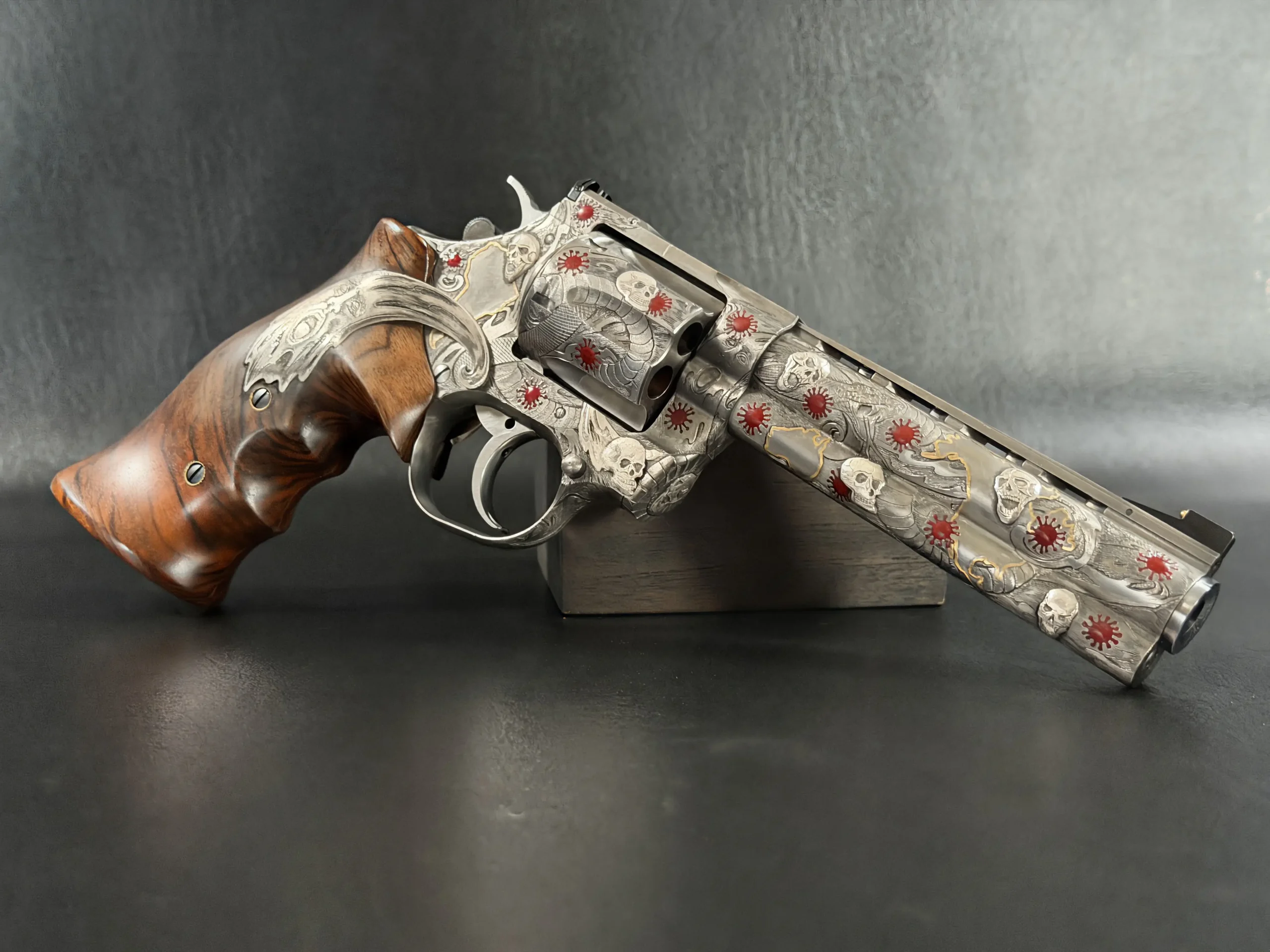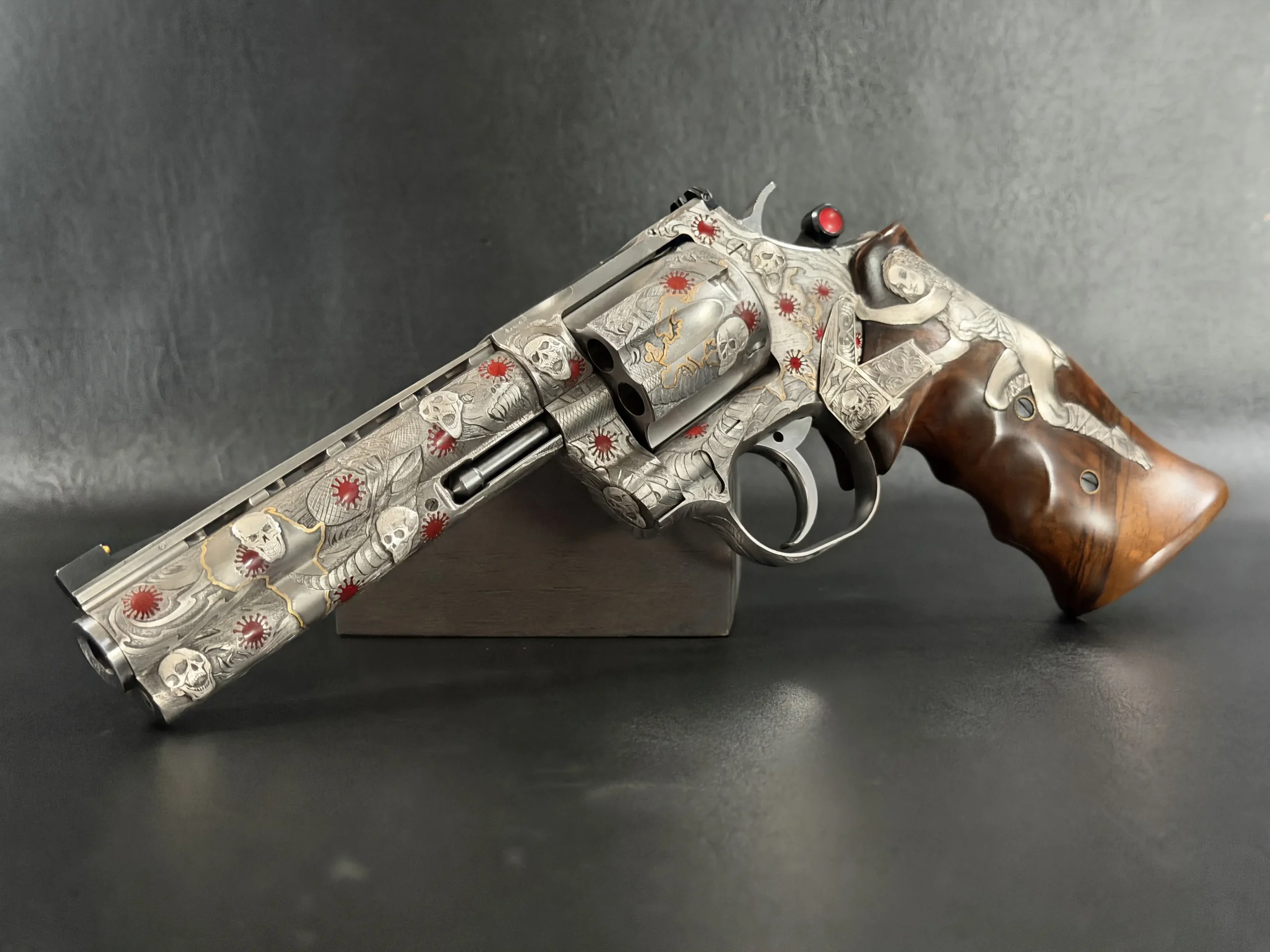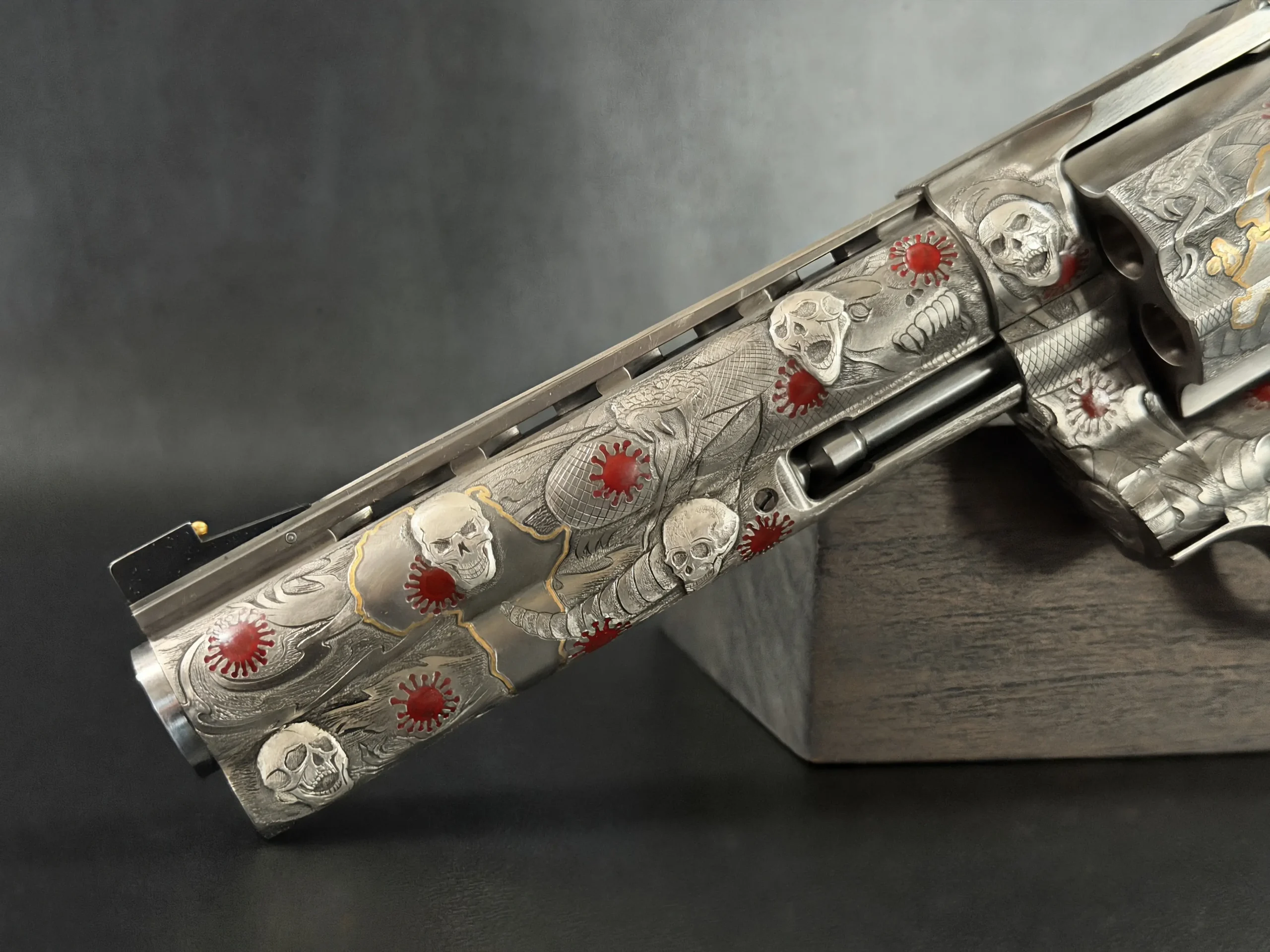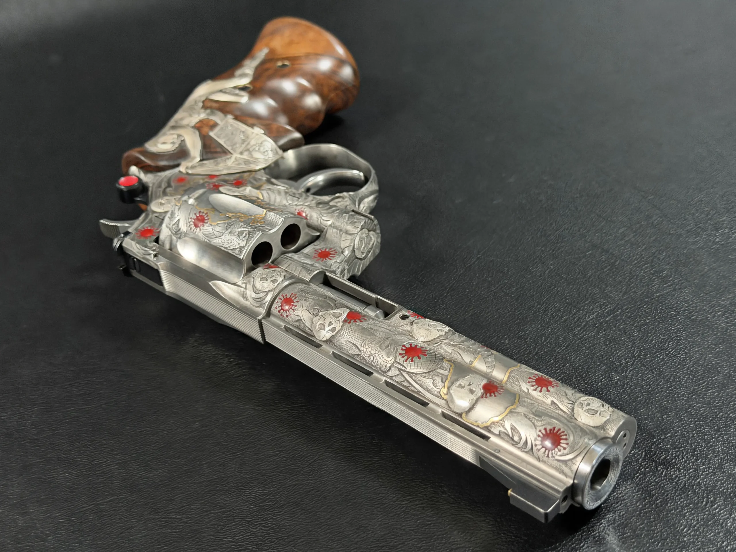 Across the frame, cylinder, and barrel, the engraving builds a layered composition of skulls, serpents, flowing lines, and red accents. Subtle gold-toned details move through the design, adding contrast and depth while reinforcing the dramatic theme. The result is a cohesive treatment that invites close viewing from every angle.