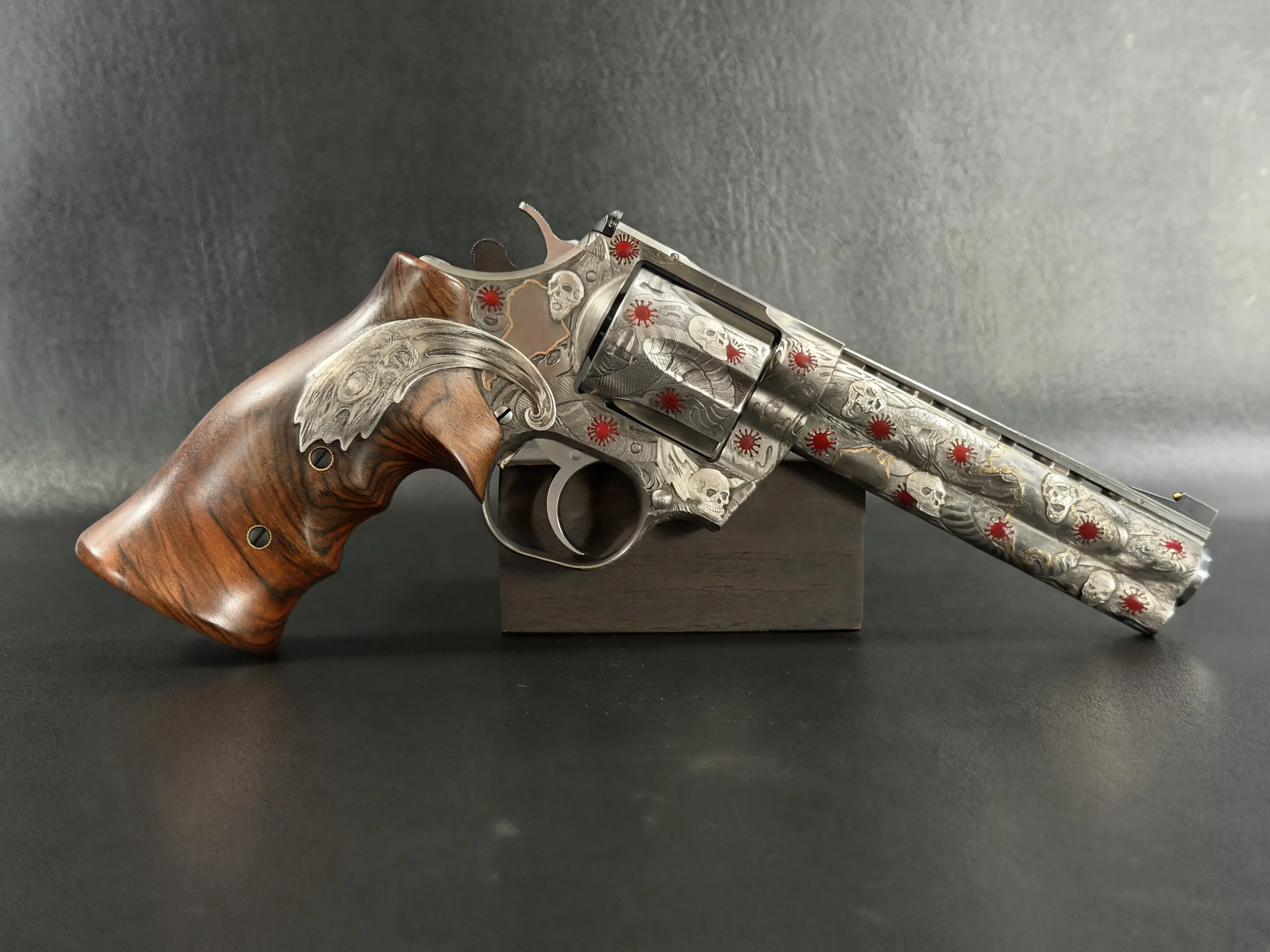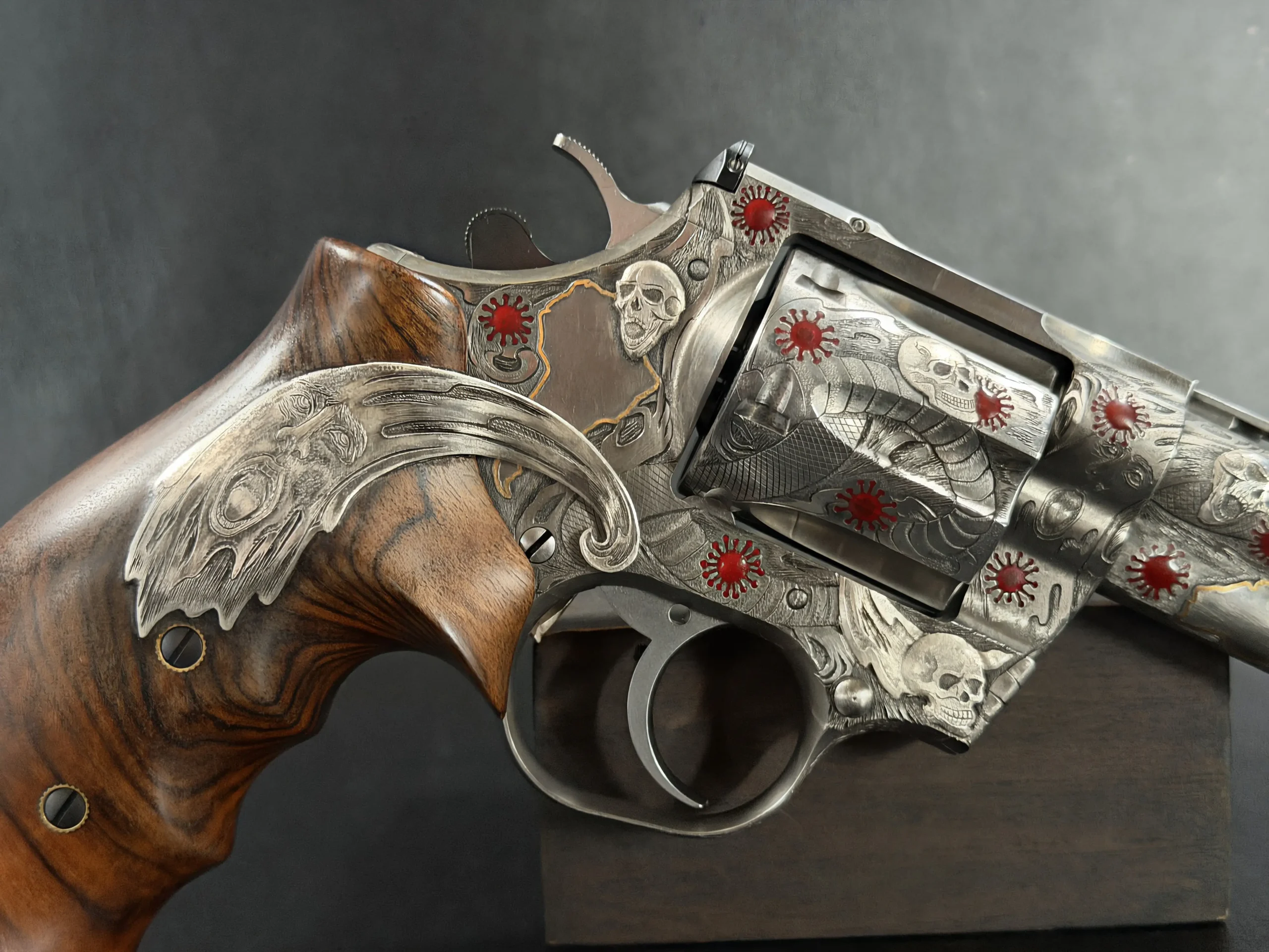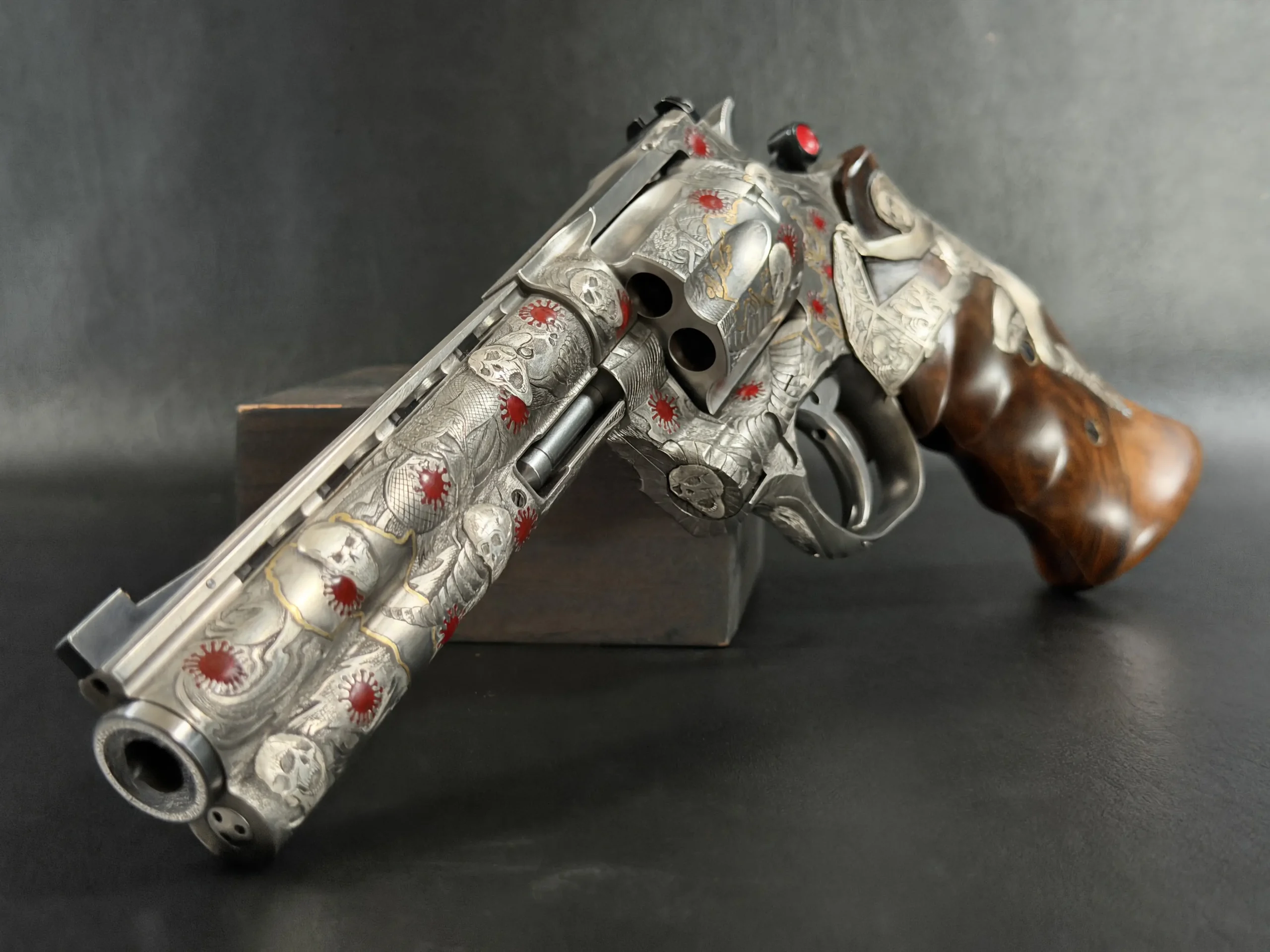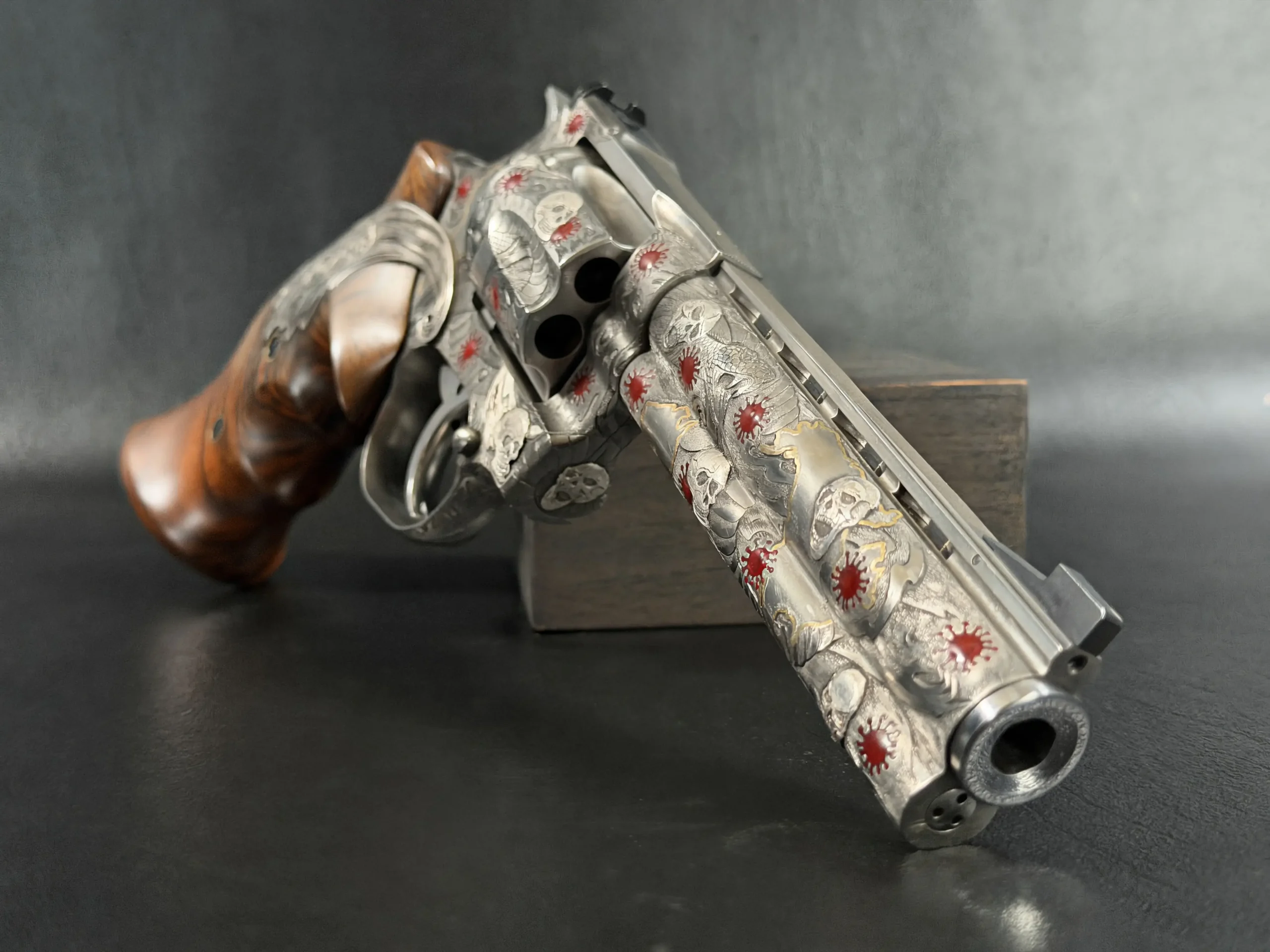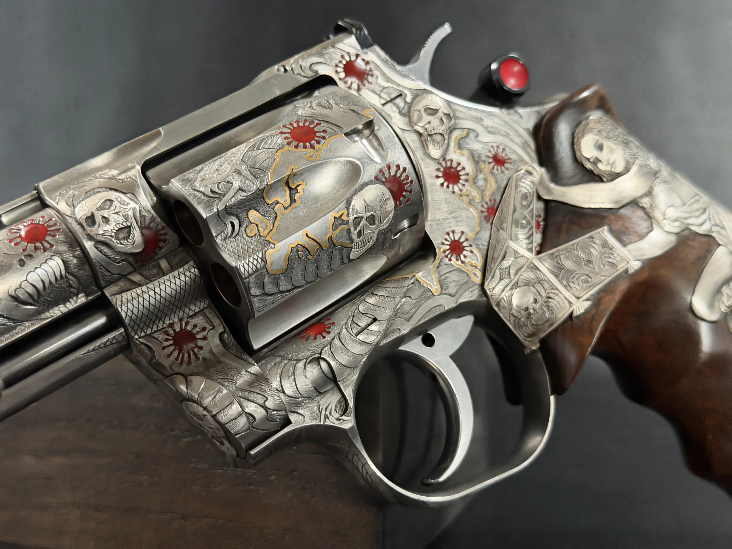 Across the frame, cylinder, and barrel, the engraving builds a layered composition of skulls, serpents, flowing lines, and red accents. Subtle gold-toned details move through the design, adding contrast and depth while reinforcing the dramatic theme. The result is a cohesive treatment that invites close viewing from every angle.