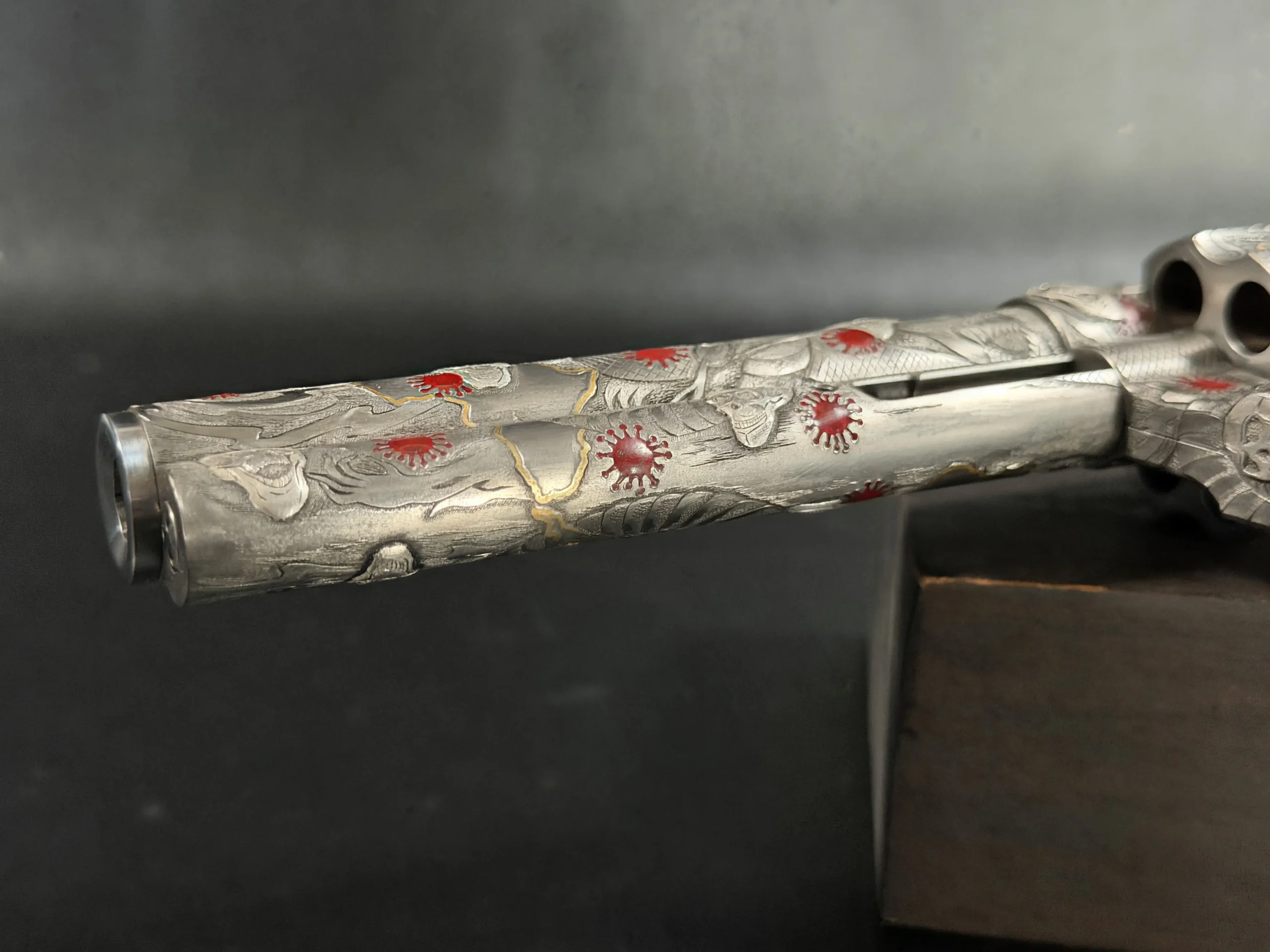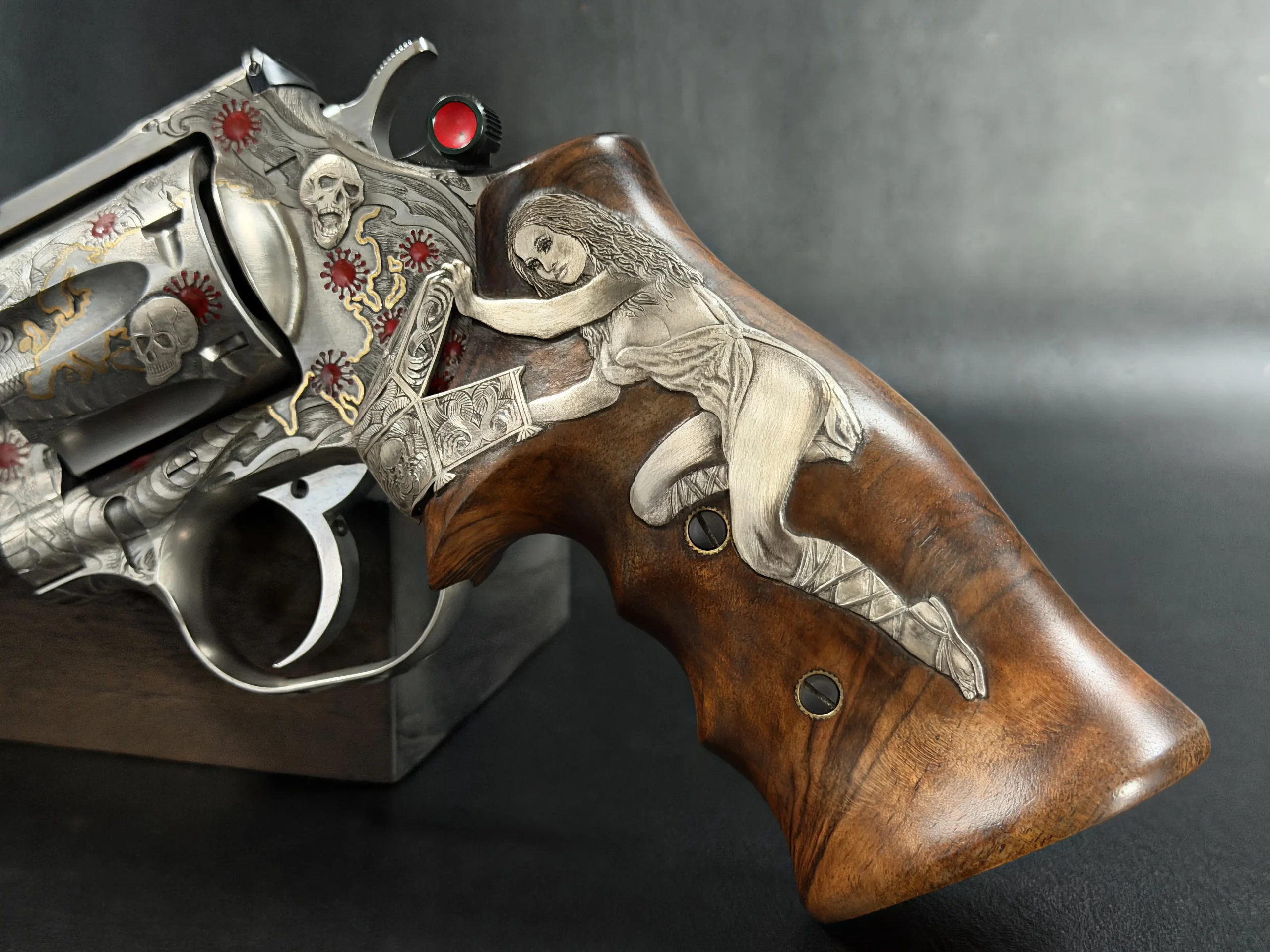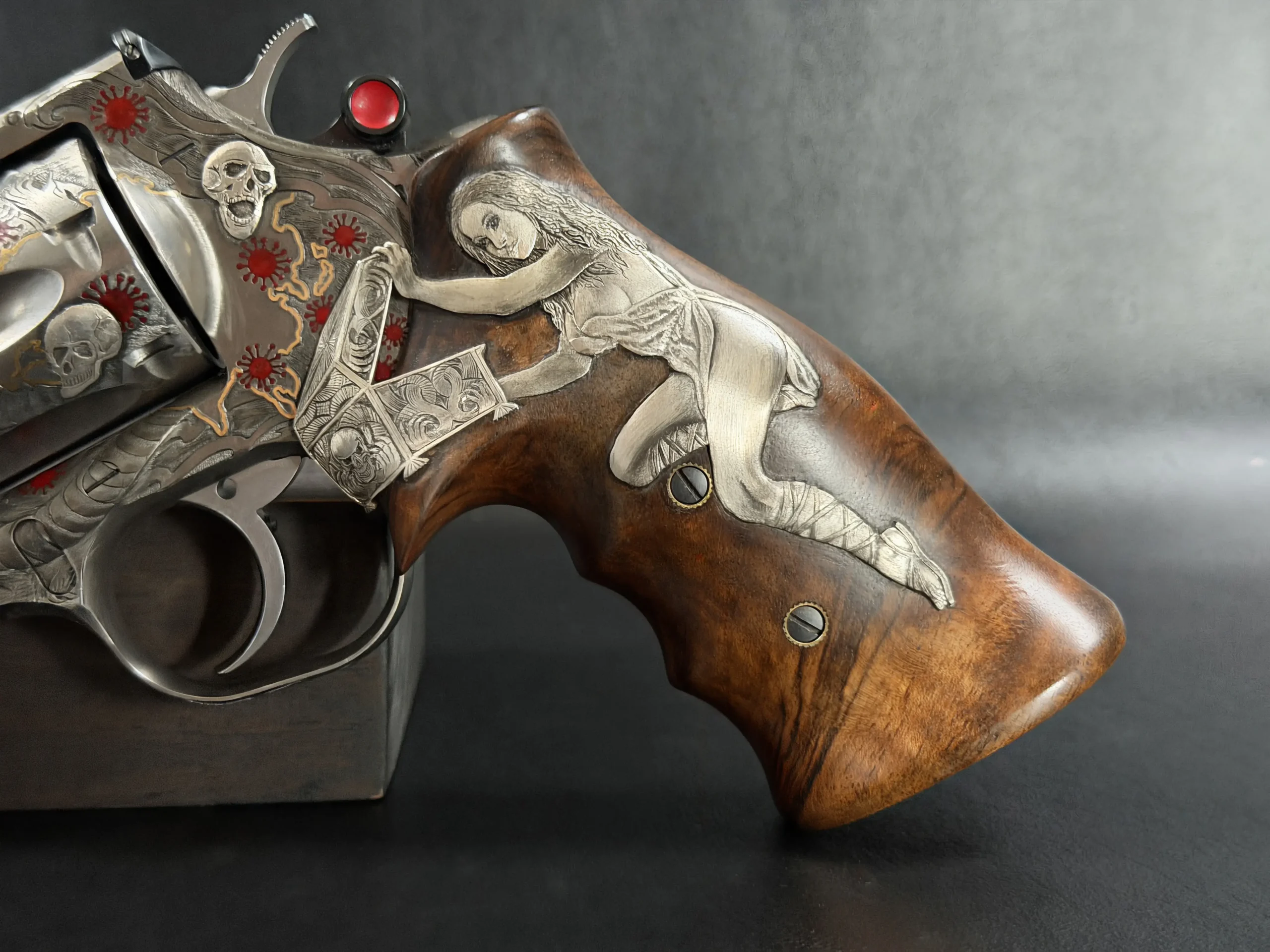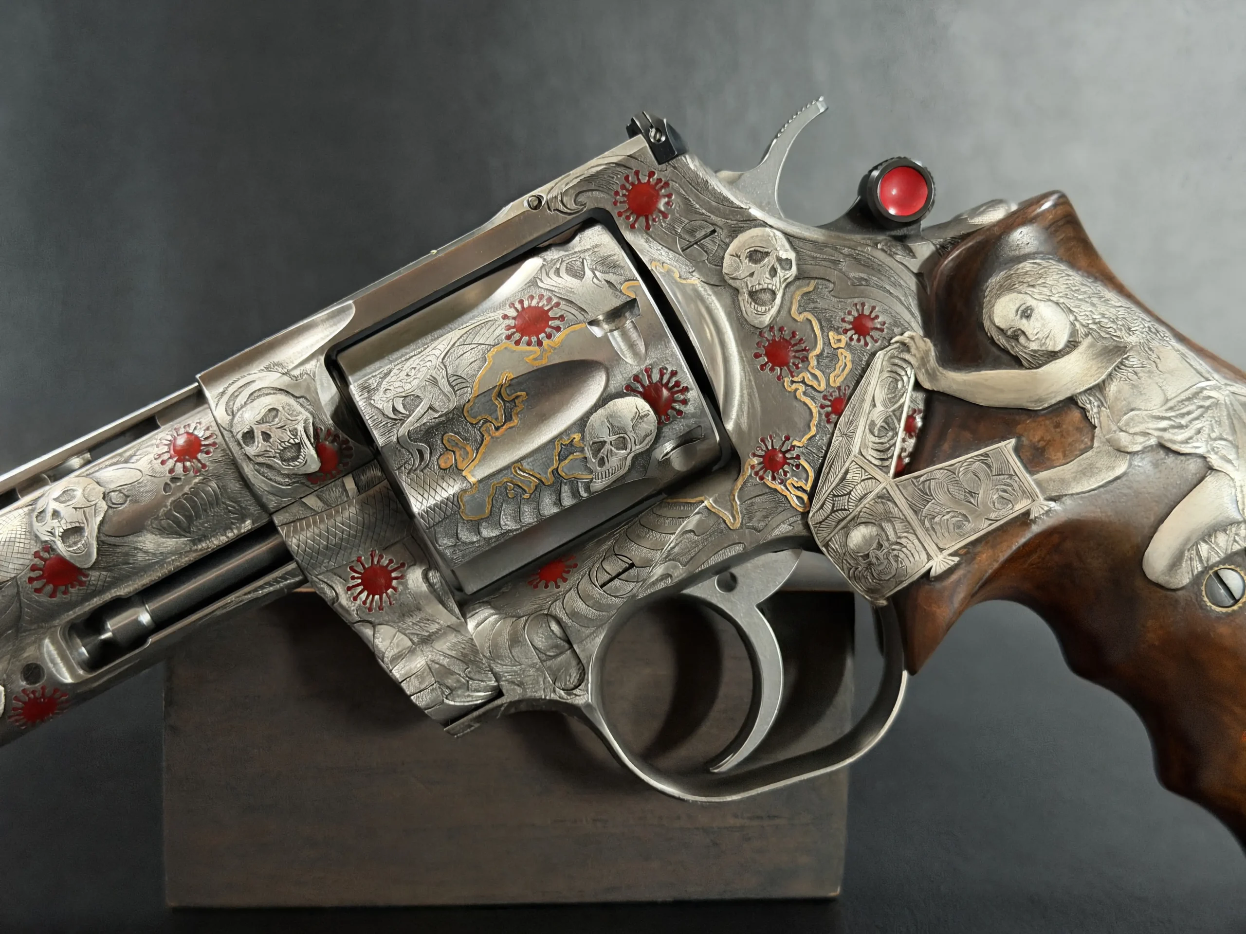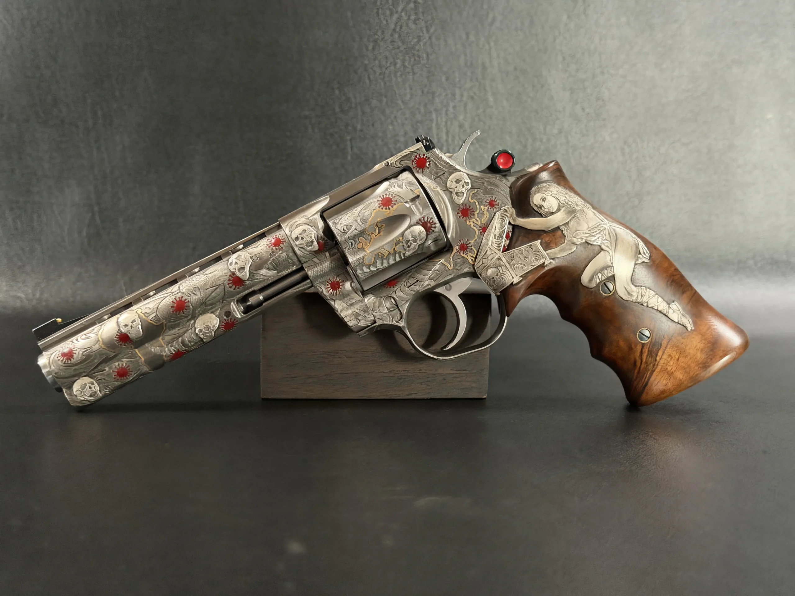 Across the frame, cylinder, and barrel, the engraving builds a layered composition of skulls, serpents, flowing lines, and red accents. Subtle gold-toned details move through the design, adding contrast and depth while reinforcing the dramatic theme. The result is a cohesive treatment that invites close viewing from every angle.