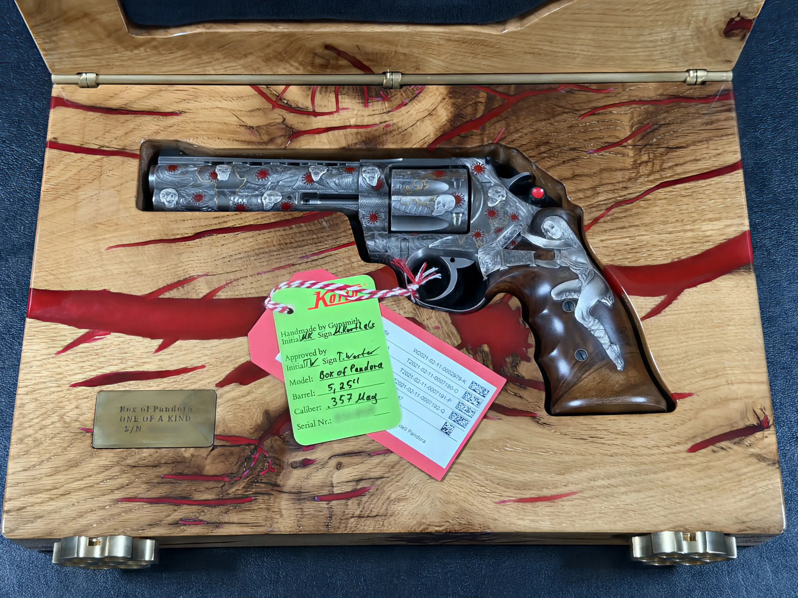 A custom presentation case completes the set, echoing the revolver’s bold aesthetic and making Box of Pandora a distinctive display piece as well as a finely executed Korth revolver.