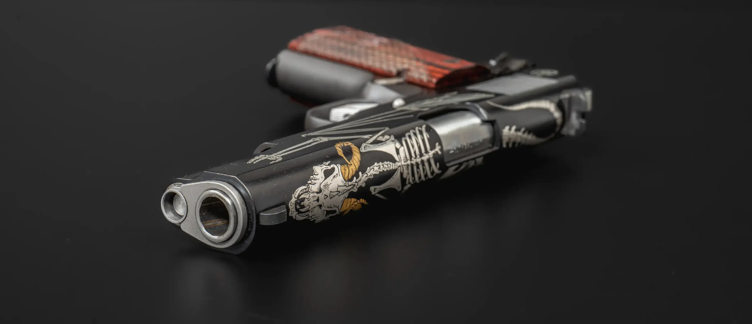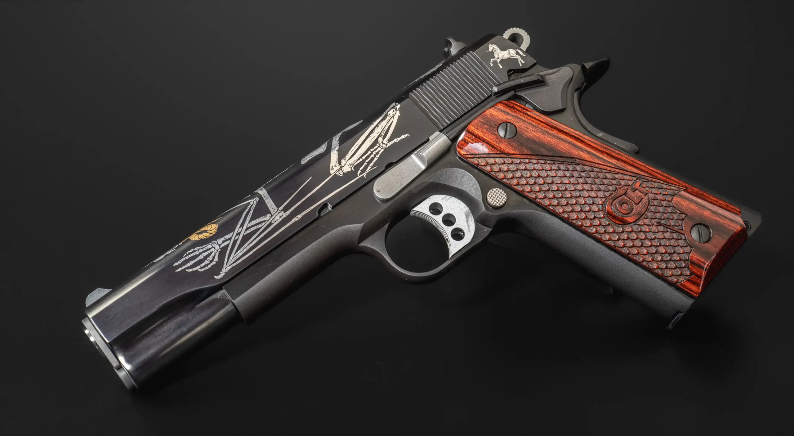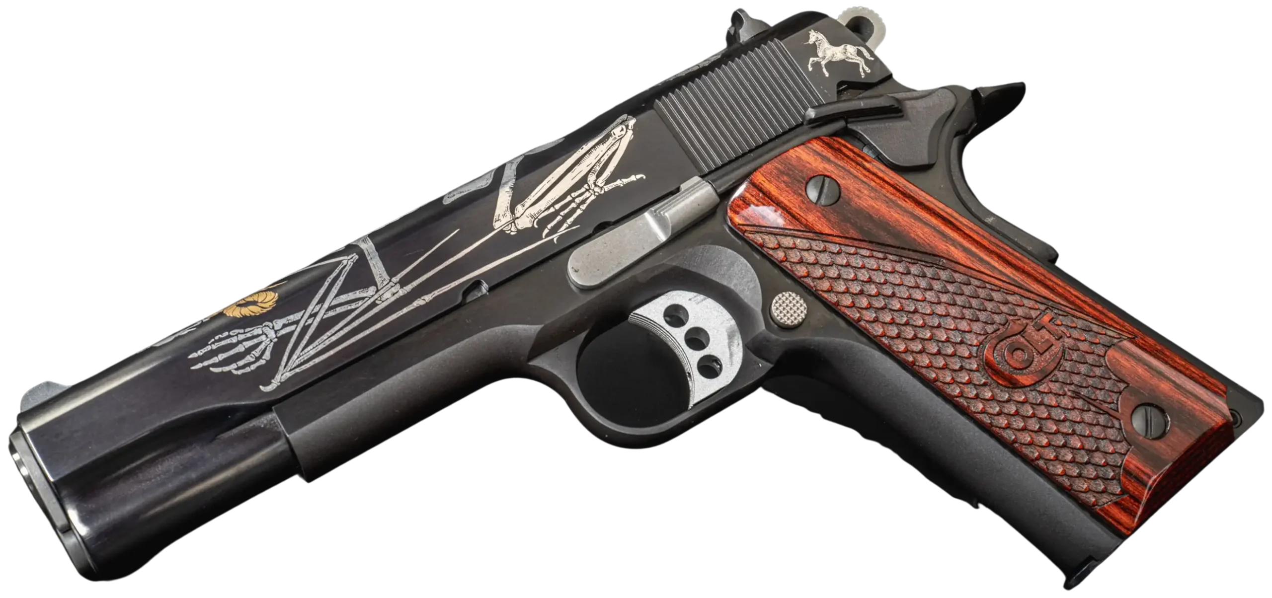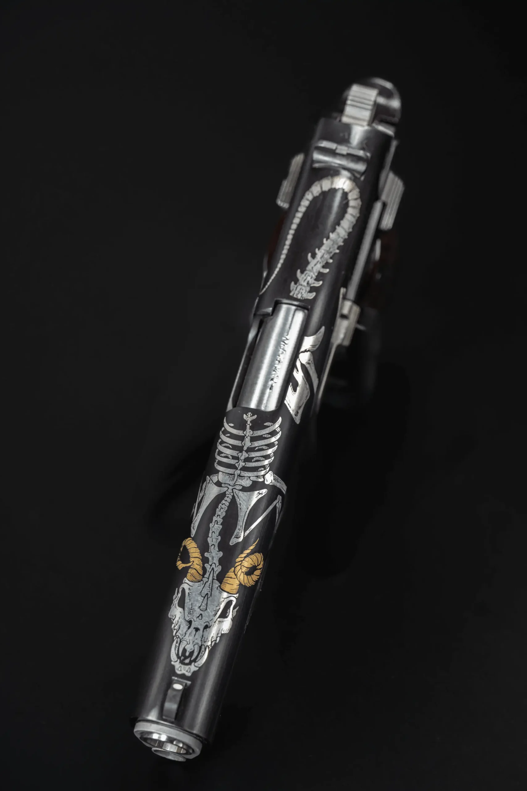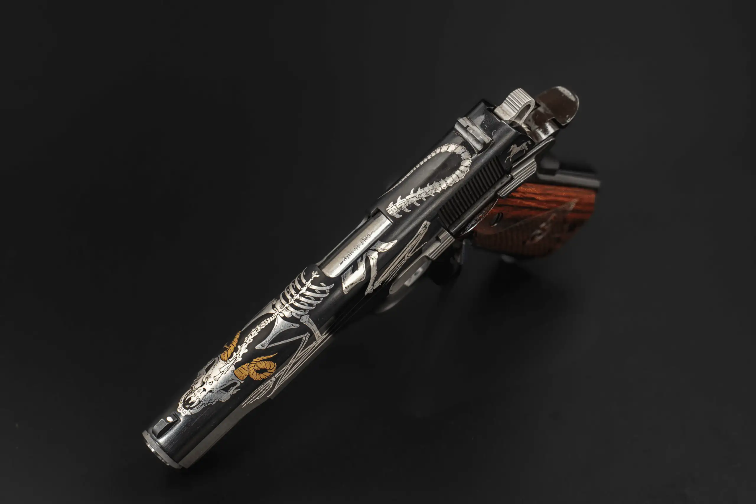 The slide features detailed engraving with a skeletal motif and a ram’s skull centerpiece, highlighted by 24KT gold-accented horns. The engraving extends across the pistol in a cohesive pattern, giving the overall design a bold, highly decorative look without losing the underlying 1911 profile.