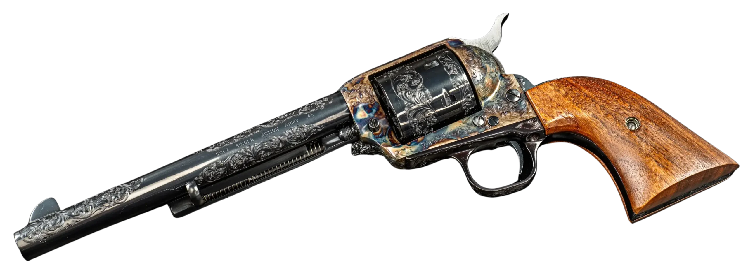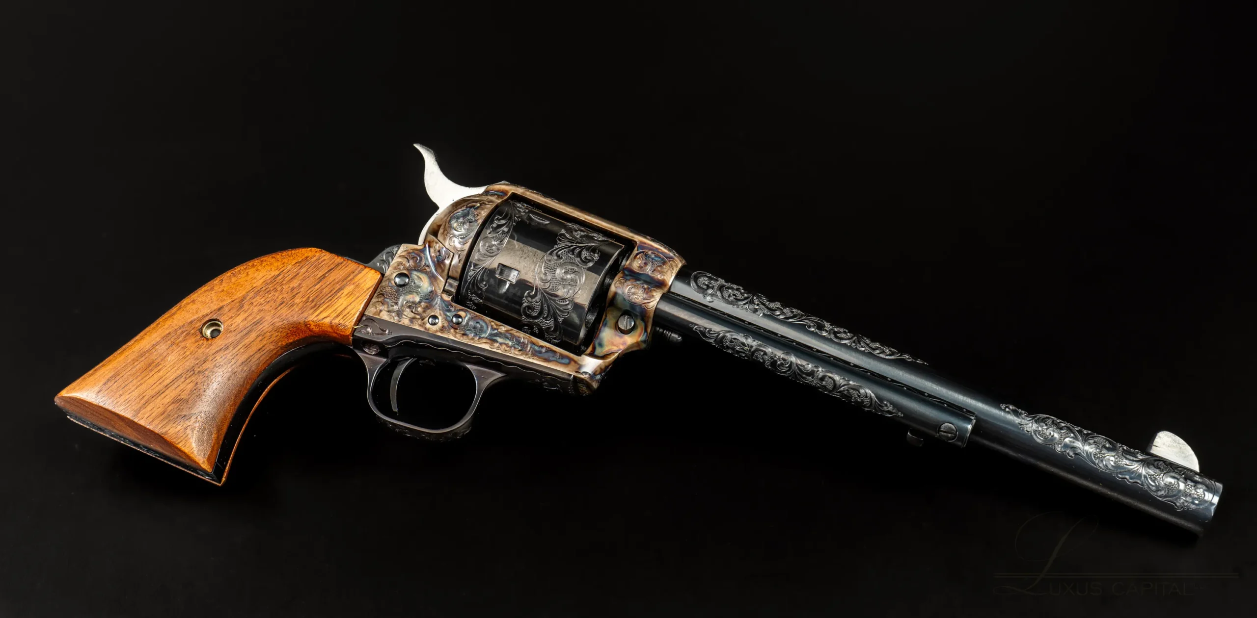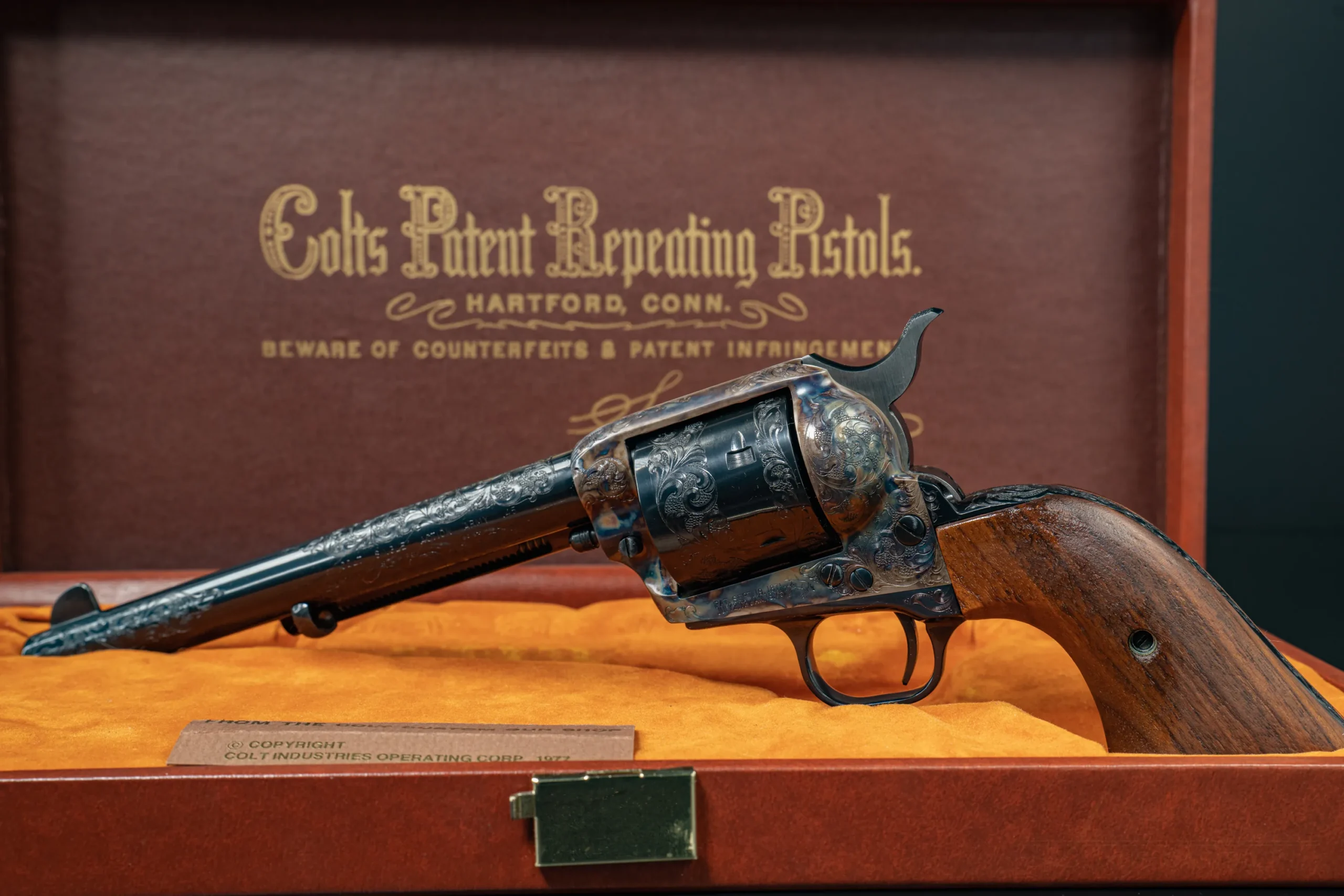 The Colt Single Action Army remains one of the most recognizable revolvers in American firearms history. This 1978 example is a factory engraved Third Generation revolver chambered in .45 Colt, combining the classic SAA profile with Colt factory decorative work.