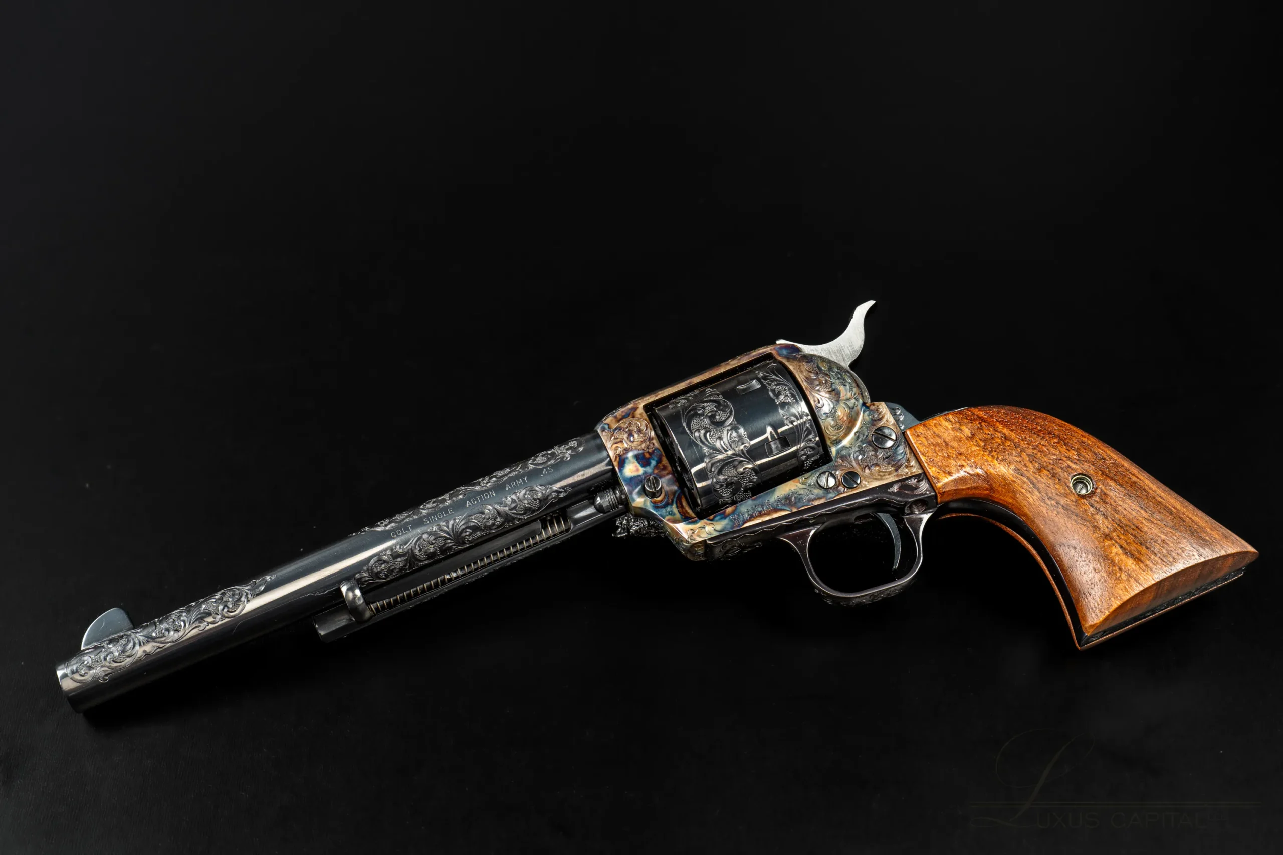 The revolver features a case-hardened frame with mottled color and is fitted with smooth walnut grips in the classic Colt profile. The contrast between the engraved steel, color case finish, and walnut gives the piece a distinctive and balanced appearance.