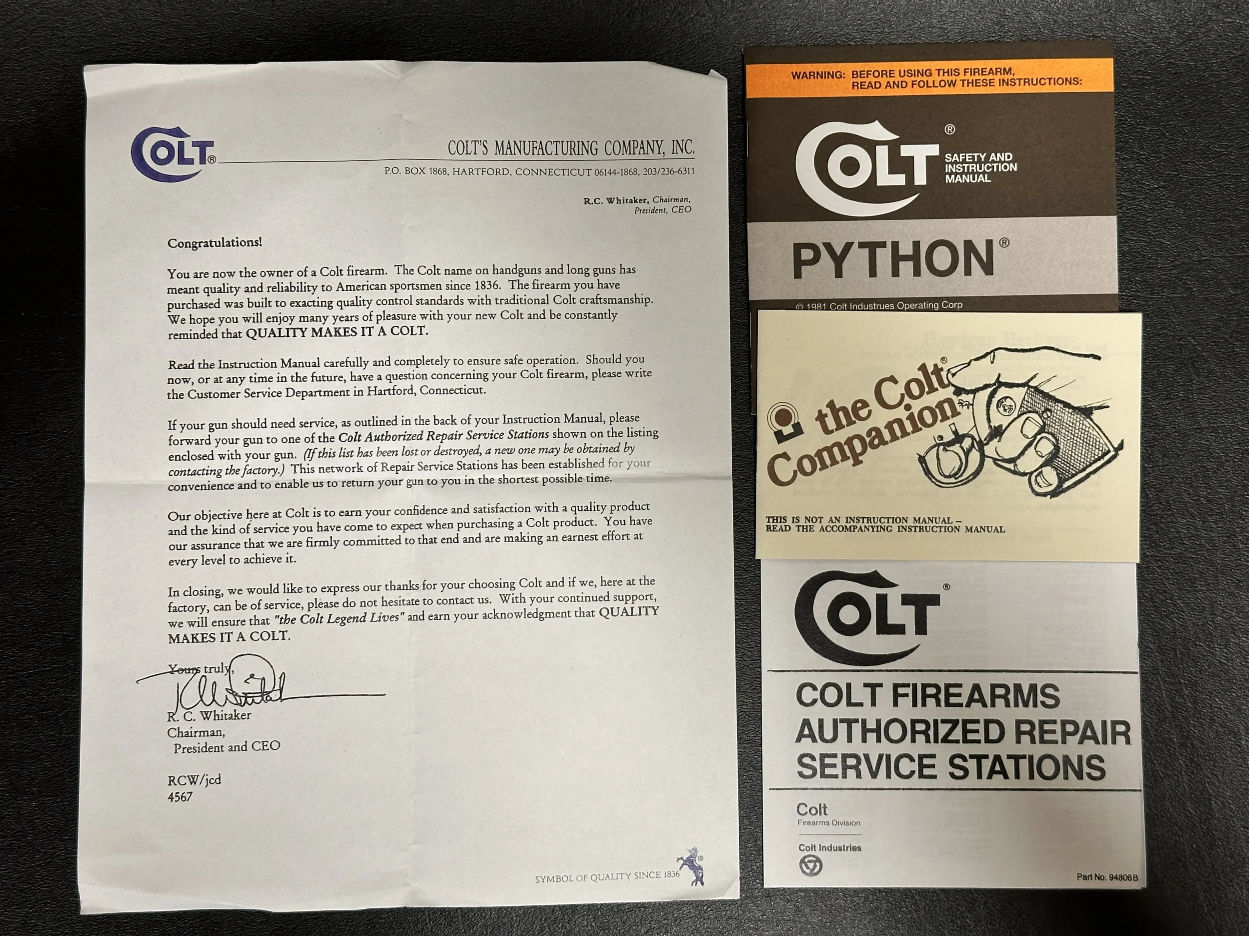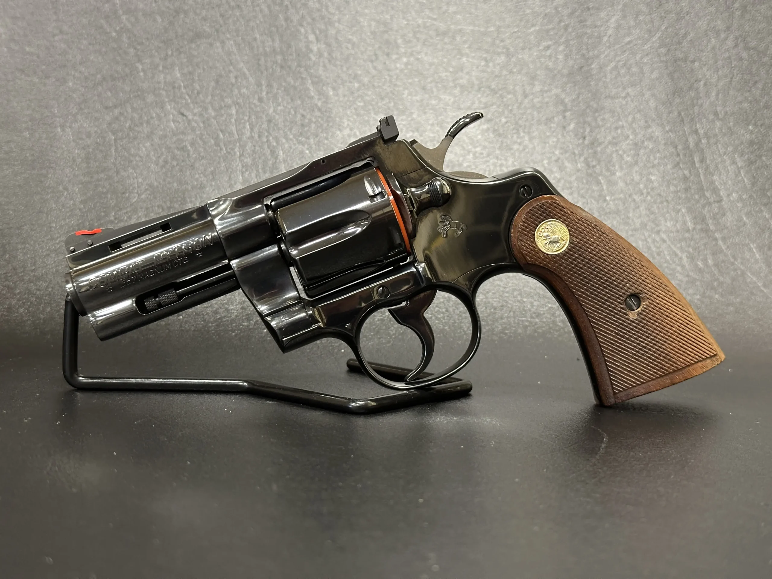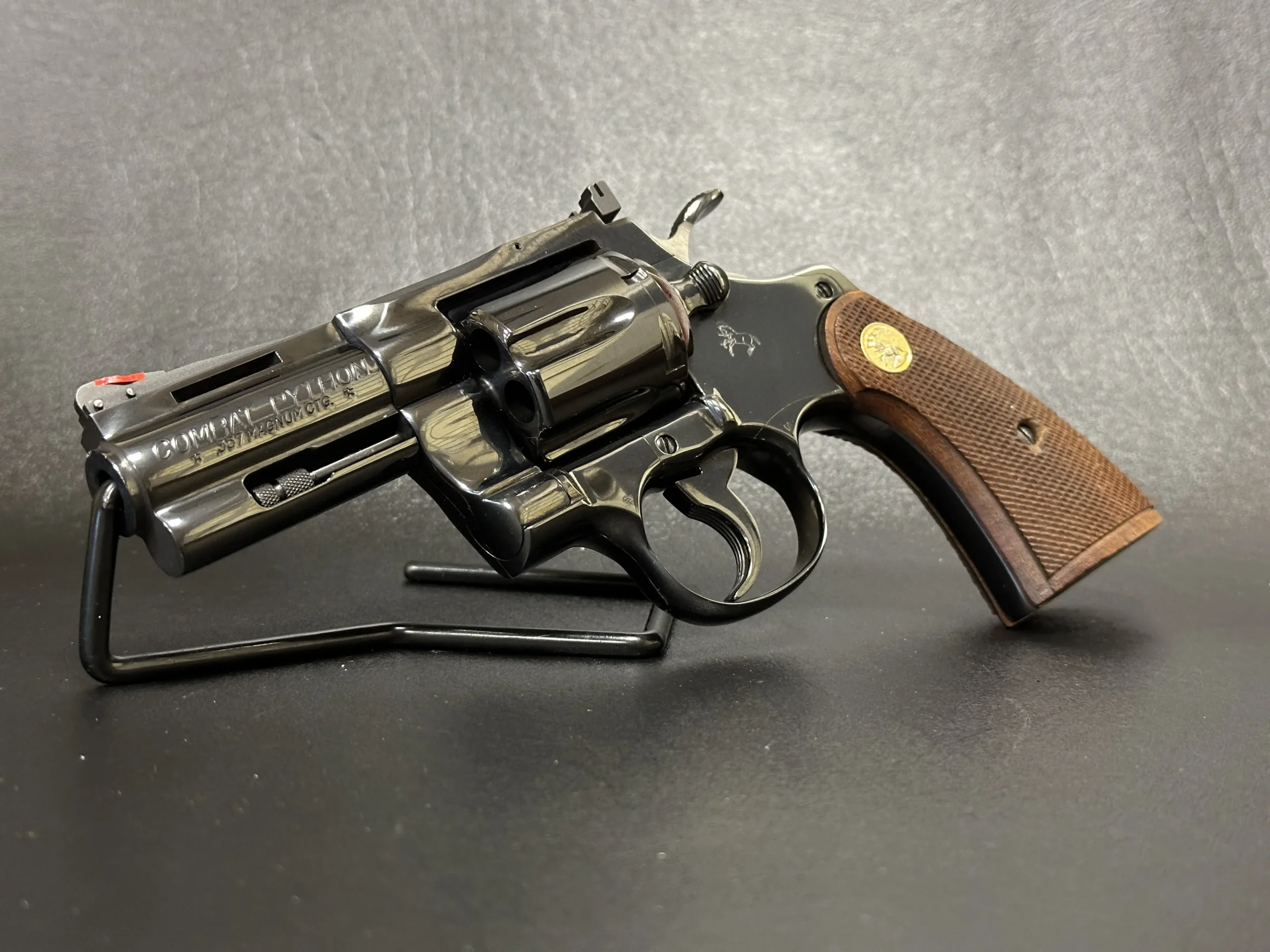 The Colt Combat Python is a double-action revolver built in 1988 with a 3-inch vent rib barrel and the “COMBAT PYTHON/357 MAGNUM CTG.” roll mark. This example also bears German proofs and includes a Colt box with a reproduction end label.