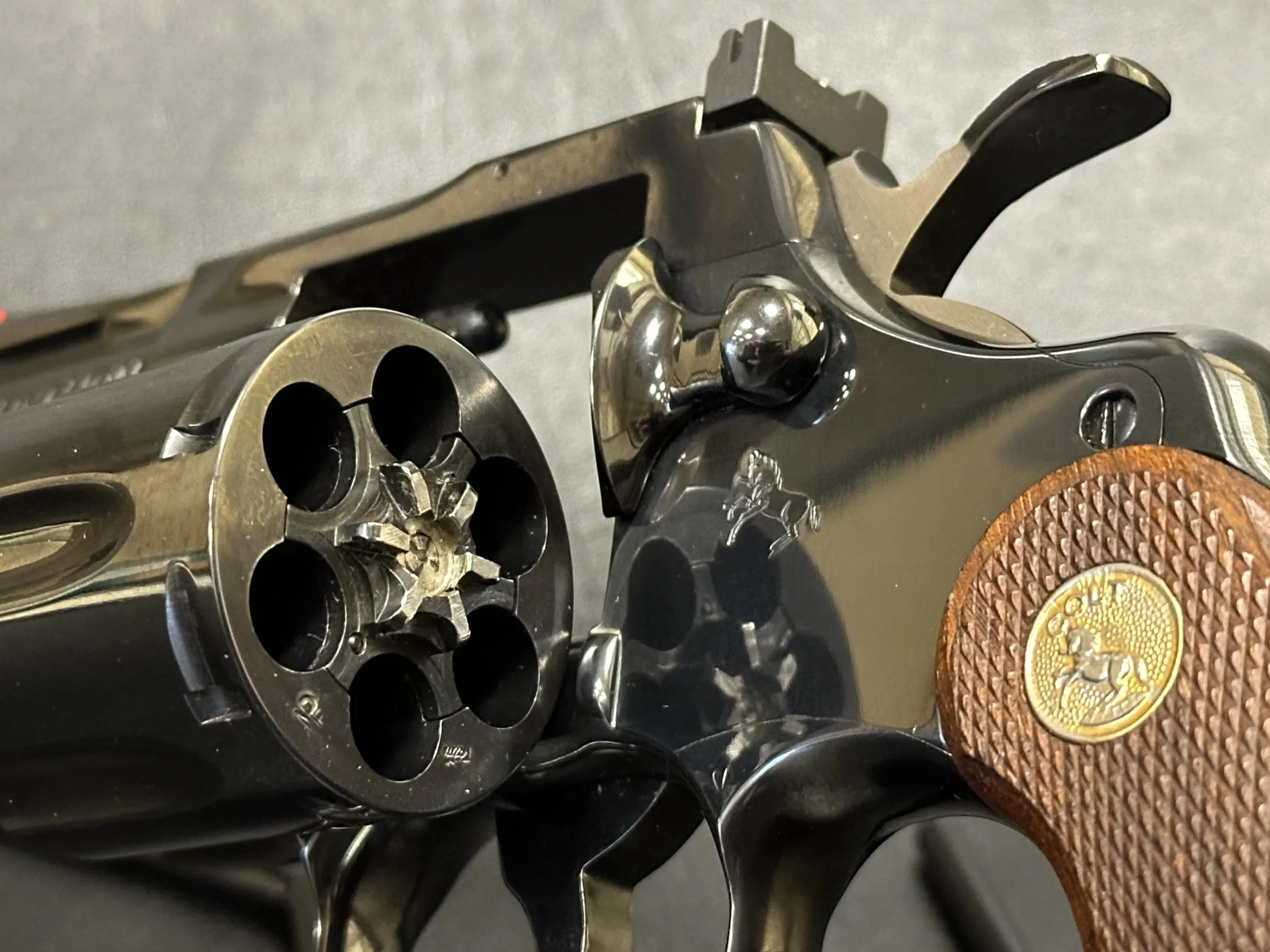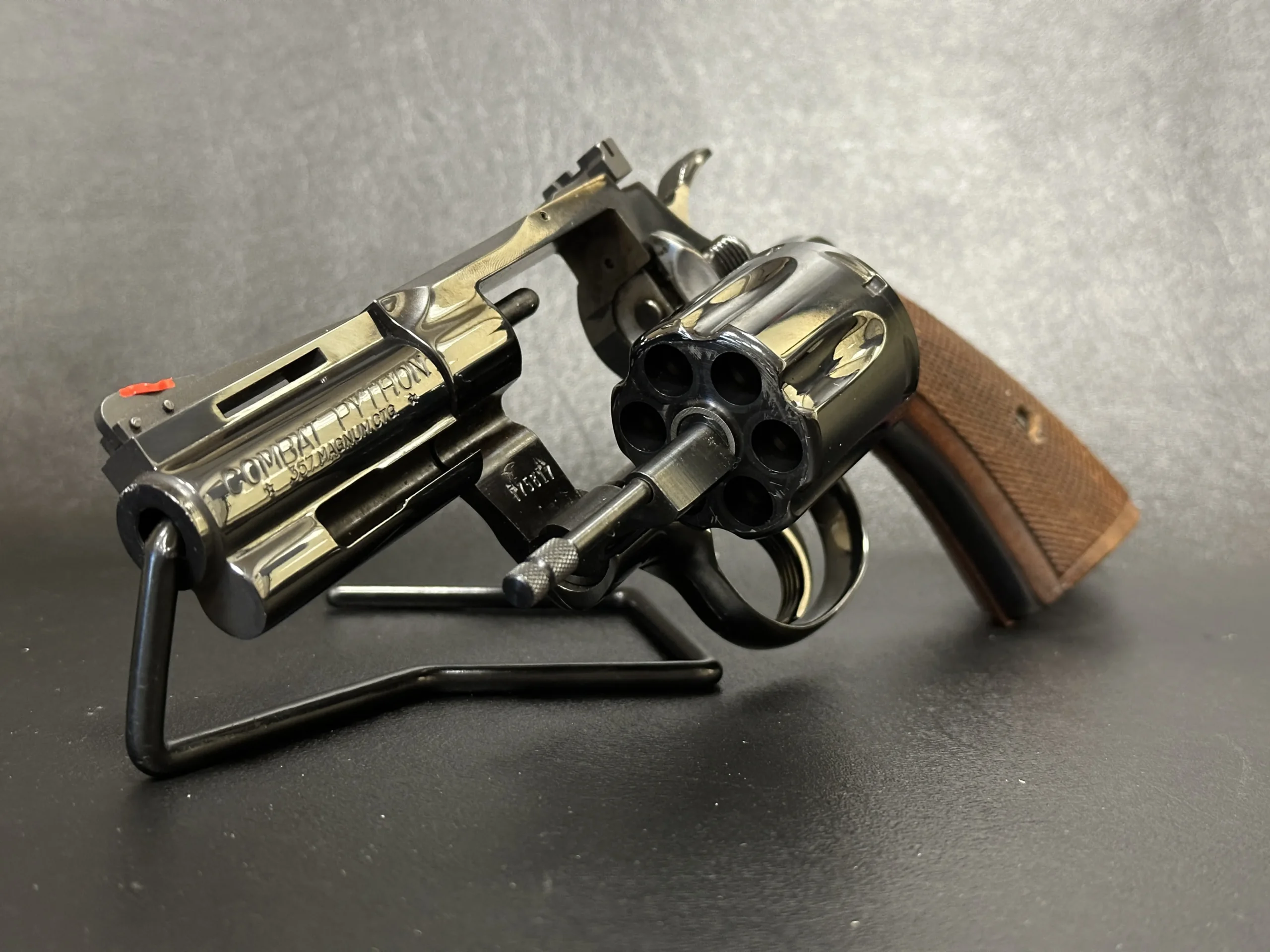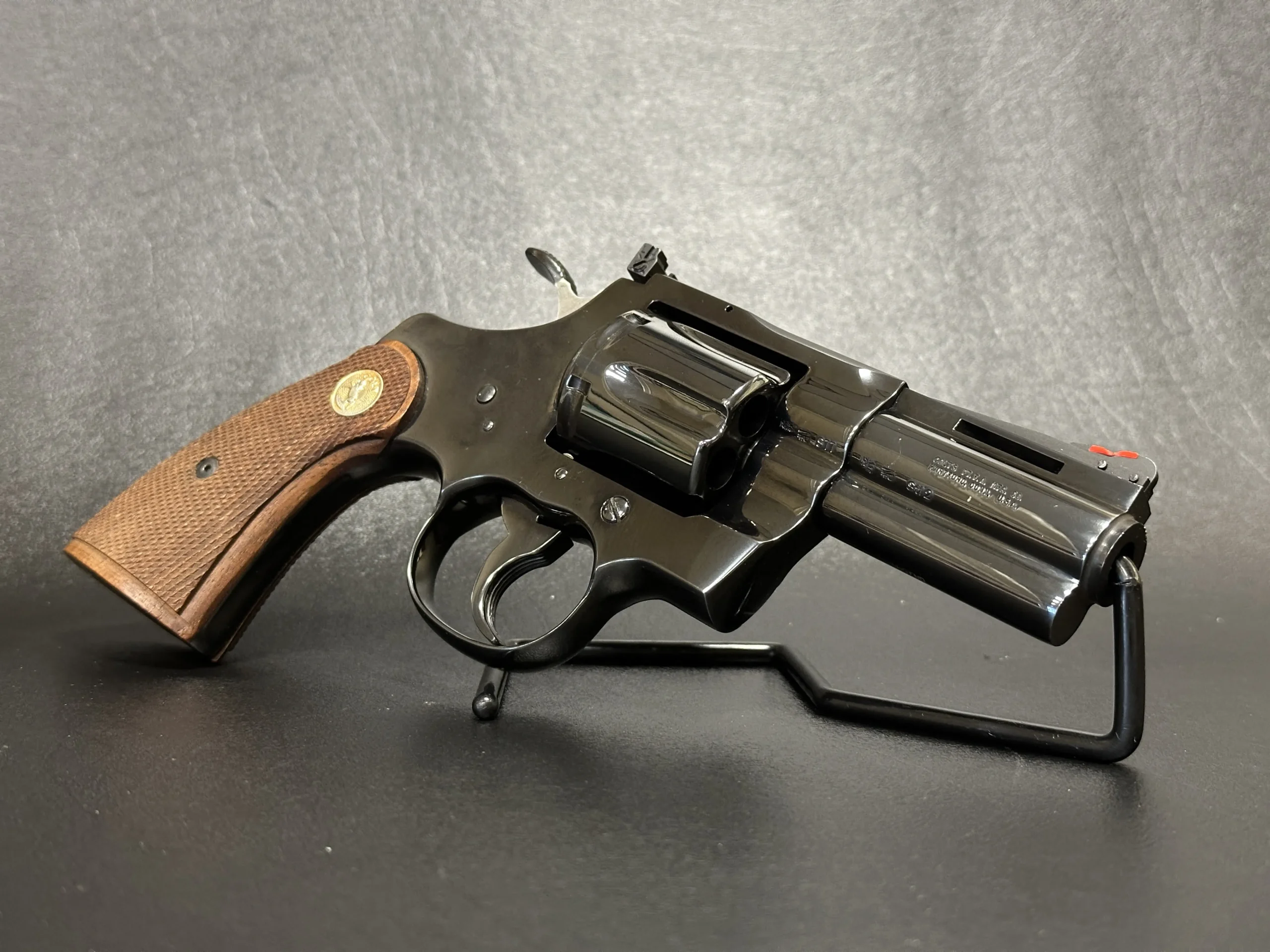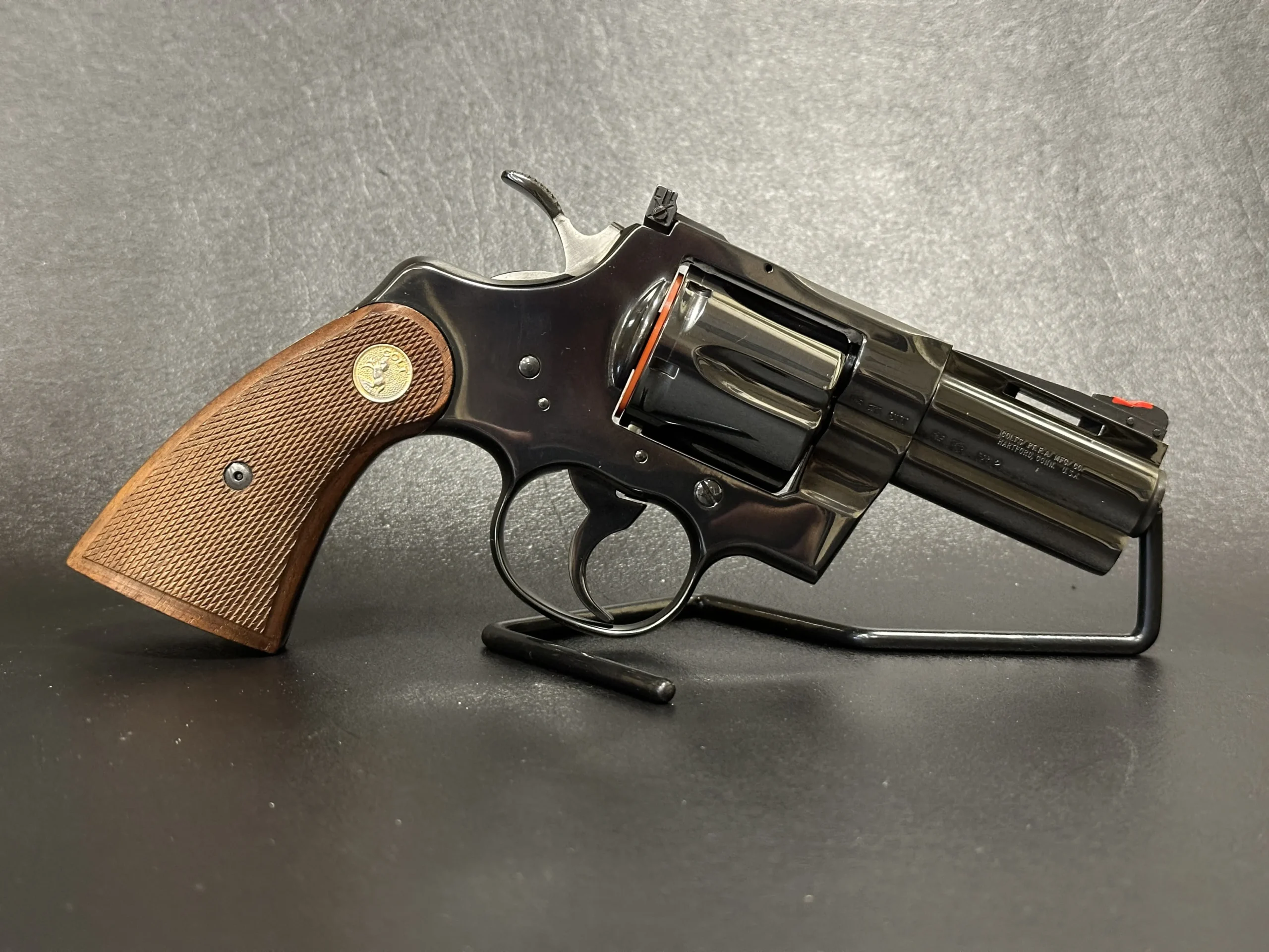 Walnut grips with sharp checkering complement the classic Python profile, while the compact barrel length gives this model a distinctive look within the Colt revolver line. The combination of factory markings, barrel configuration, and included accessories makes it a strong fit for a Colt-focused collection.