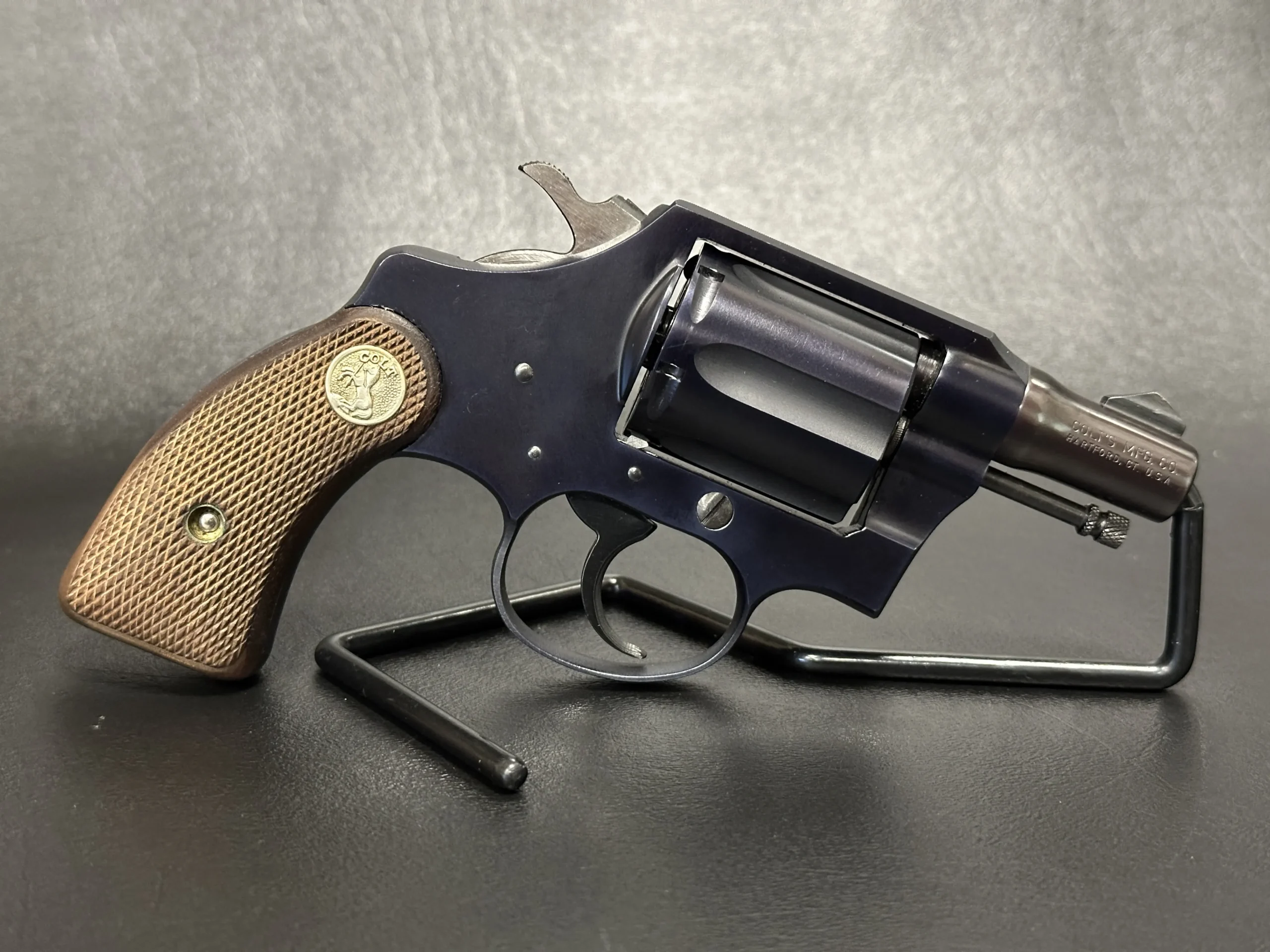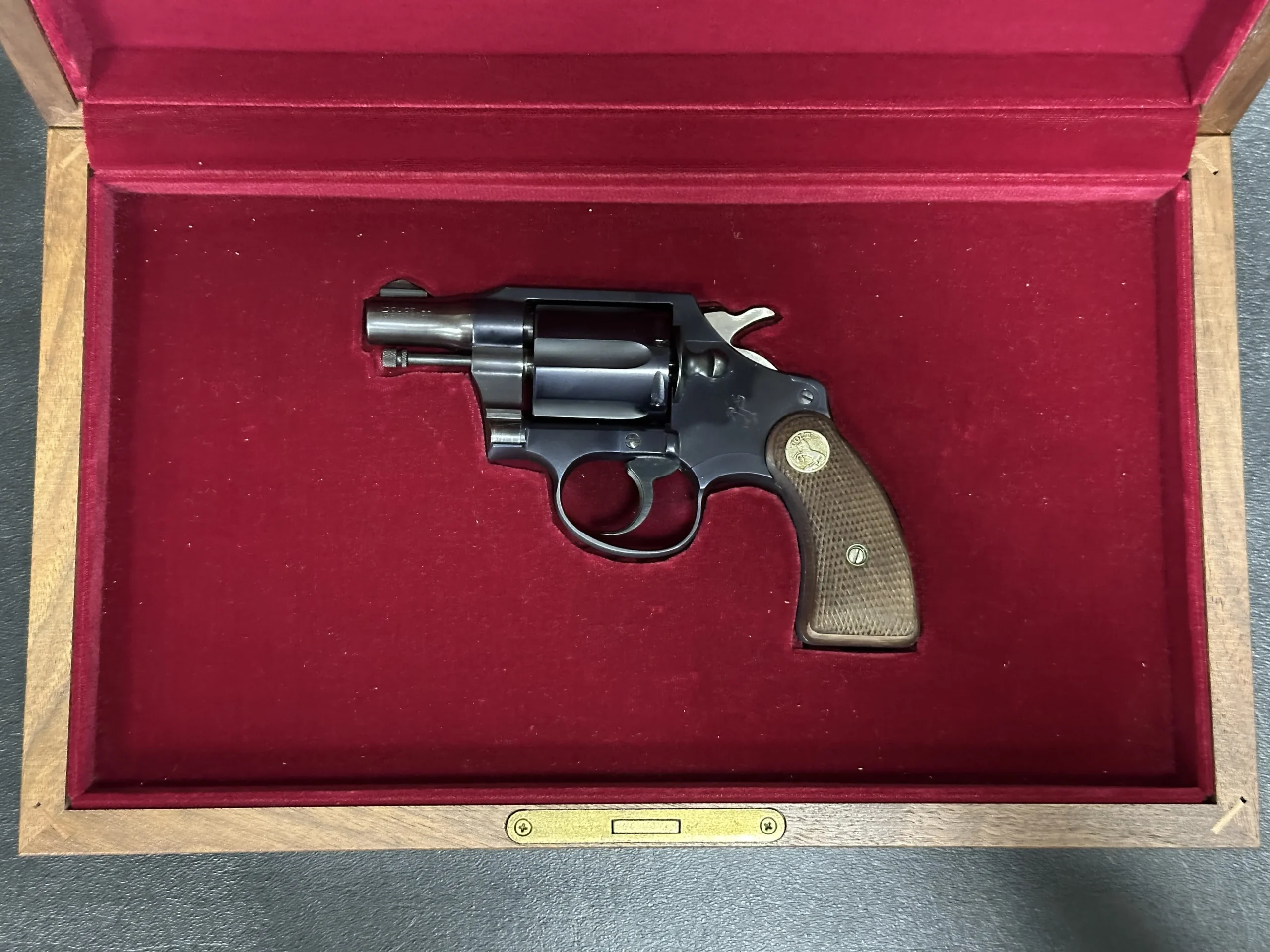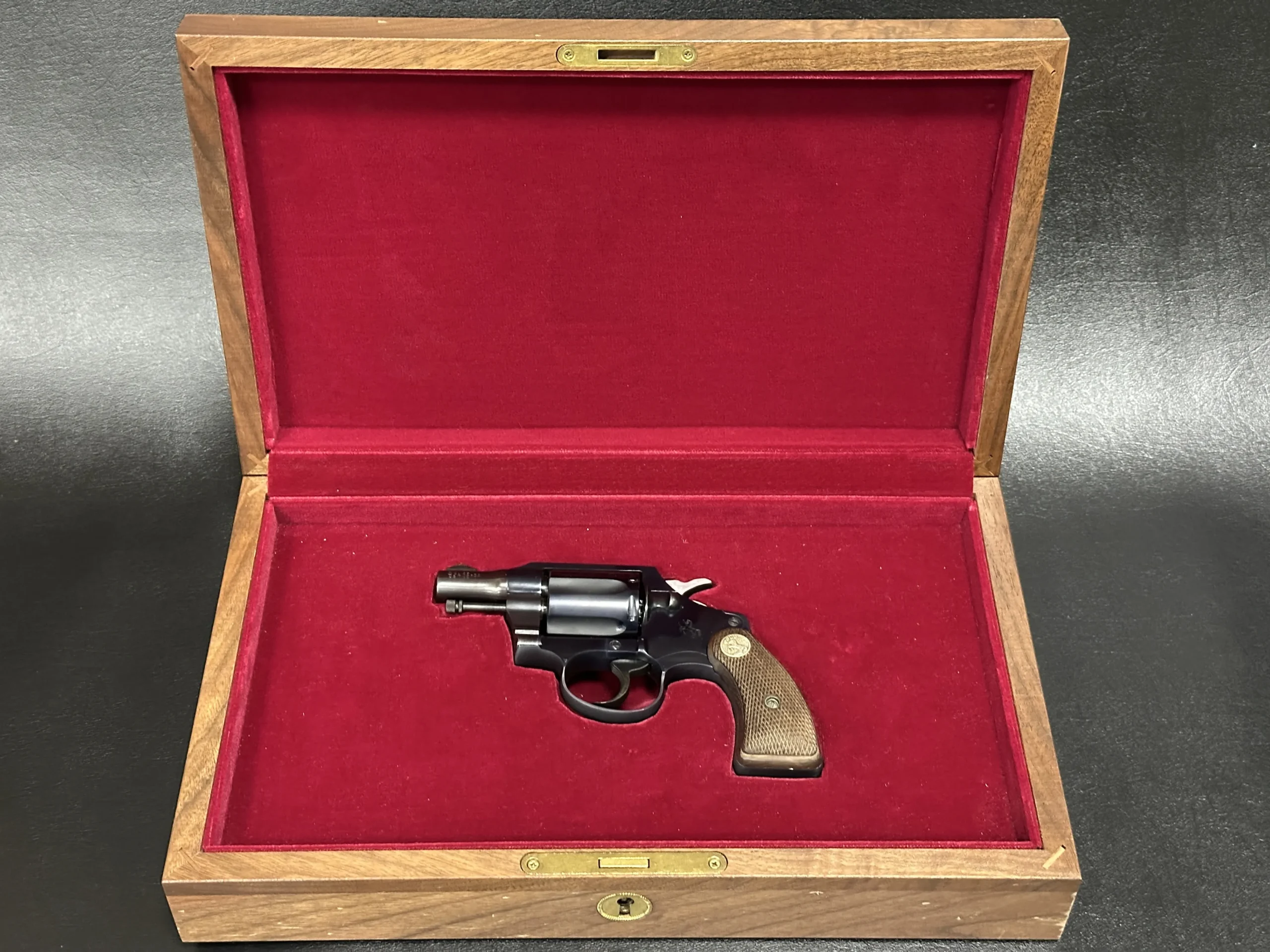 This Colt Factory Collection Prototype Lightweight Model Double Action Revolver is accompanied by an original factory letter and a custom case. The factory letter identifies the revolver with a 2-inch barrel, chambering in .32 Police Positive, and wood grips with “Old Style Medallions.” It also notes a manufacture date of July 2, 1952.