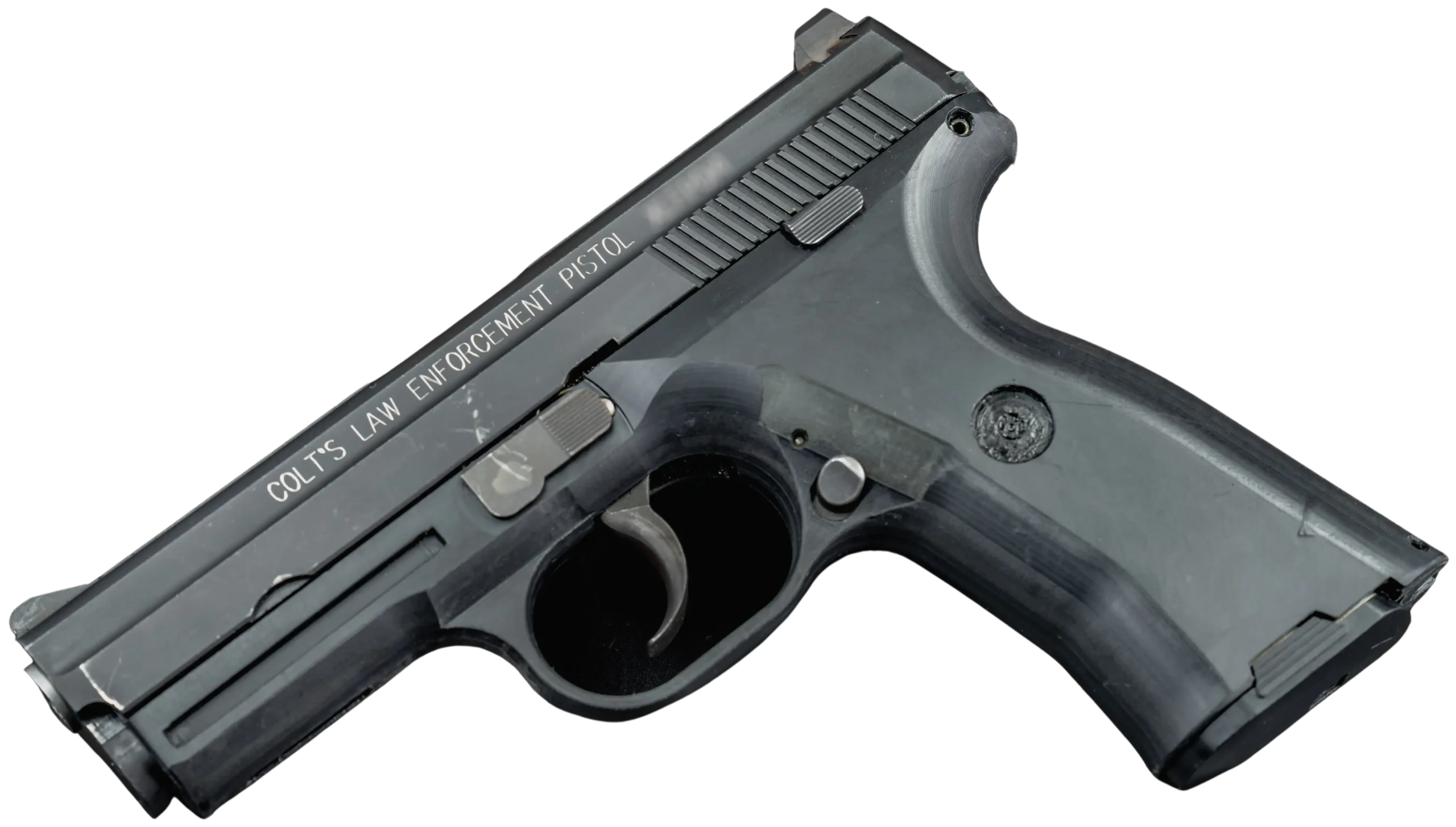 The Colt Law Enforcement Pistol Prototype is an experimental handgun chambered in .40 S&W. Its distinctive design combines a sculpted, ergonomic frame with clean, utilitarian slide lines, reflecting a concept developed with law enforcement use in mind.