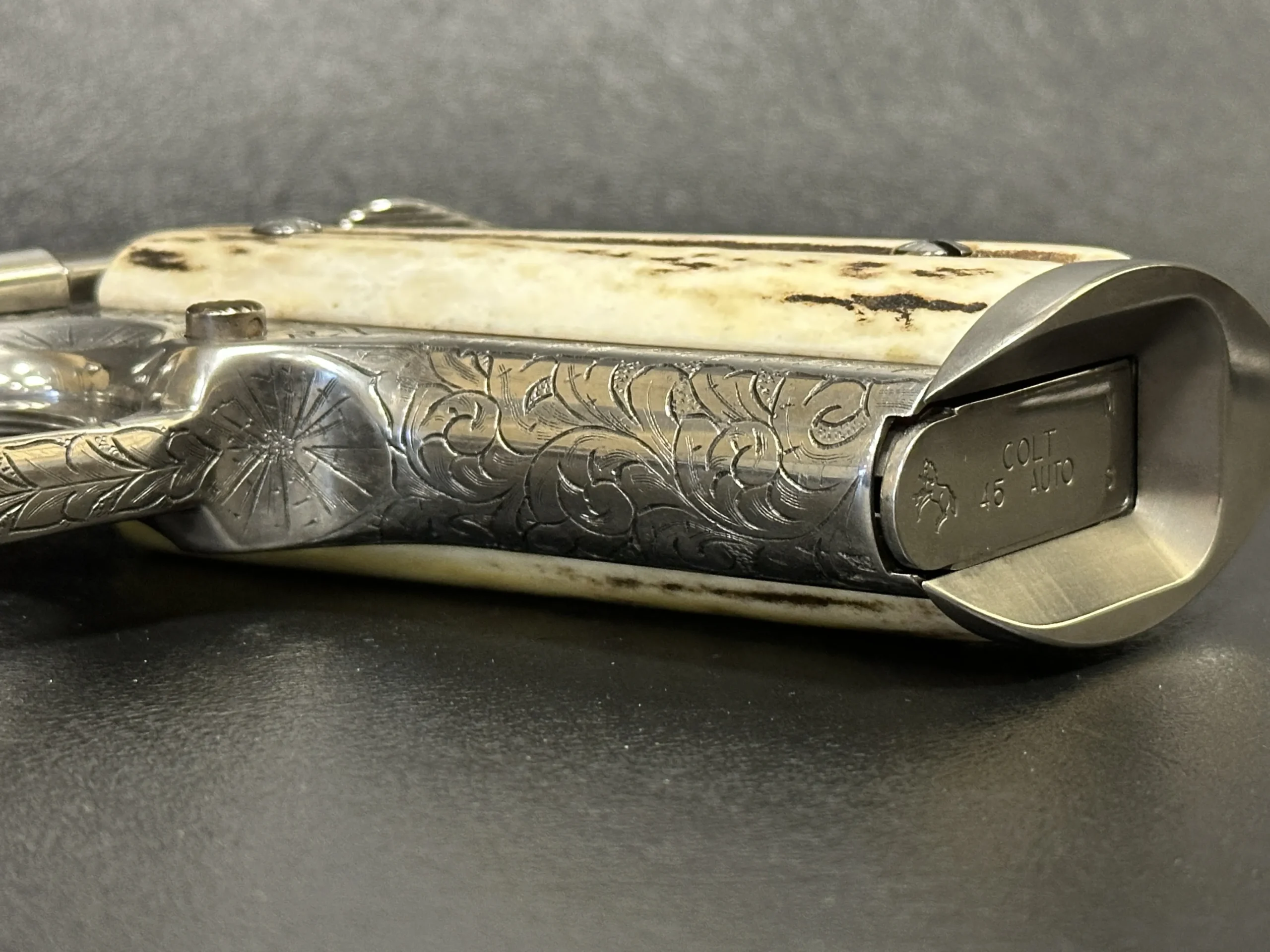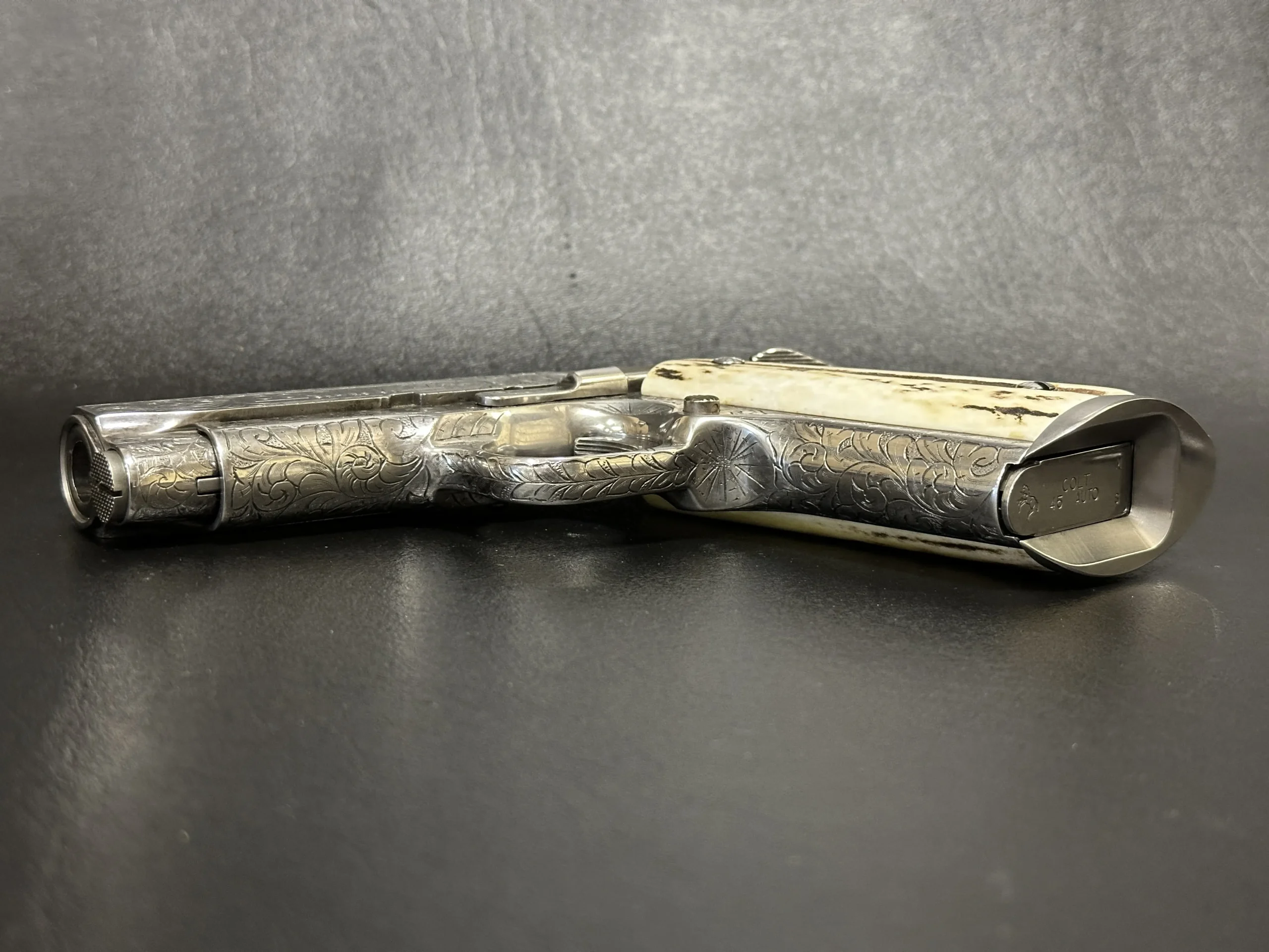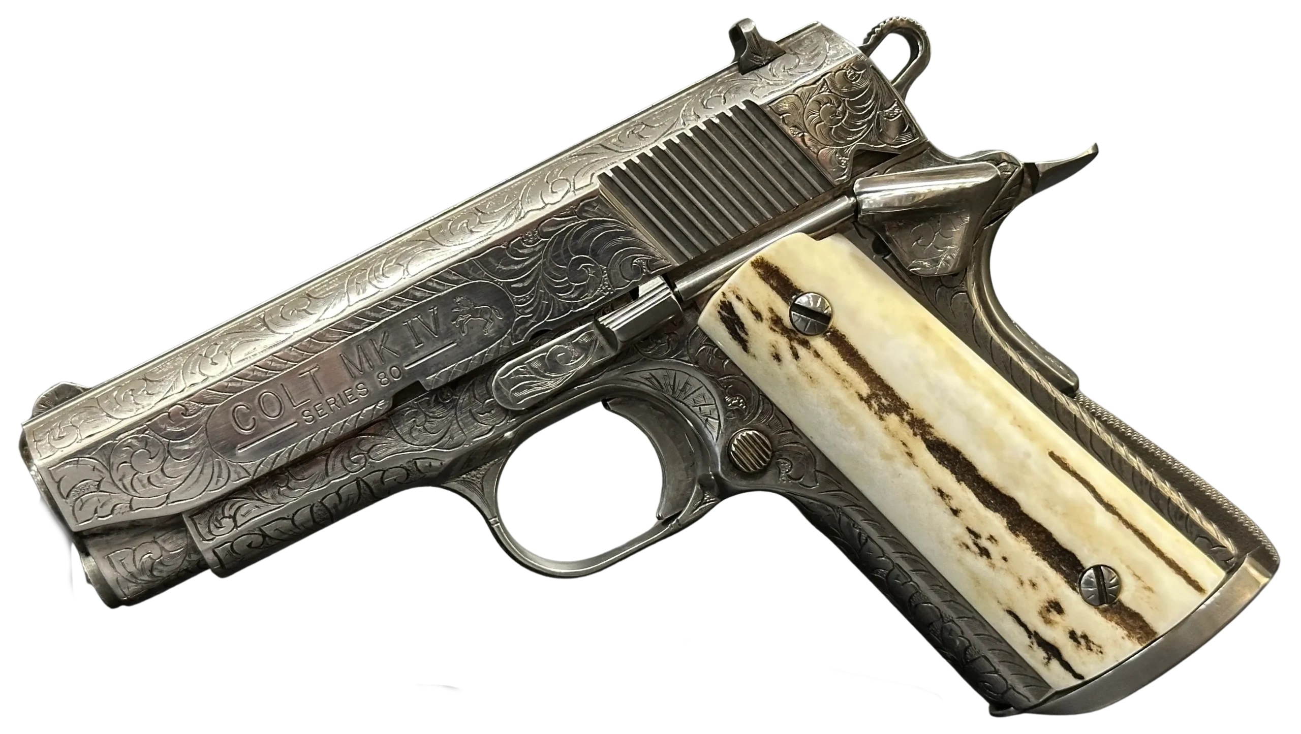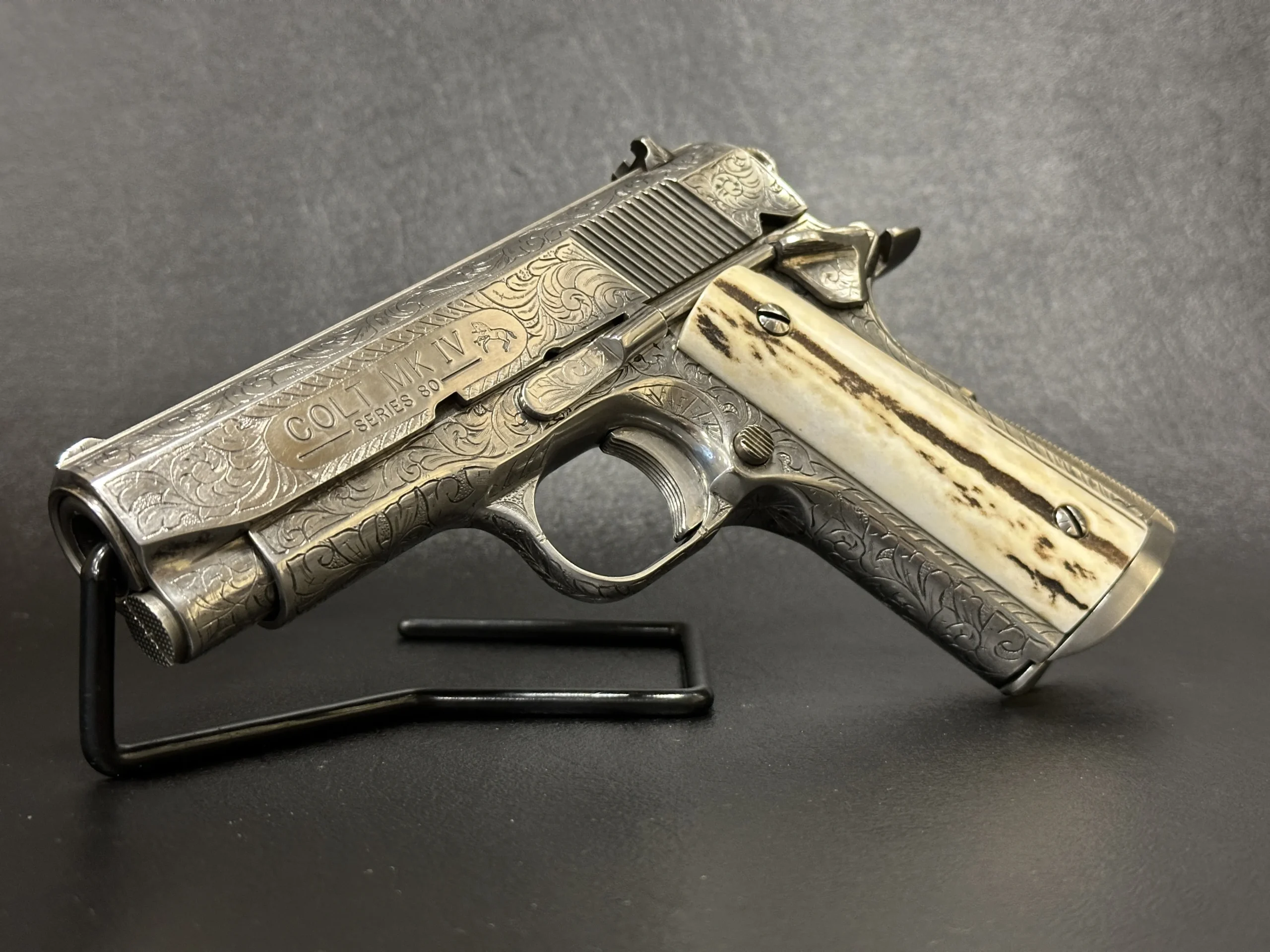 A 1995 Colt Officer’s MK IV Series 80 engraved by Master Engraver Robert Bromley Valade, known as the “Engraver to the Stars.” Chambered in .45 ACP with a 3.5-inch barrel, this presentation features a bright nickel finish and detailed engraving that showcases Valade’s distinctive hand.