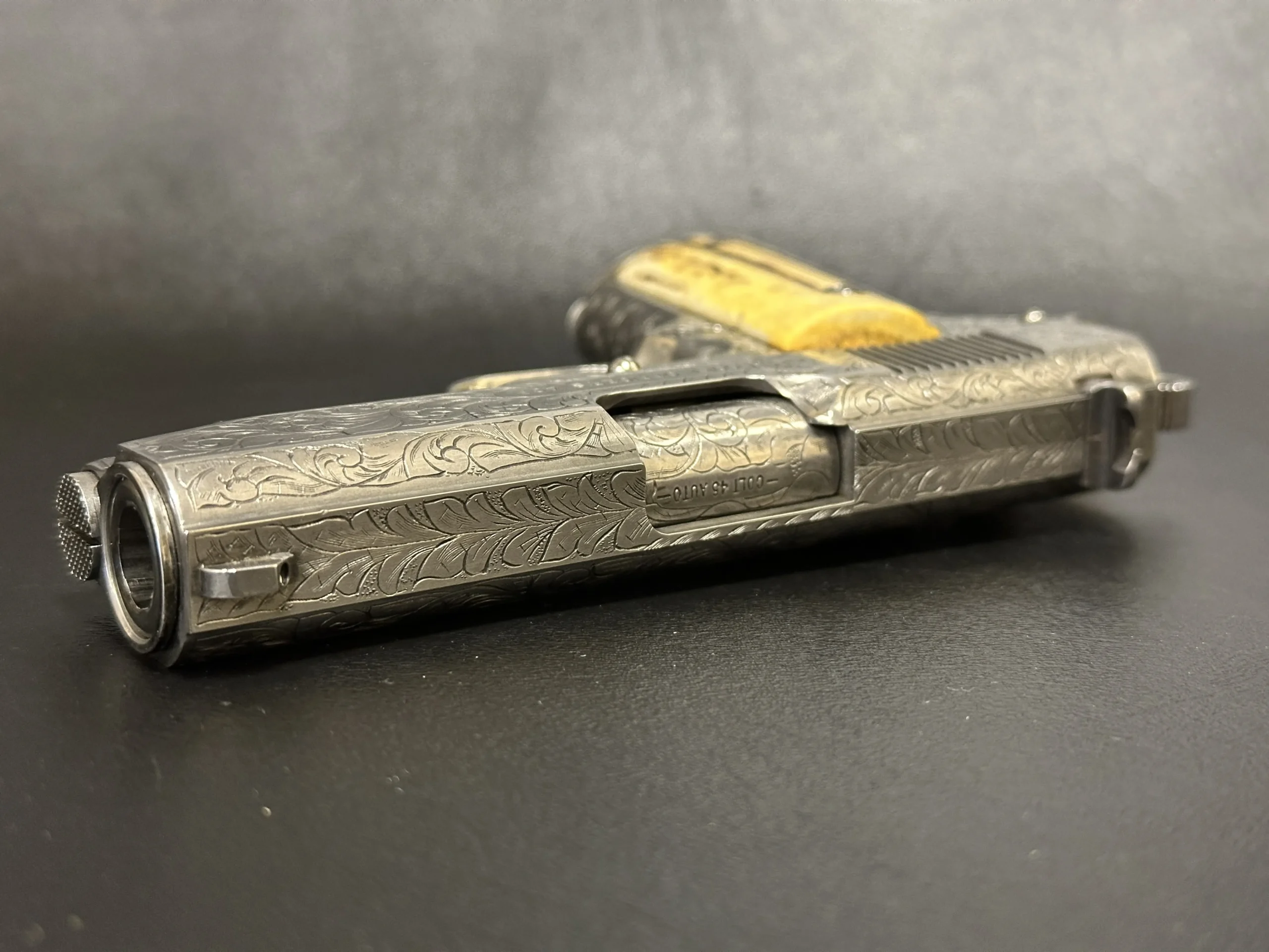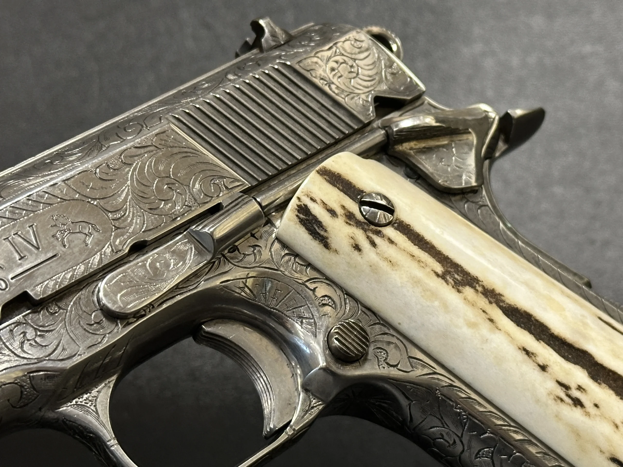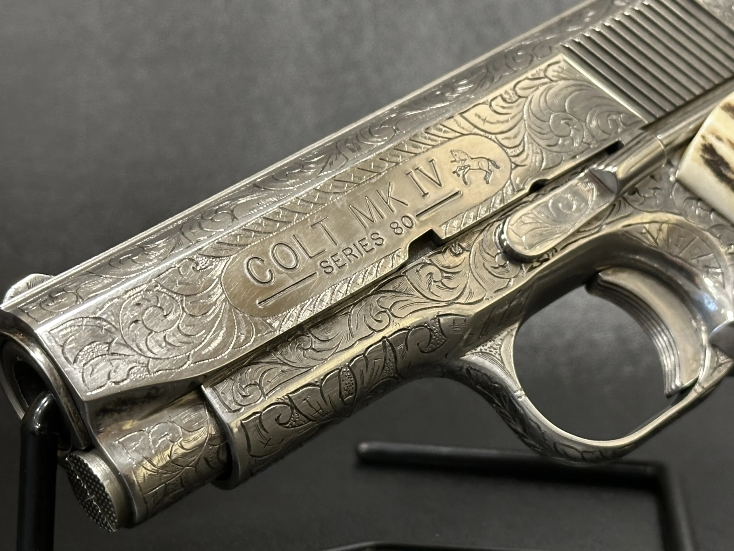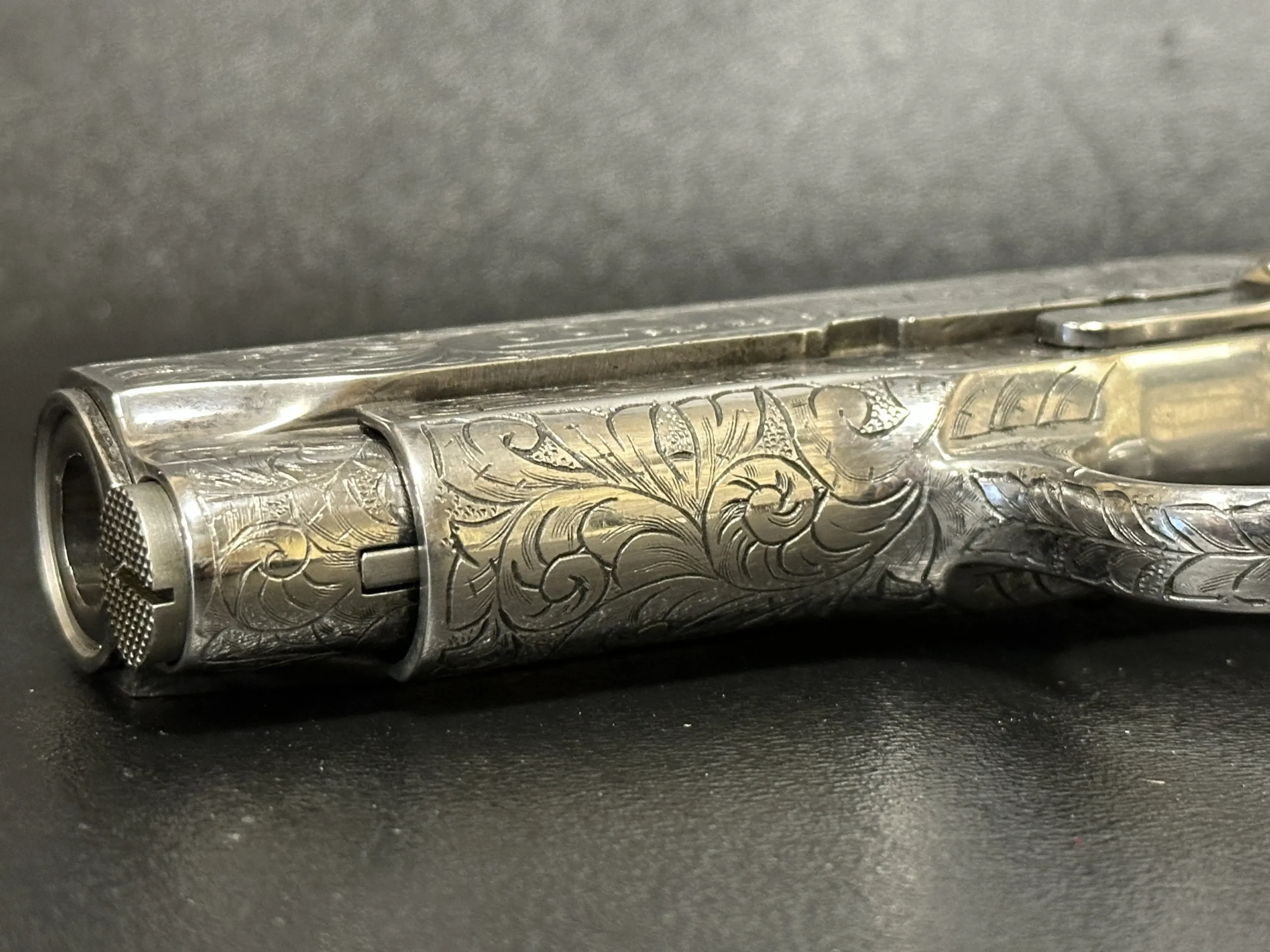 A 1995 Colt Officer’s MK IV Series 80 engraved by Master Engraver Robert Bromley Valade, known as the “Engraver to the Stars.” Chambered in .45 ACP with a 3.5-inch barrel, this presentation features a bright nickel finish and detailed engraving that showcases Valade’s distinctive hand.