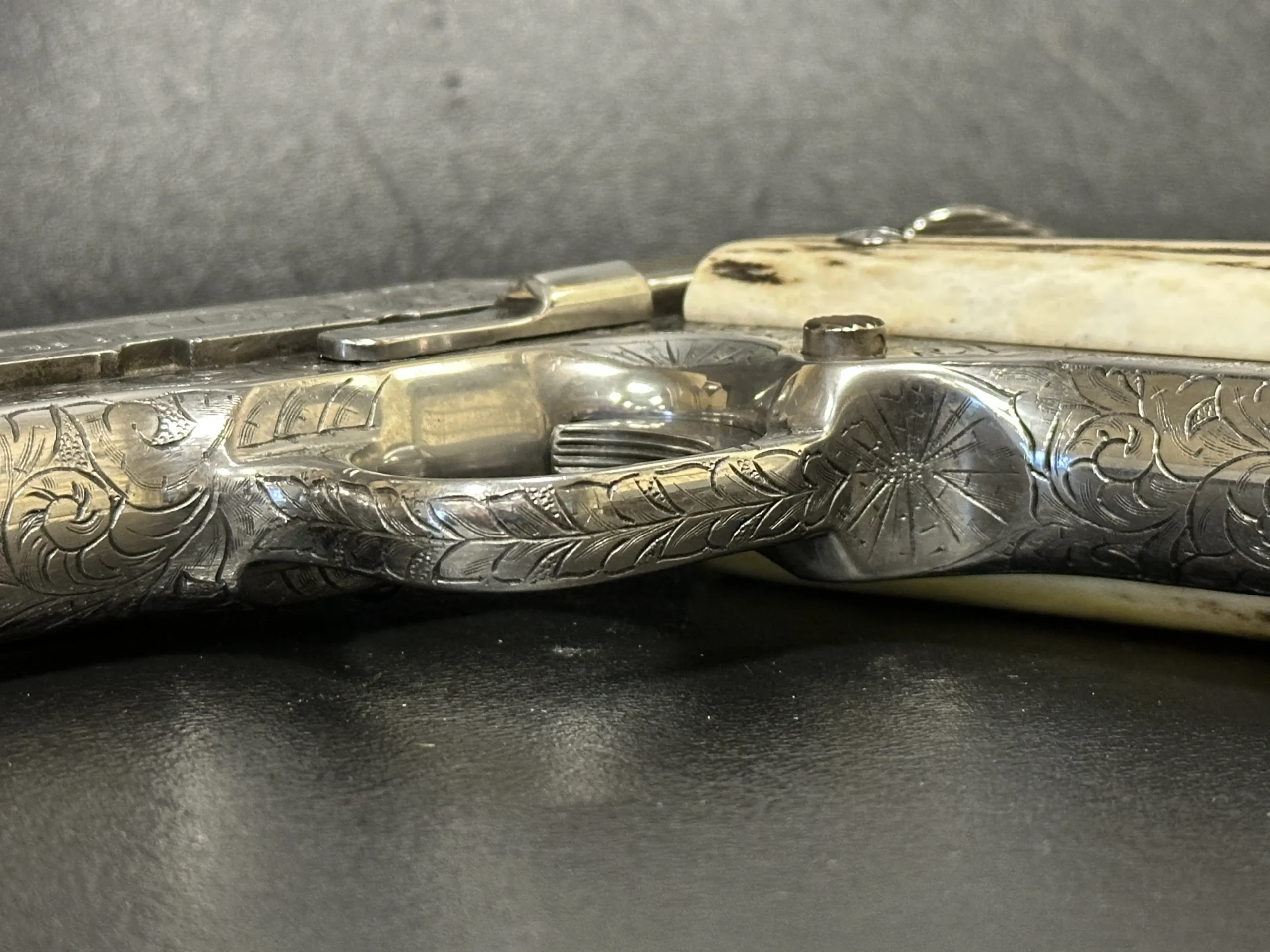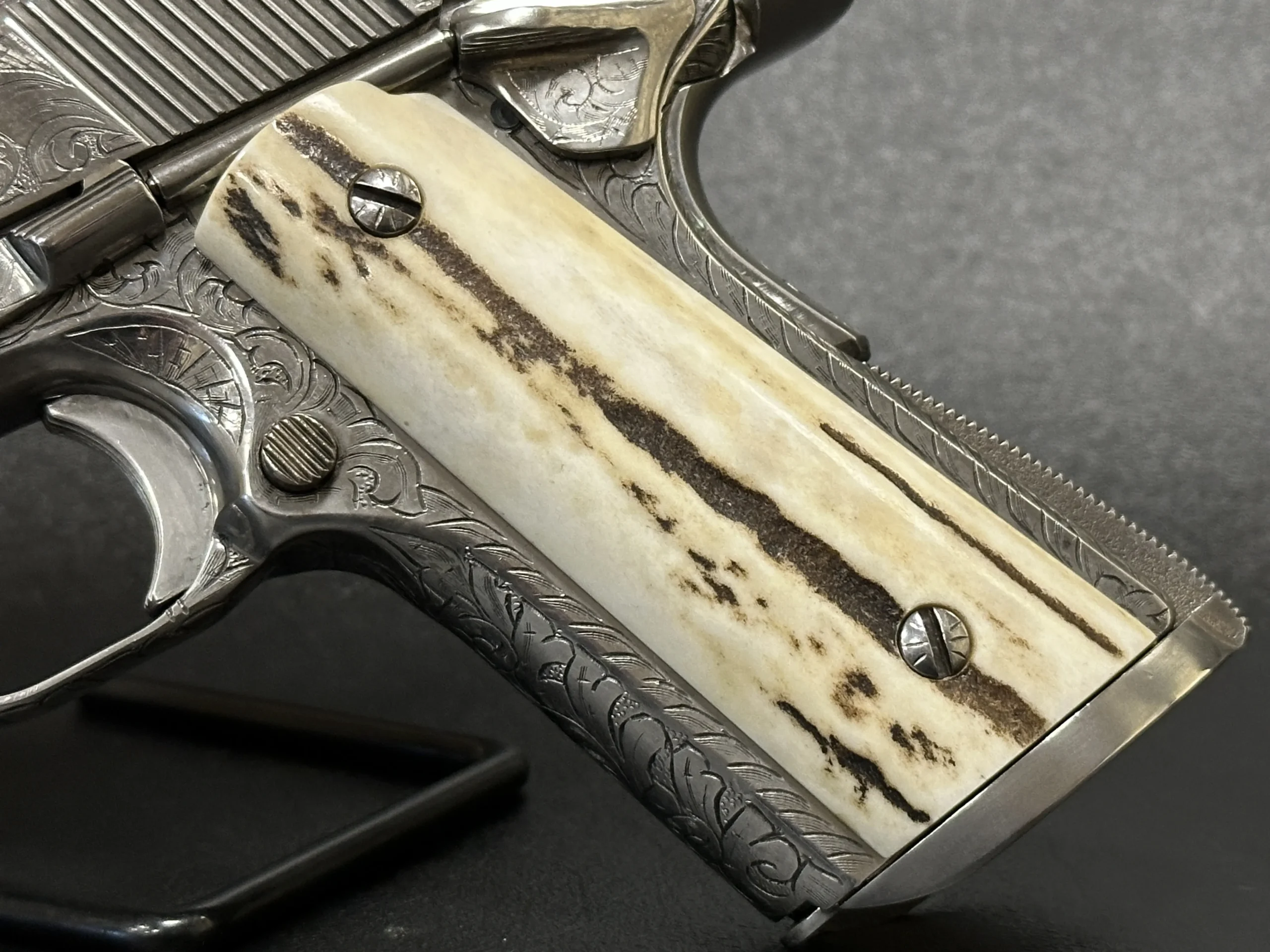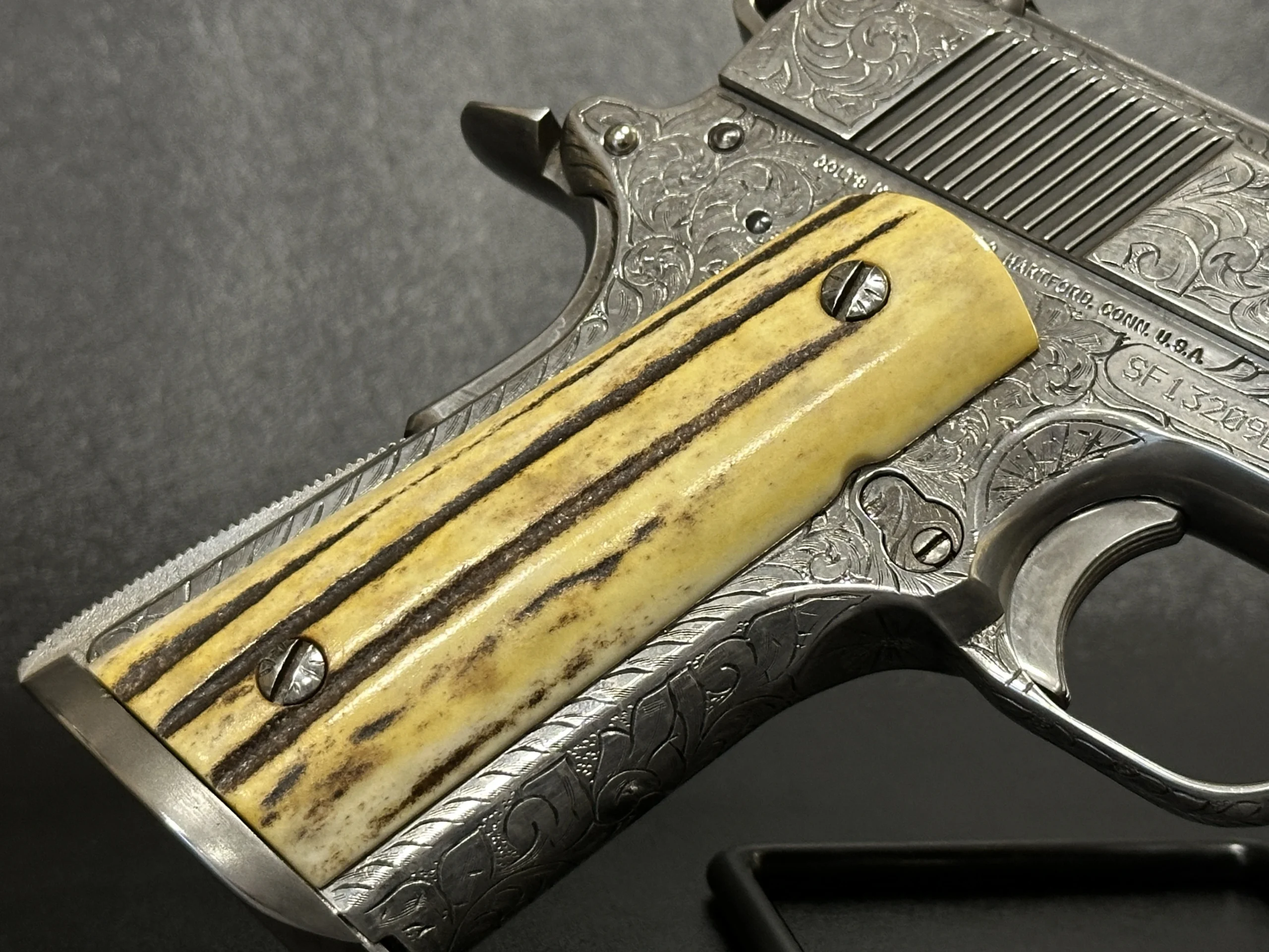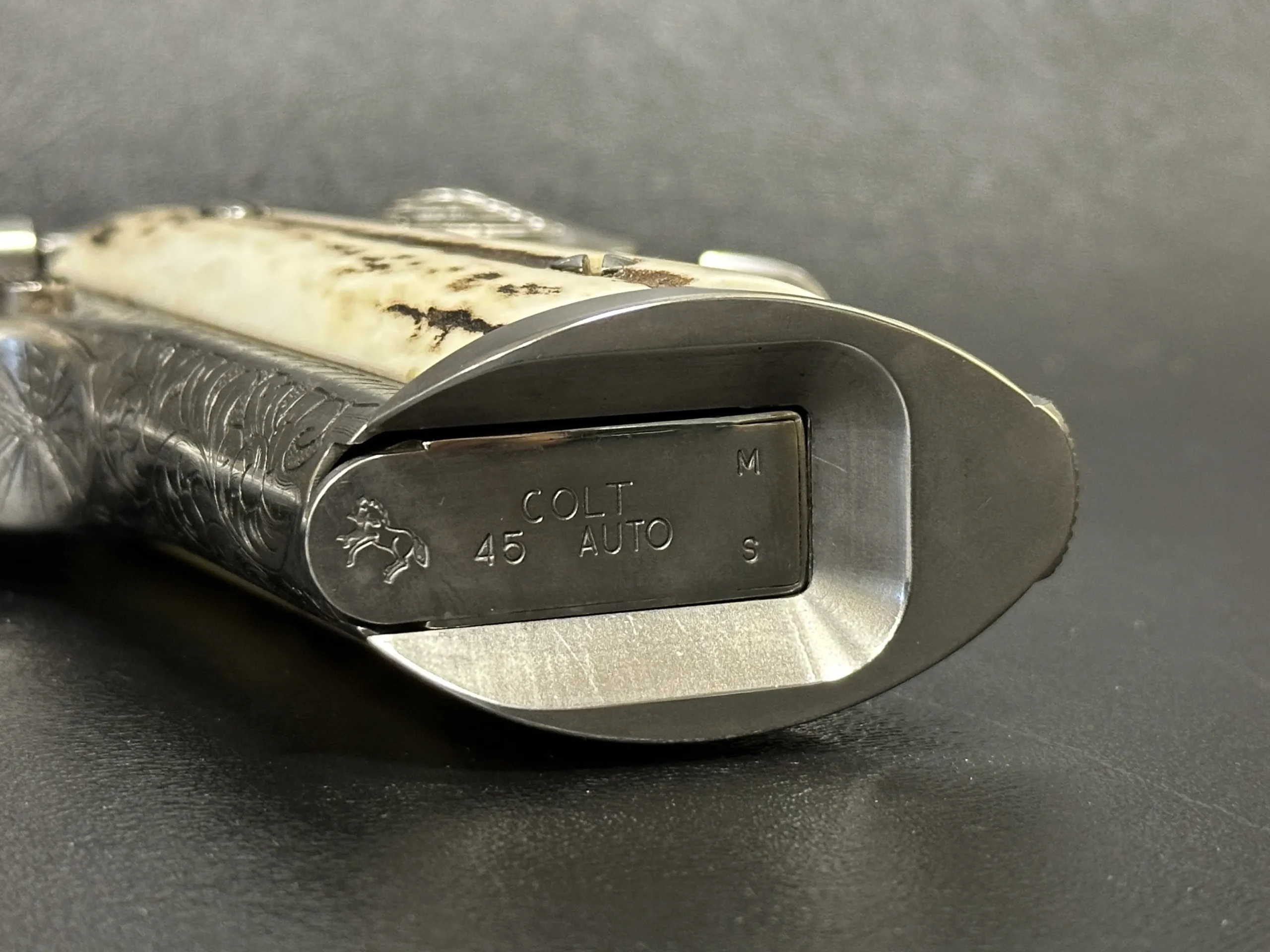A 1995 Colt Officer’s MK IV Series 80 engraved by Master Engraver Robert Bromley Valade, known as the “Engraver to the Stars.” Chambered in .45 ACP with a 3.5-inch barrel, this presentation features a bright nickel finish and detailed engraving that showcases Valade’s distinctive hand.