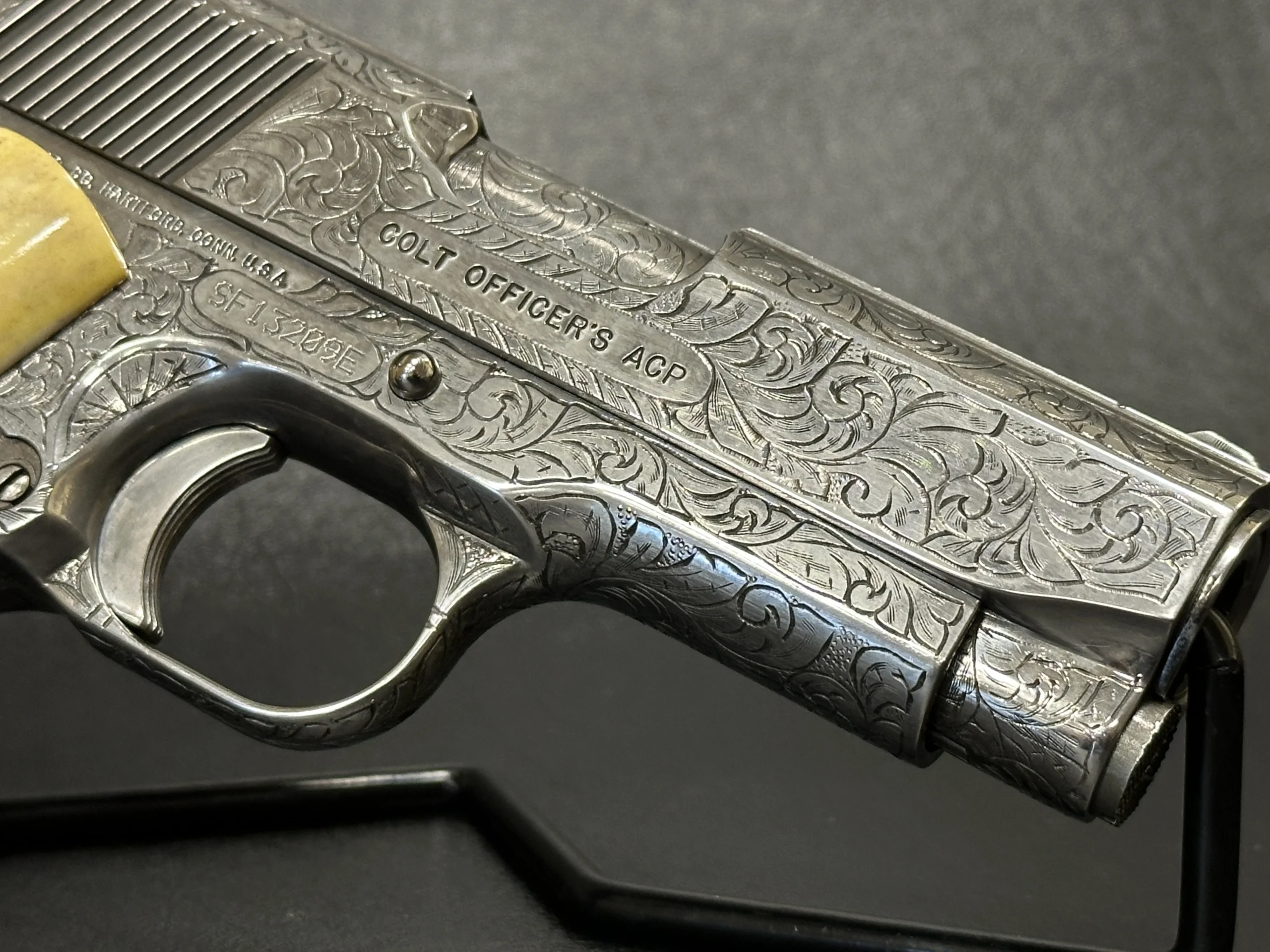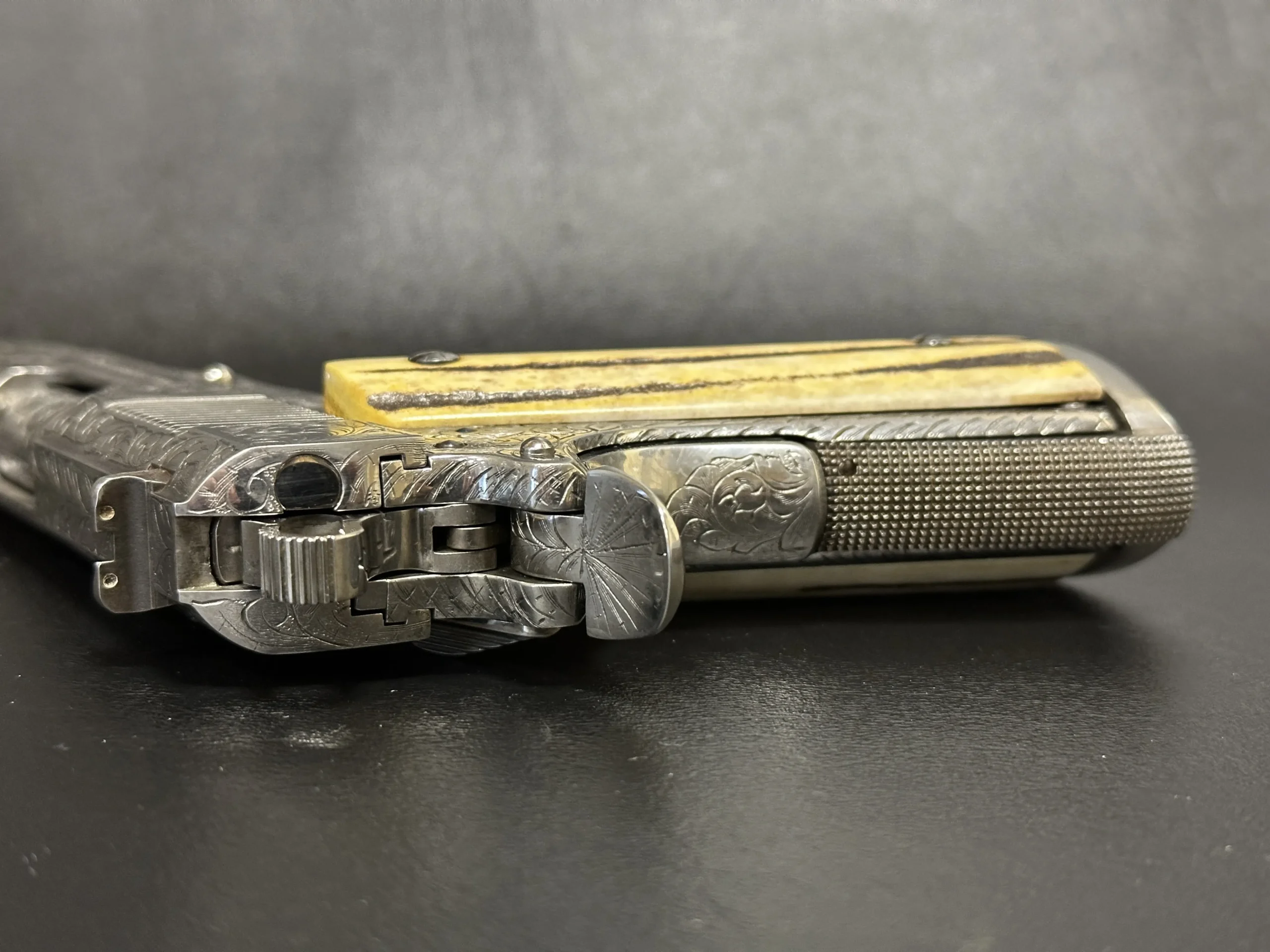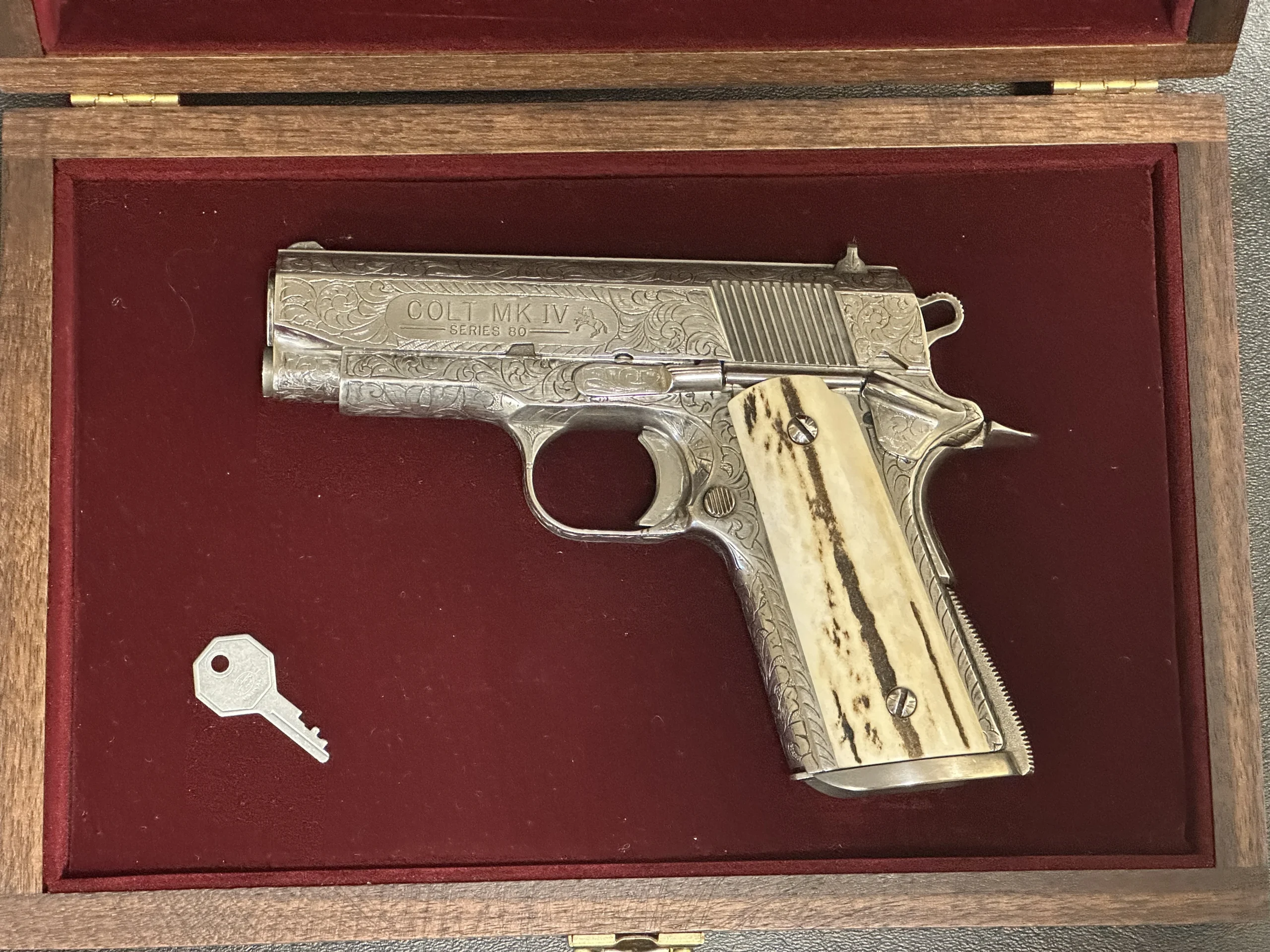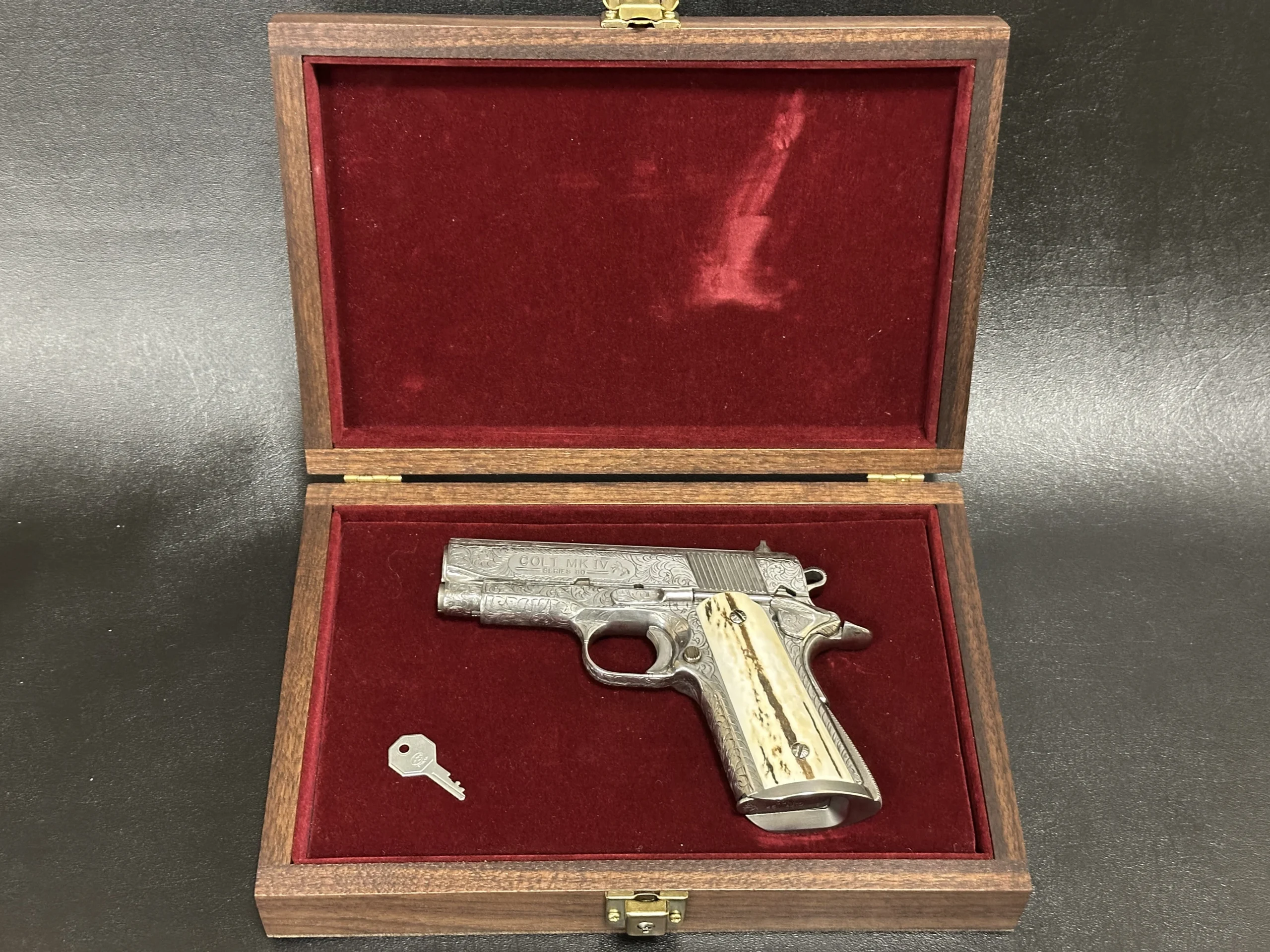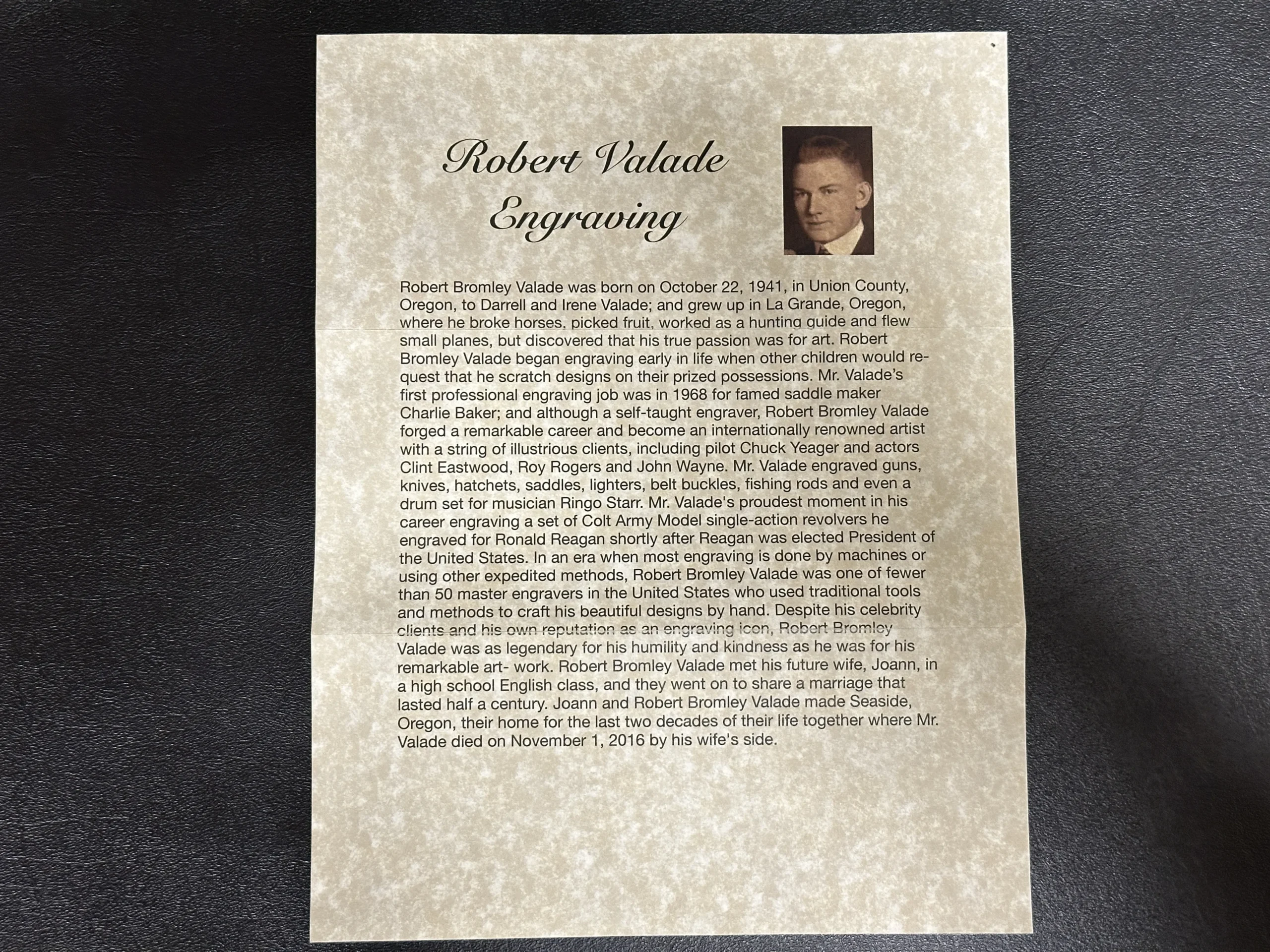 Also included is a biography of Robert Valade, offering additional context on the engraver behind the work. This is a finely detailed Colt Officer’s Model presentation that pairs compact 1911 styling with custom engraving and display appeal.