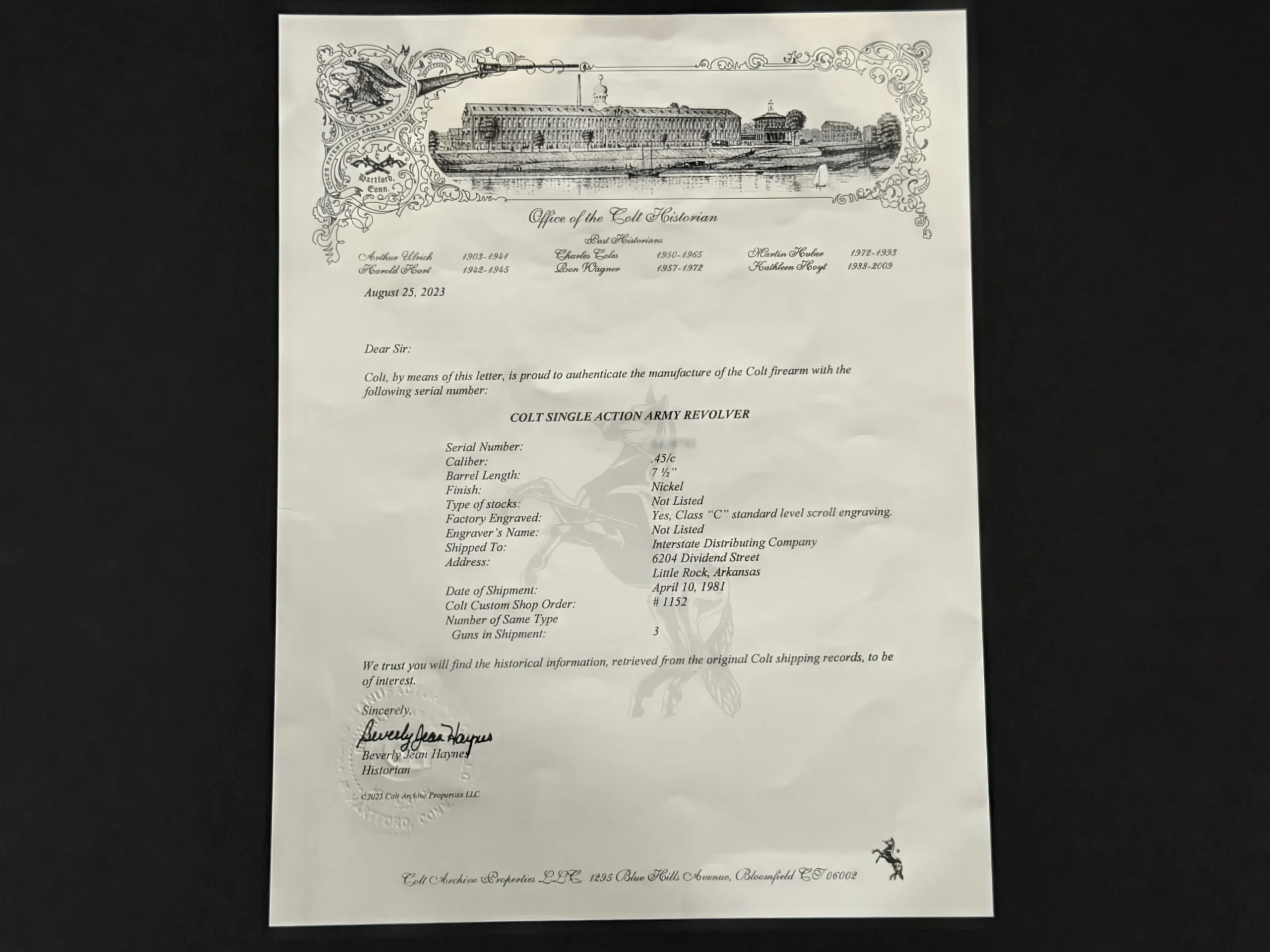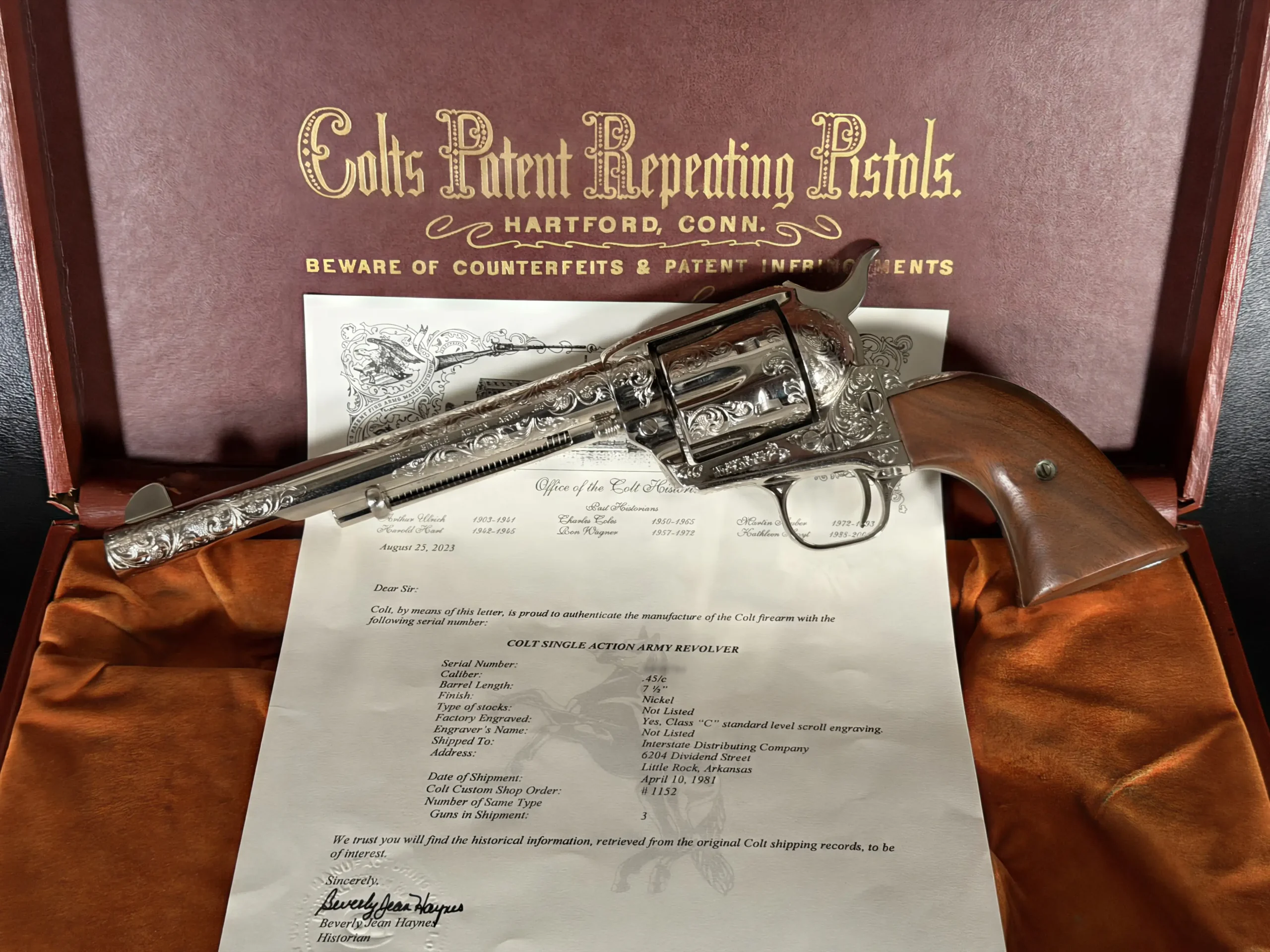 All major components are matching, underscoring the integrity of the revolver as configured. This is a factory-engraved Colt SAA, not a later embellished example, and it remains a strong choice for collectors drawn to original factory presentation and classic Colt workmanship.