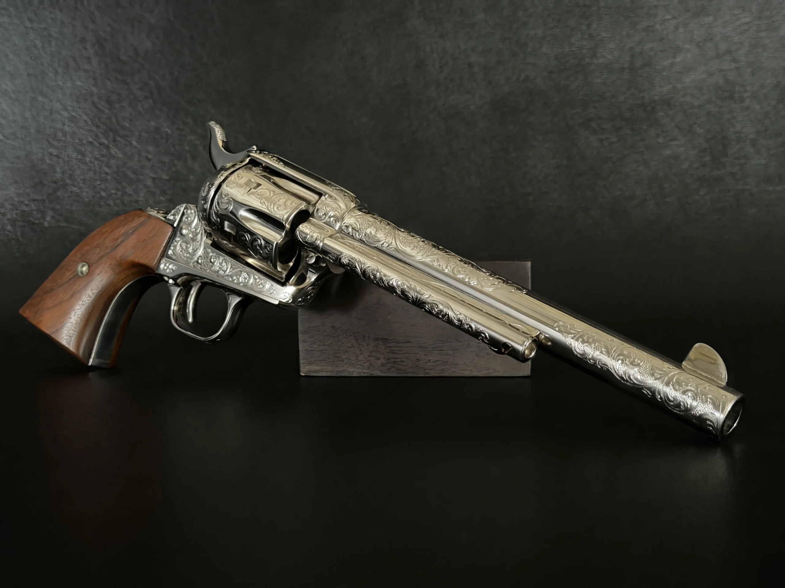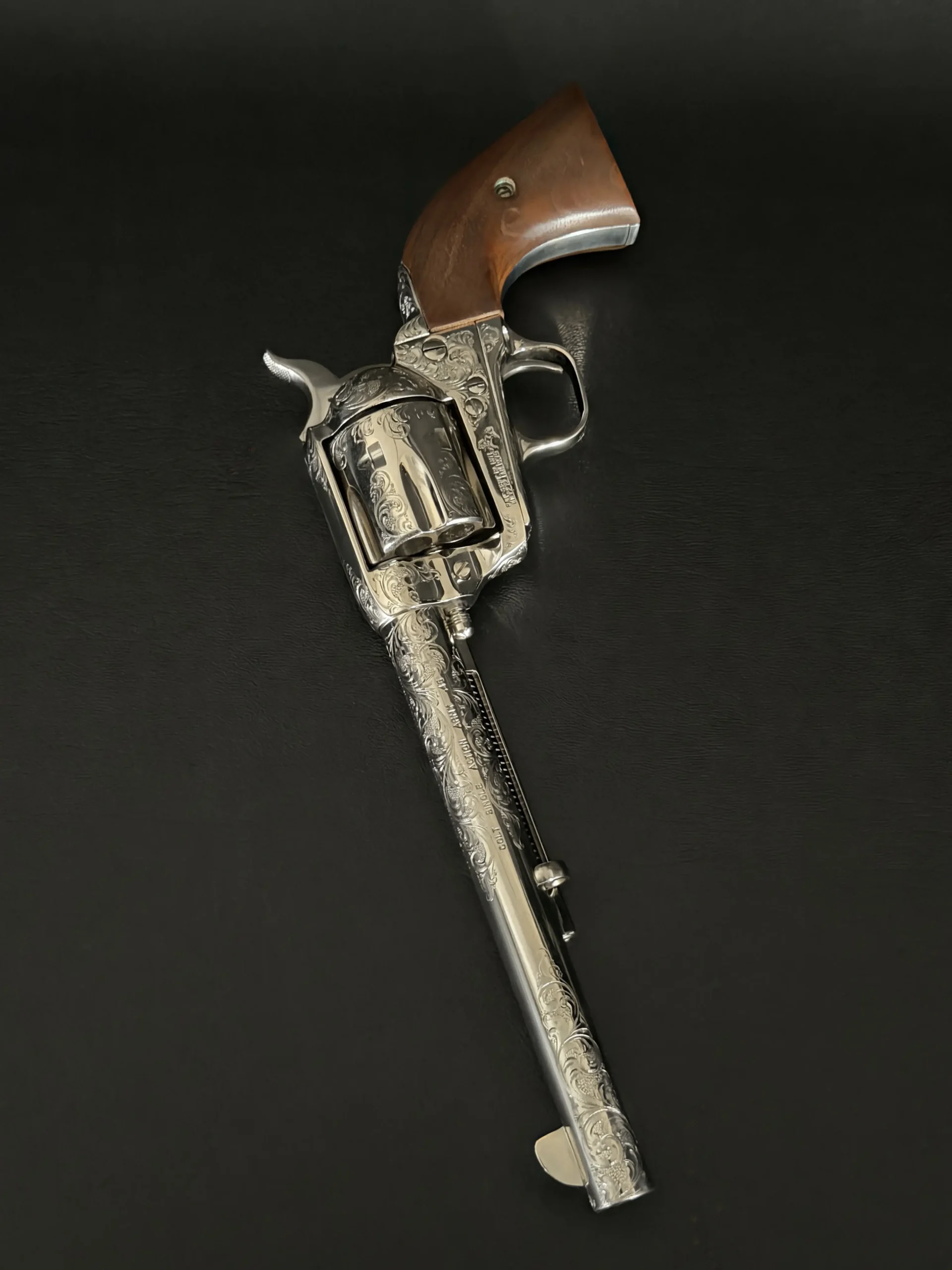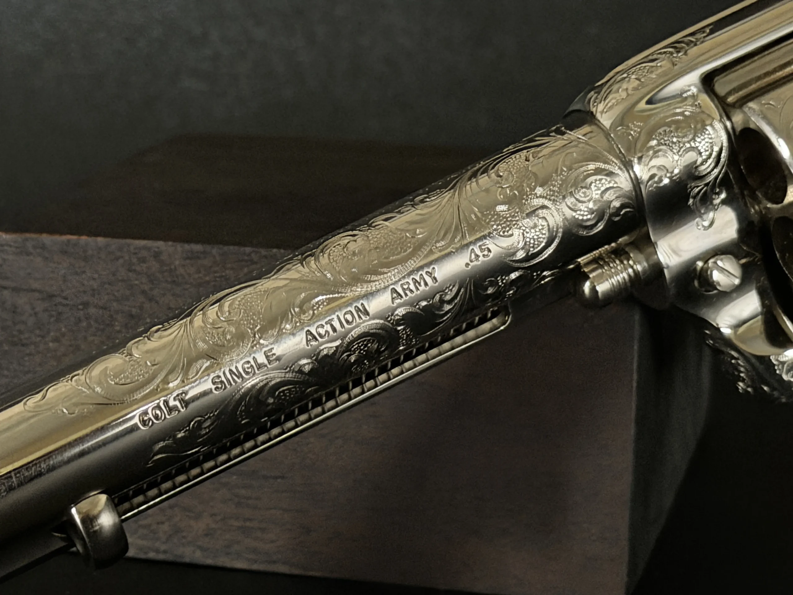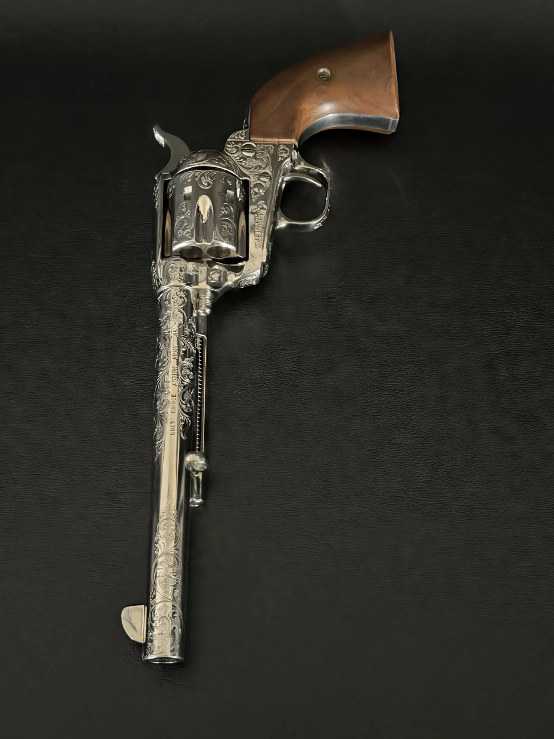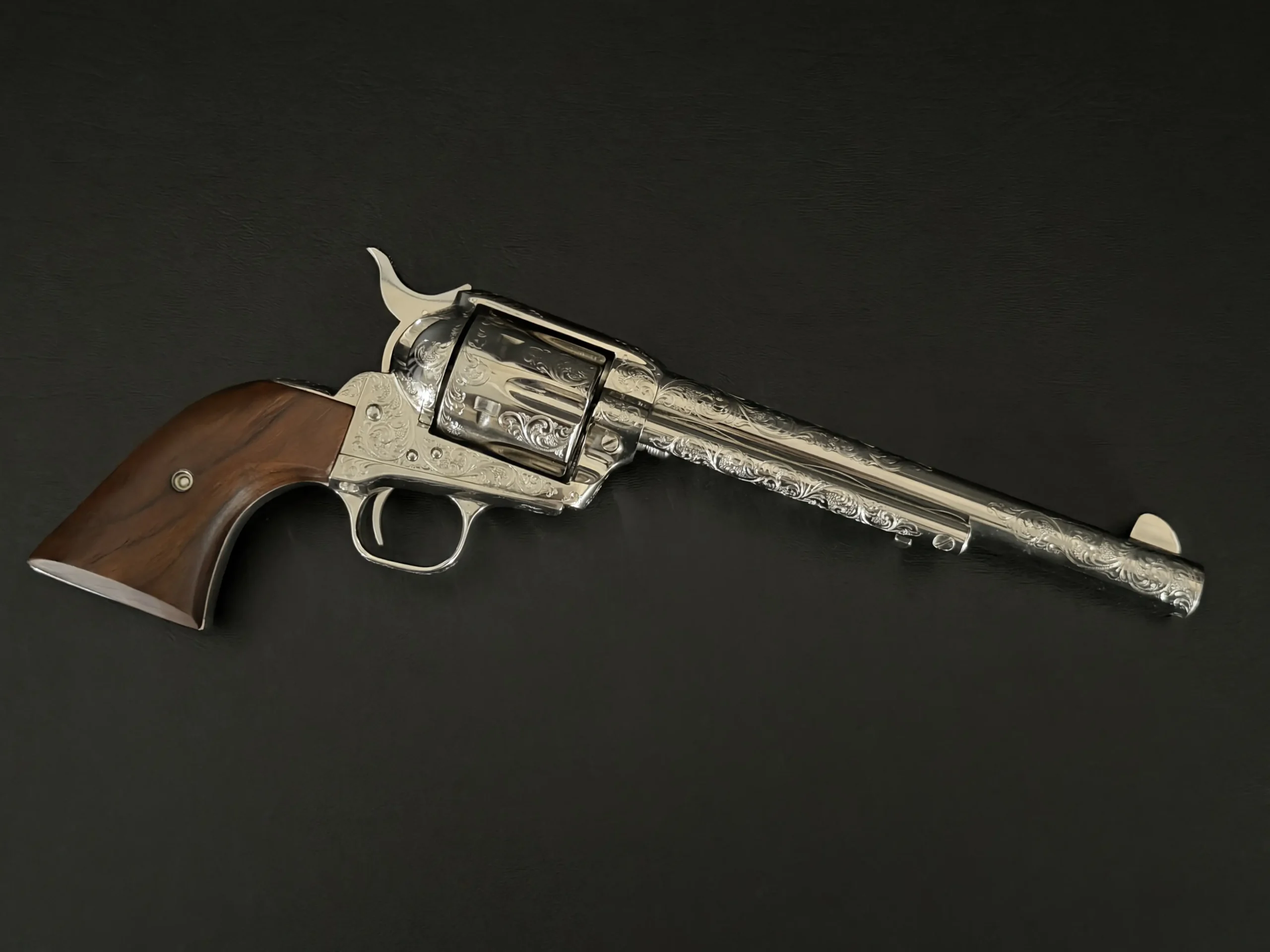 The engraving is executed in a traditional factory style, with even coverage that complements the revolver’s polished finish. Smooth walnut grips complete the profile, preserving the familiar lines of the Single Action Army while adding warmth and contrast to the nickel surface.