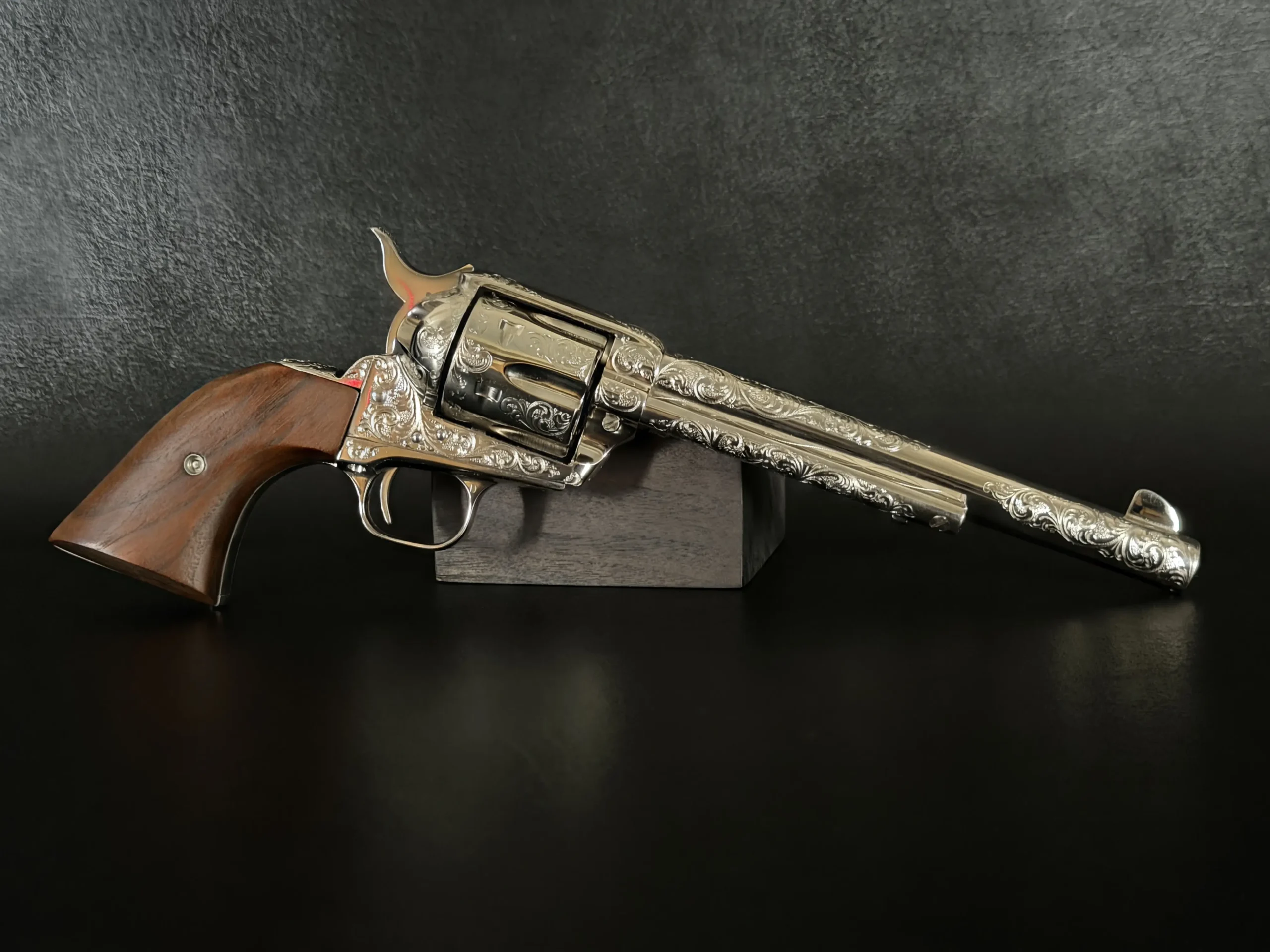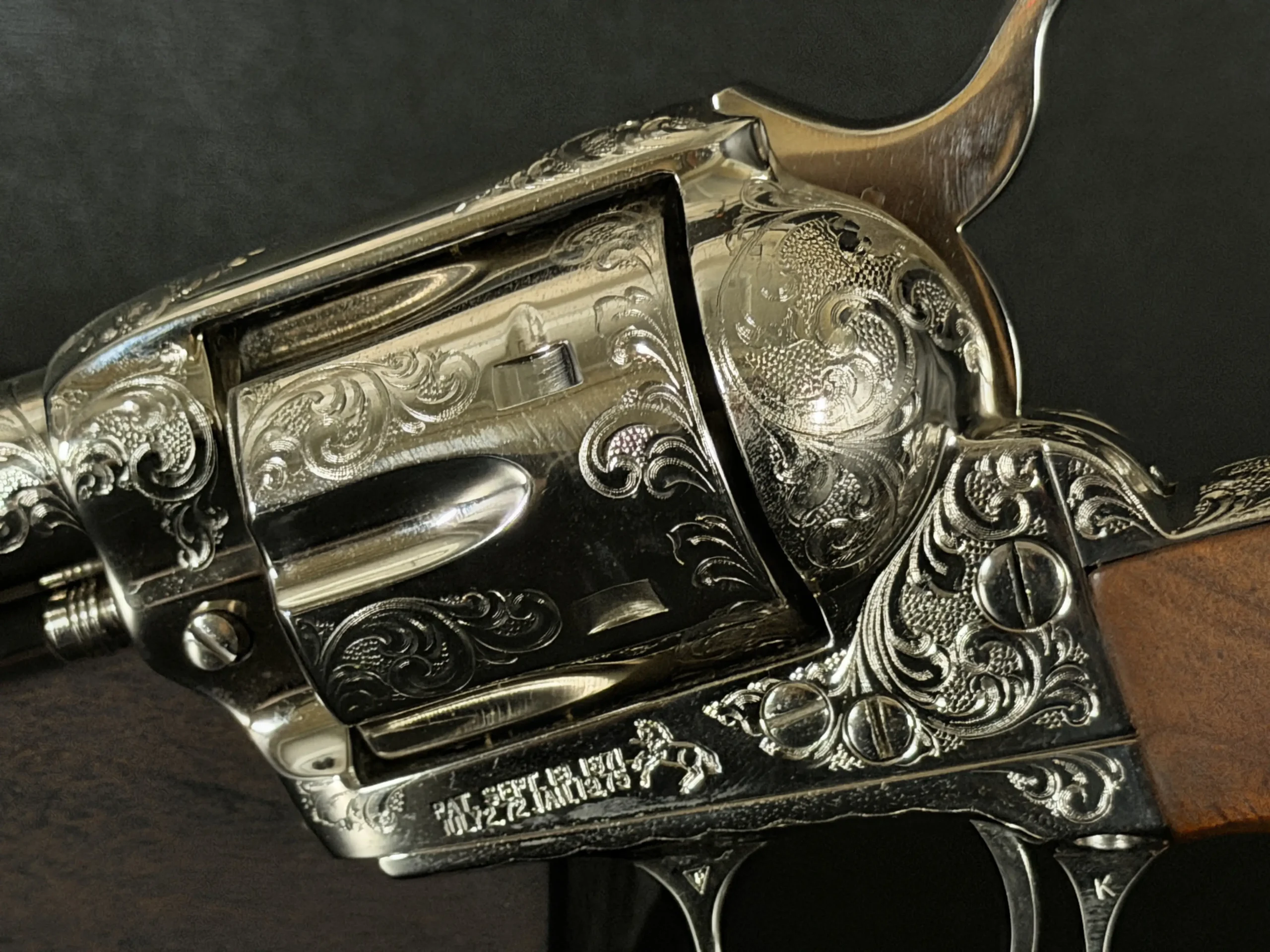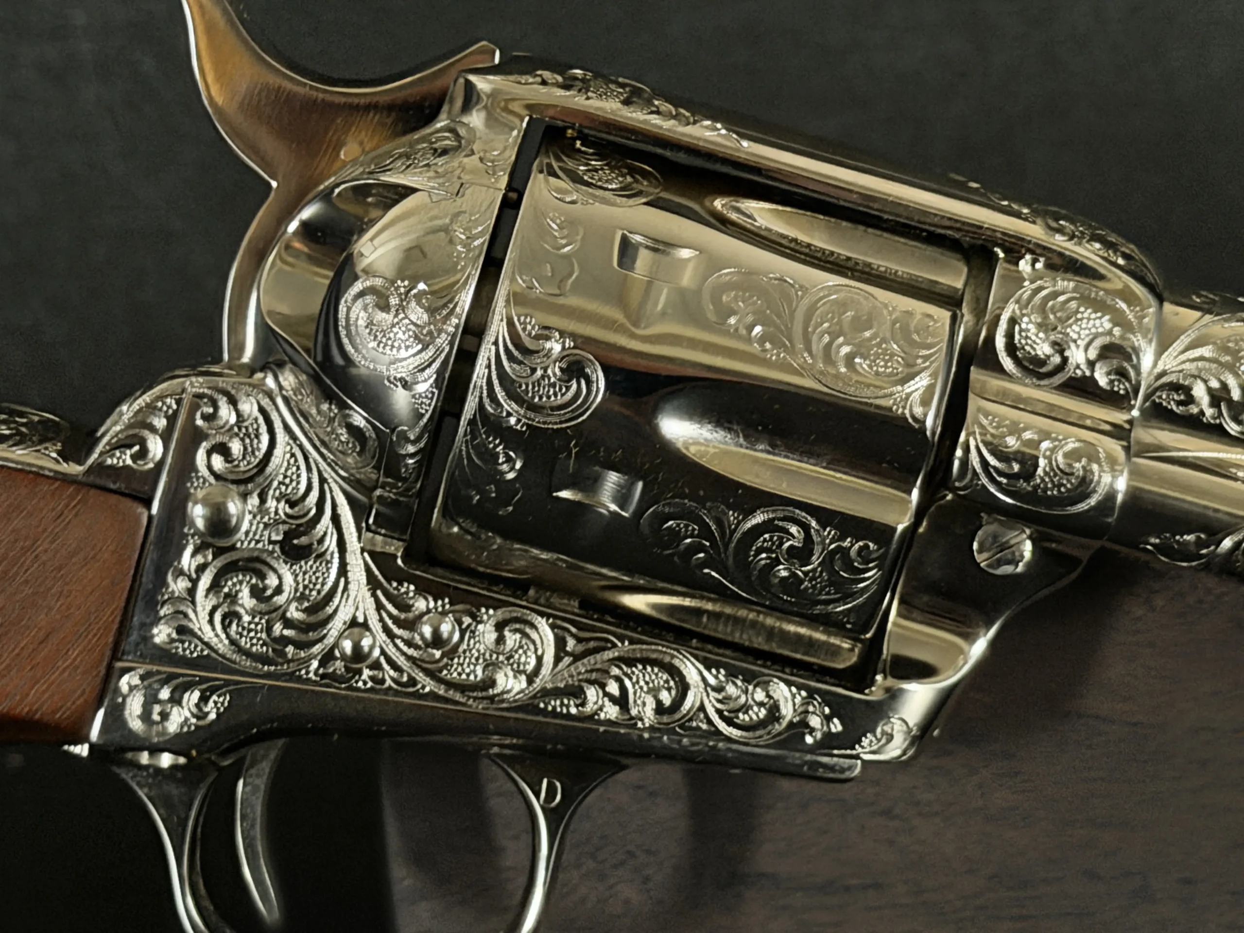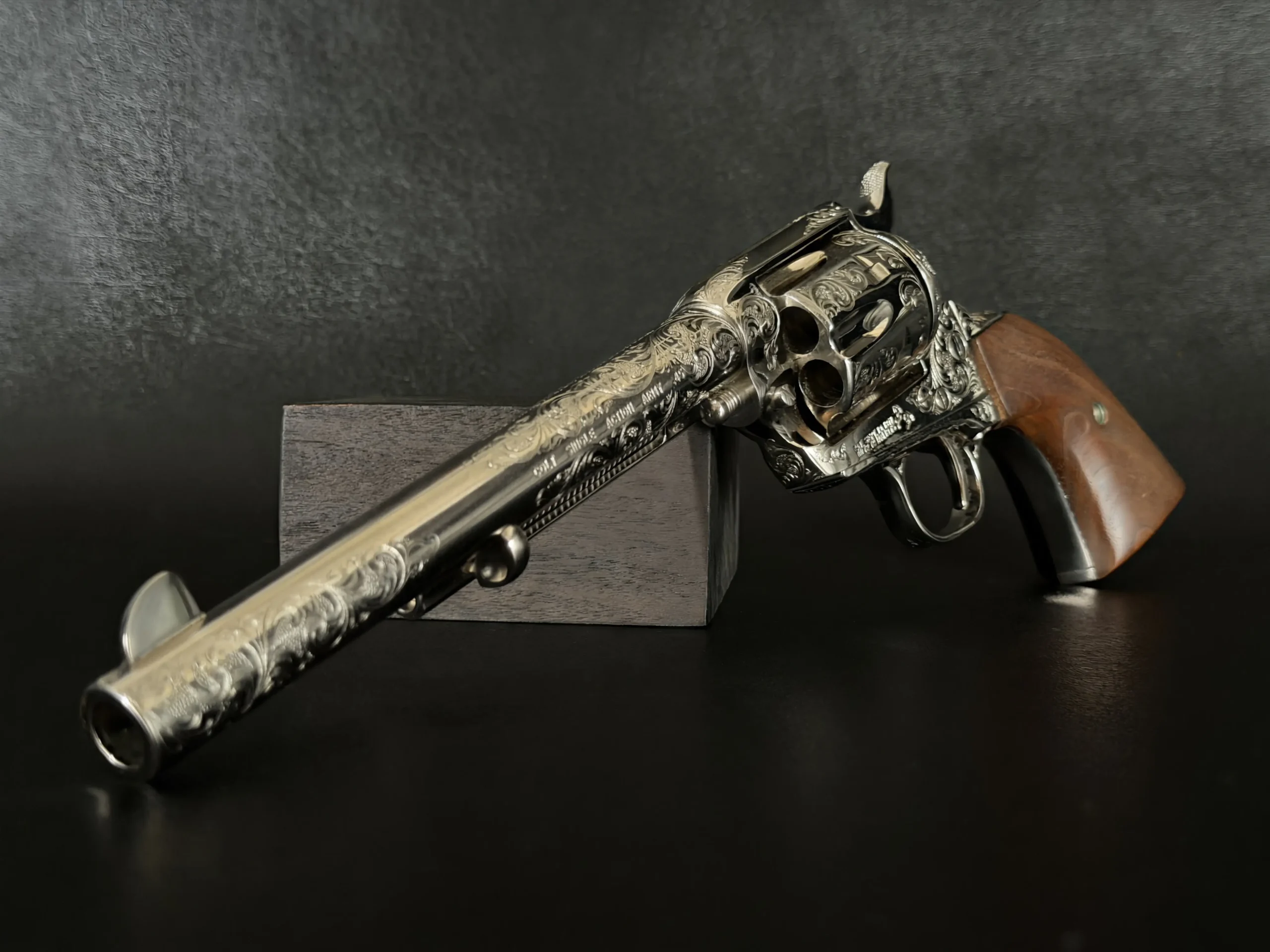 The engraving is executed in a traditional factory style, with even coverage that complements the revolver’s polished finish. Smooth walnut grips complete the profile, preserving the familiar lines of the Single Action Army while adding warmth and contrast to the nickel surface.