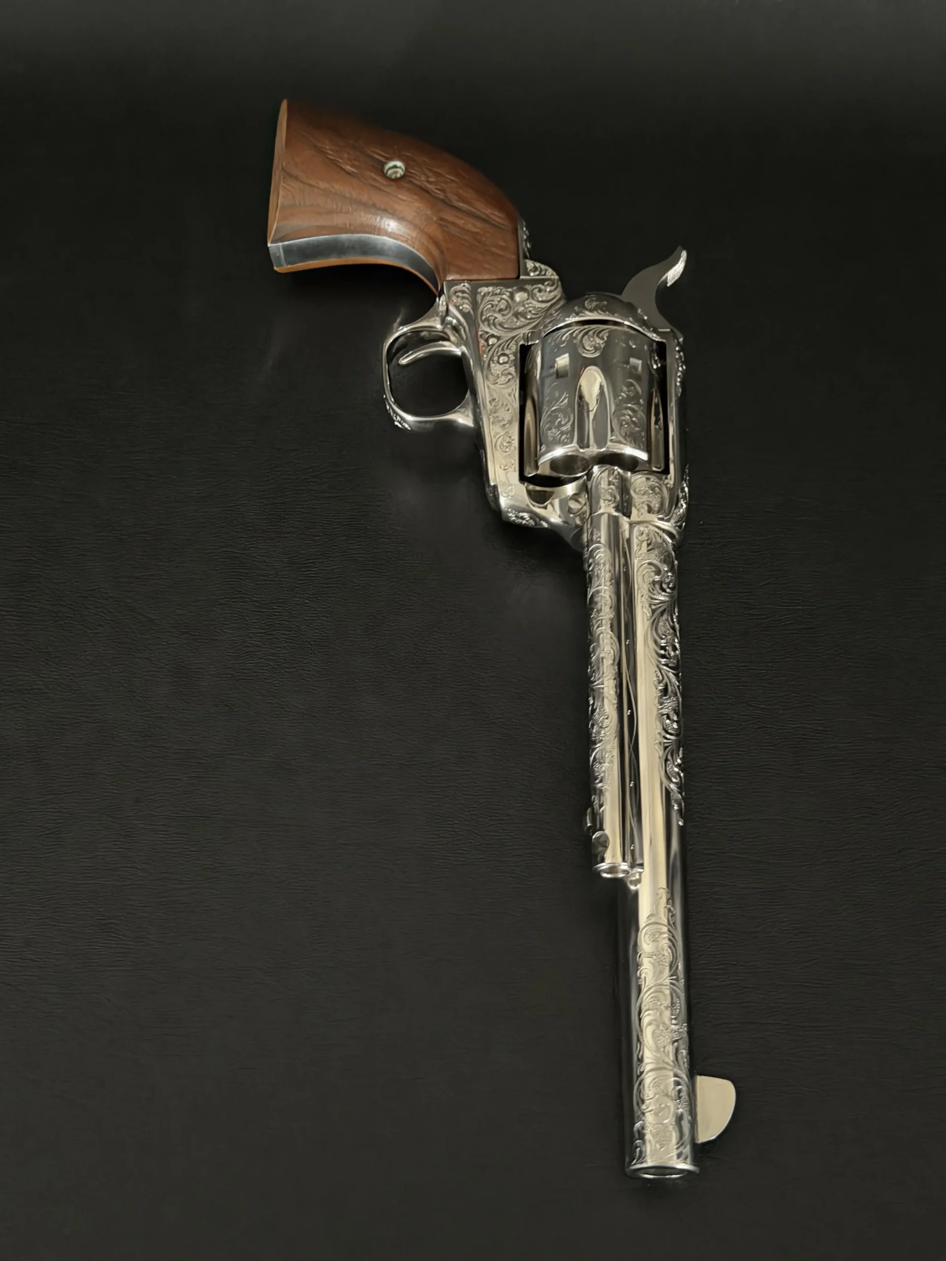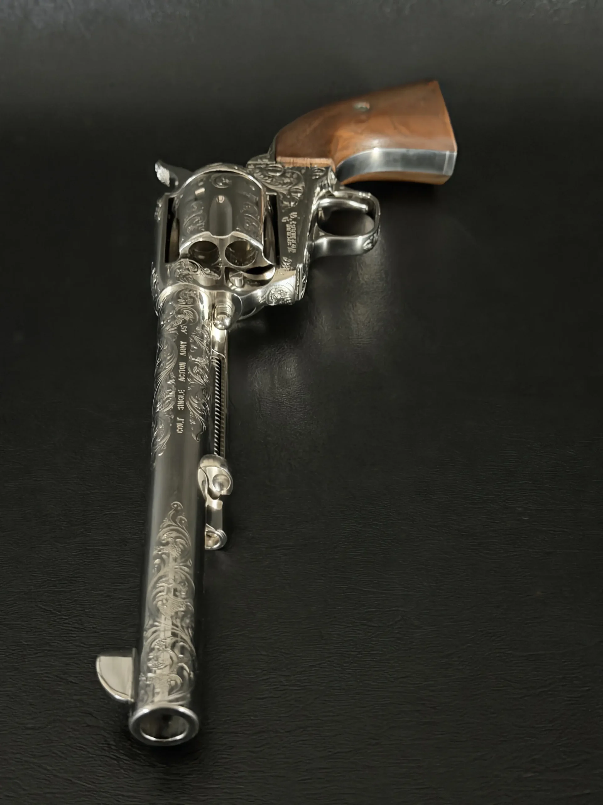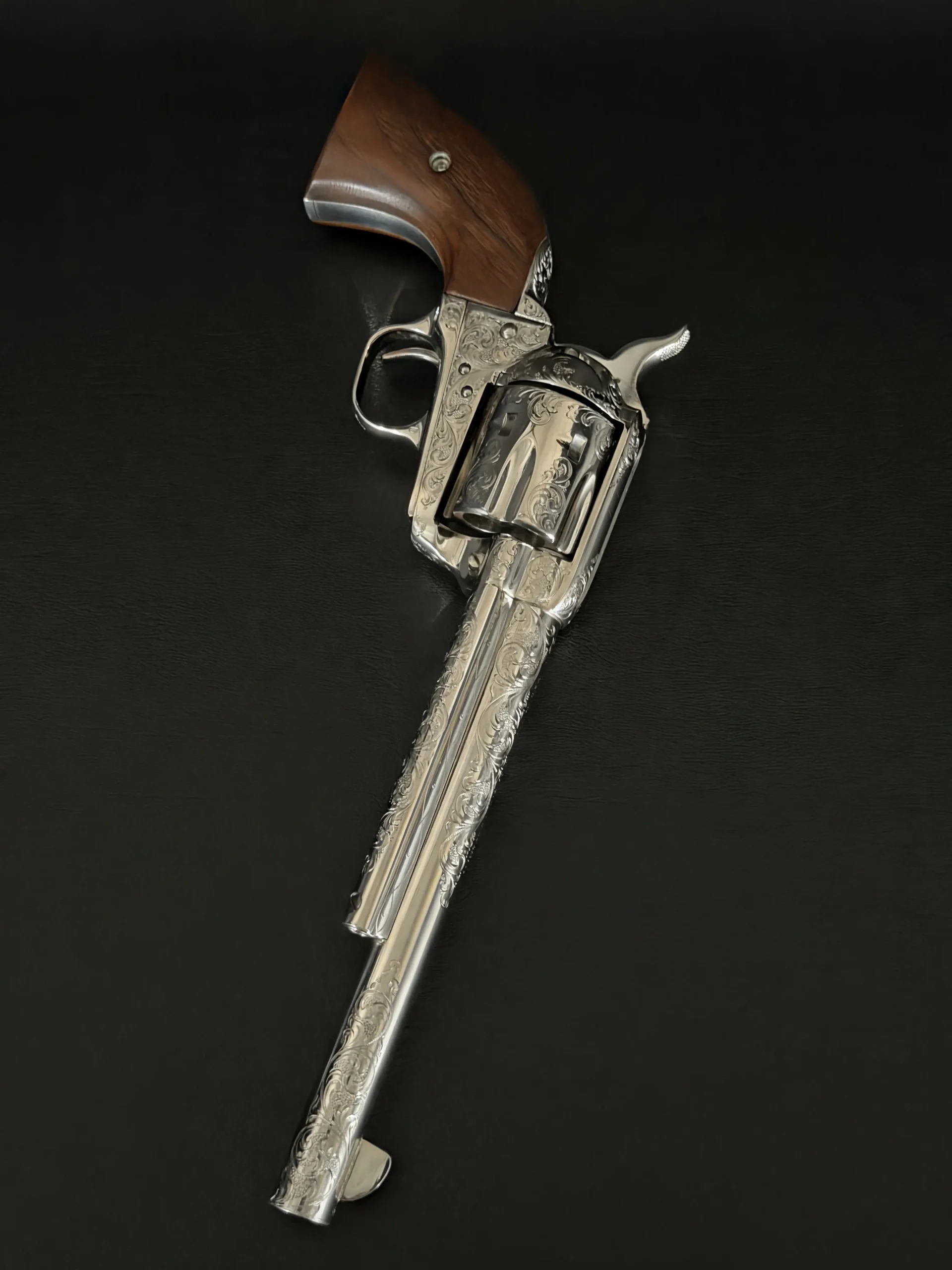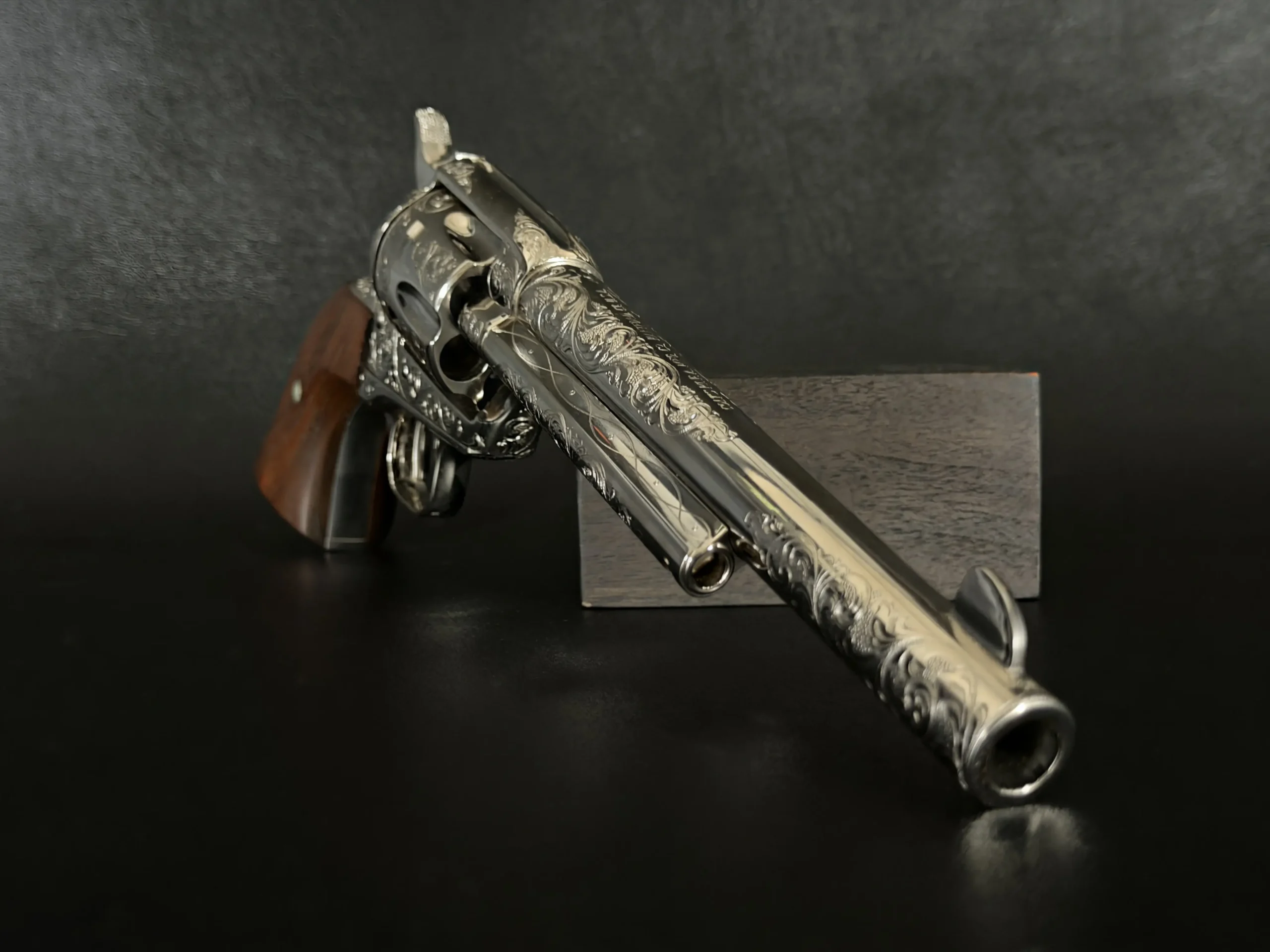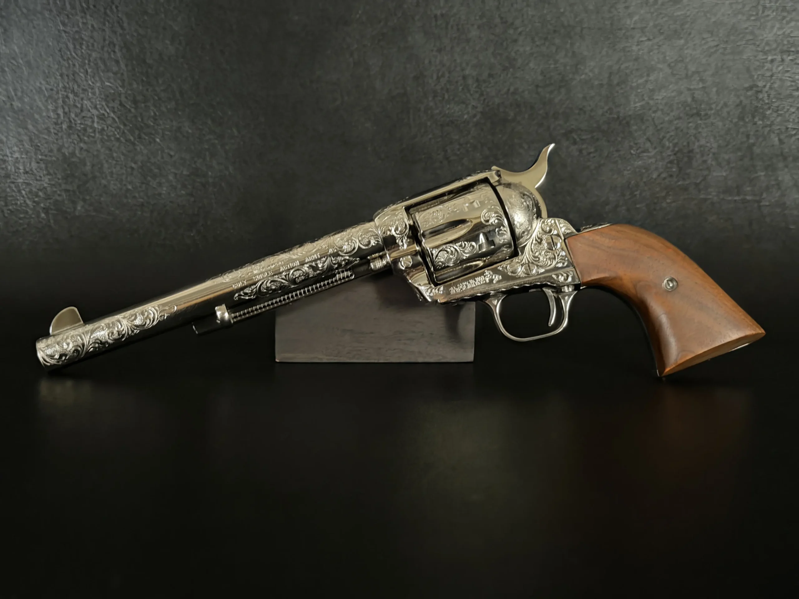 The engraving is executed in a traditional factory style, with even coverage that complements the revolver’s polished finish. Smooth walnut grips complete the profile, preserving the familiar lines of the Single Action Army while adding warmth and contrast to the nickel surface.