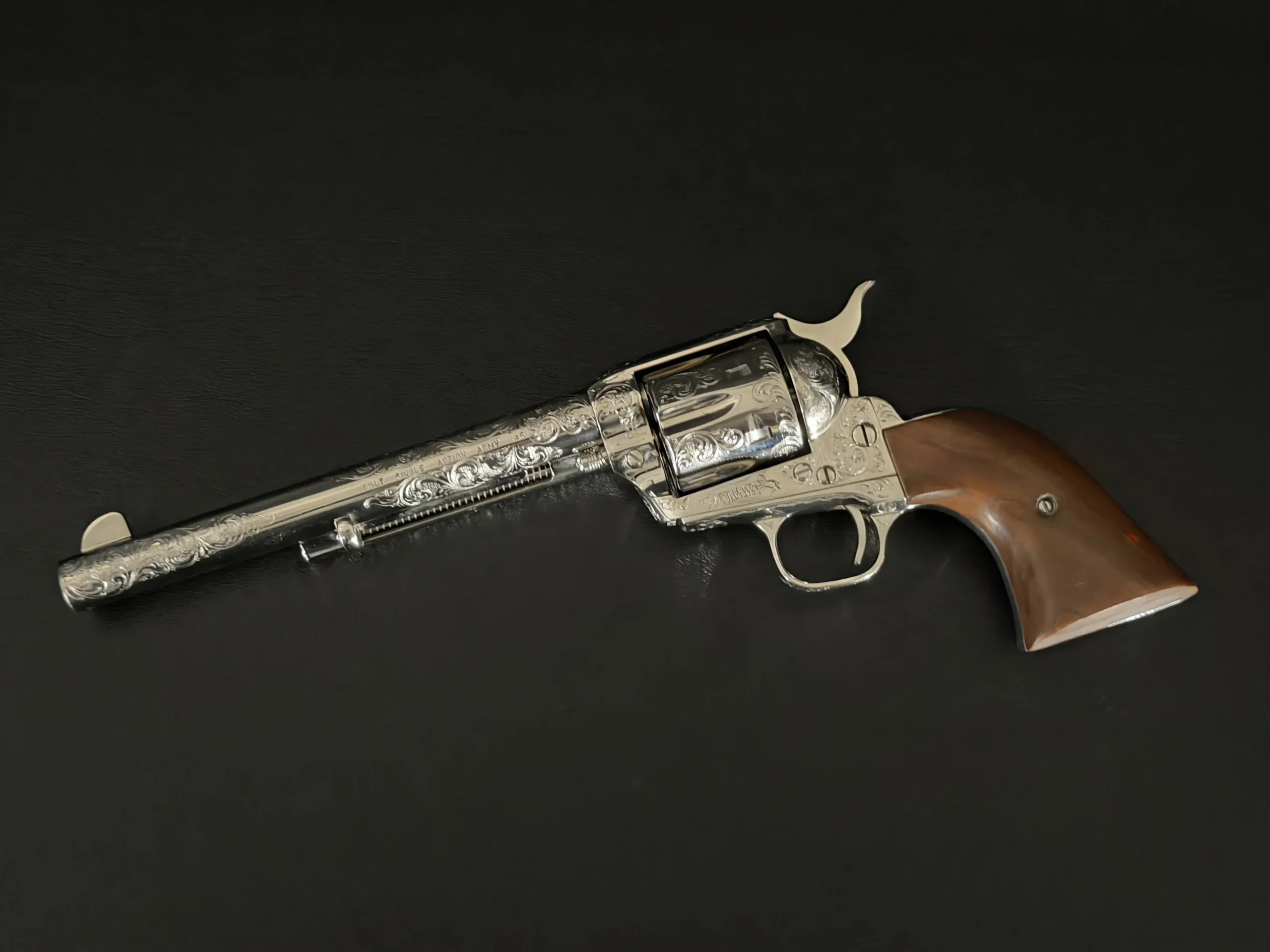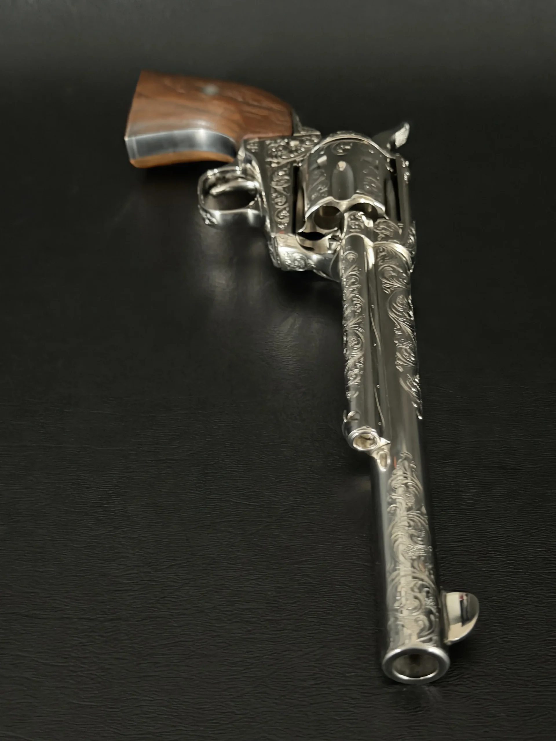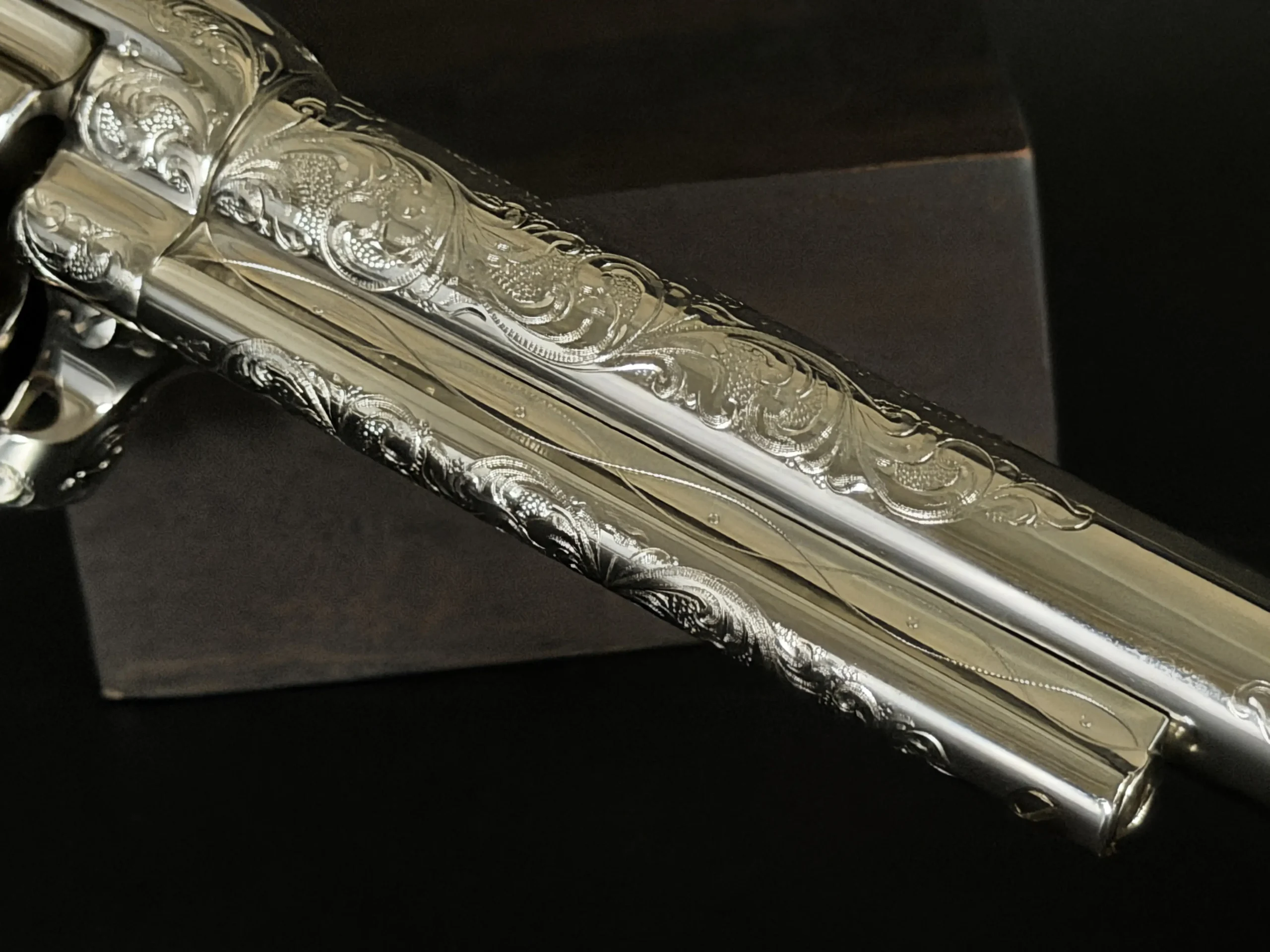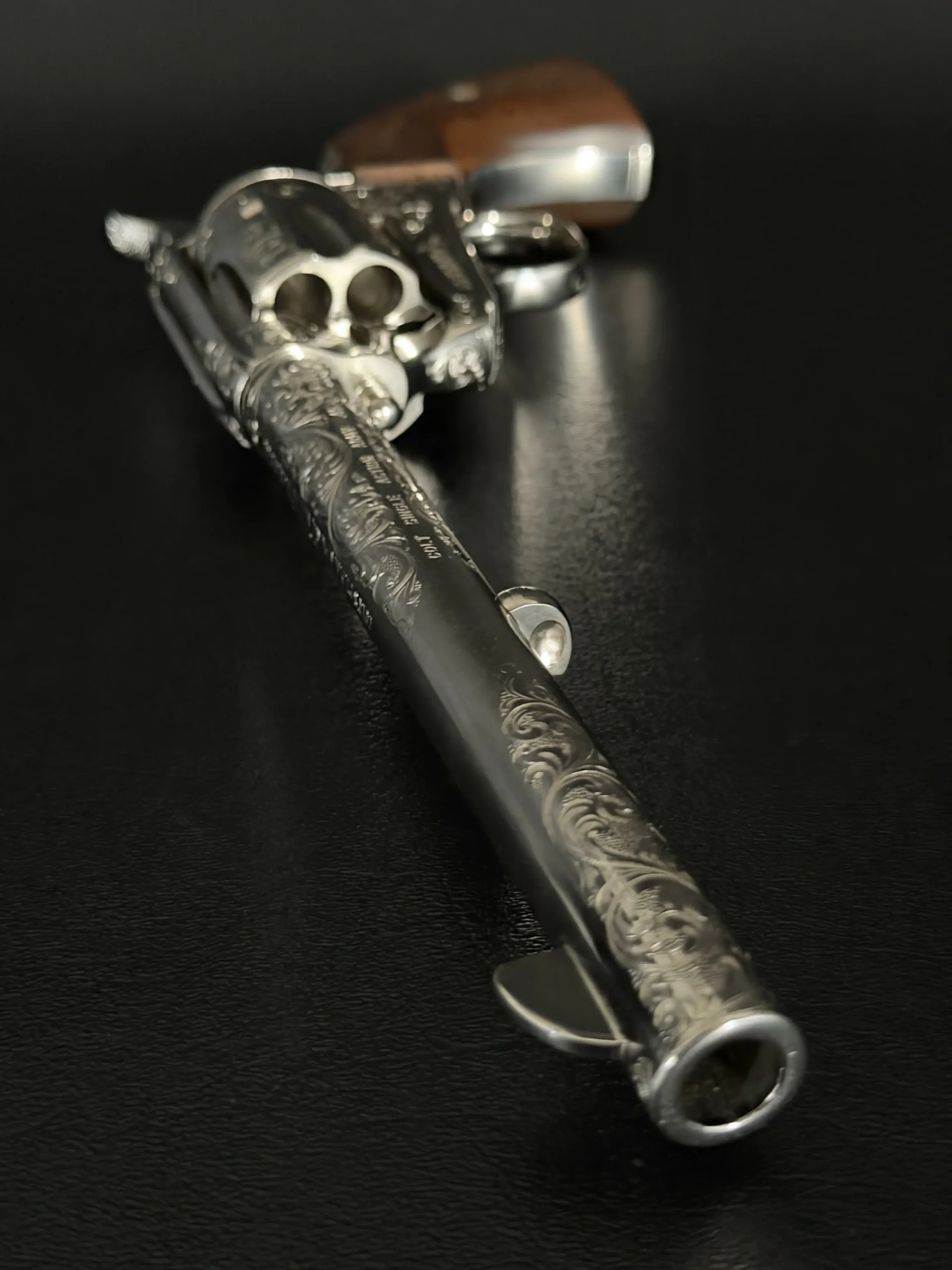 The engraving is executed in a traditional factory style, with even coverage that complements the revolver’s polished finish. Smooth walnut grips complete the profile, preserving the familiar lines of the Single Action Army while adding warmth and contrast to the nickel surface.