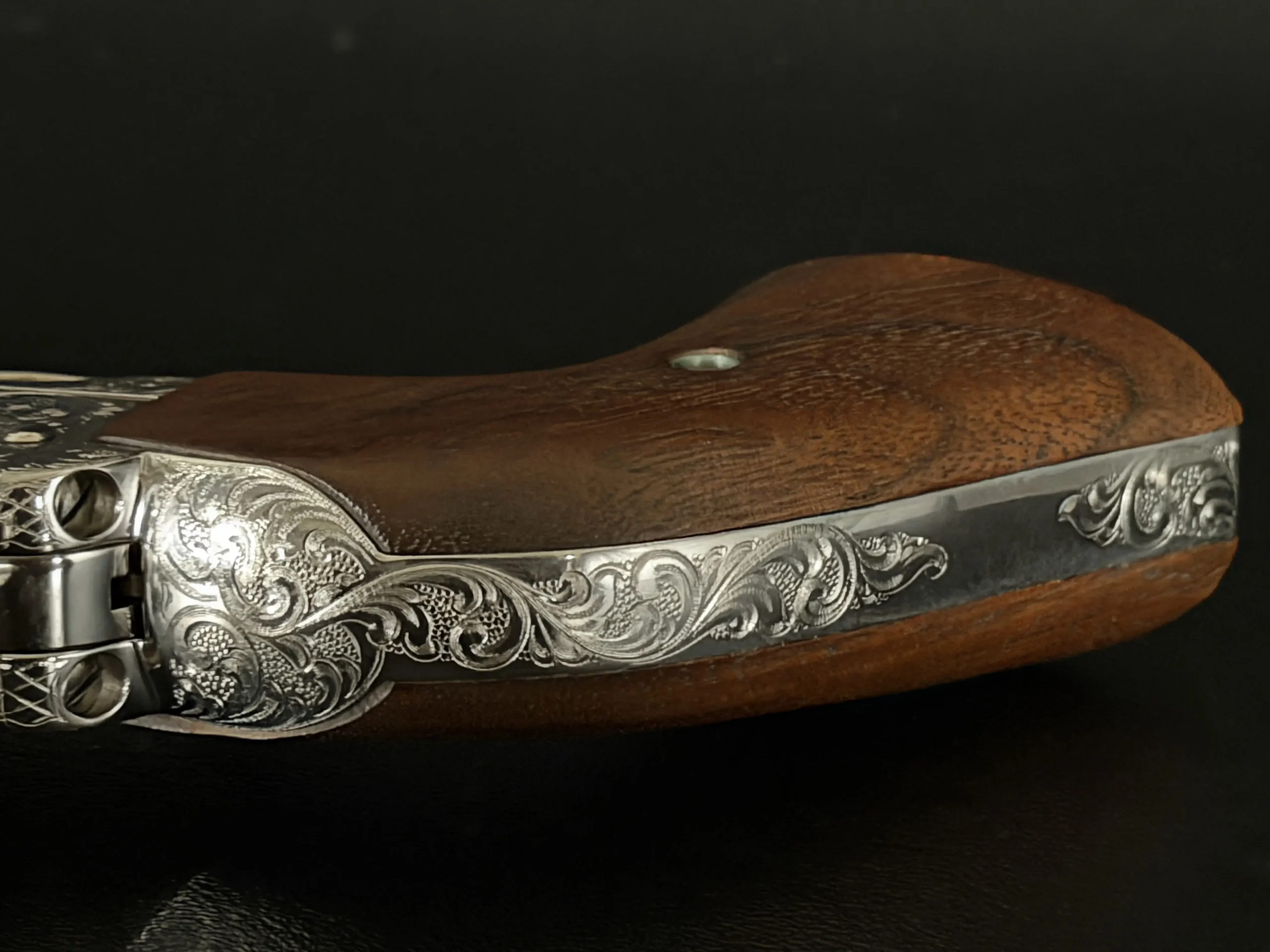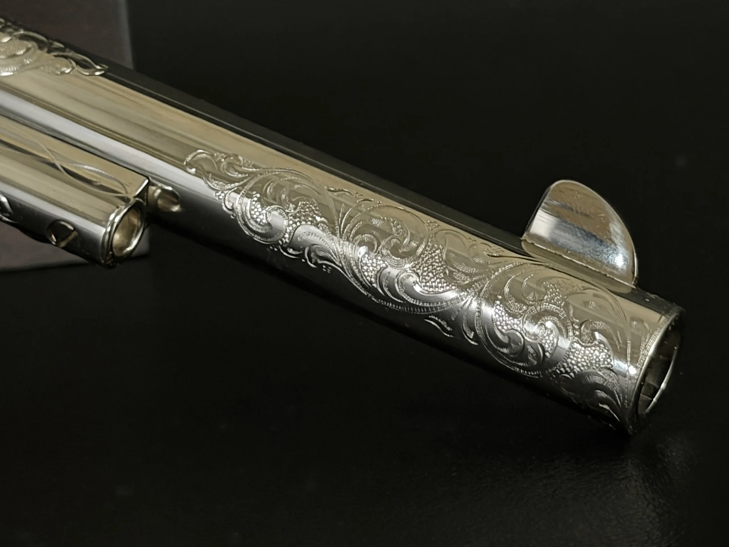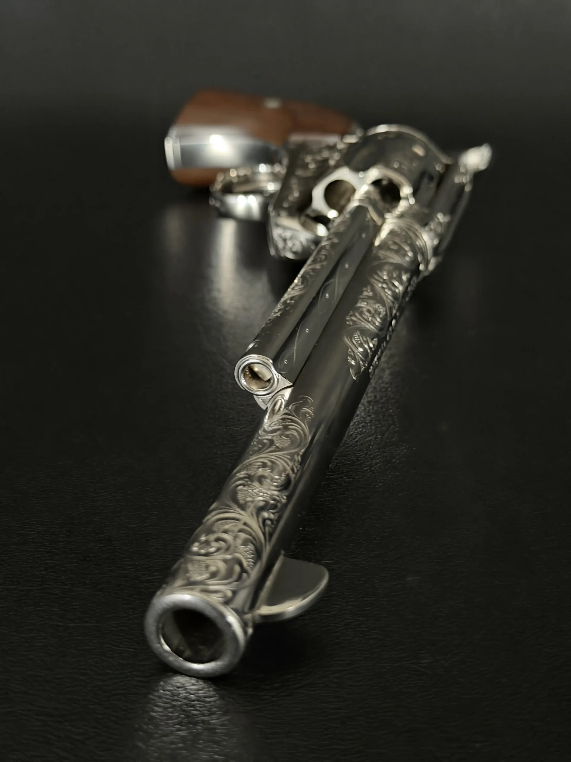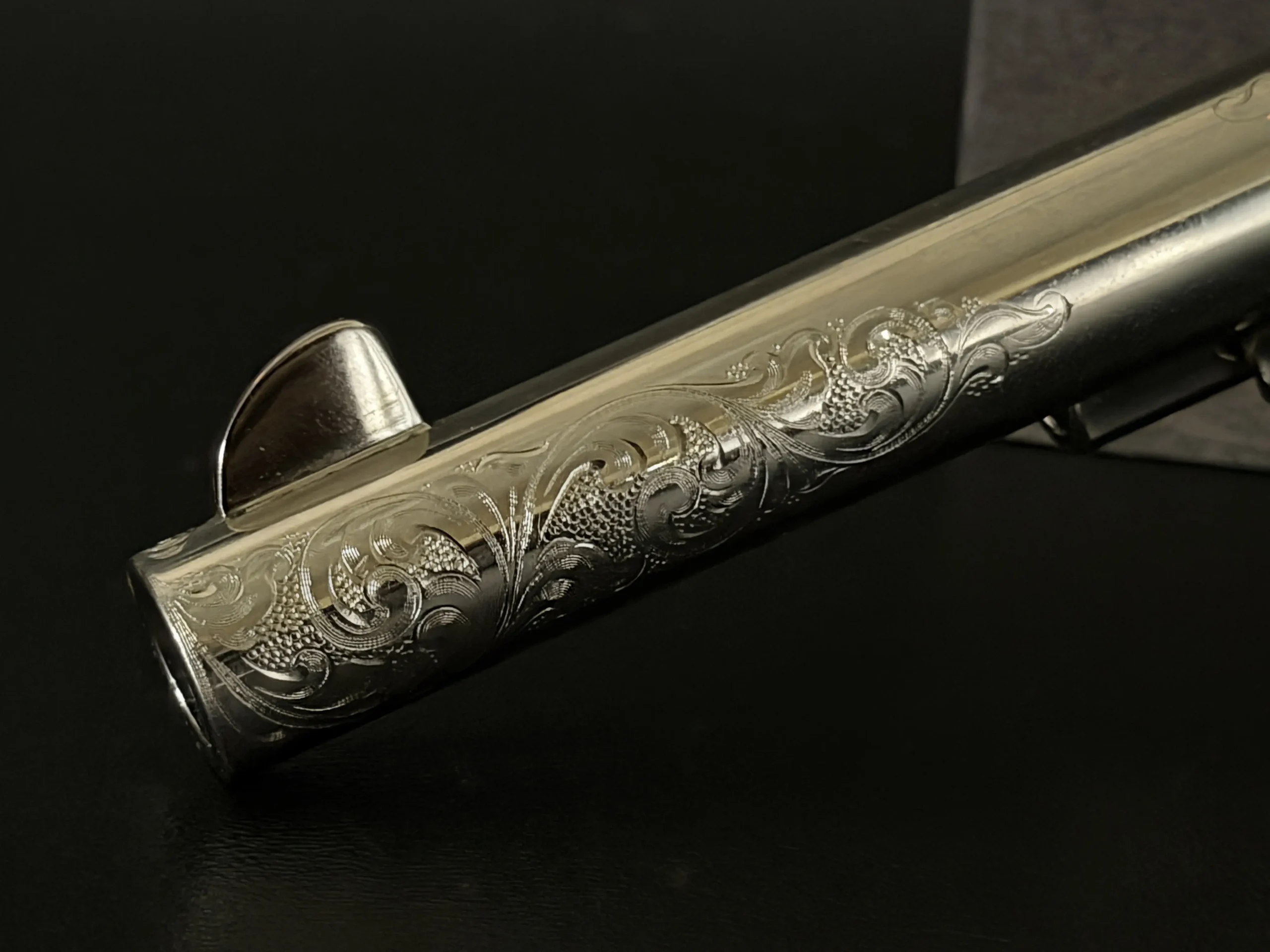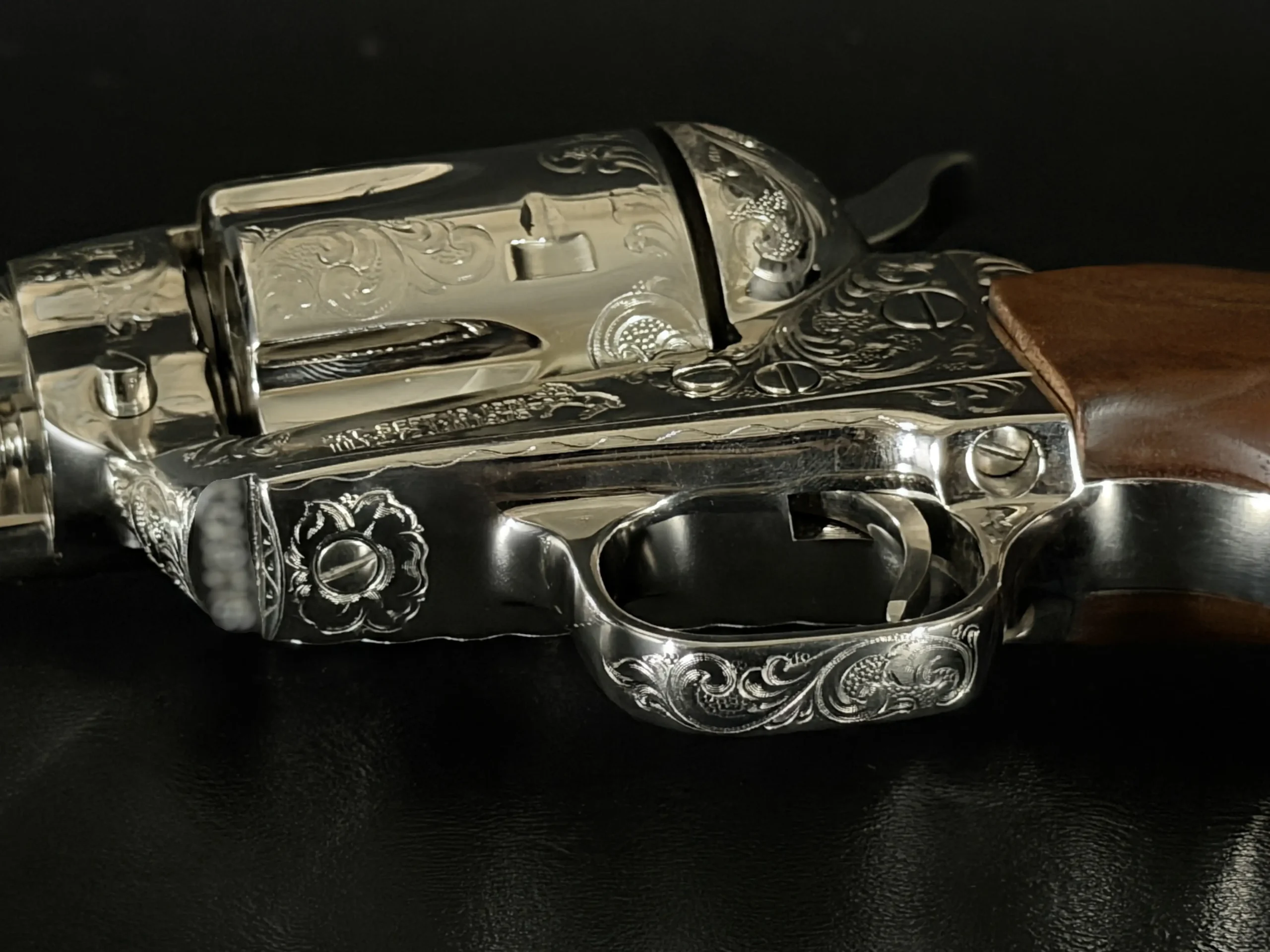 The engraving is executed in a traditional factory style, with even coverage that complements the revolver’s polished finish. Smooth walnut grips complete the profile, preserving the familiar lines of the Single Action Army while adding warmth and contrast to the nickel surface.
