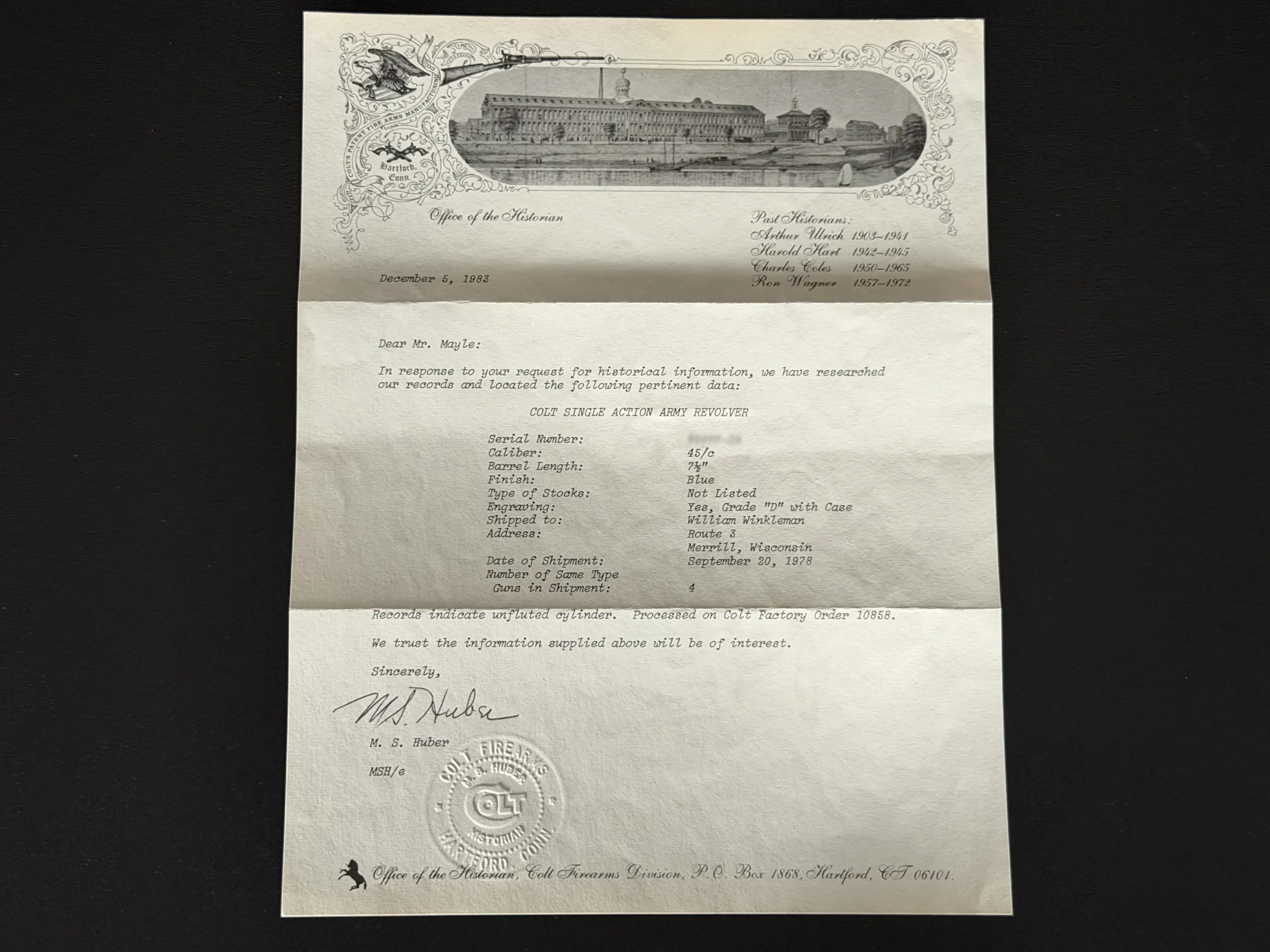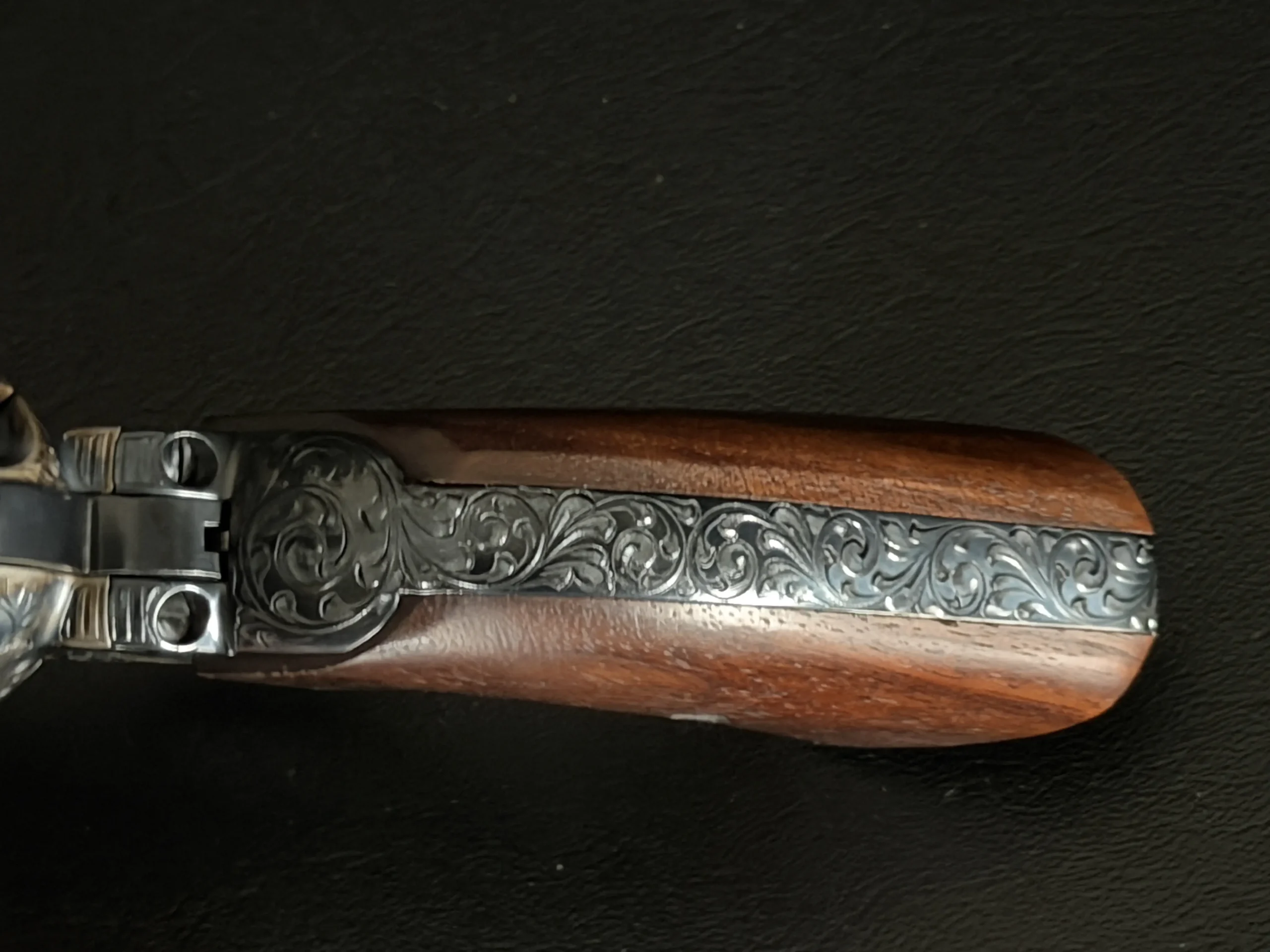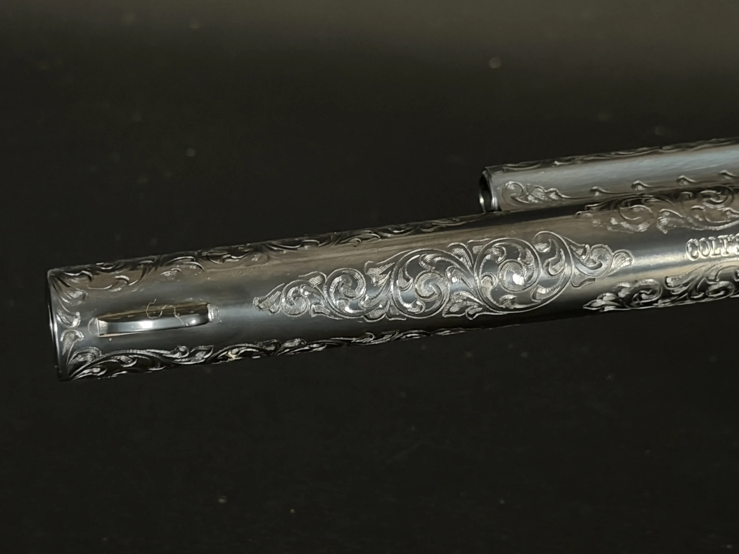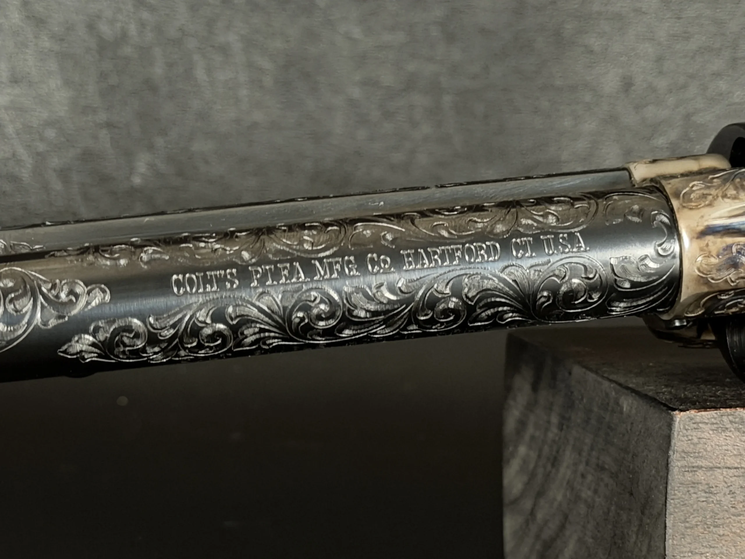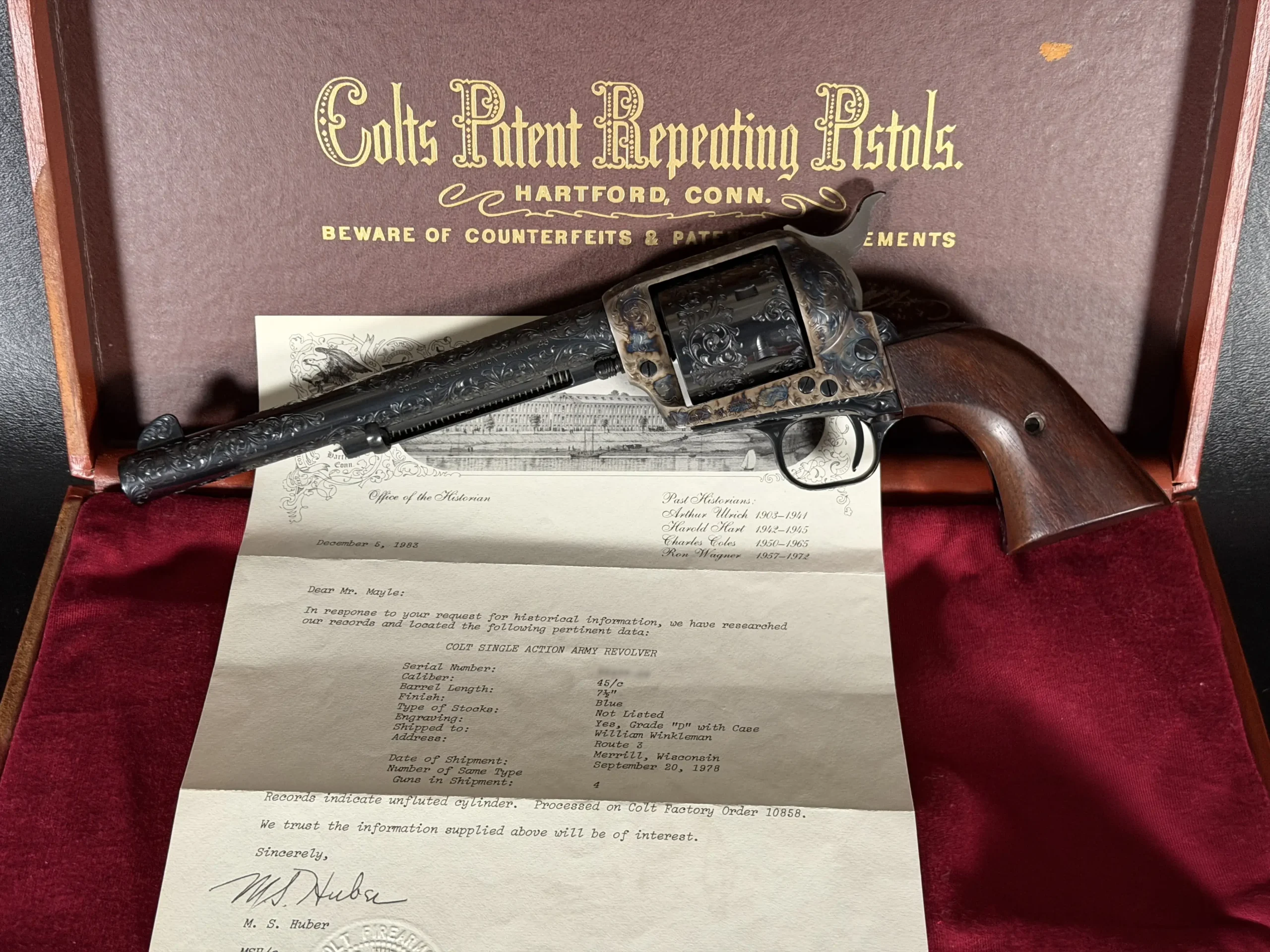 Factory-matched major components and accompanying factory documentation further support the integrated character of this revolver. This Class “D” example reflects Colt’s factory engraving program at a notably high level, combining craftsmanship, finish detail, and strong visual presence in a single package.