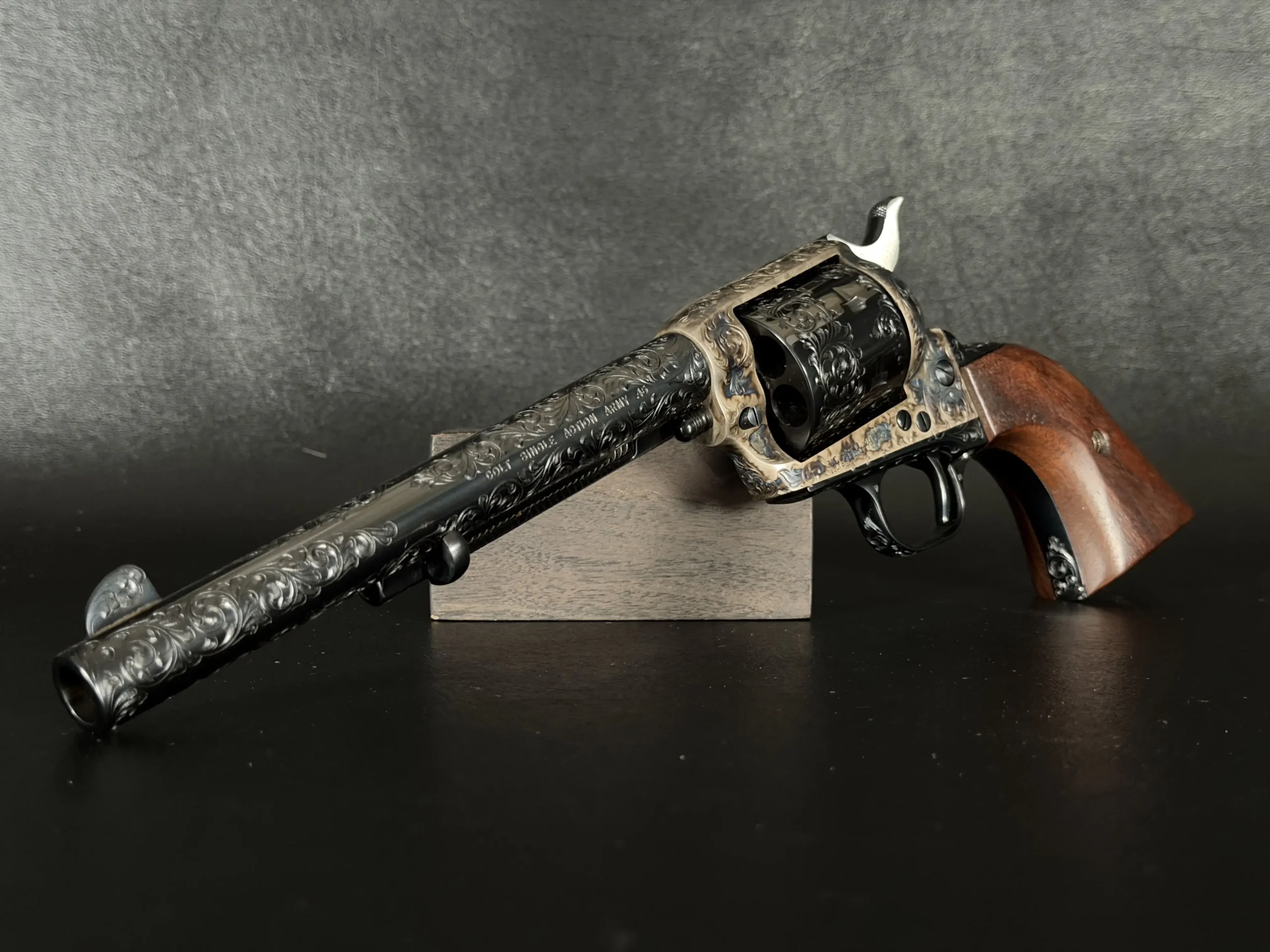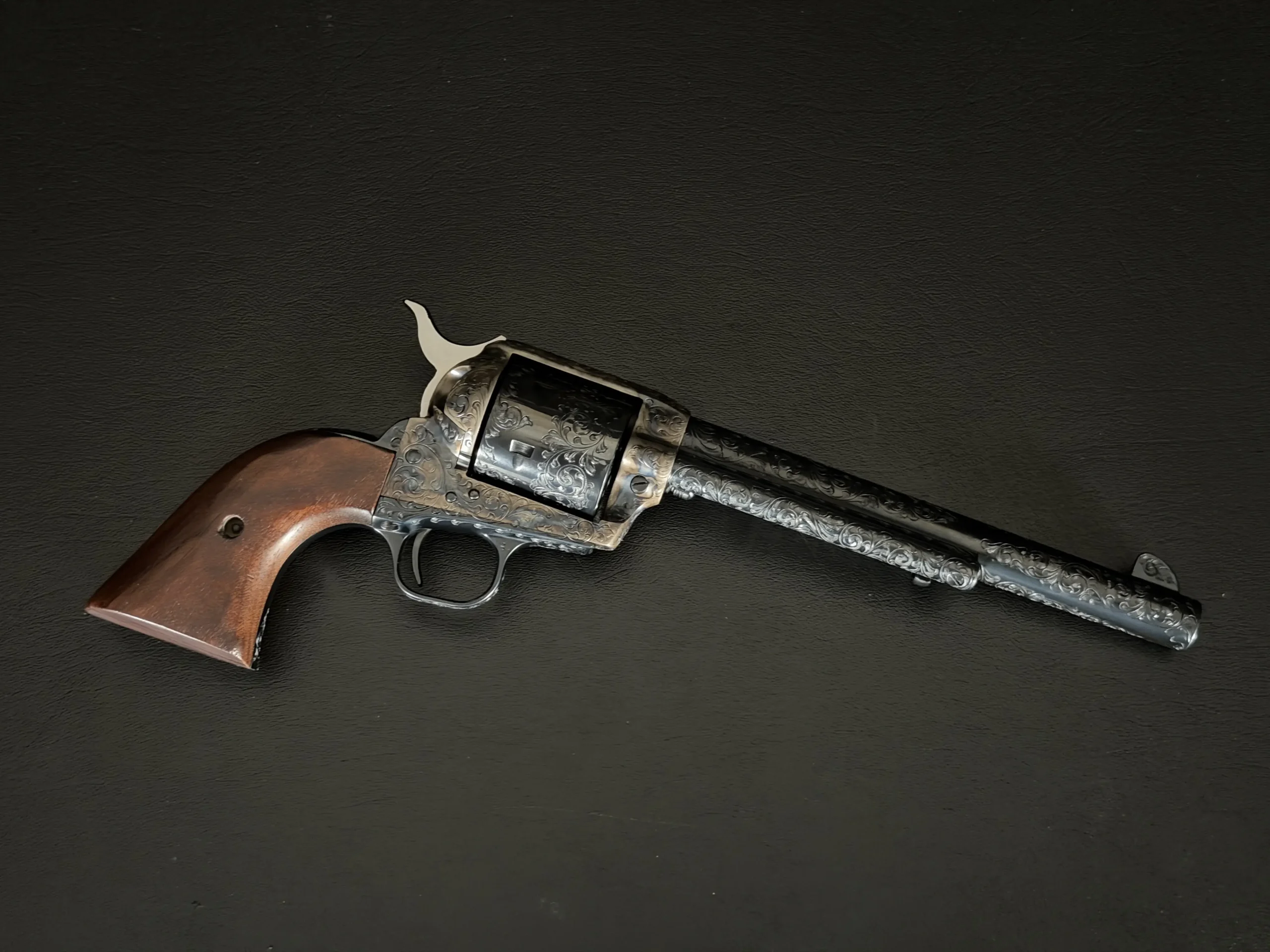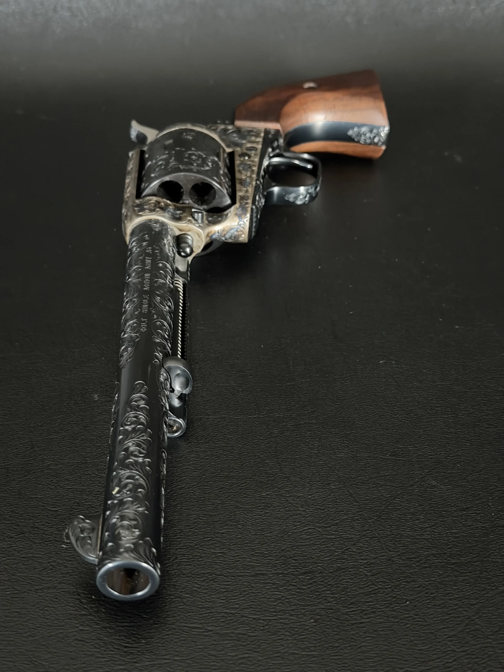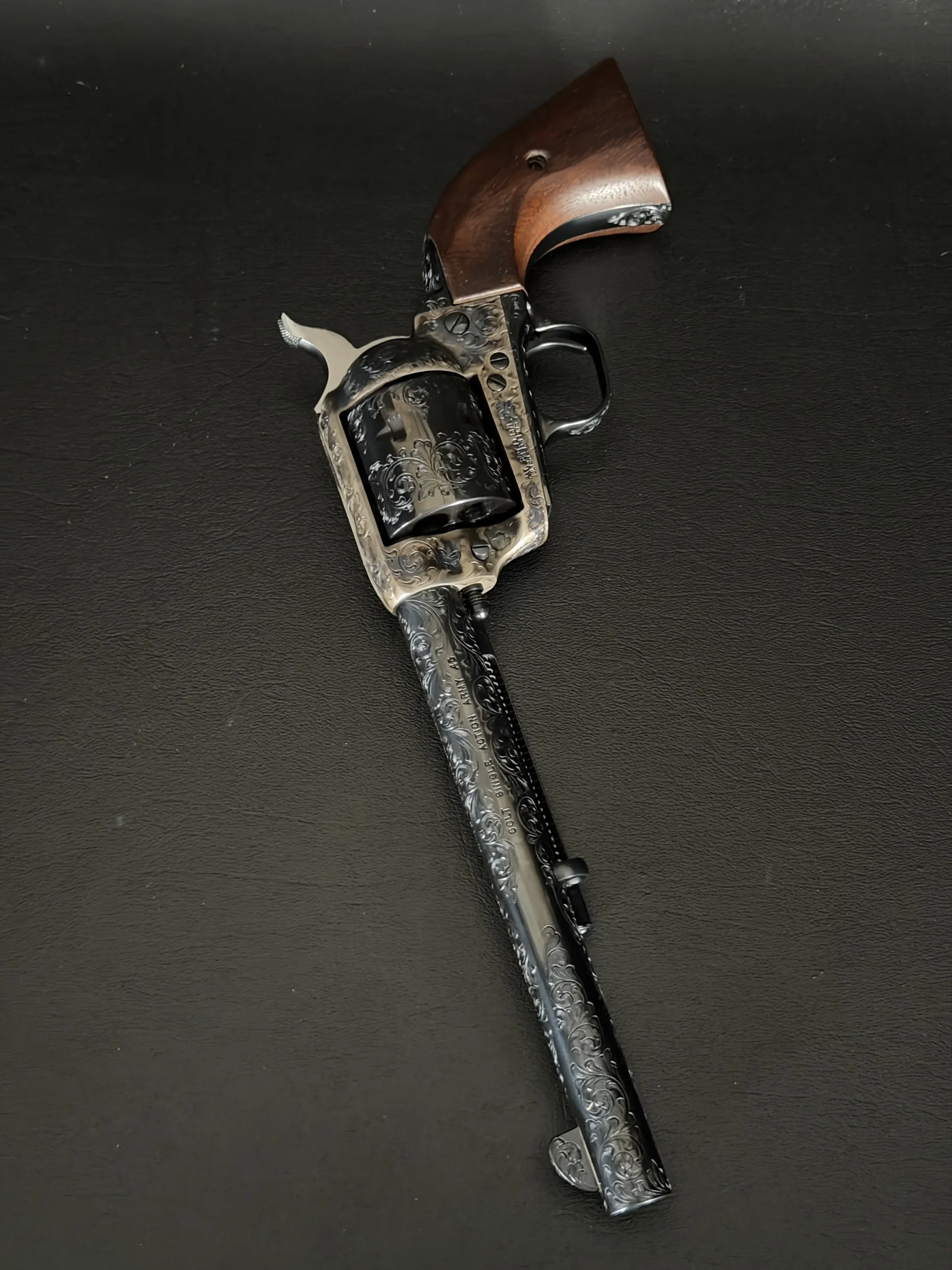 Polished surfaces are set off by subtle heat-toned highlights around the frame and loading gate, while the darkened cylinder adds visual depth against the surrounding engraving. The overall effect is refined and dramatic without losing the classic lines of the Single Action Army.