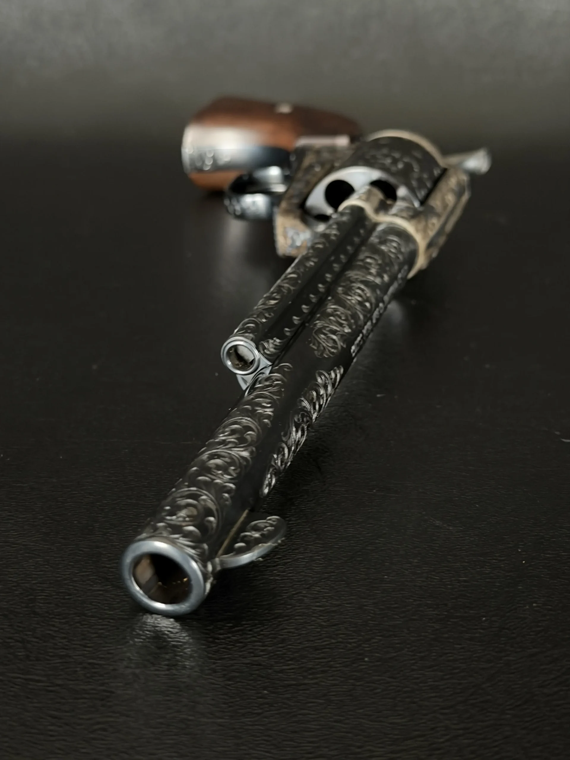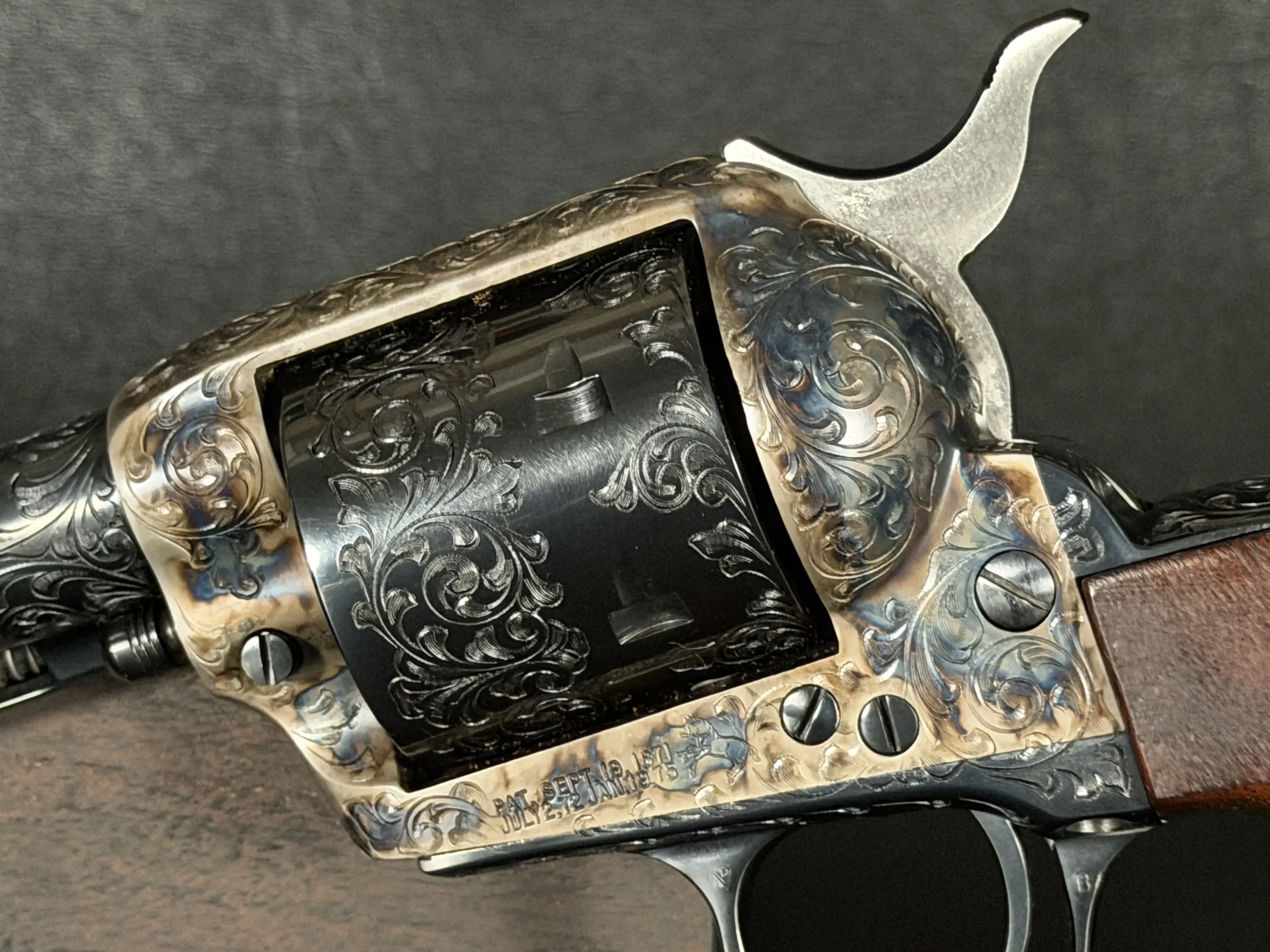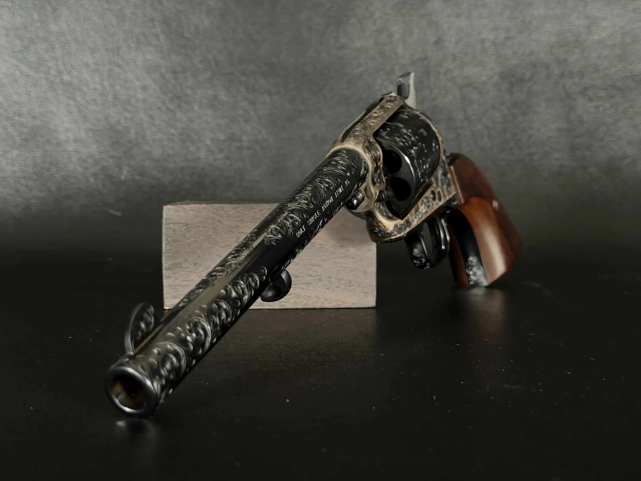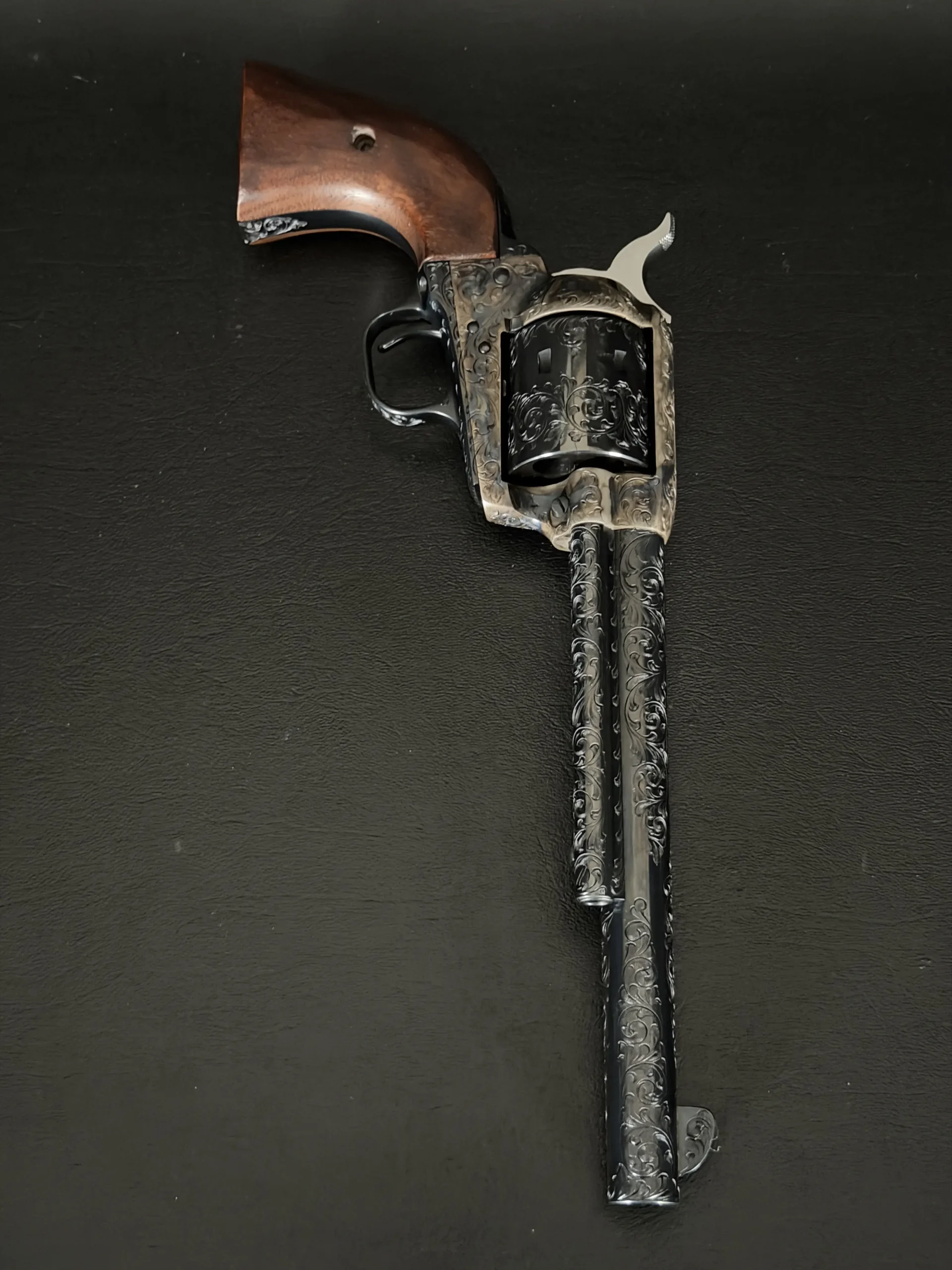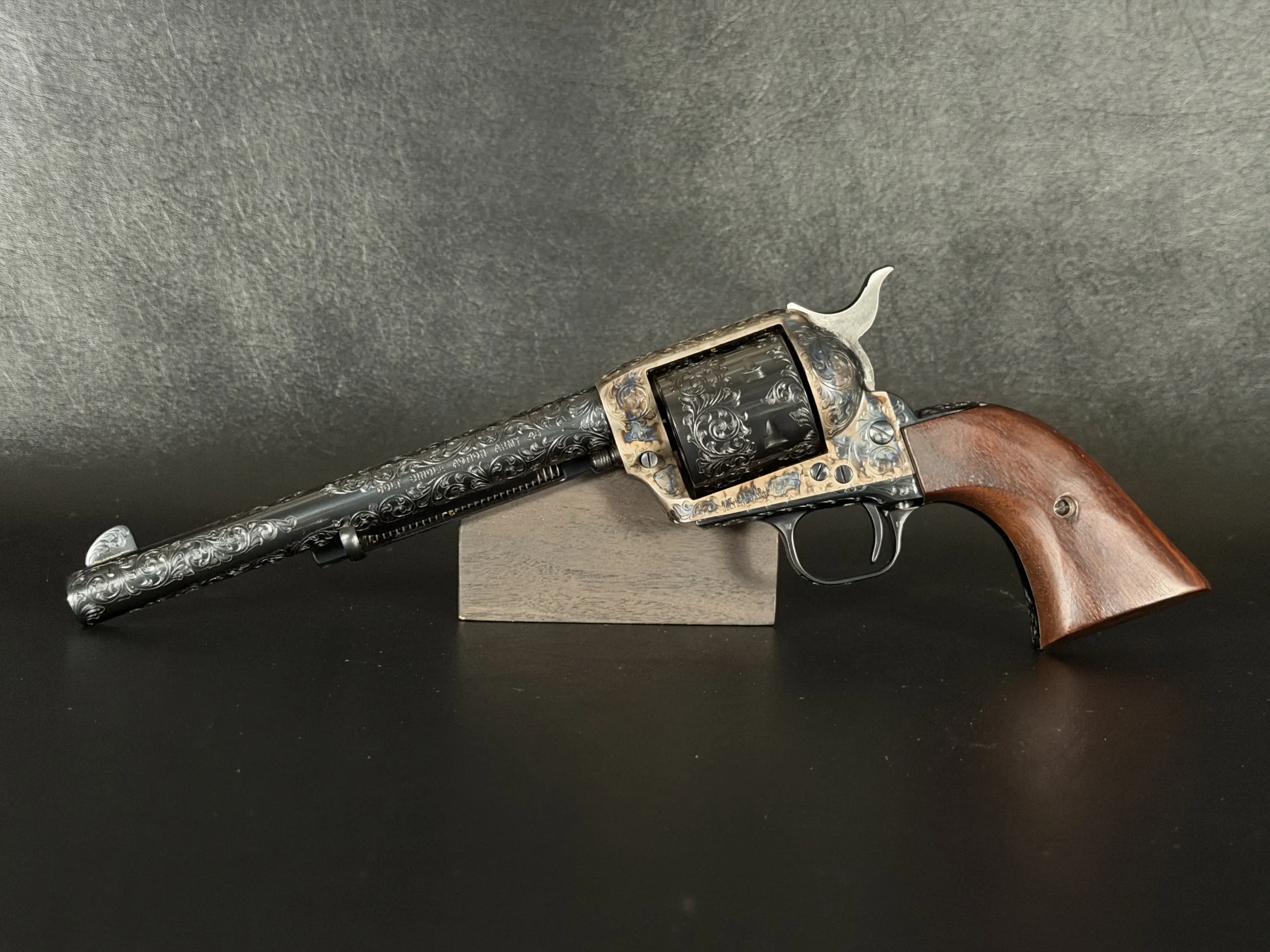 Polished surfaces are set off by subtle heat-toned highlights around the frame and loading gate, while the darkened cylinder adds visual depth against the surrounding engraving. The overall effect is refined and dramatic without losing the classic lines of the Single Action Army.
