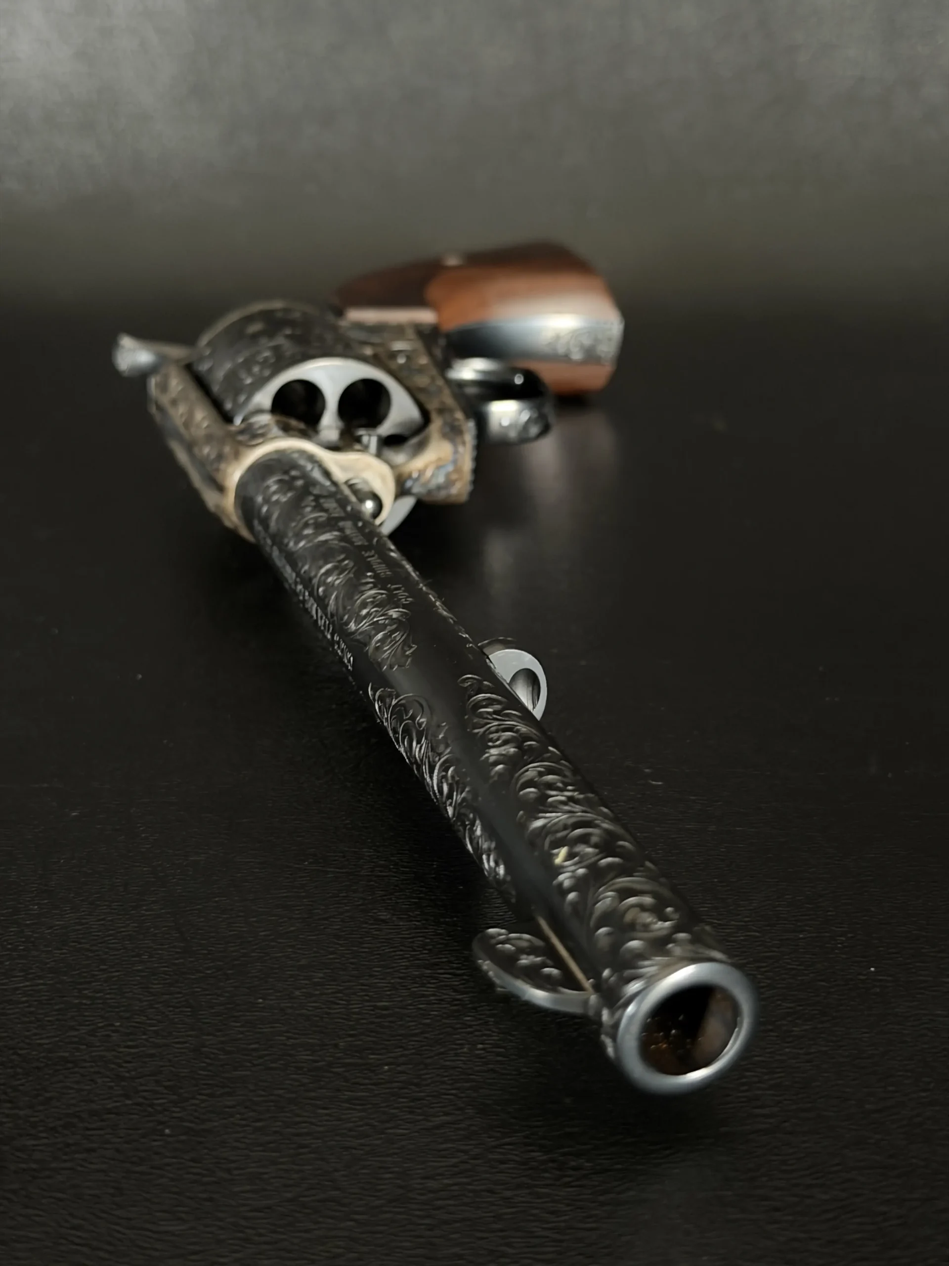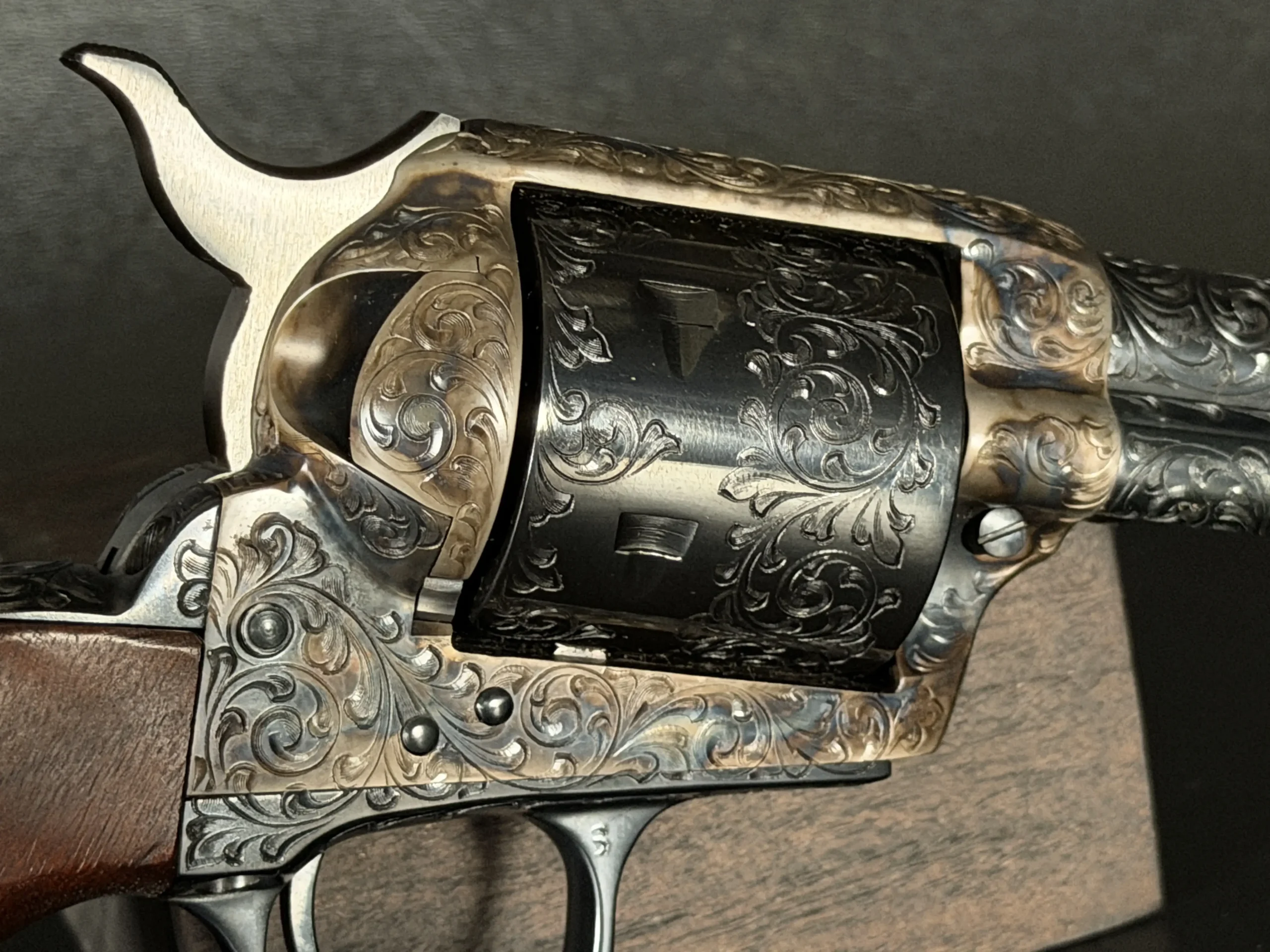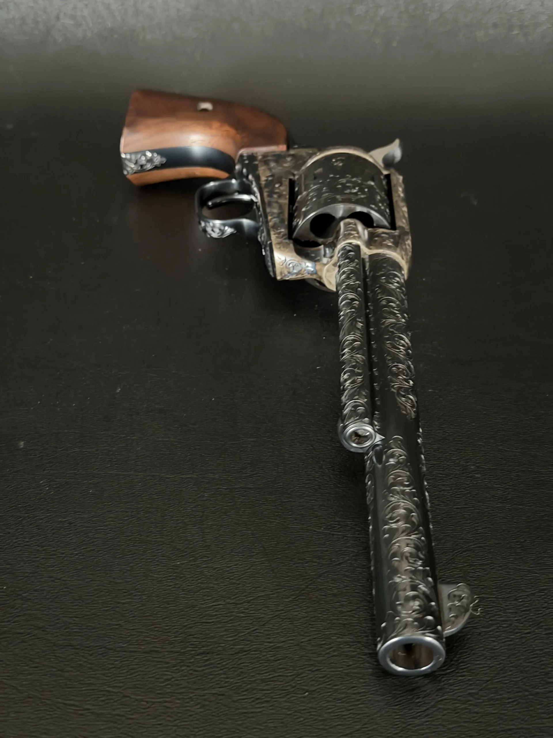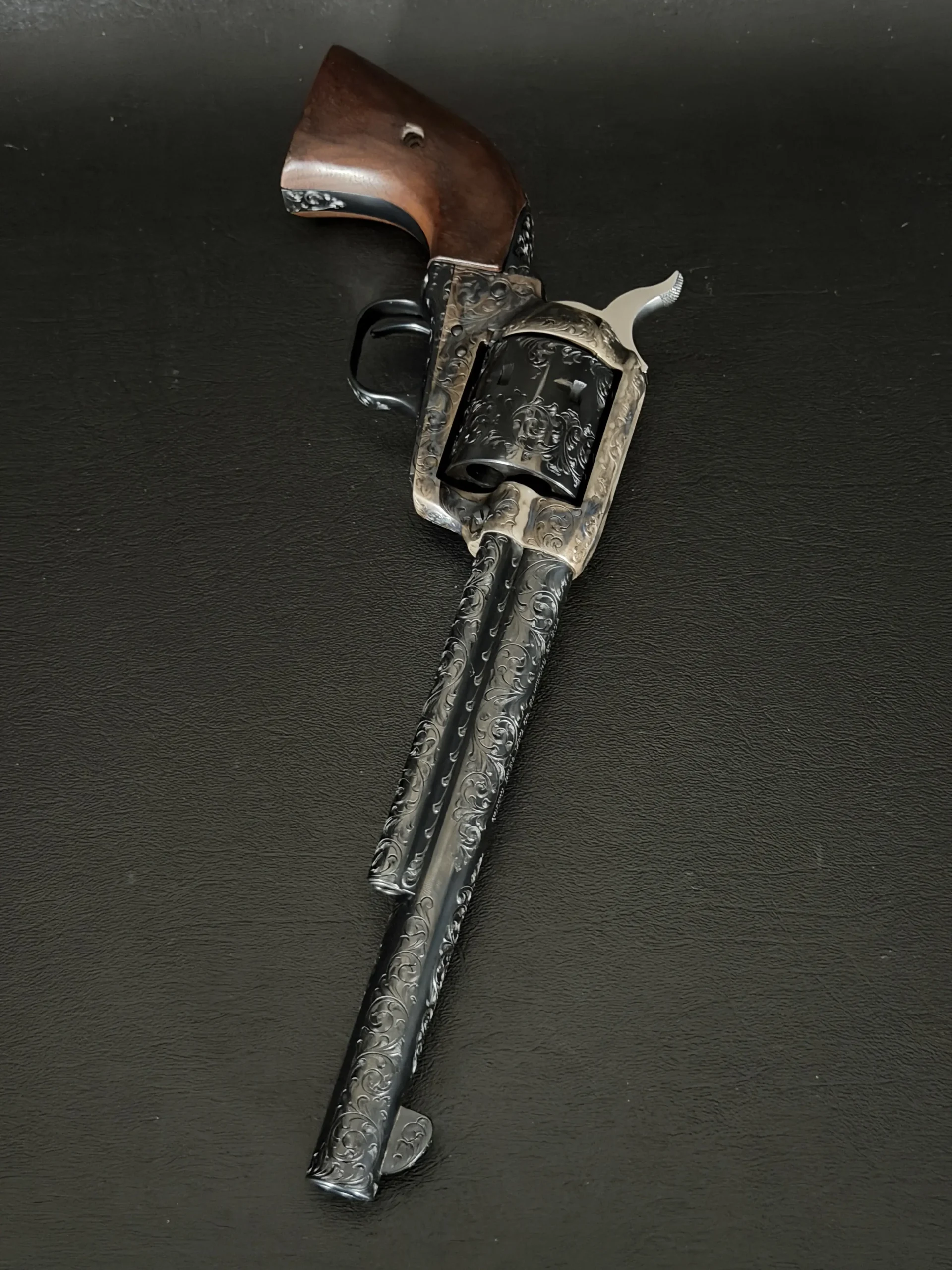 Polished surfaces are set off by subtle heat-toned highlights around the frame and loading gate, while the darkened cylinder adds visual depth against the surrounding engraving. The overall effect is refined and dramatic without losing the classic lines of the Single Action Army.