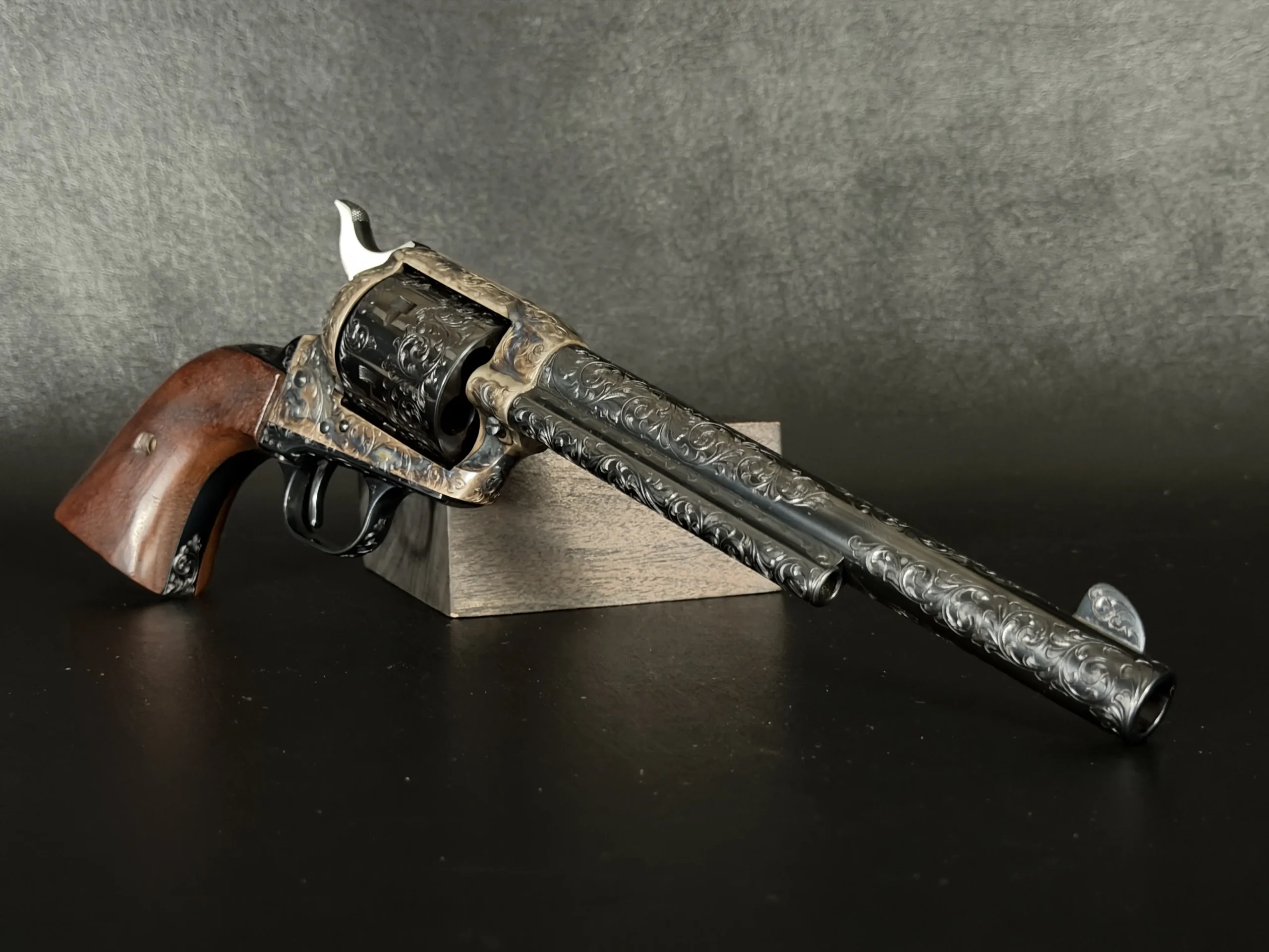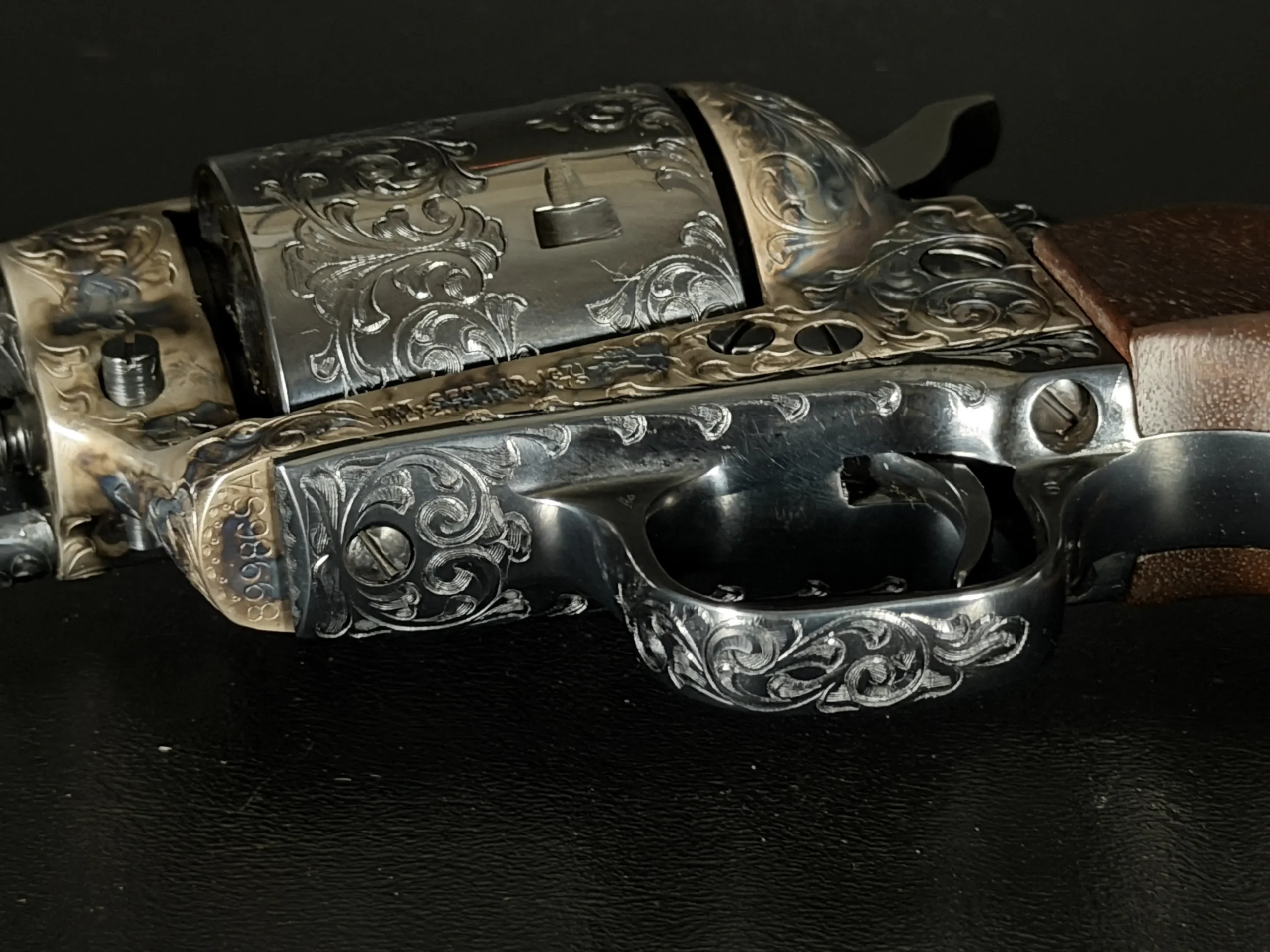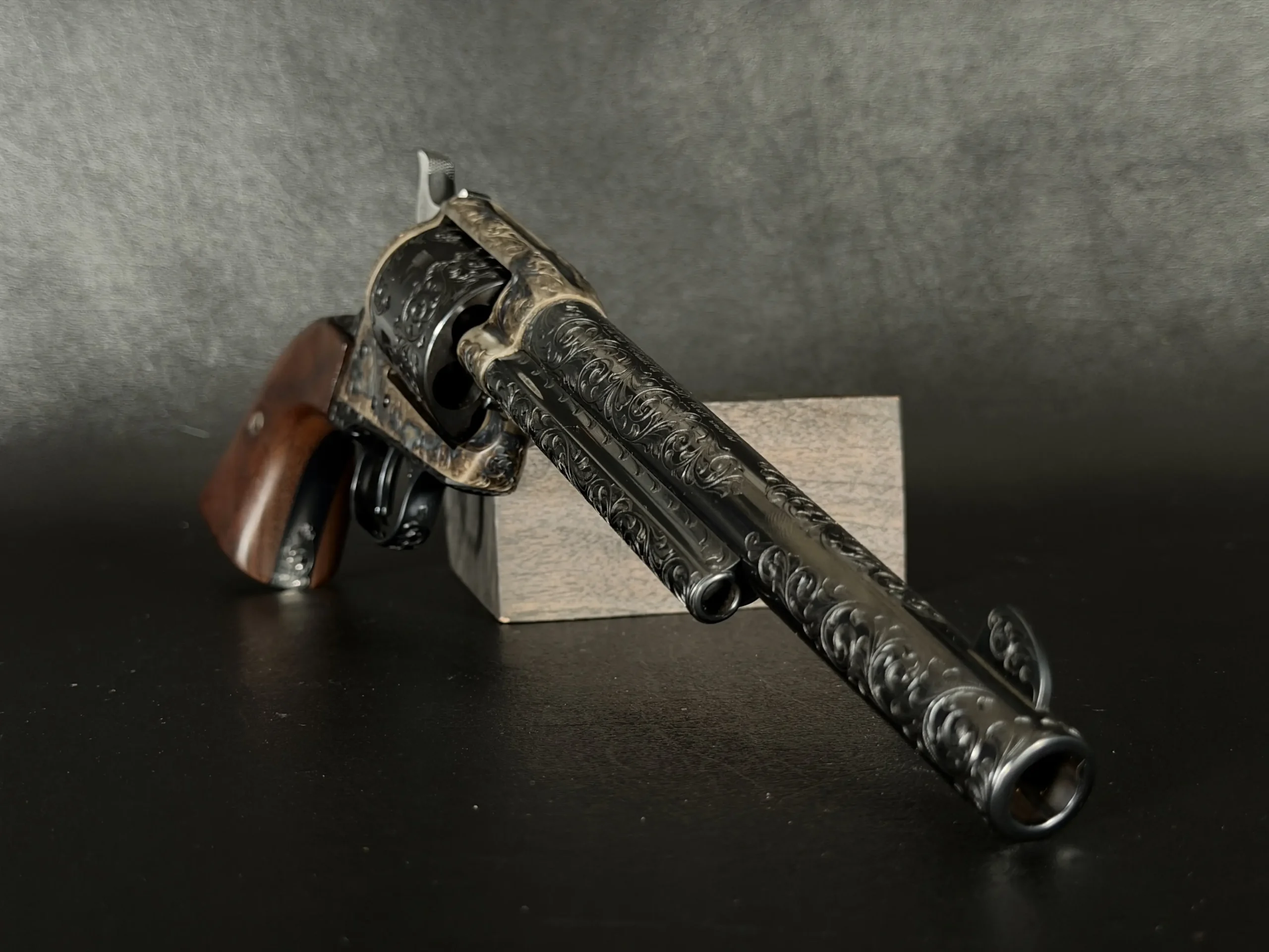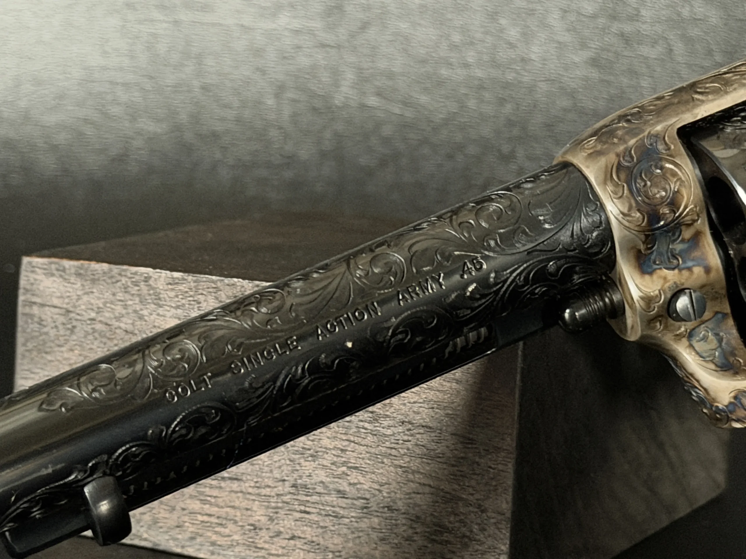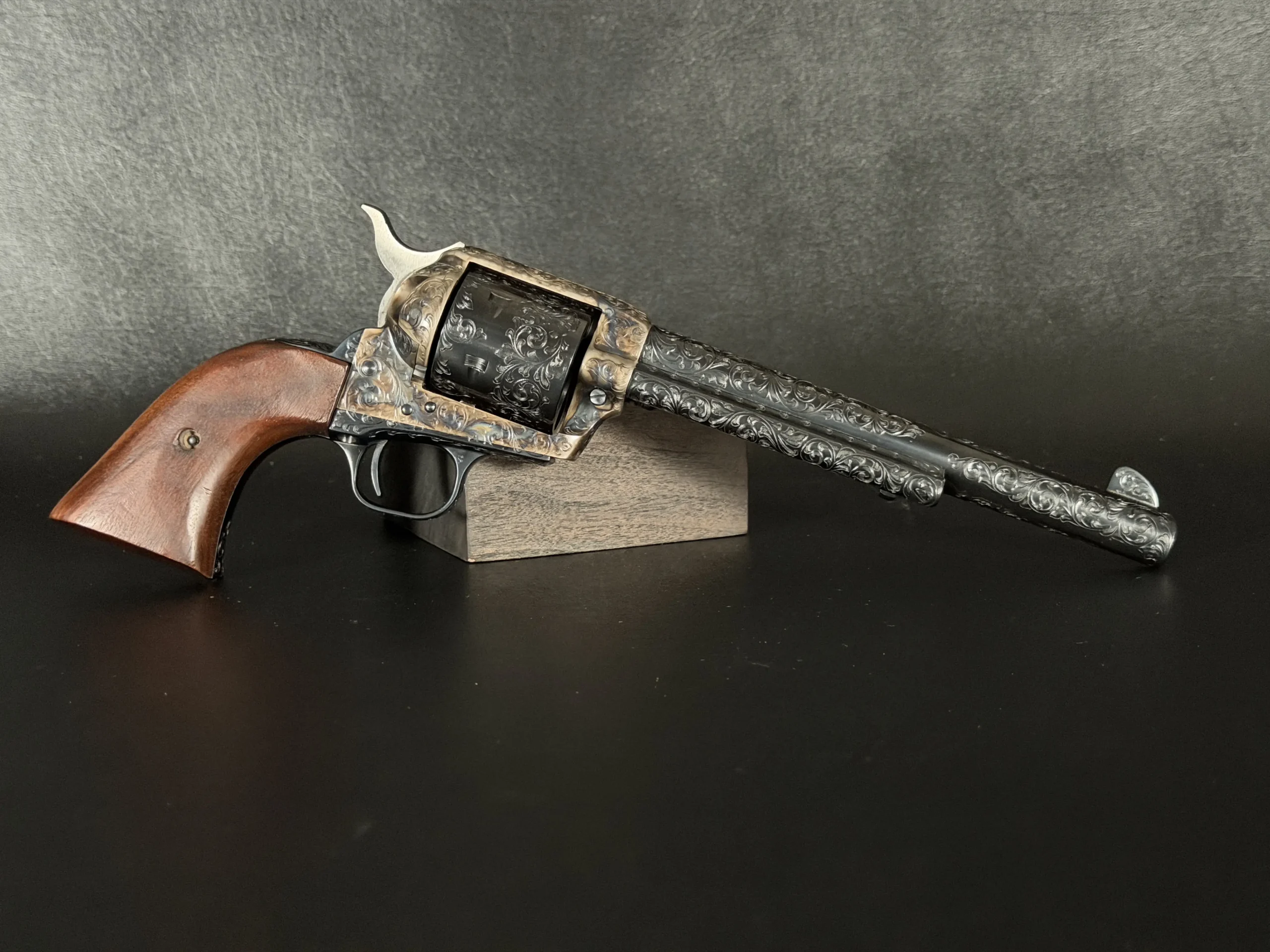 Polished surfaces are set off by subtle heat-toned highlights around the frame and loading gate, while the darkened cylinder adds visual depth against the surrounding engraving. The overall effect is refined and dramatic without losing the classic lines of the Single Action Army.
