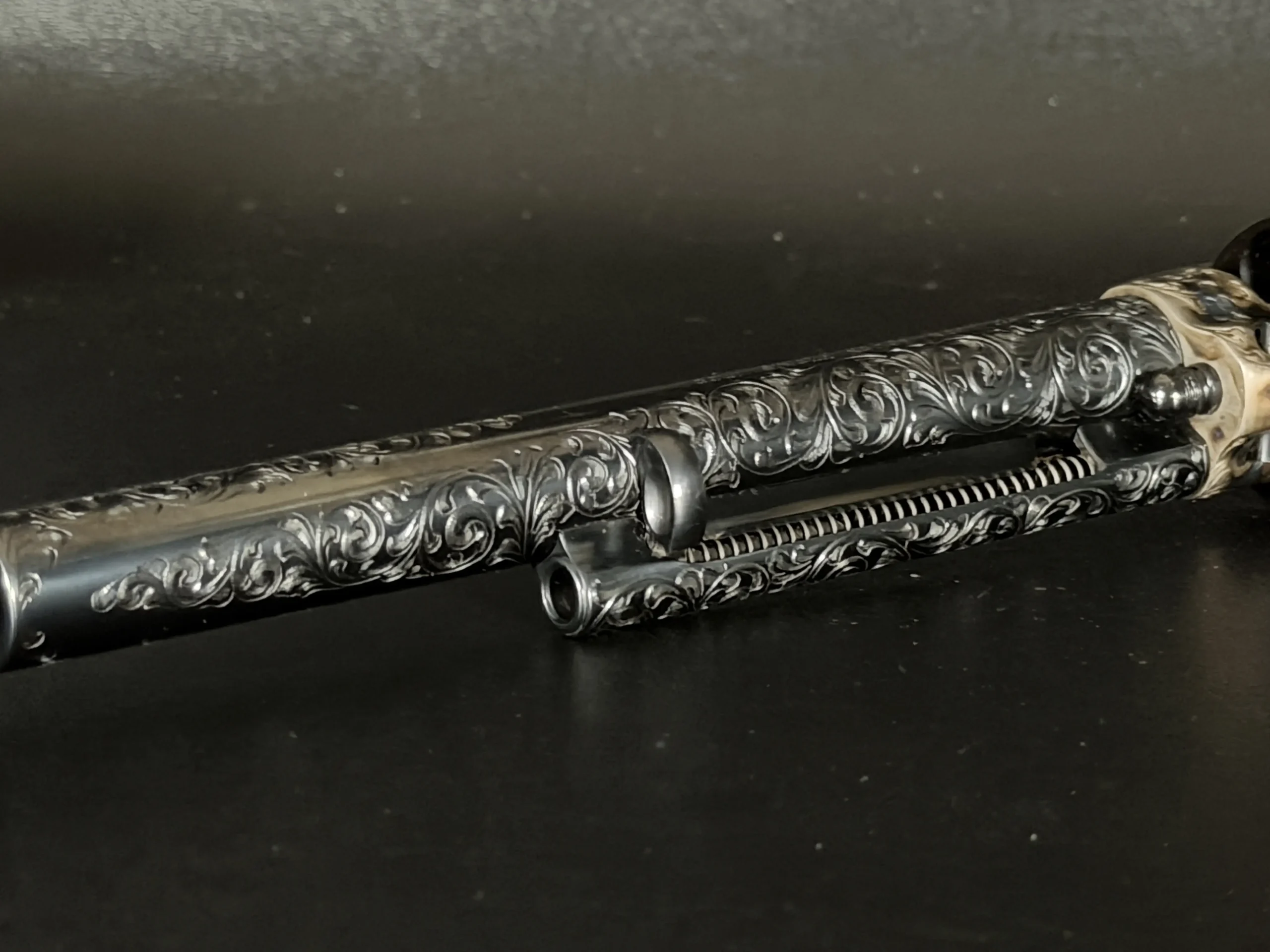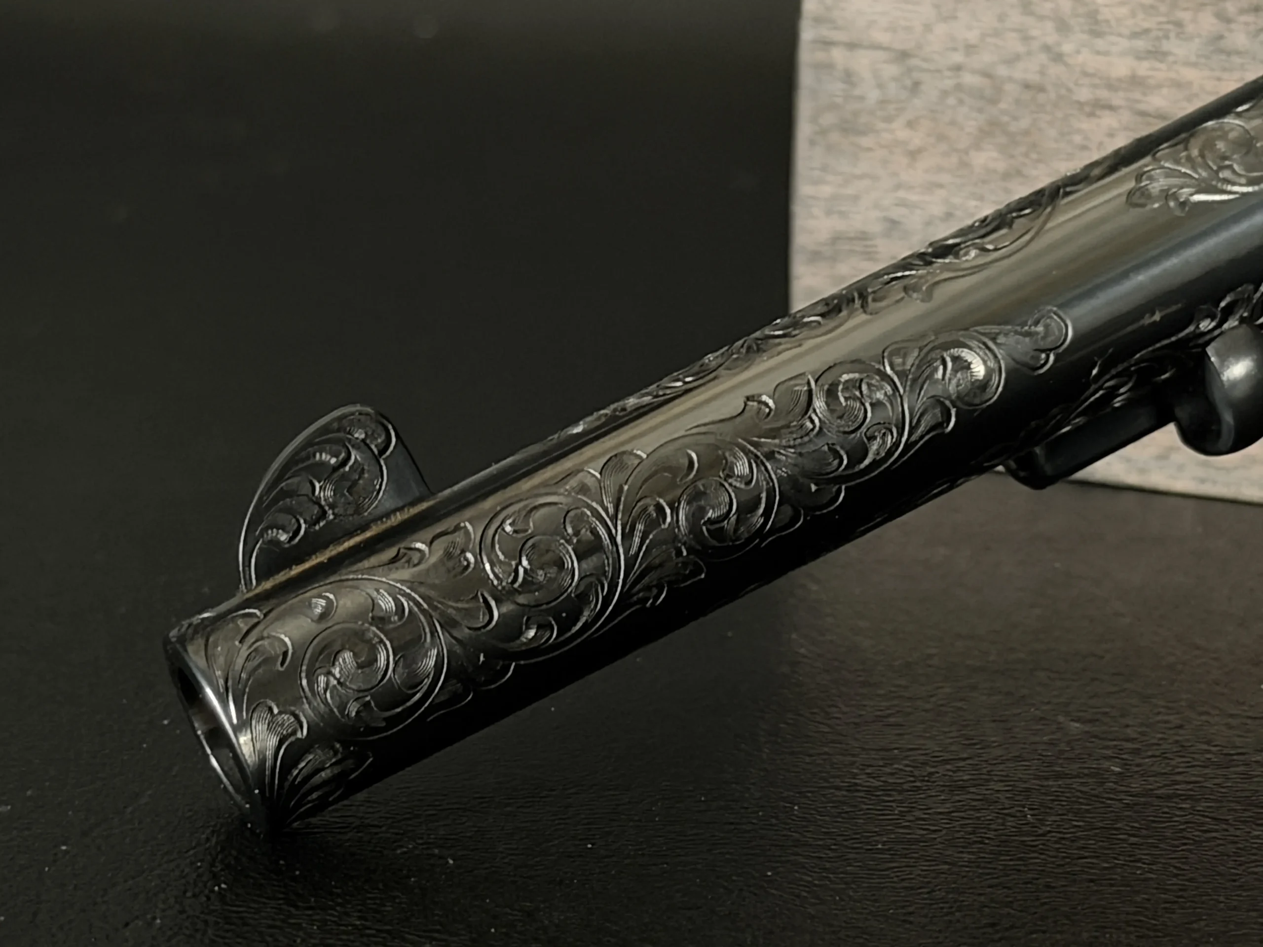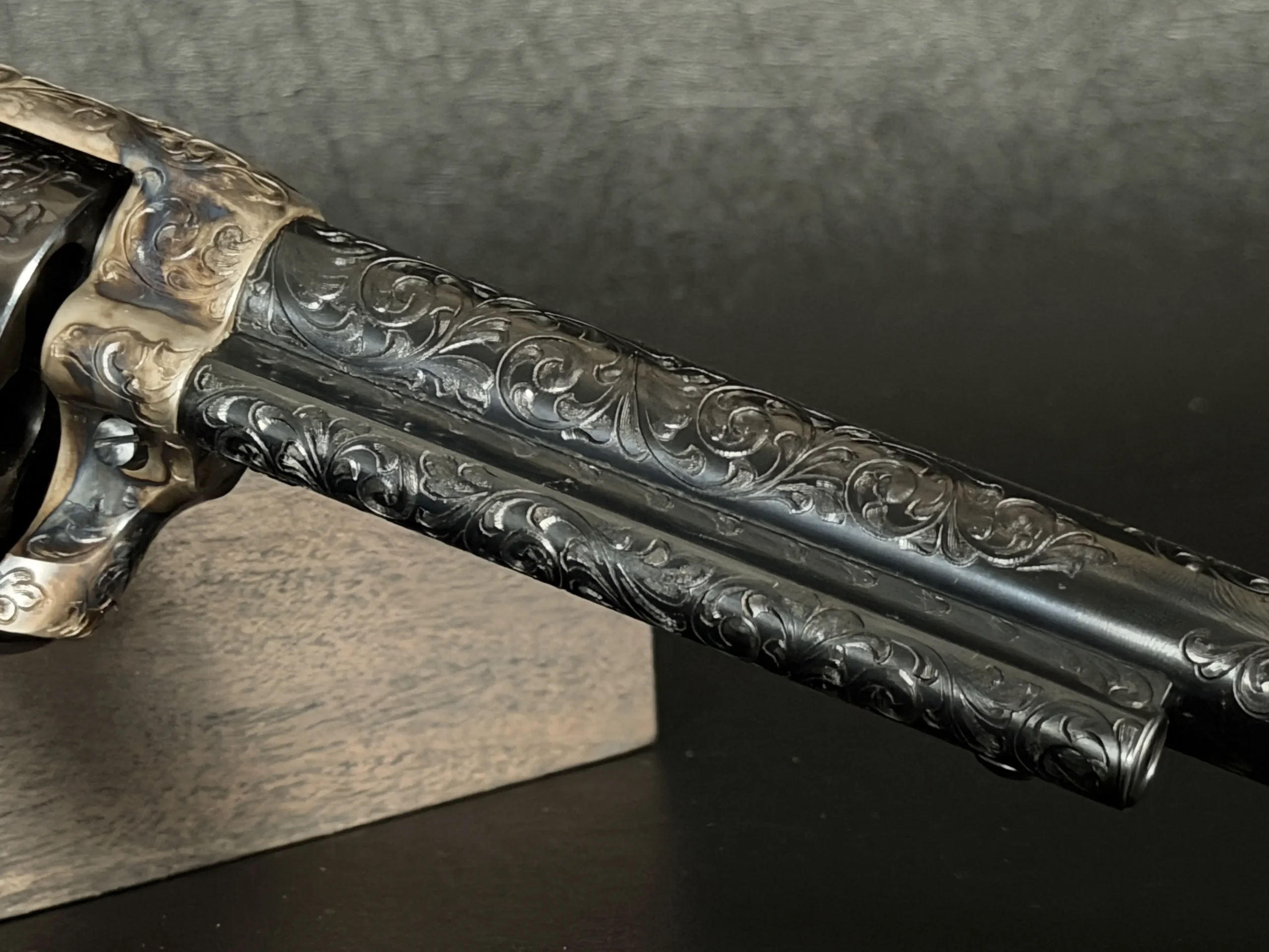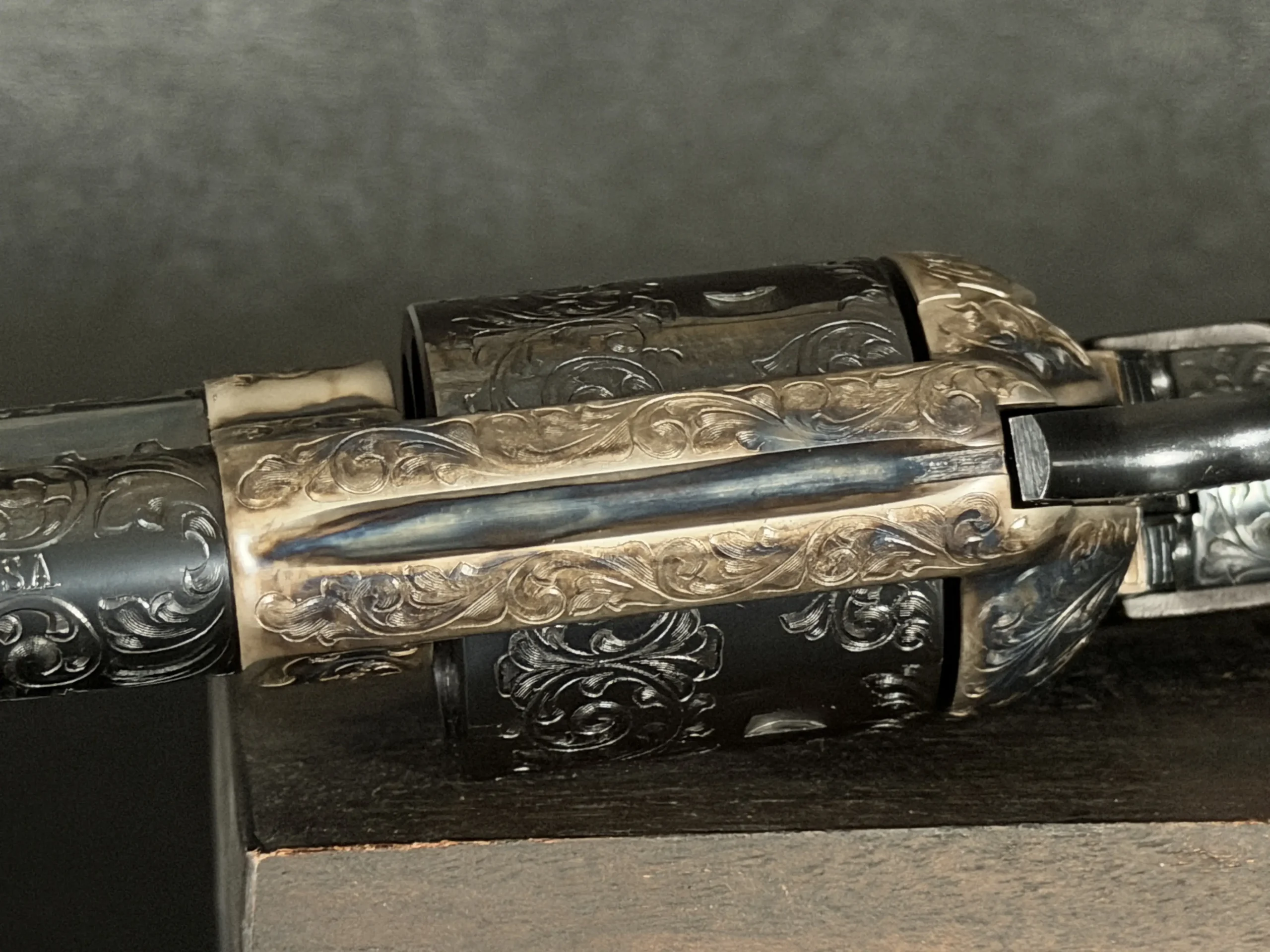 Polished surfaces are set off by subtle heat-toned highlights around the frame and loading gate, while the darkened cylinder adds visual depth against the surrounding engraving. The overall effect is refined and dramatic without losing the classic lines of the Single Action Army.