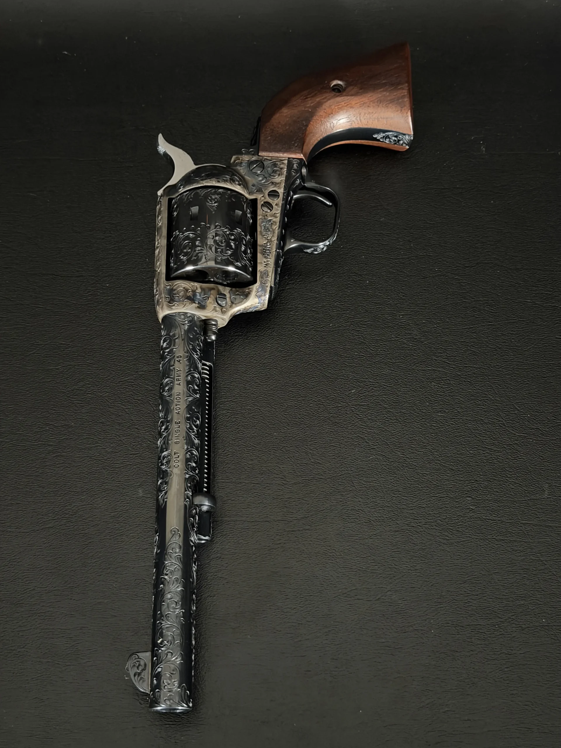 A Colt Single Action Army with Master Factory Class “D” engraving, chambered in .45 Colt. Factory scrollwork, heat-toned accents, a darkened cylinder, and factory-matched major components give this revolver a striking, cohesive appearance.